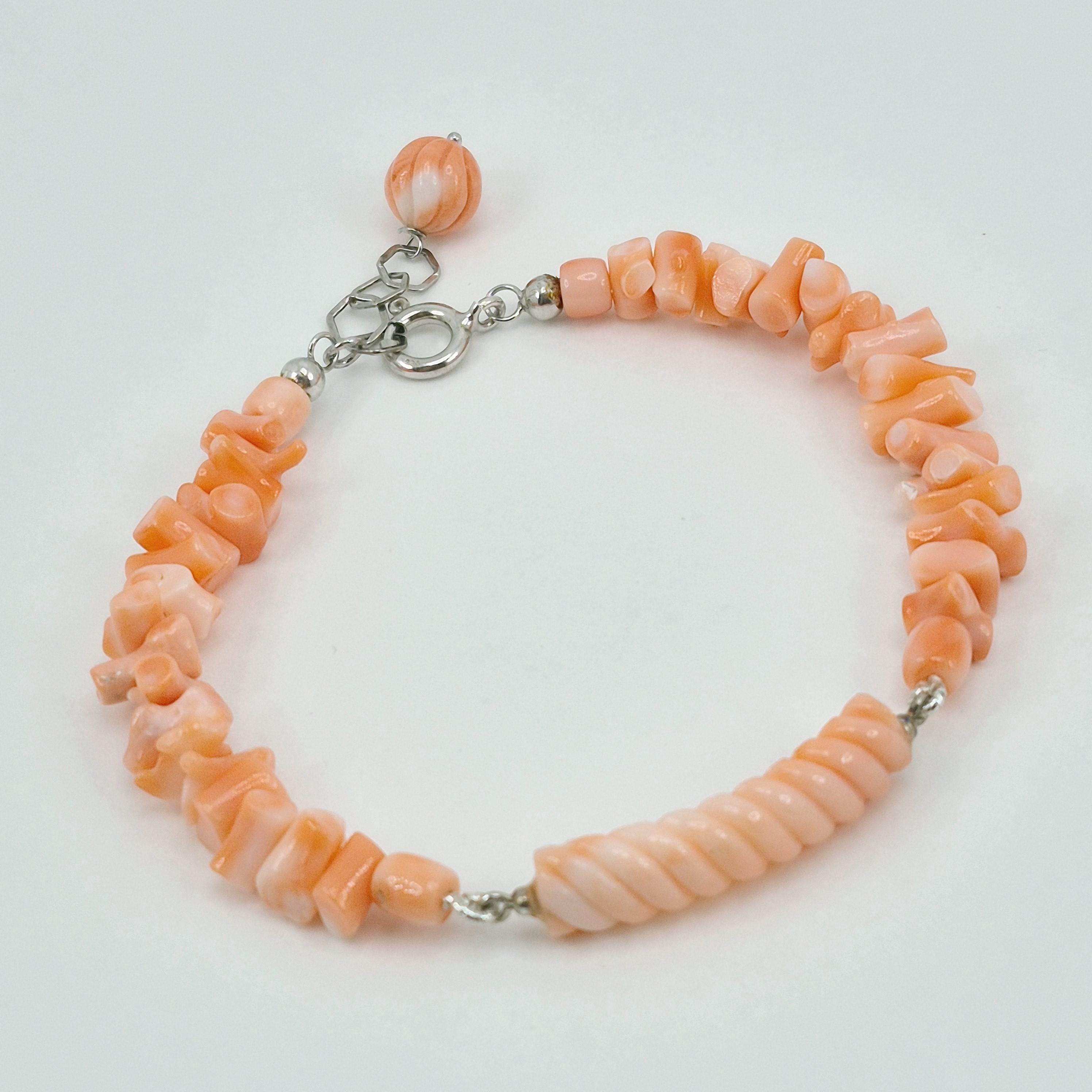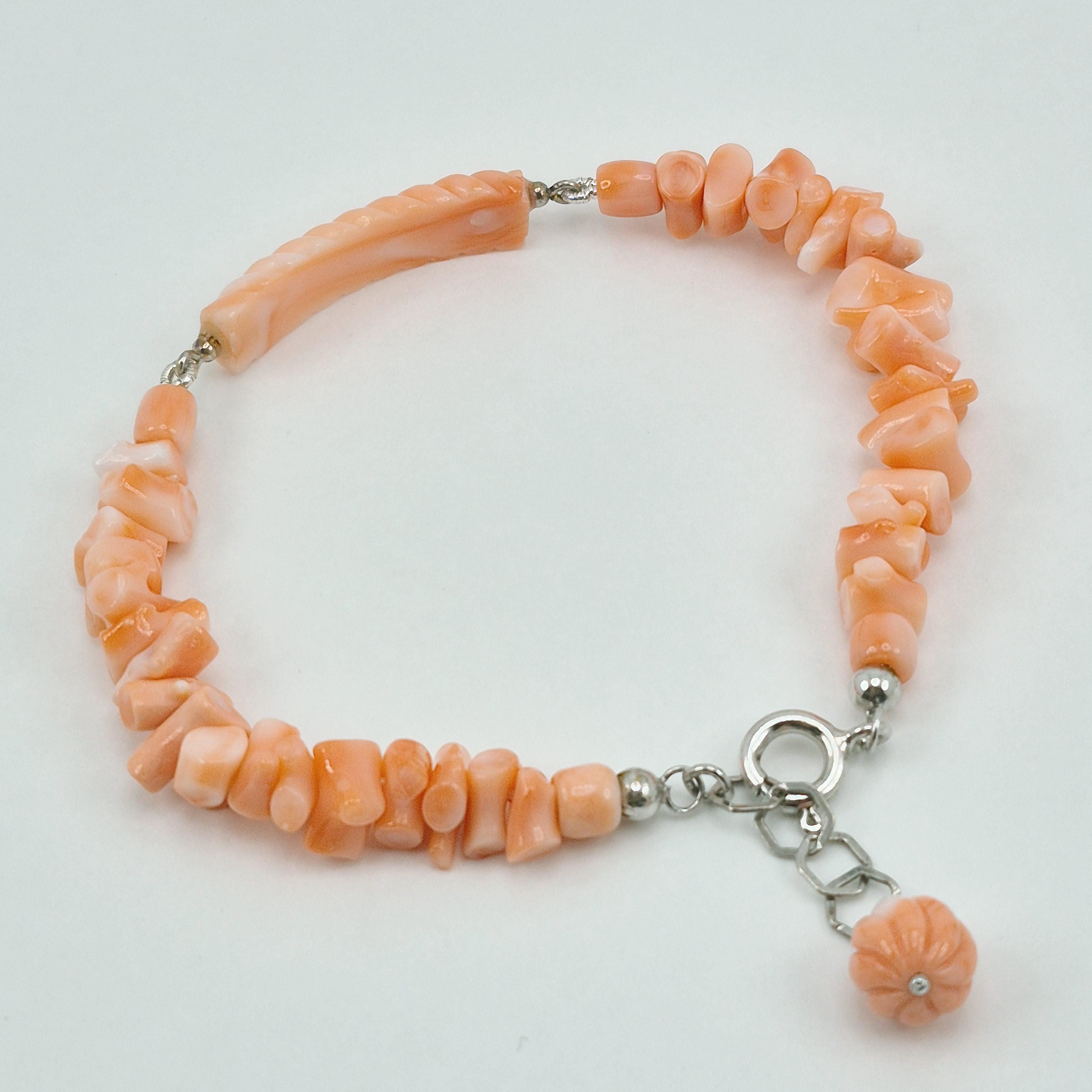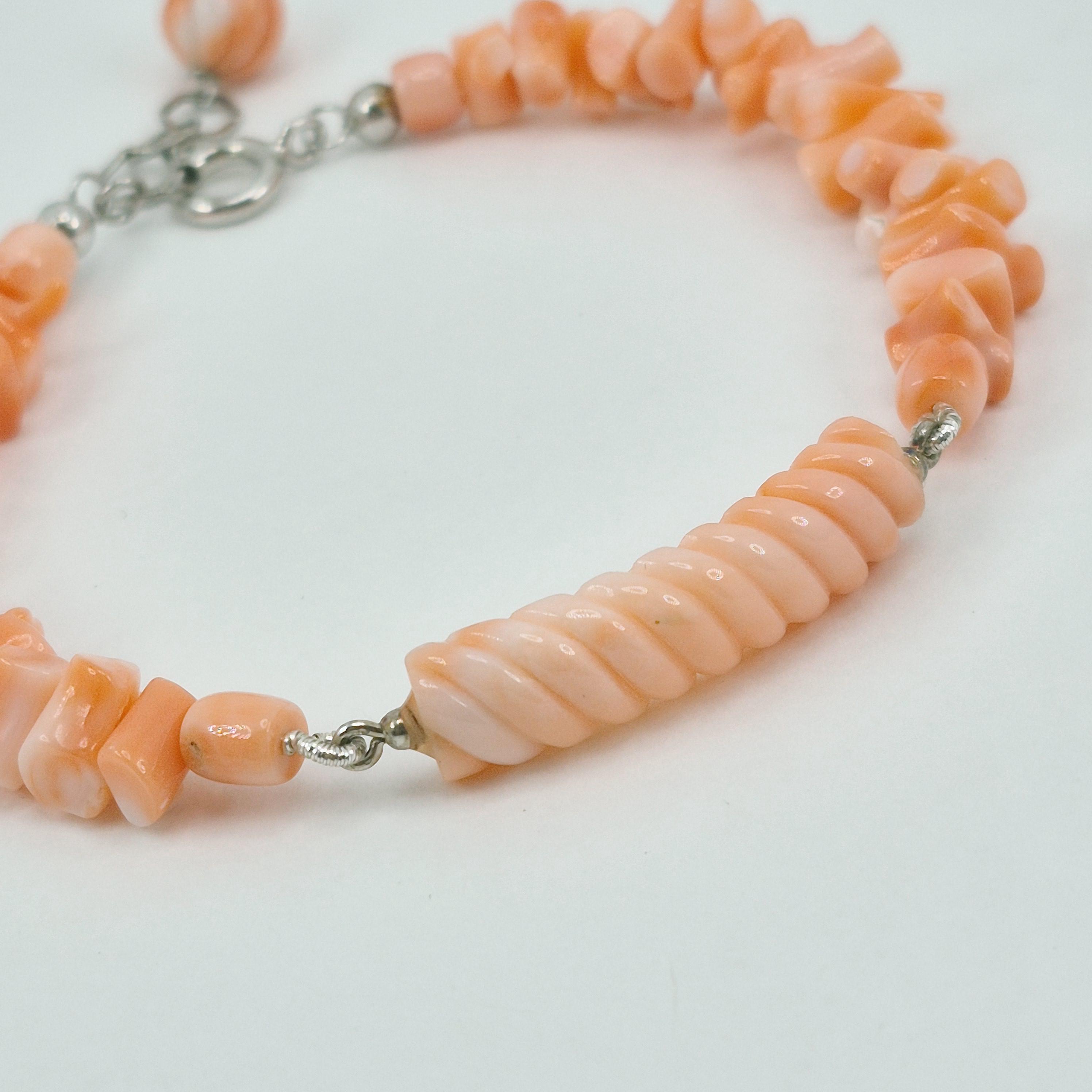 Incantevole bracciale tutto artigianale con barretta centrale tutta incisa a mano laterale con tronchetti di corallo rosato provenienza dai mari asiatici.