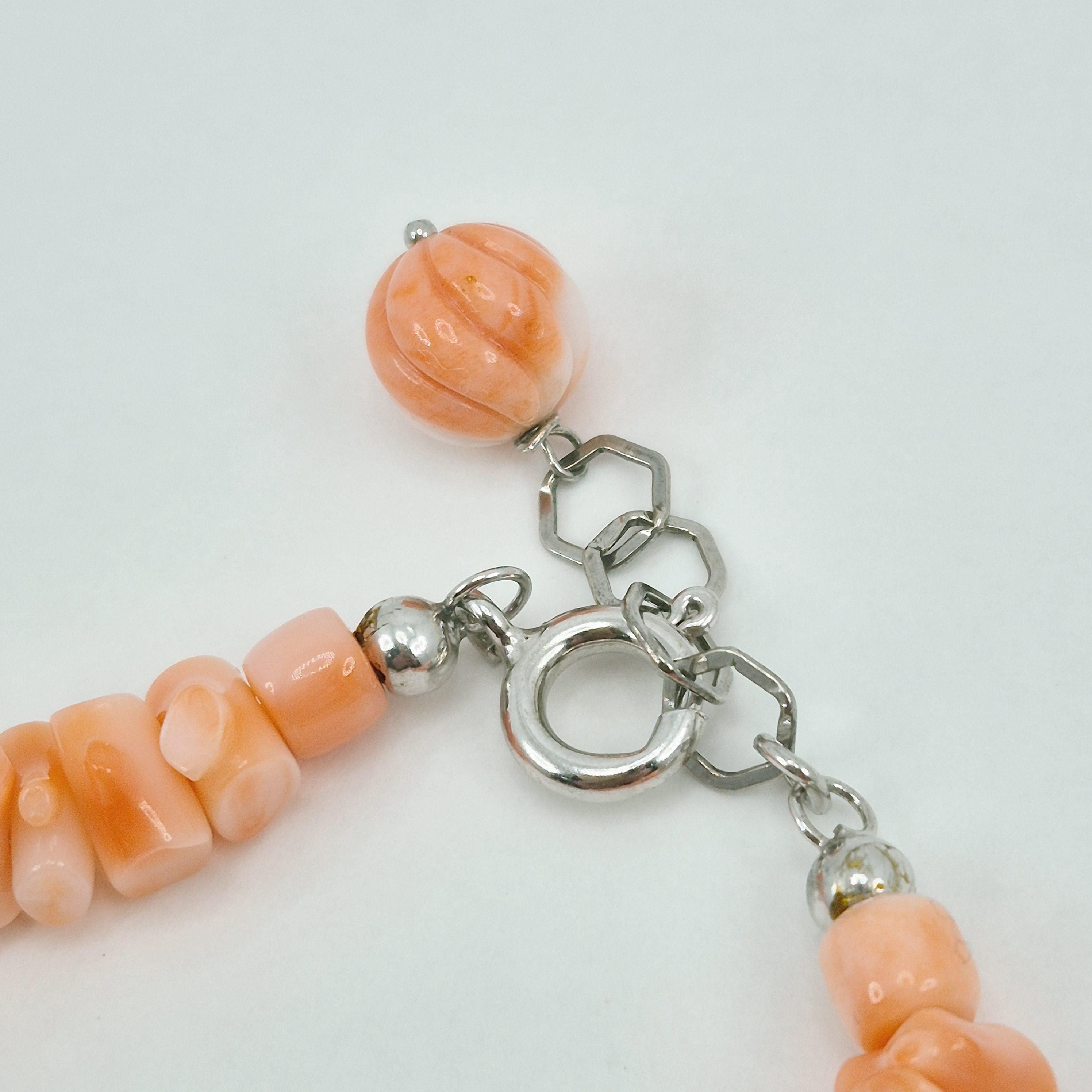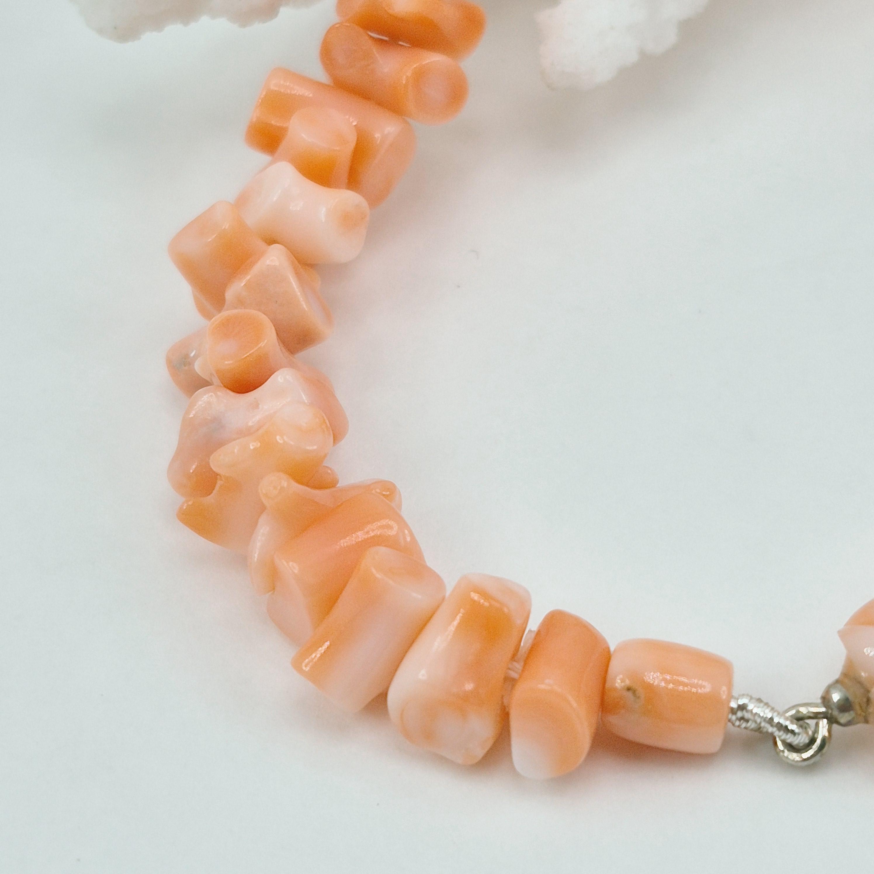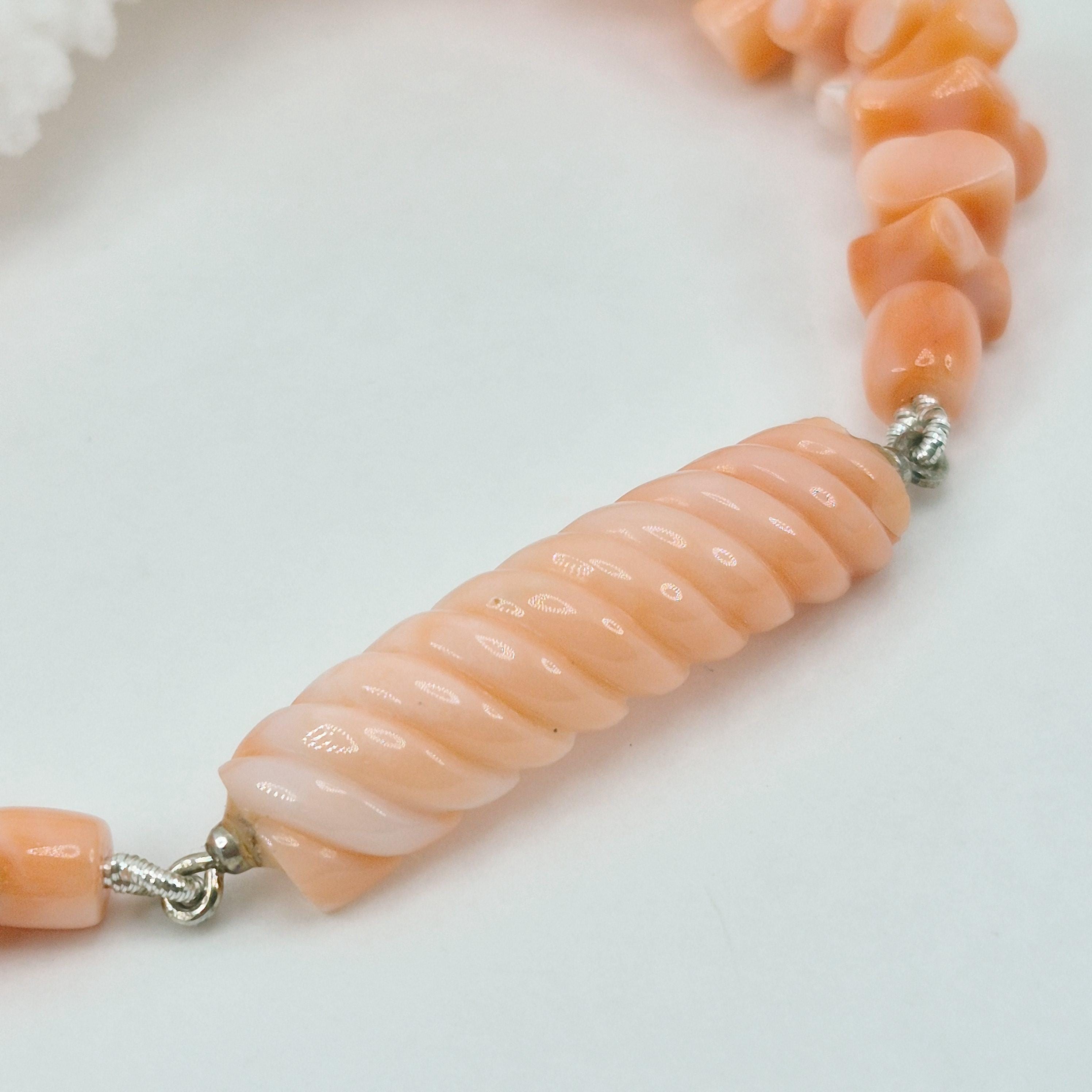 Incantevole bracciale tutto artigianale con barretta centrale tutta incisa a mano laterale con tronchetti di corallo rosato provenienza dai mari asiatici.