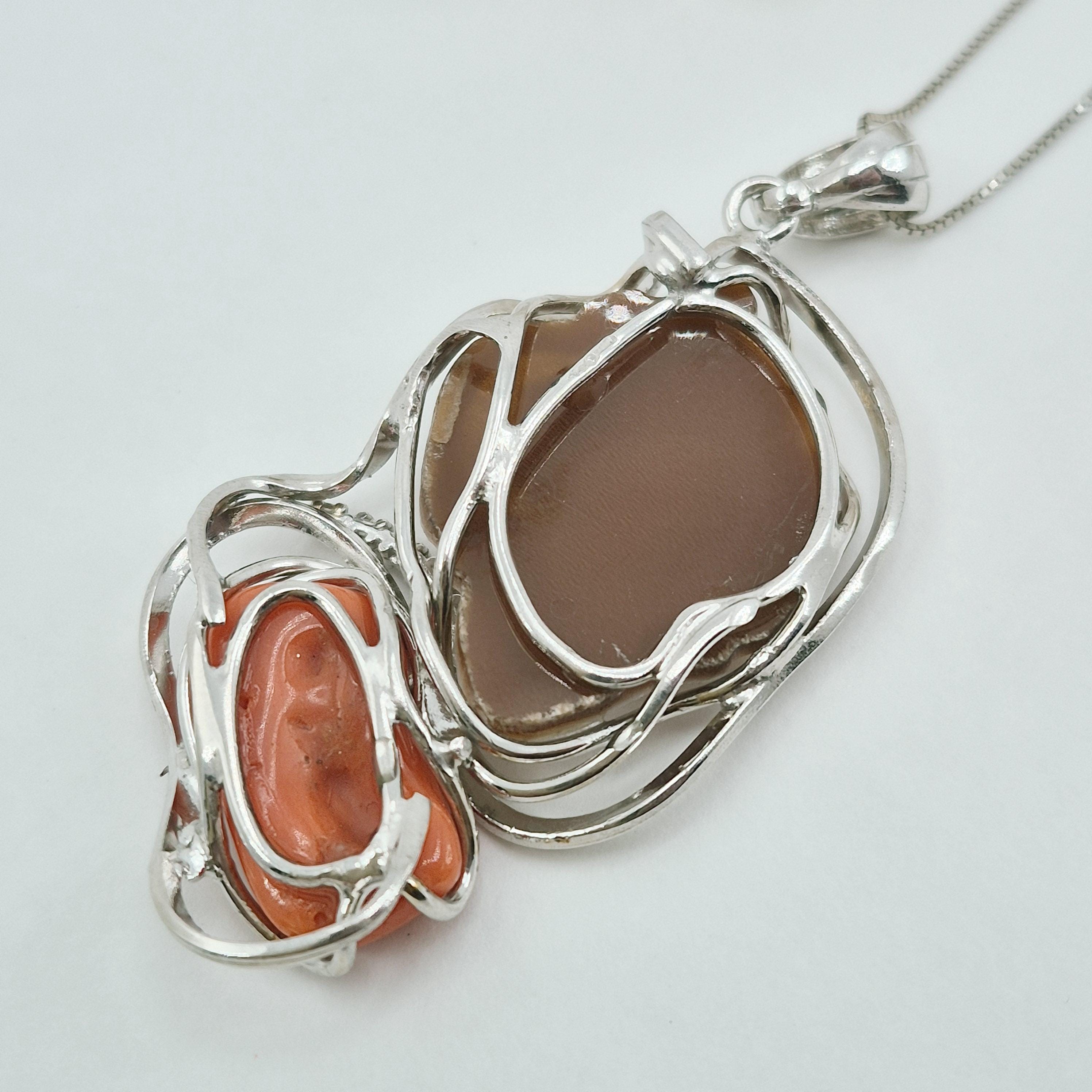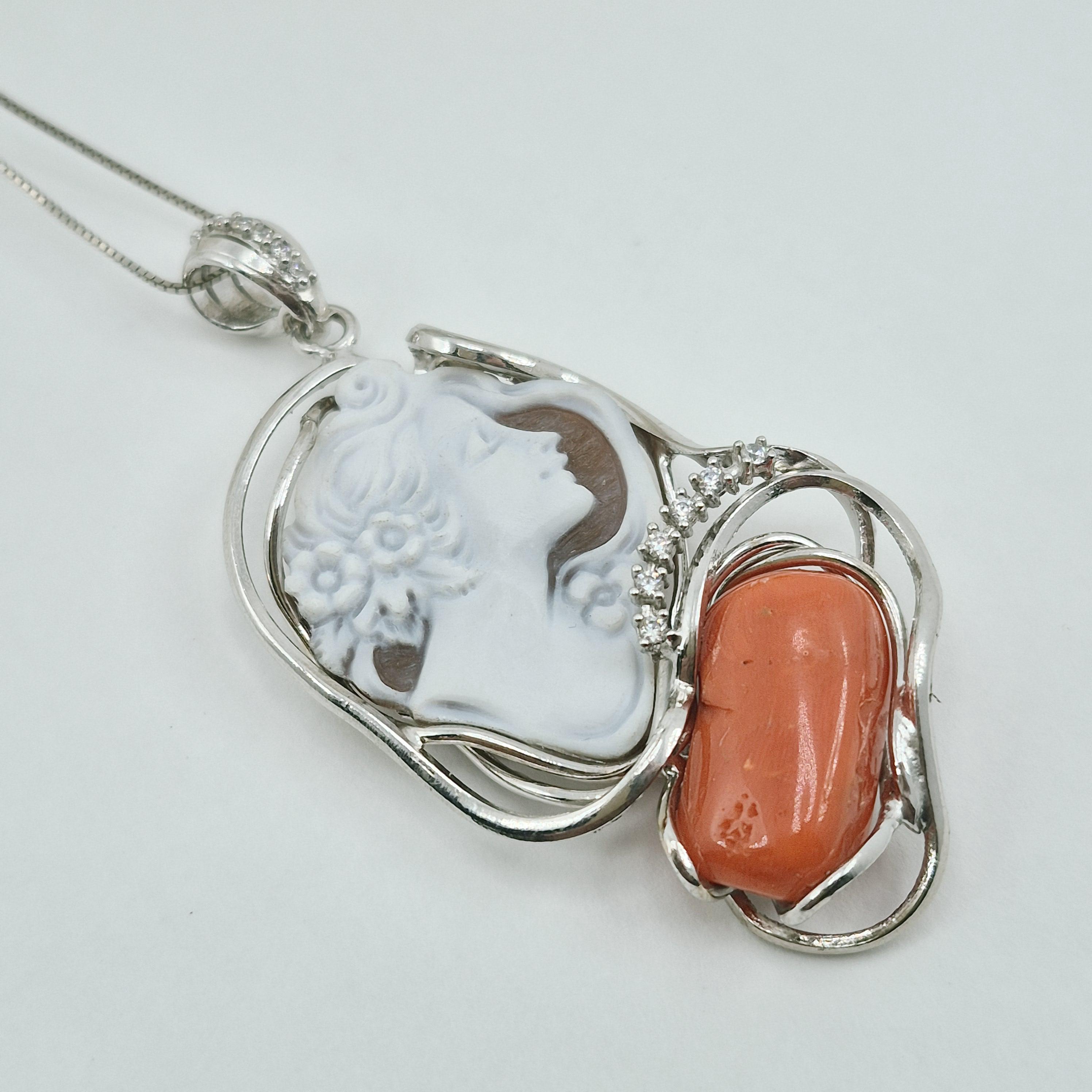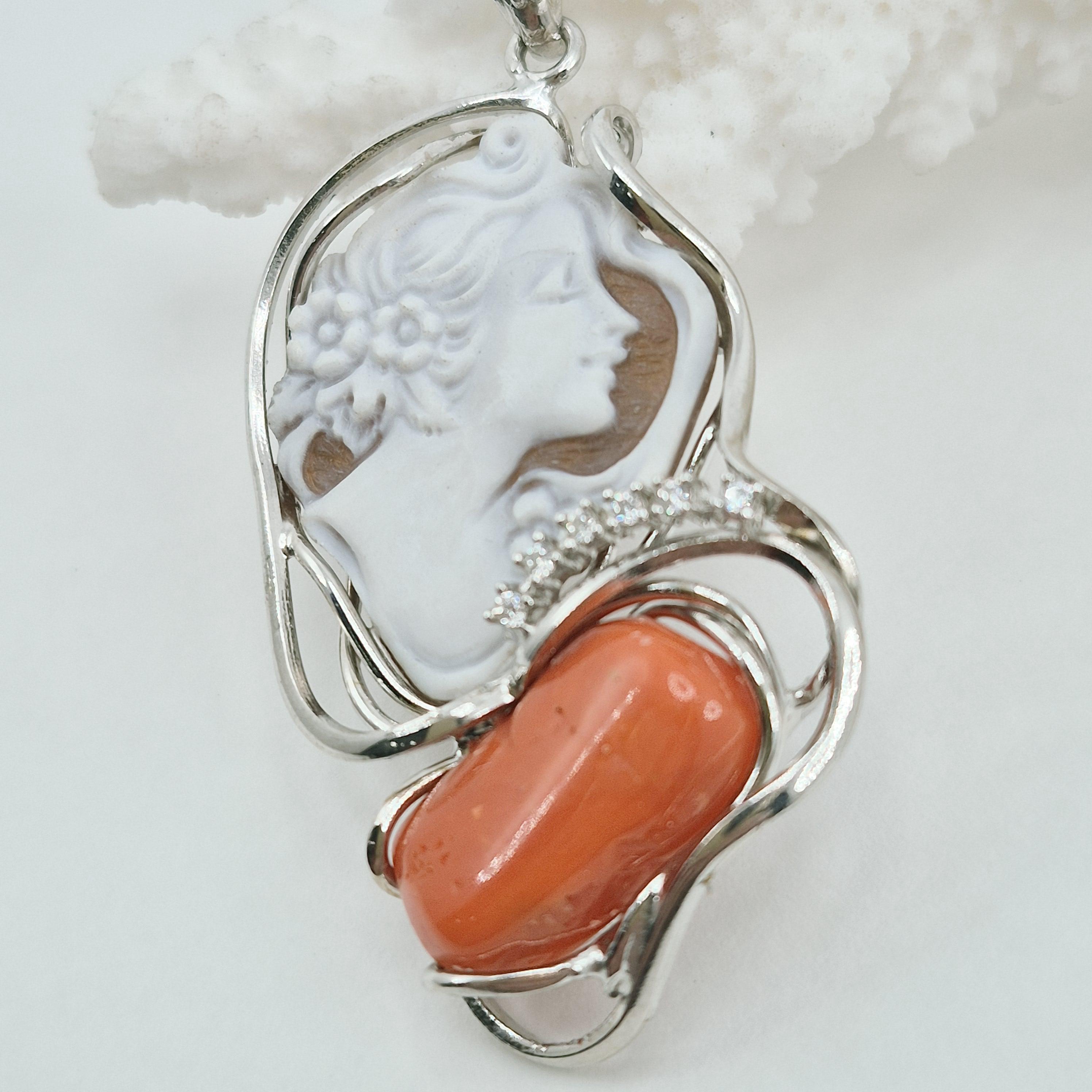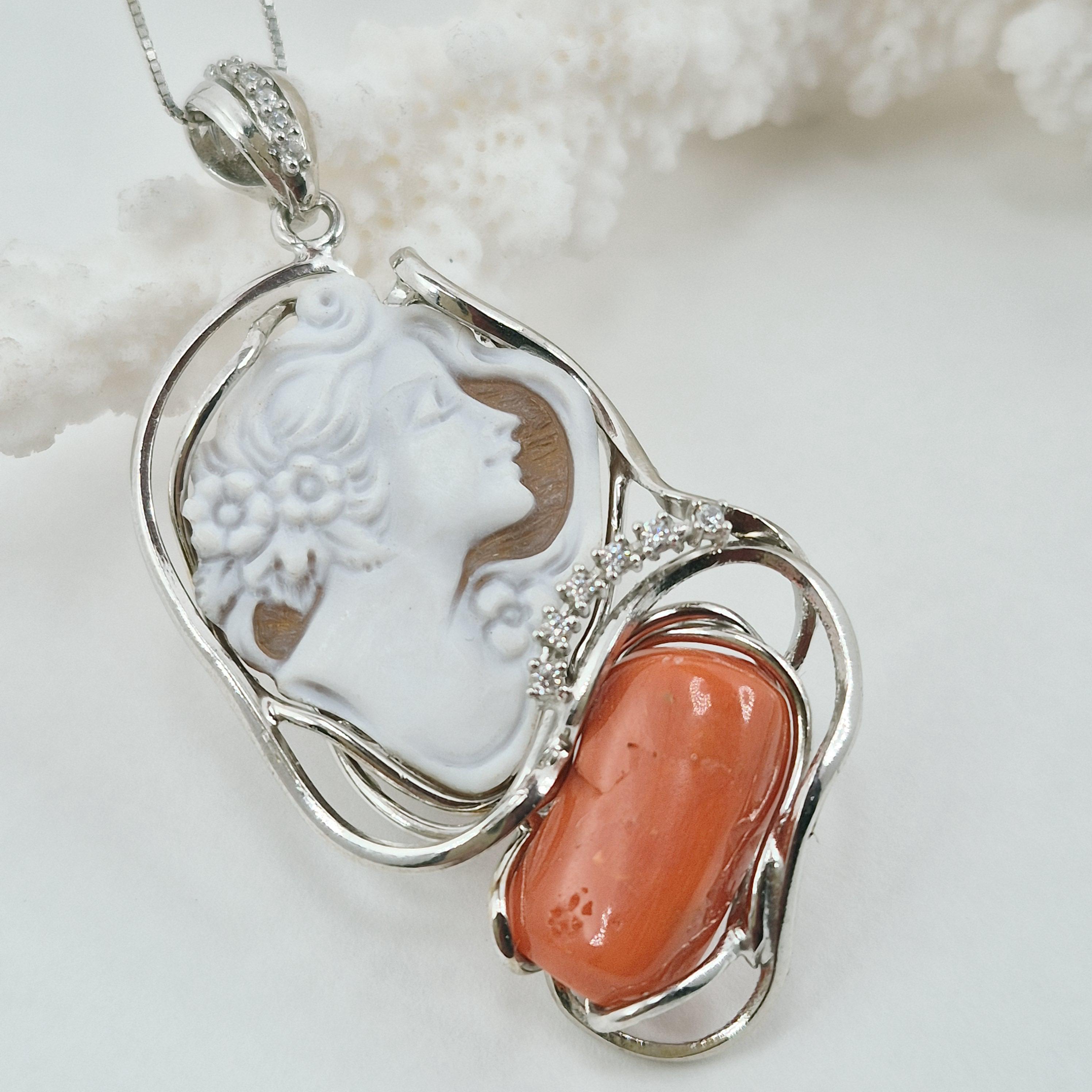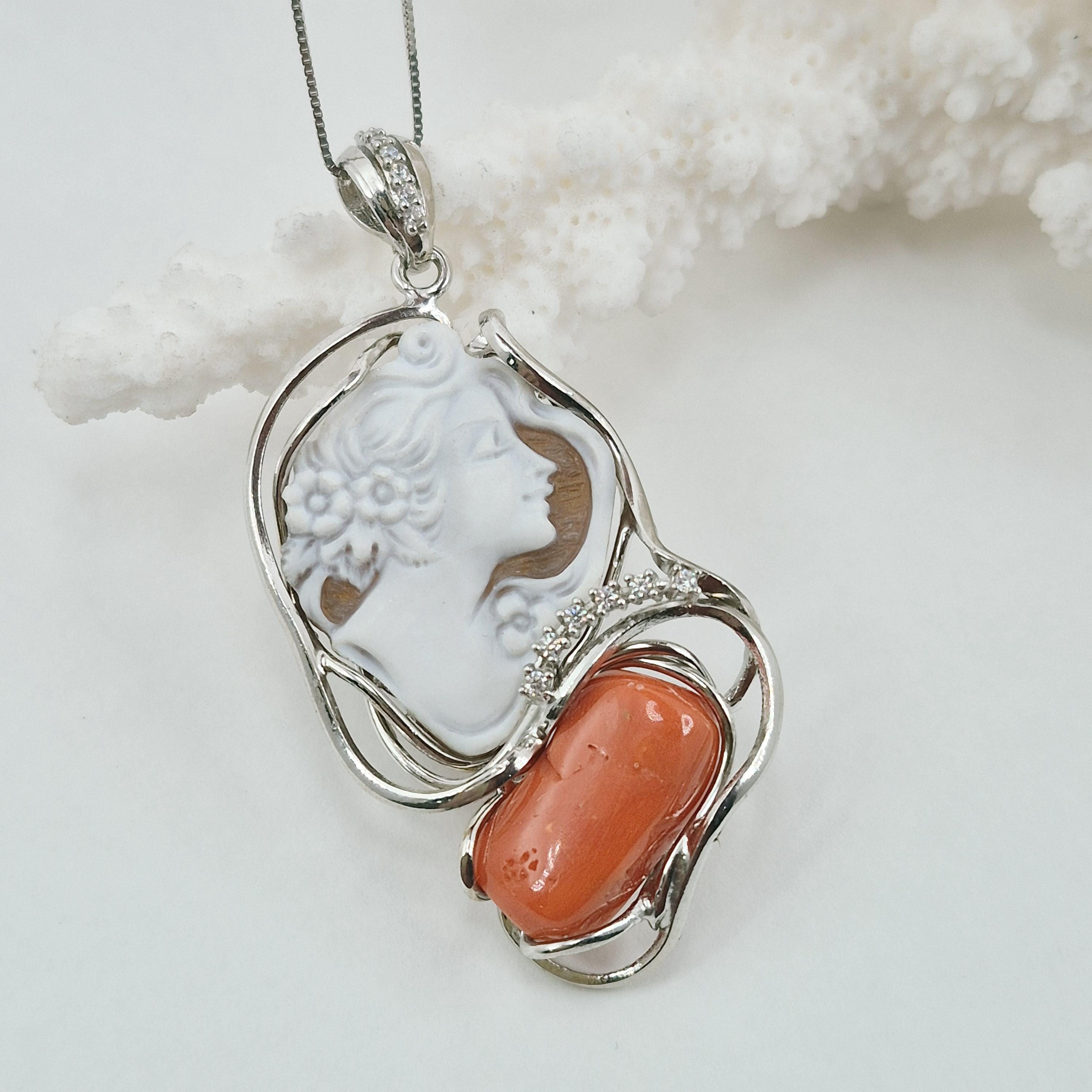 Enchanting necklace with Sardinian coral pendant and hand-engraved profile cameo on Cassis Madagascariensis shell.