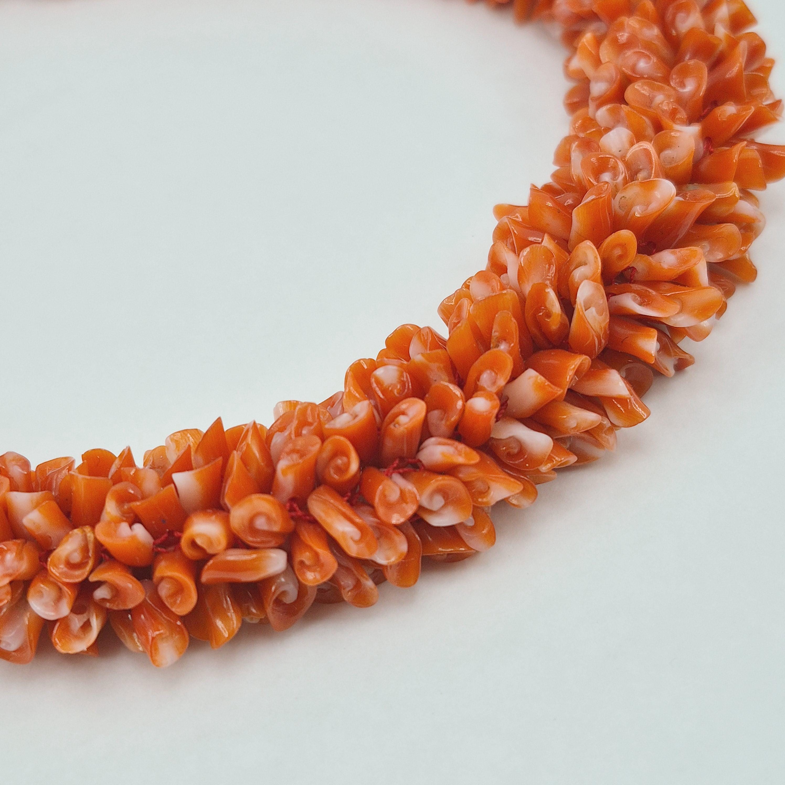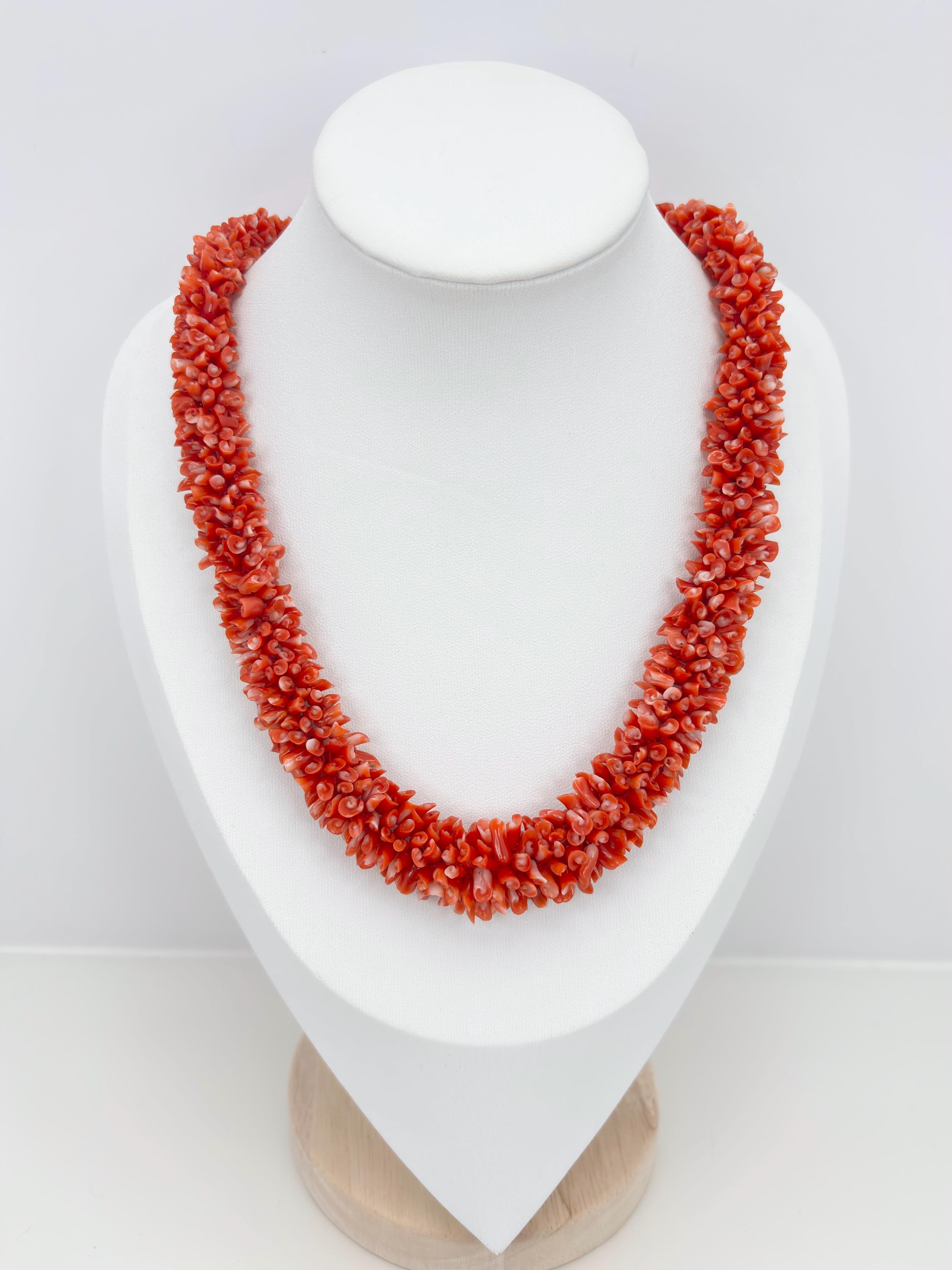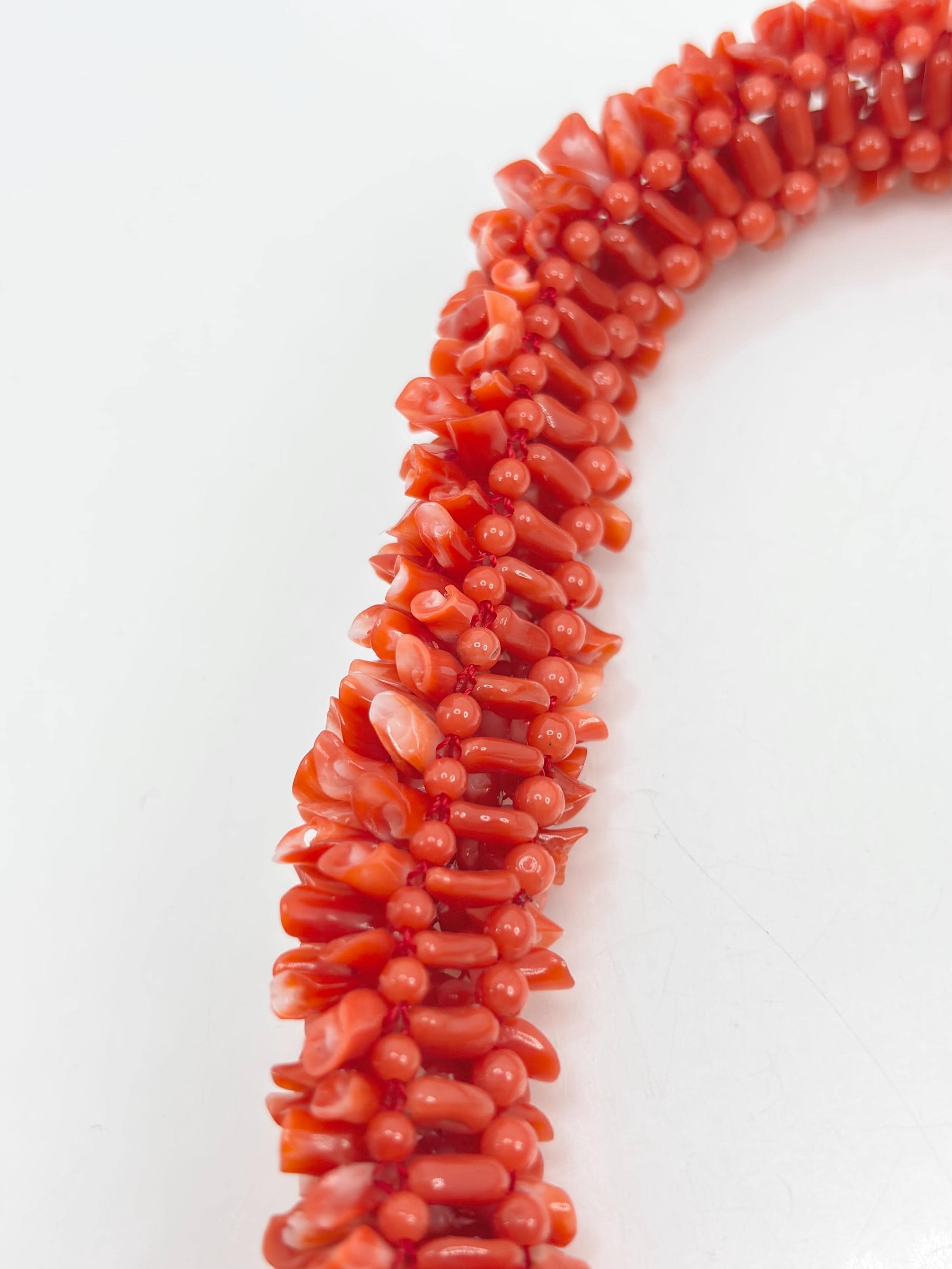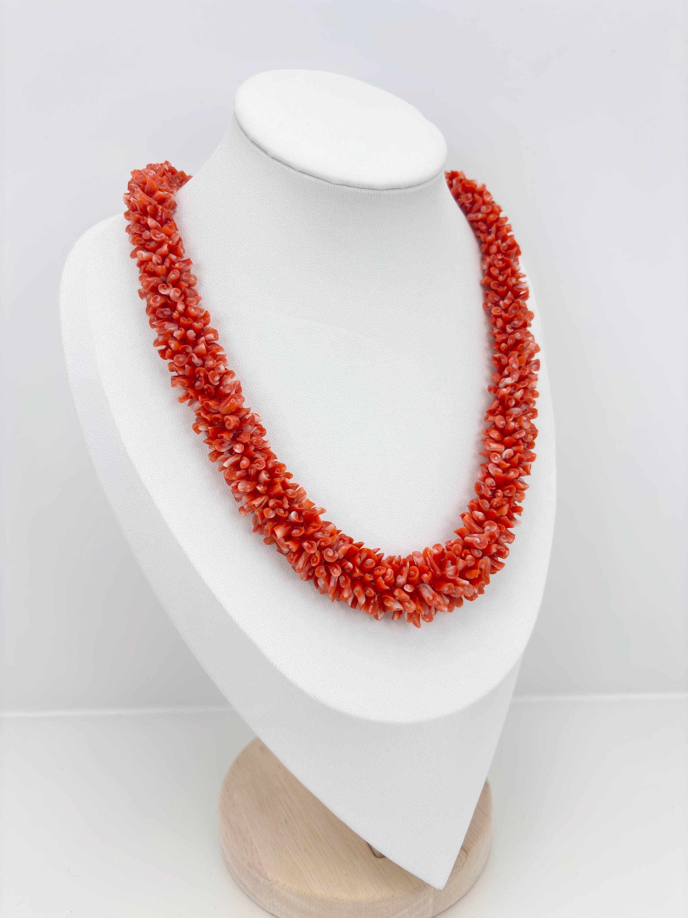 An impressive necklace, both in terms of its design and weight, adds a touch of elegance and uniqueness. This is a highly prized coral that can command truly high prices. Momo or cherry coral (Corallium elatius) is characterized by a white vein running through its entire clump, making it easily recognizable and attesting to its authenticity.