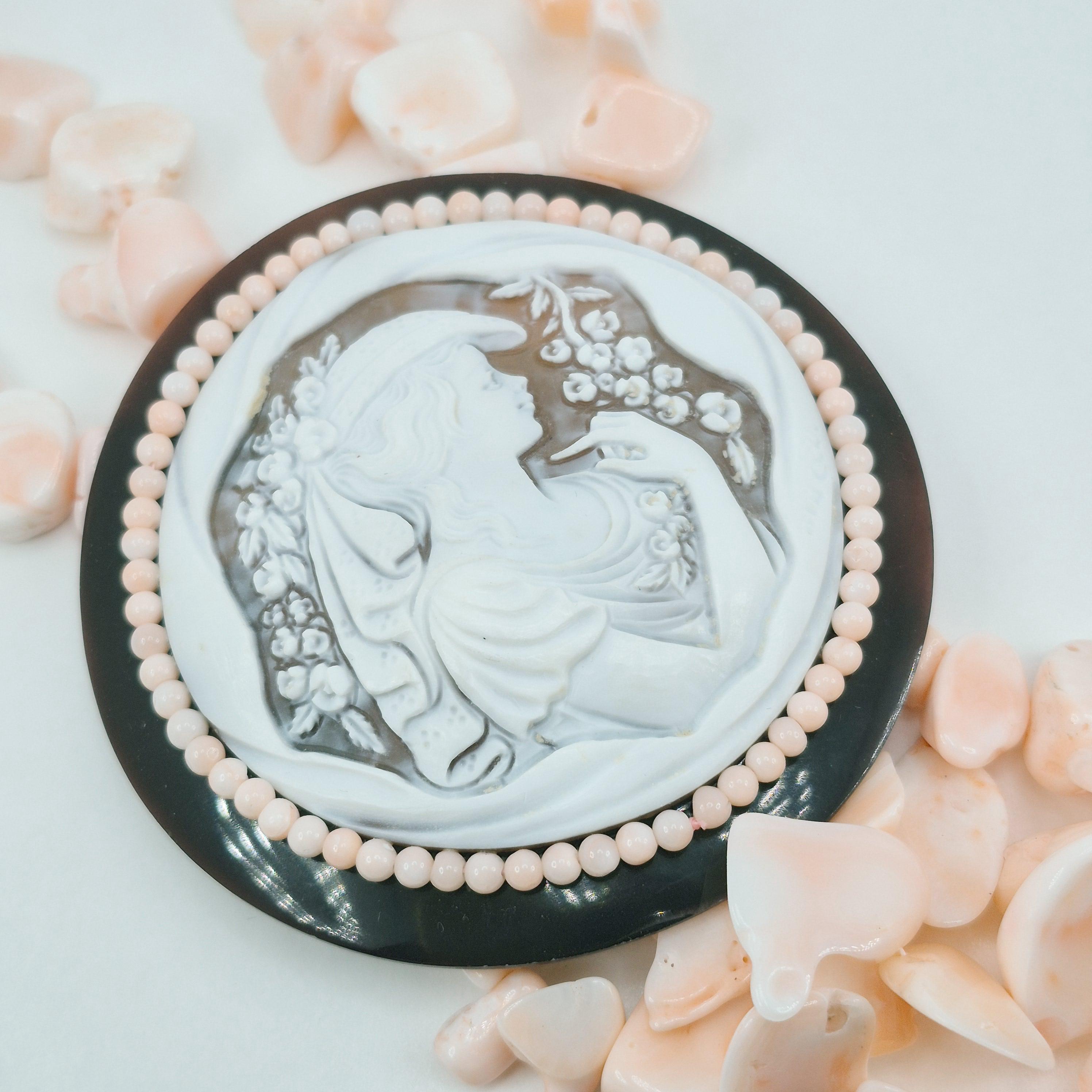 Hand-engraved cameo on sardonyx shell of ancient manufacture dating back to the mid-20th century, signed by the artist.