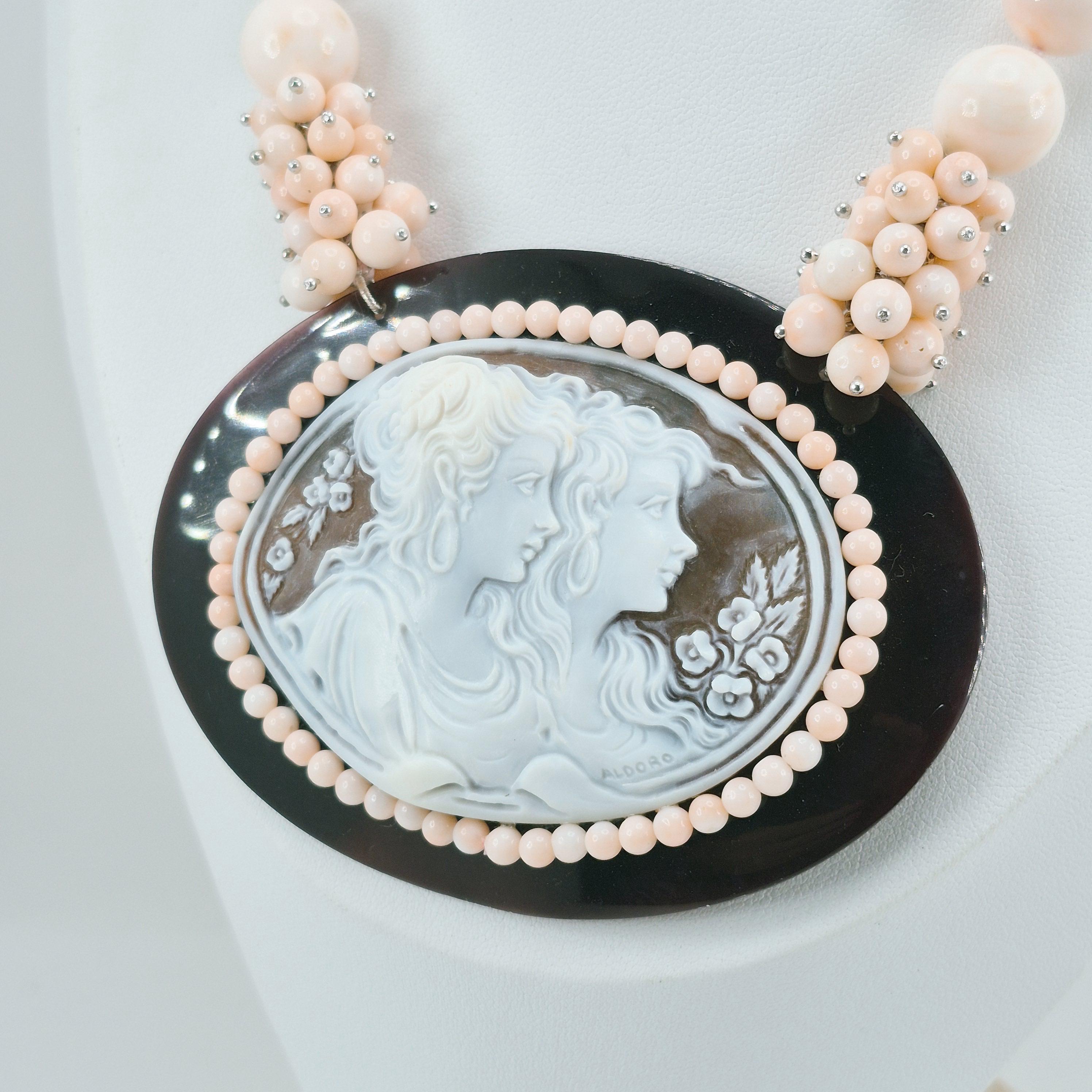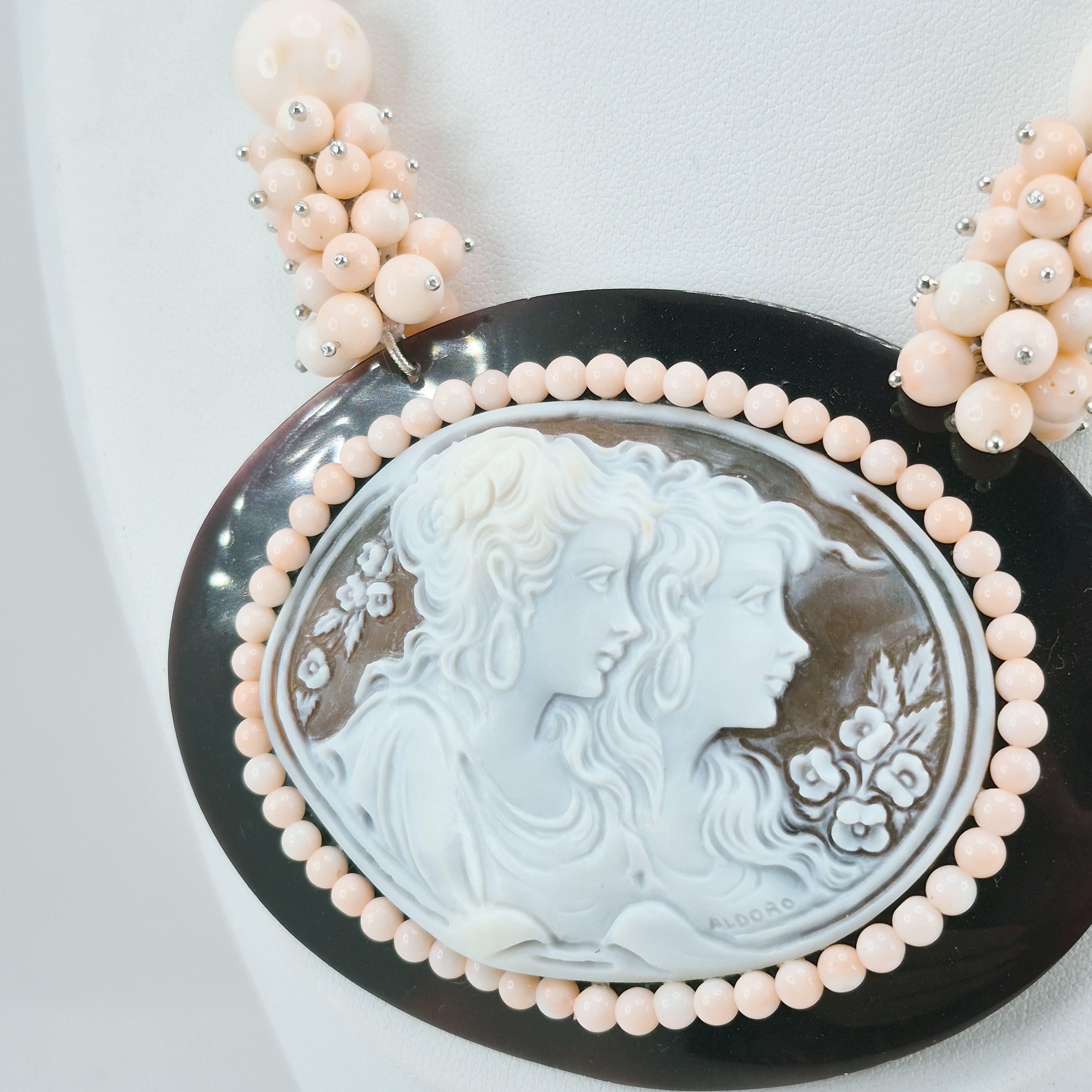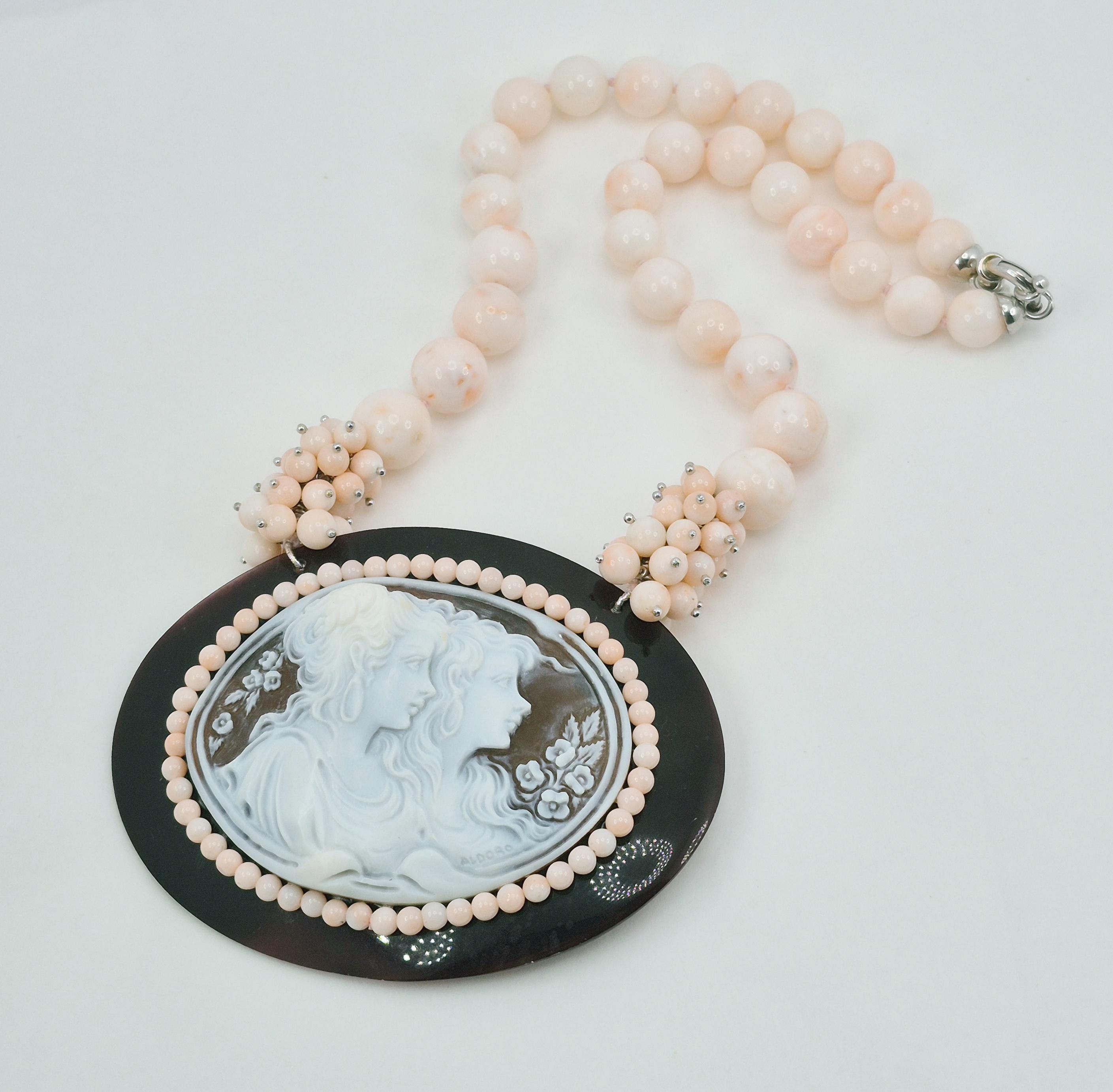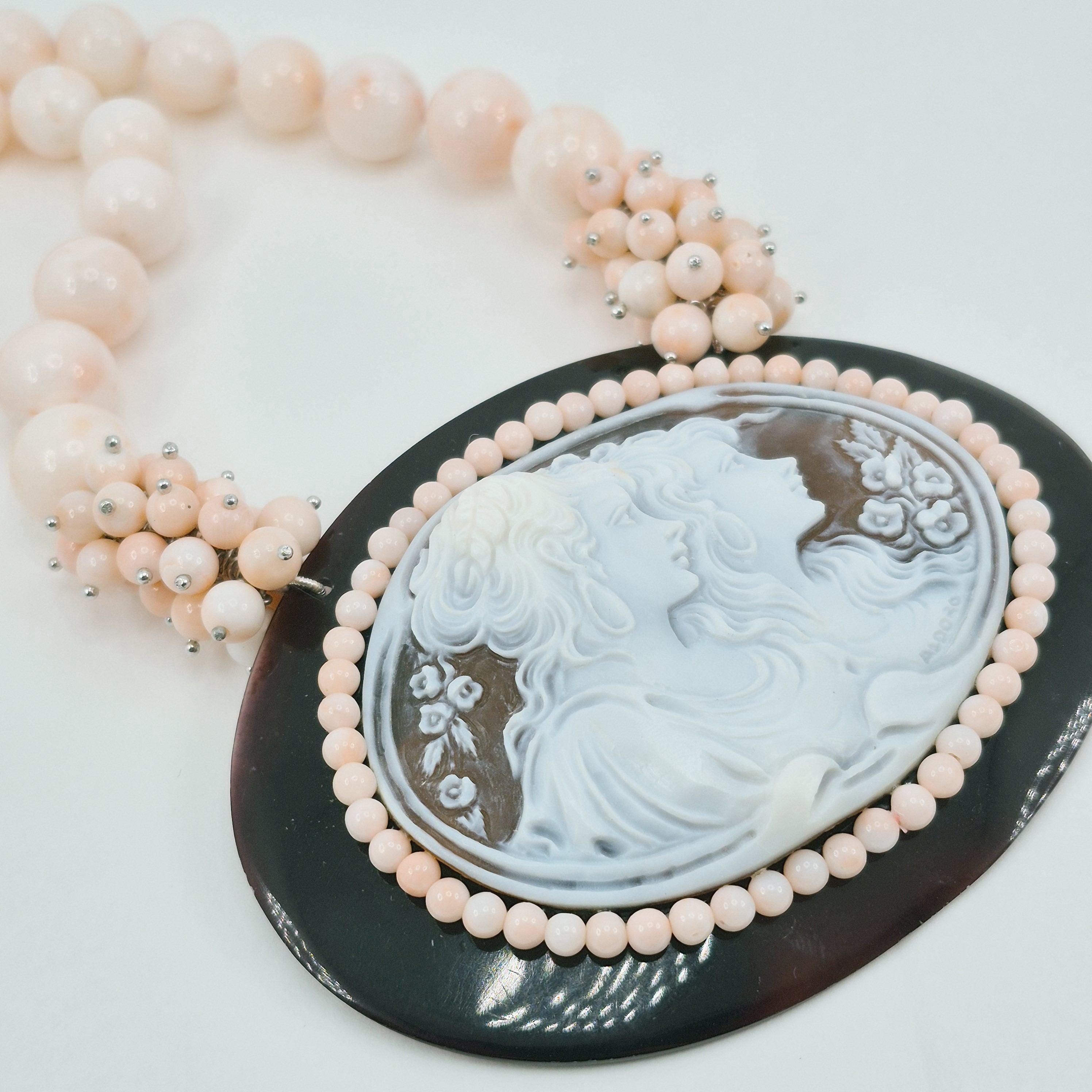 Central cameo engraved on sardonyx shell in the mid-1900s, enchanting old-style representation.