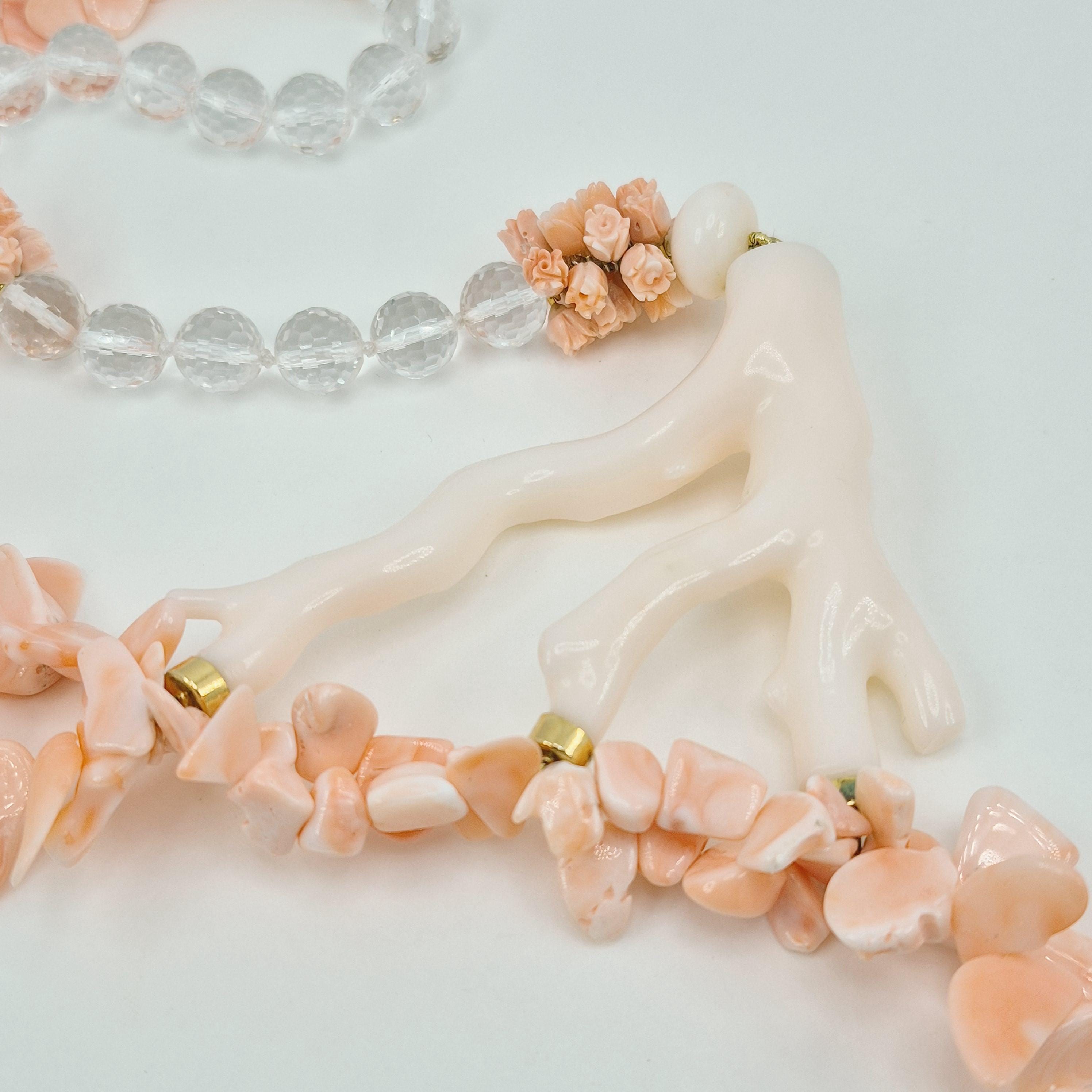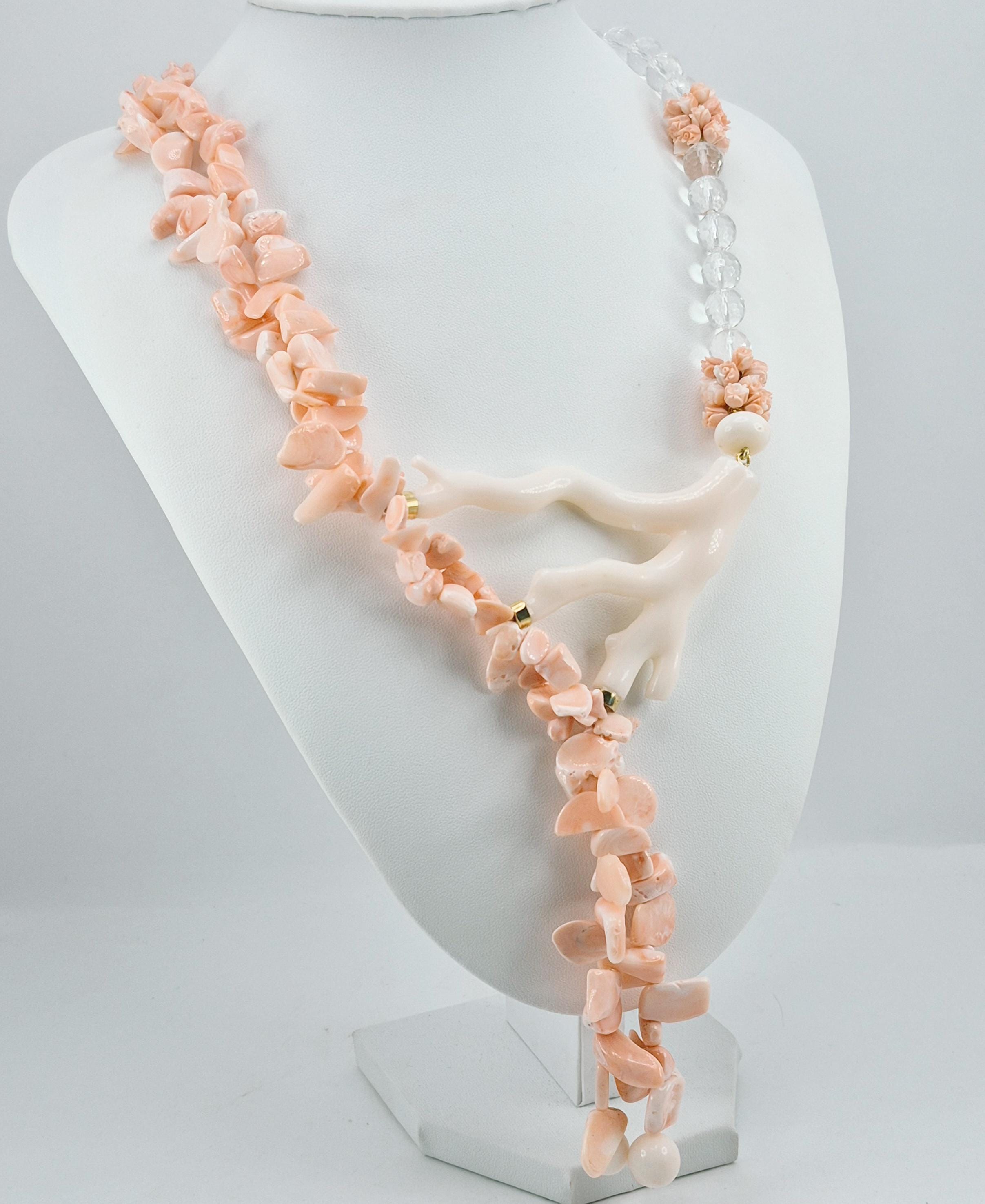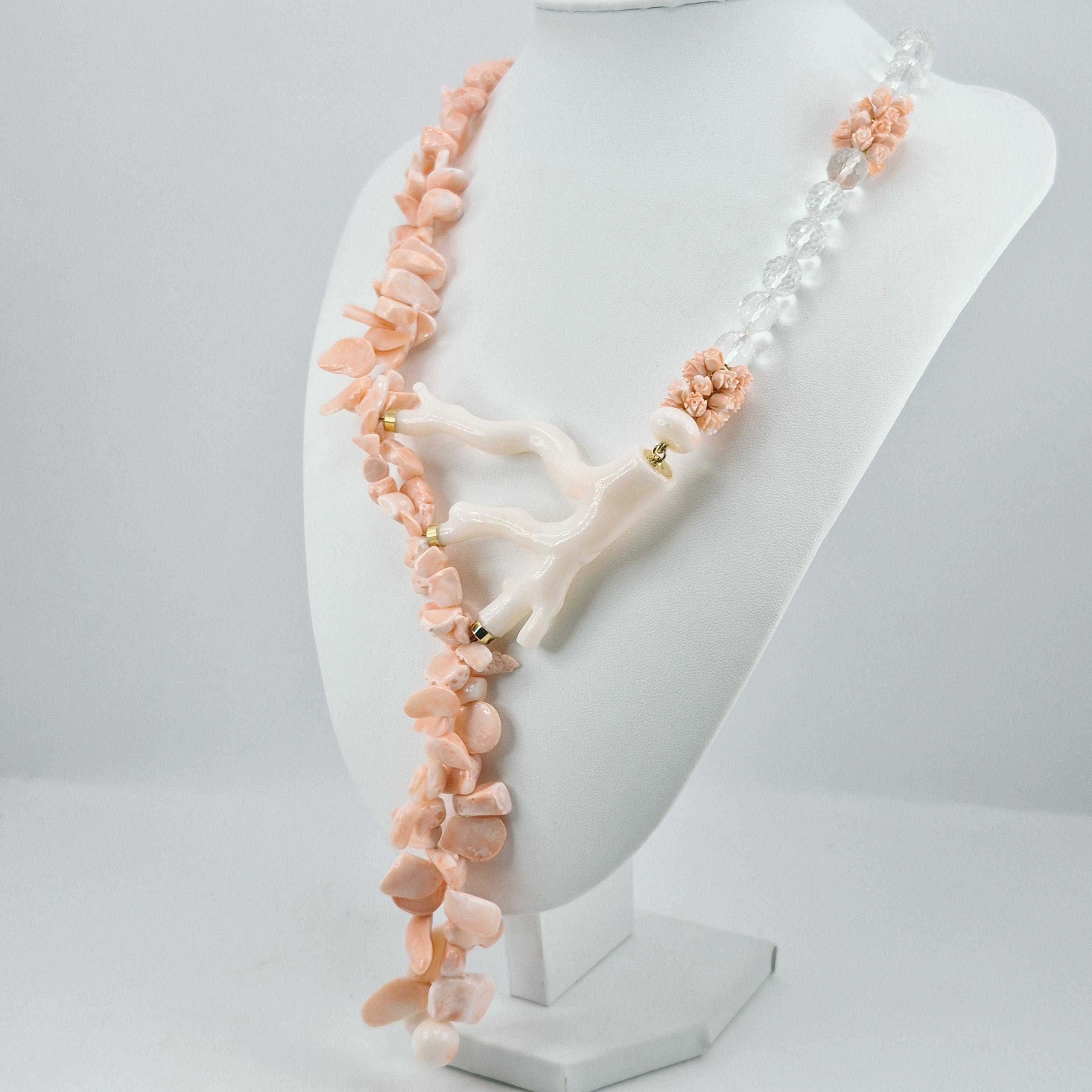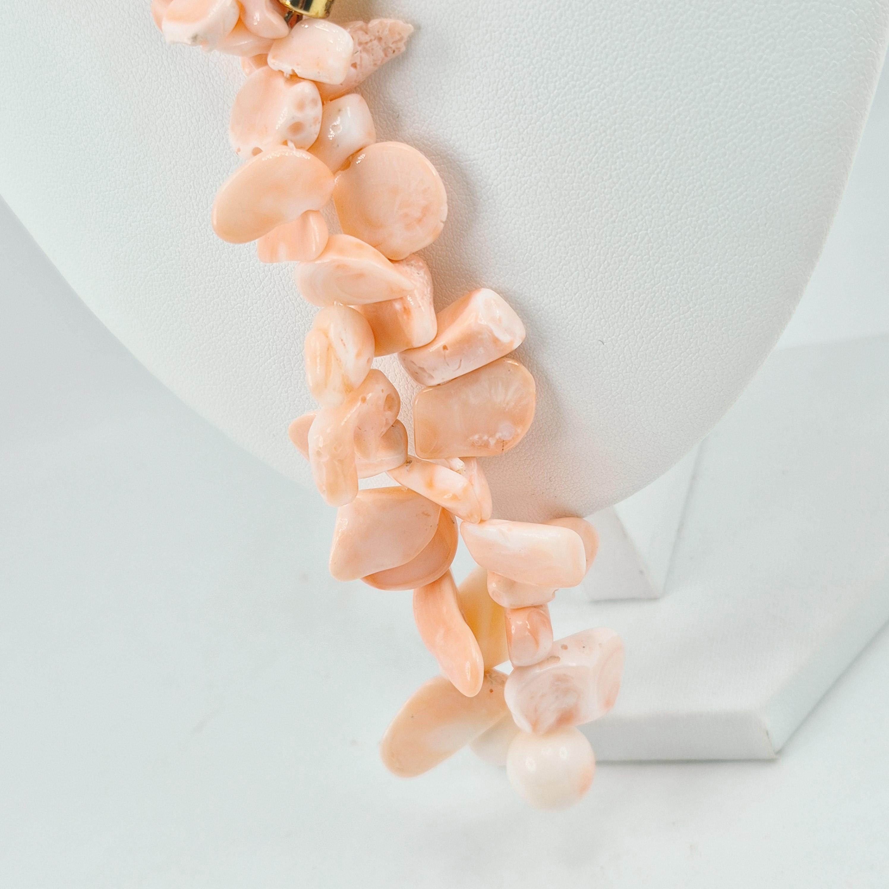A large-size necklace in pink coral fragments from the Pacific seas and handcrafted in Torre del Greco, with an old-style lateral cameo engraved at the end of the 20th century by a skilled engraver, beautiful and meticulous in its details.