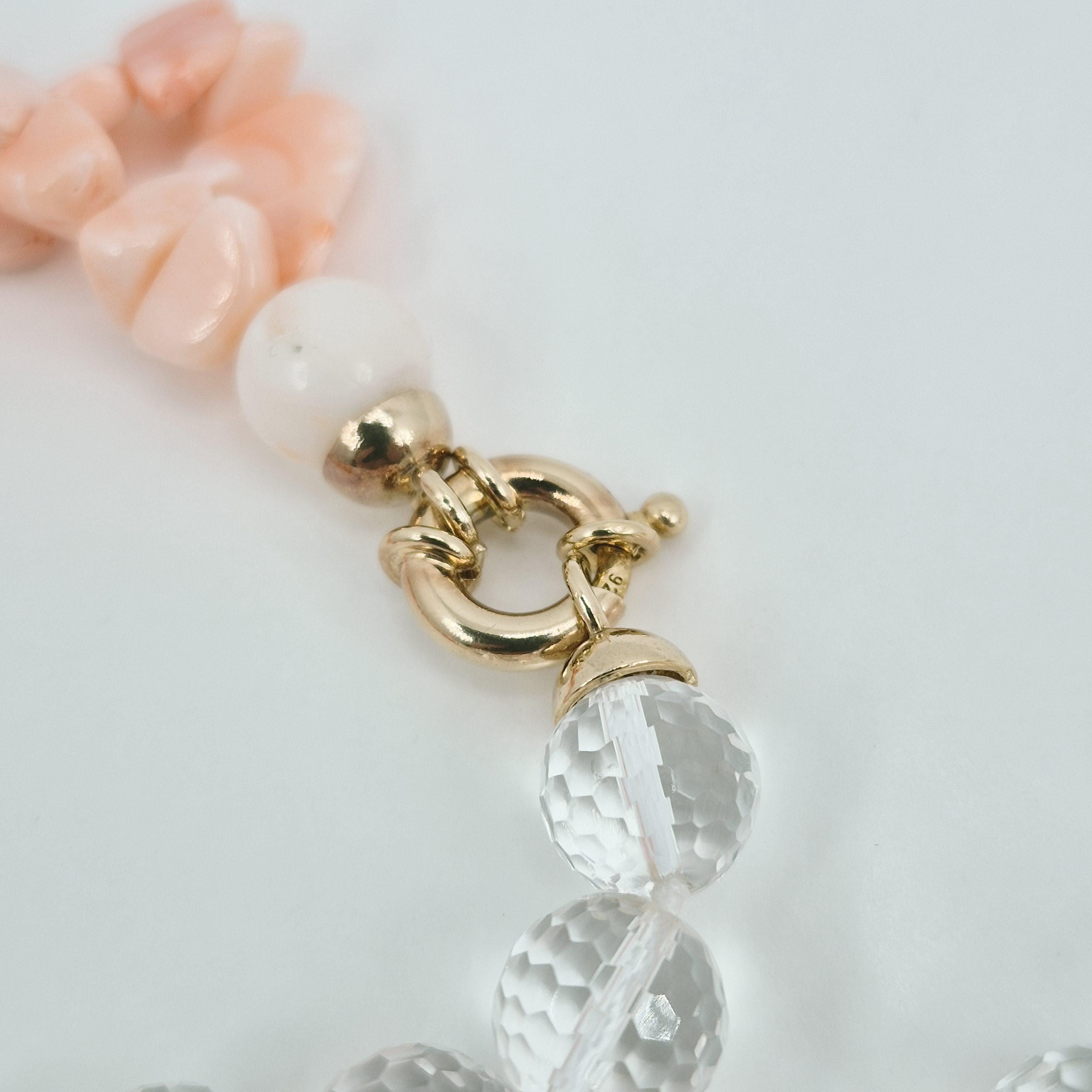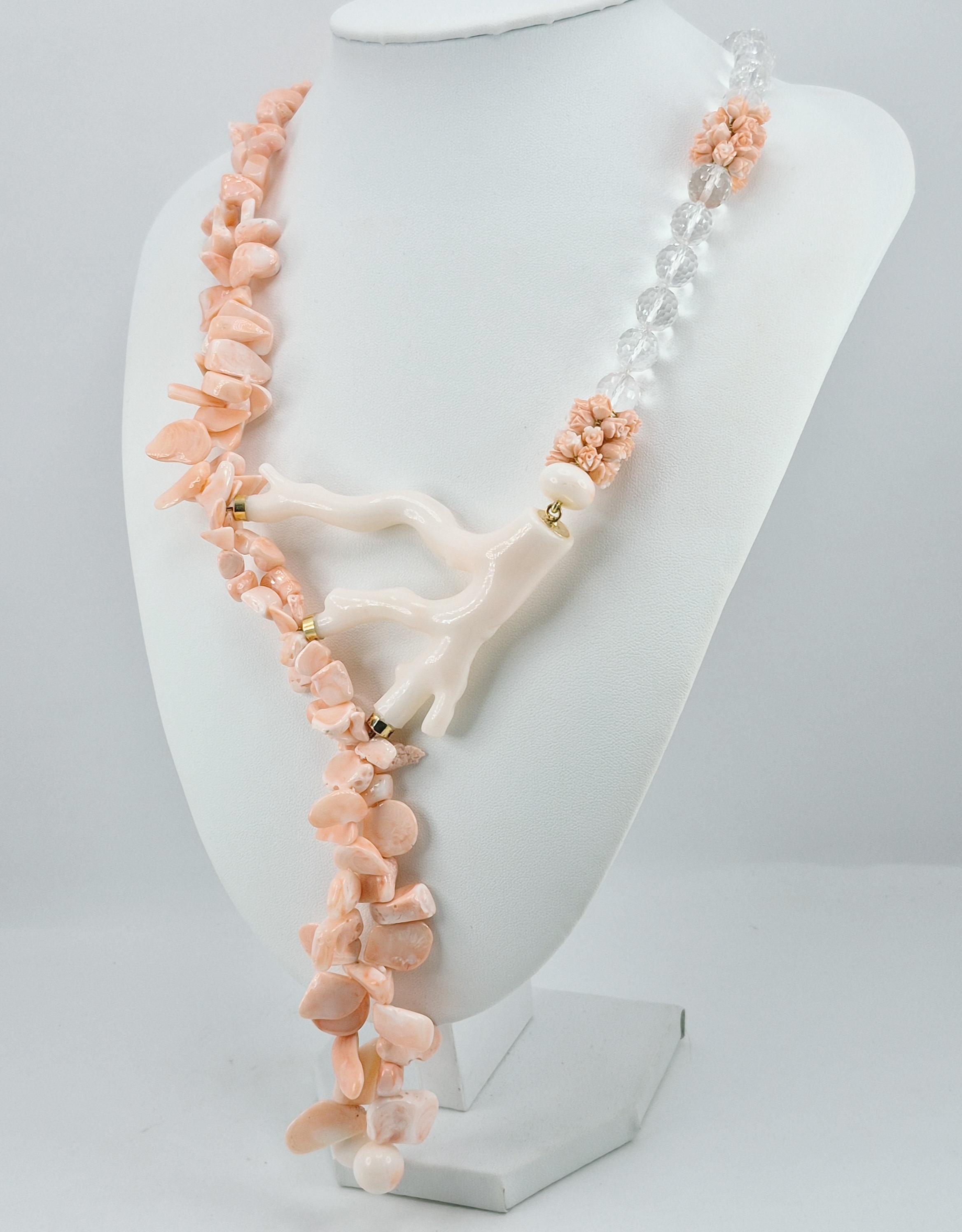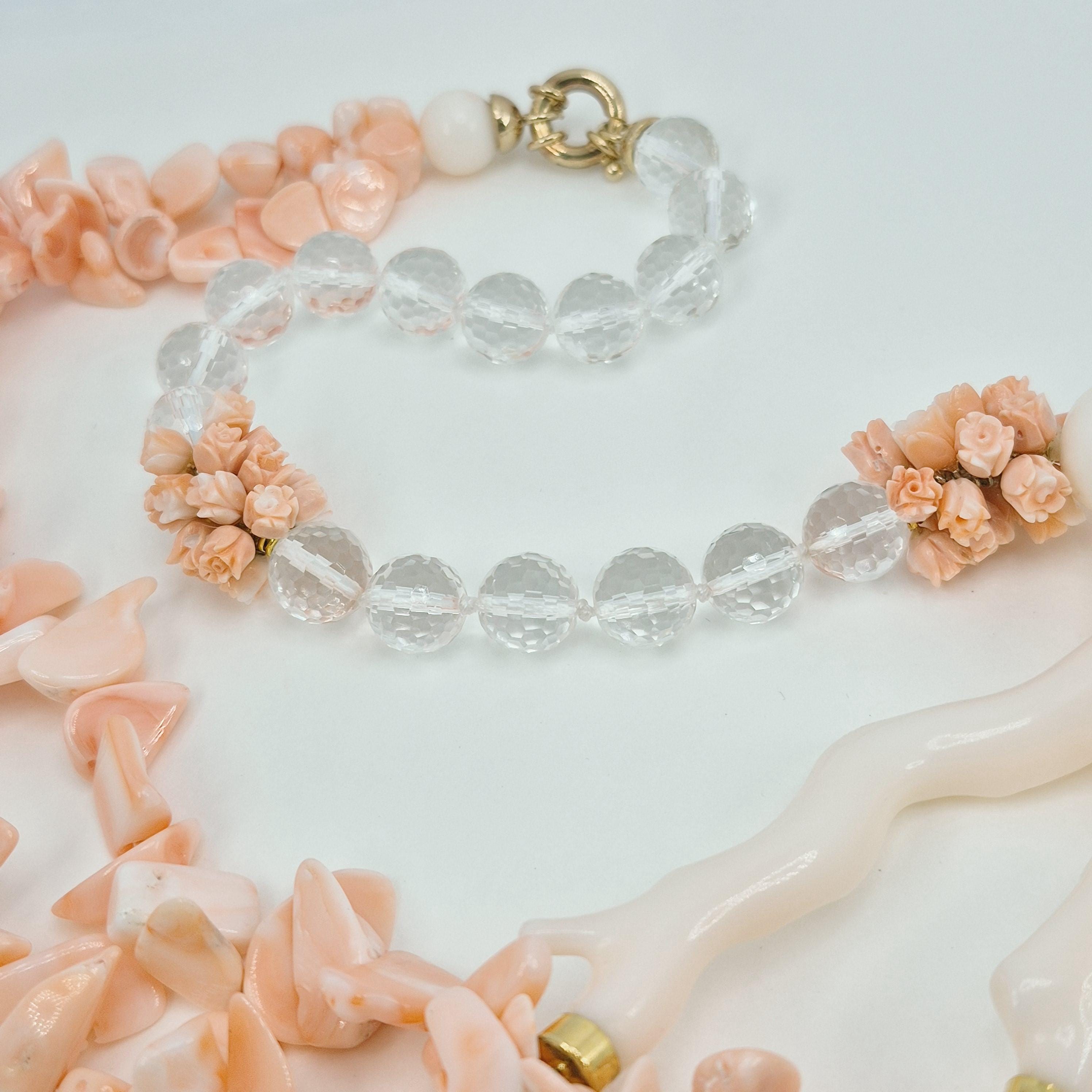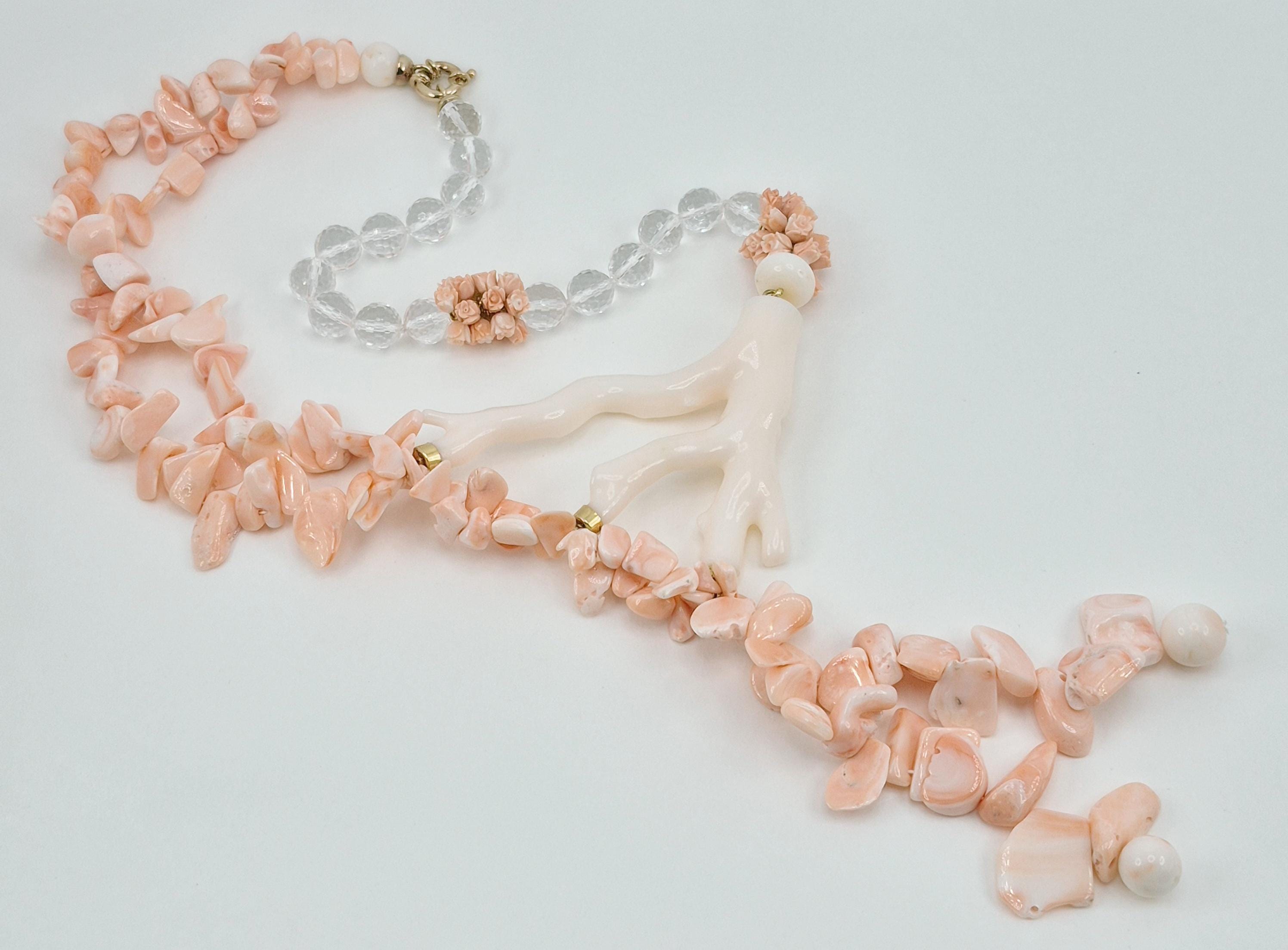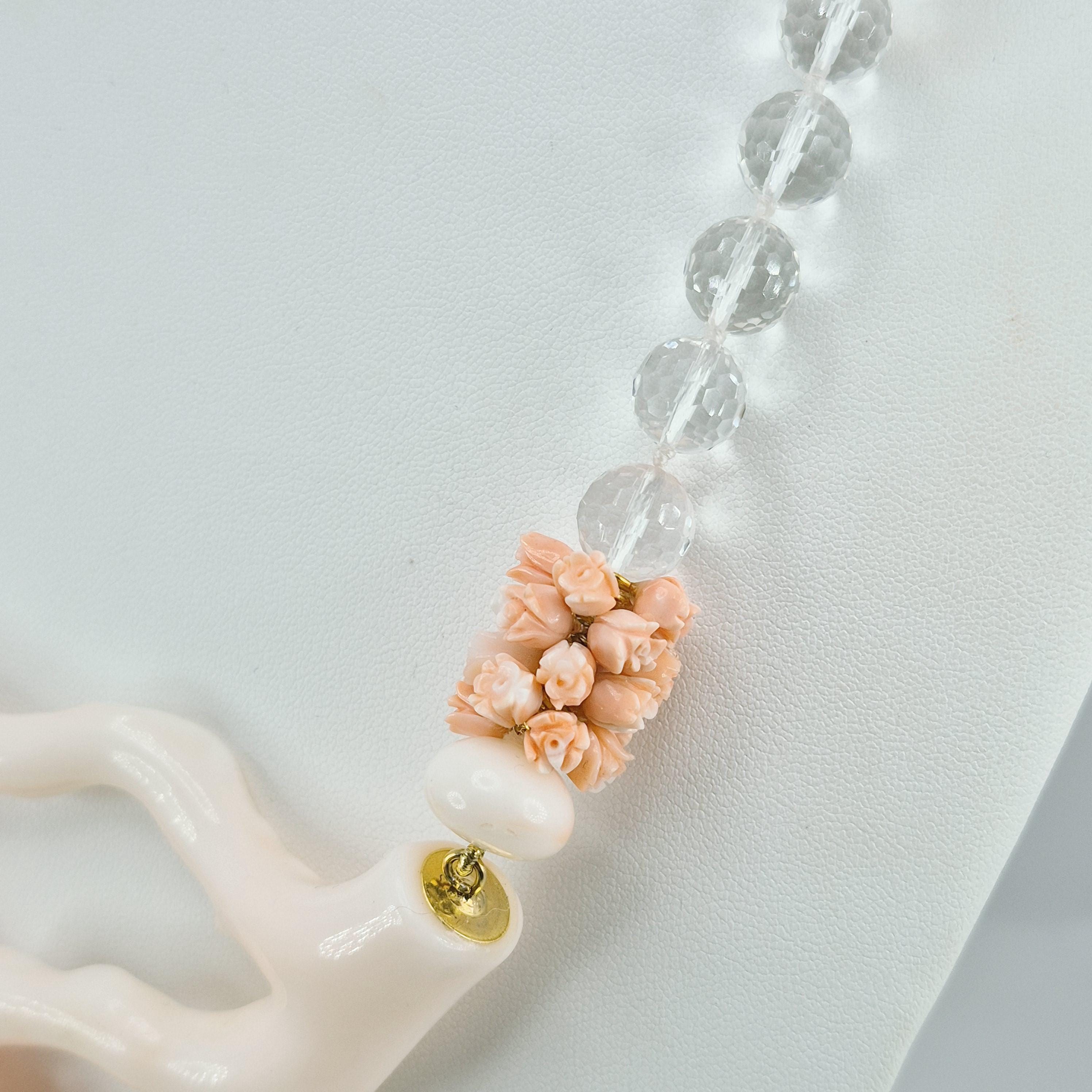 A large-size necklace in pink coral fragments from the Pacific seas and handcrafted in Torre del Greco, with an old-style lateral cameo engraved at the end of the 20th century by a skilled engraver, beautiful and meticulous in its details.