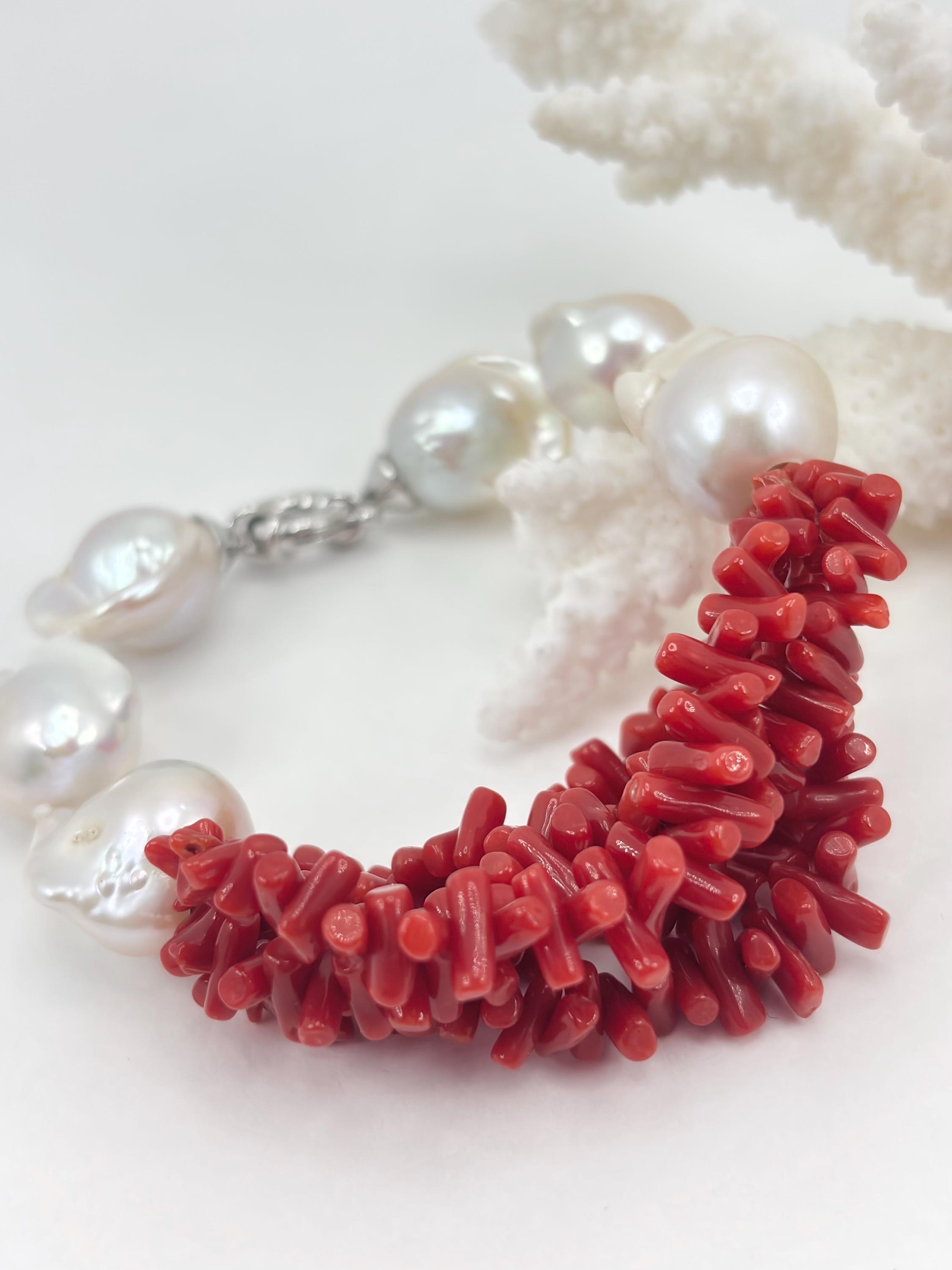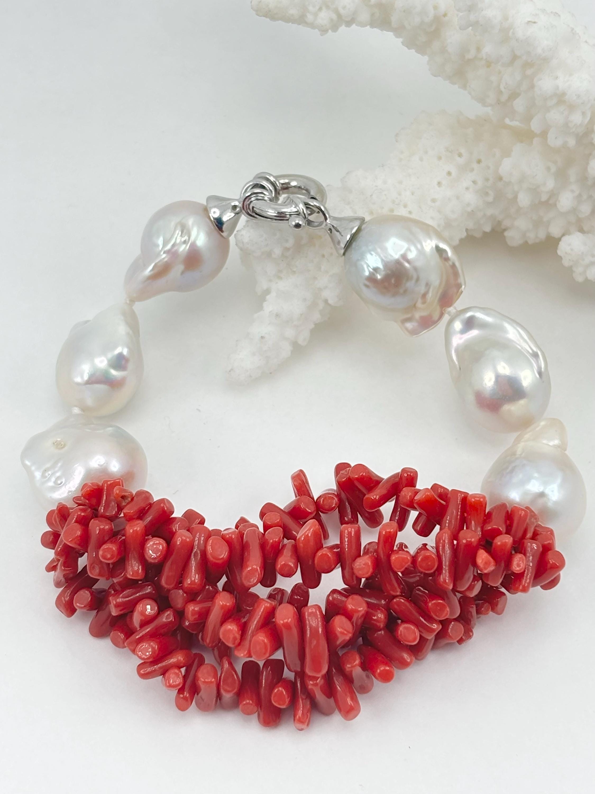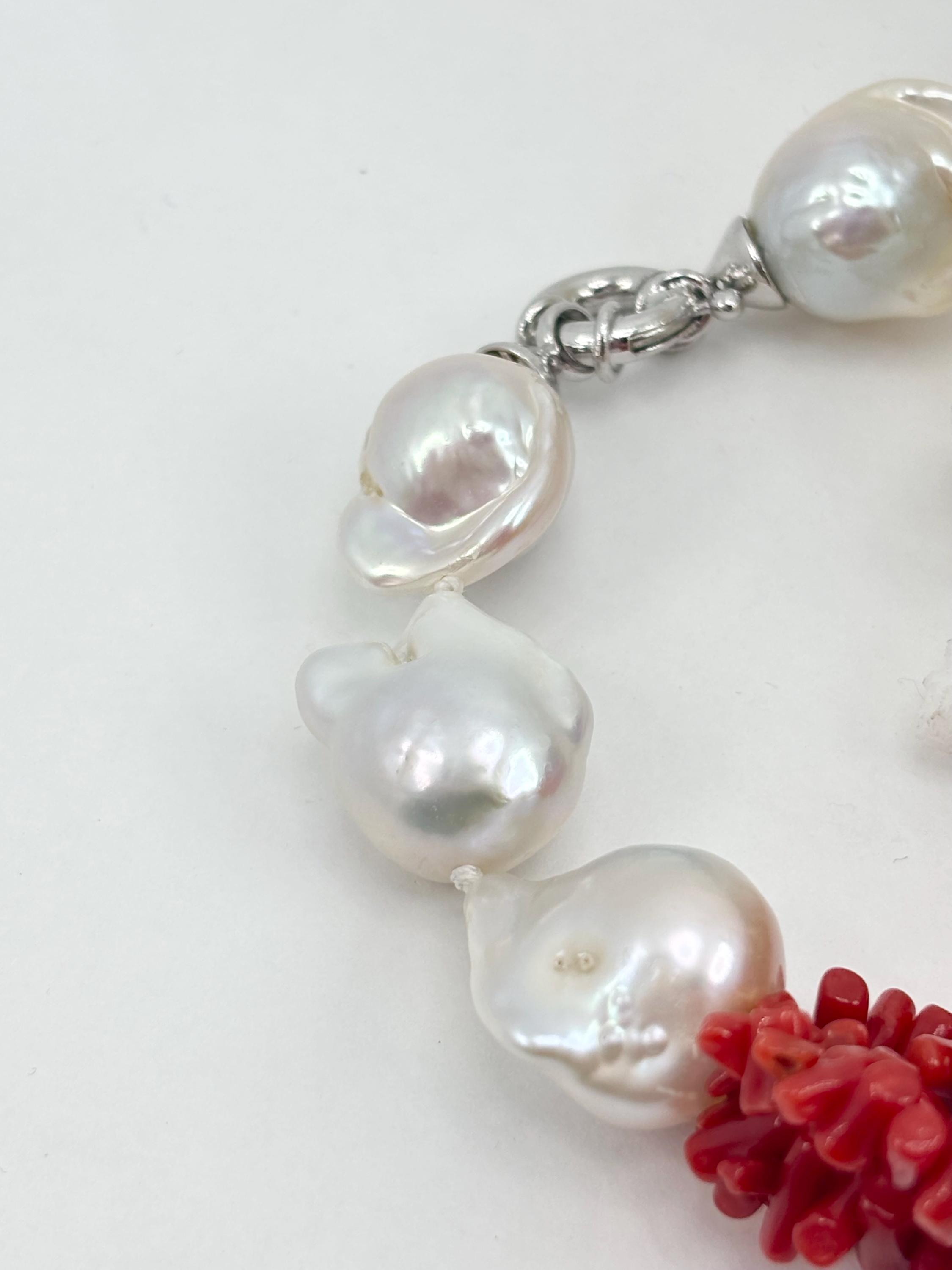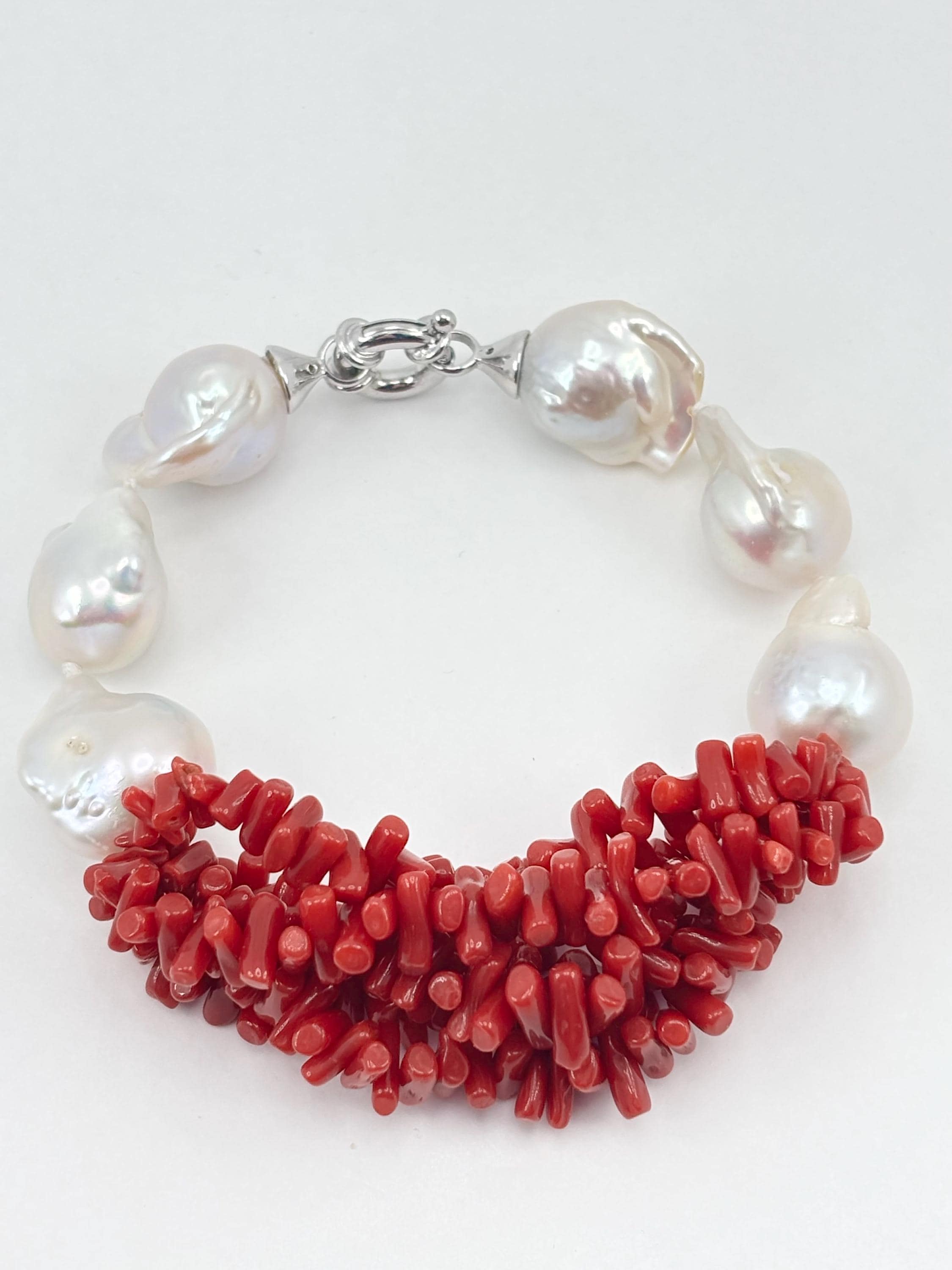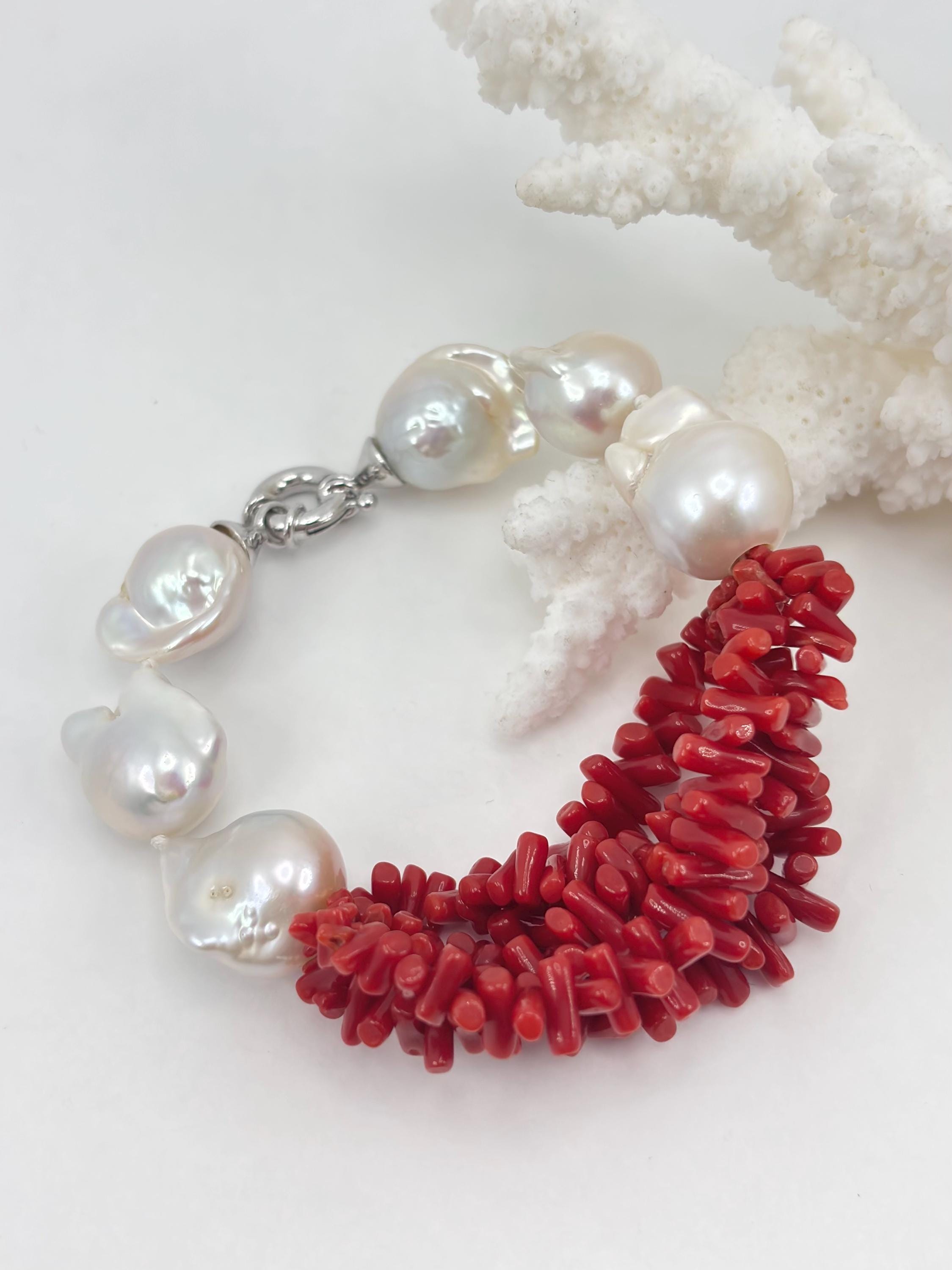 Beautiful and imposing bracelet in Mediterranean coral and baroque freshwater cultured pearls of excellent quality from Asia.