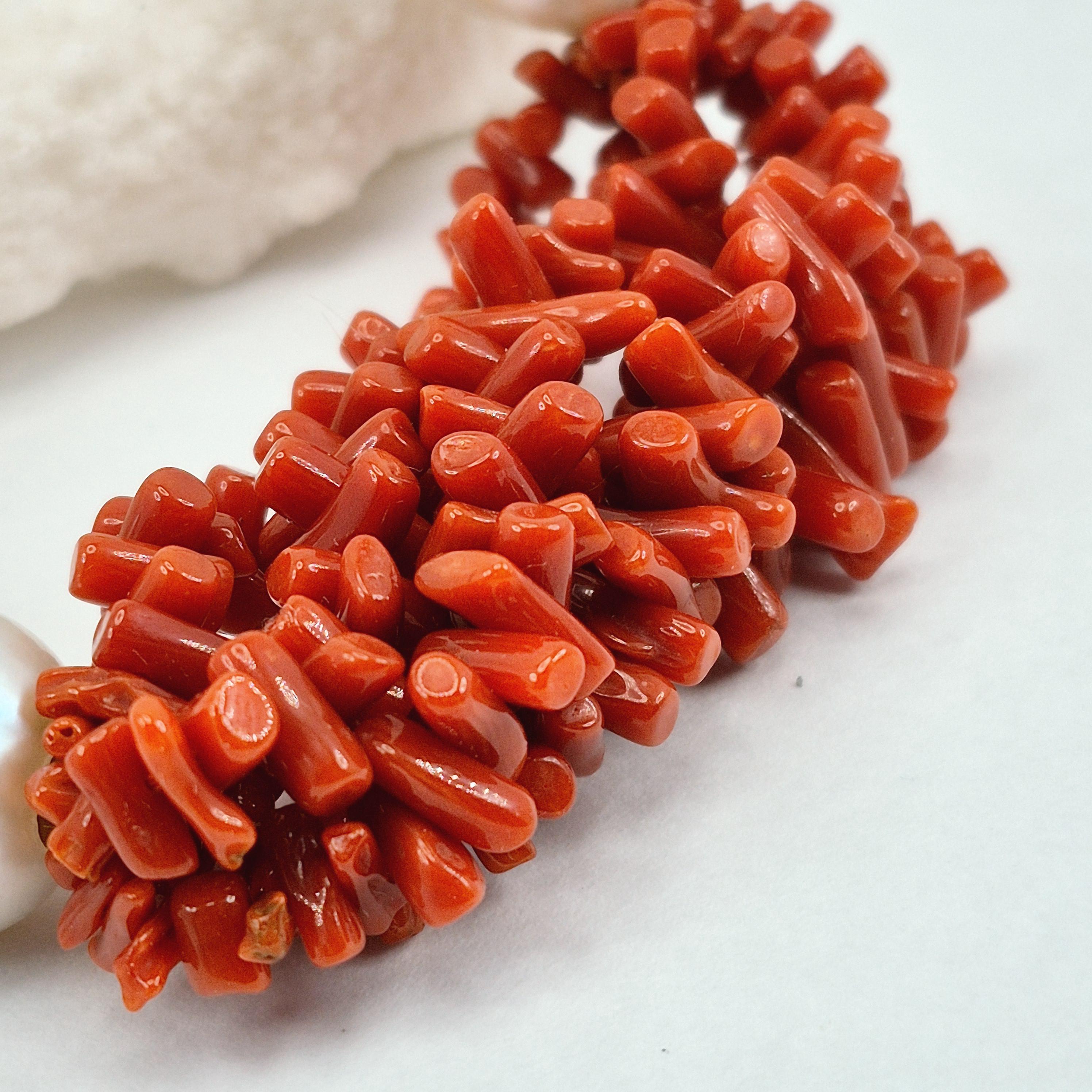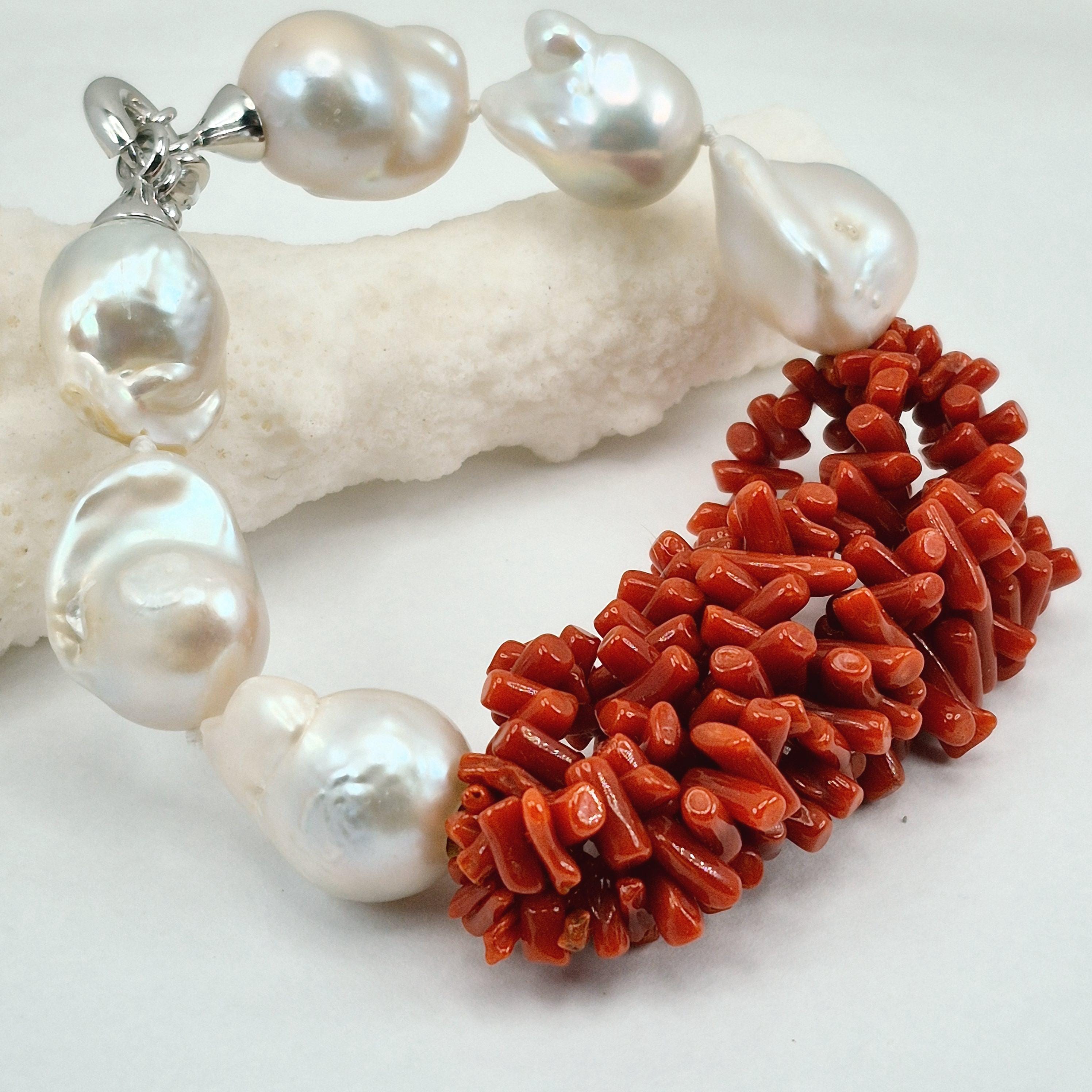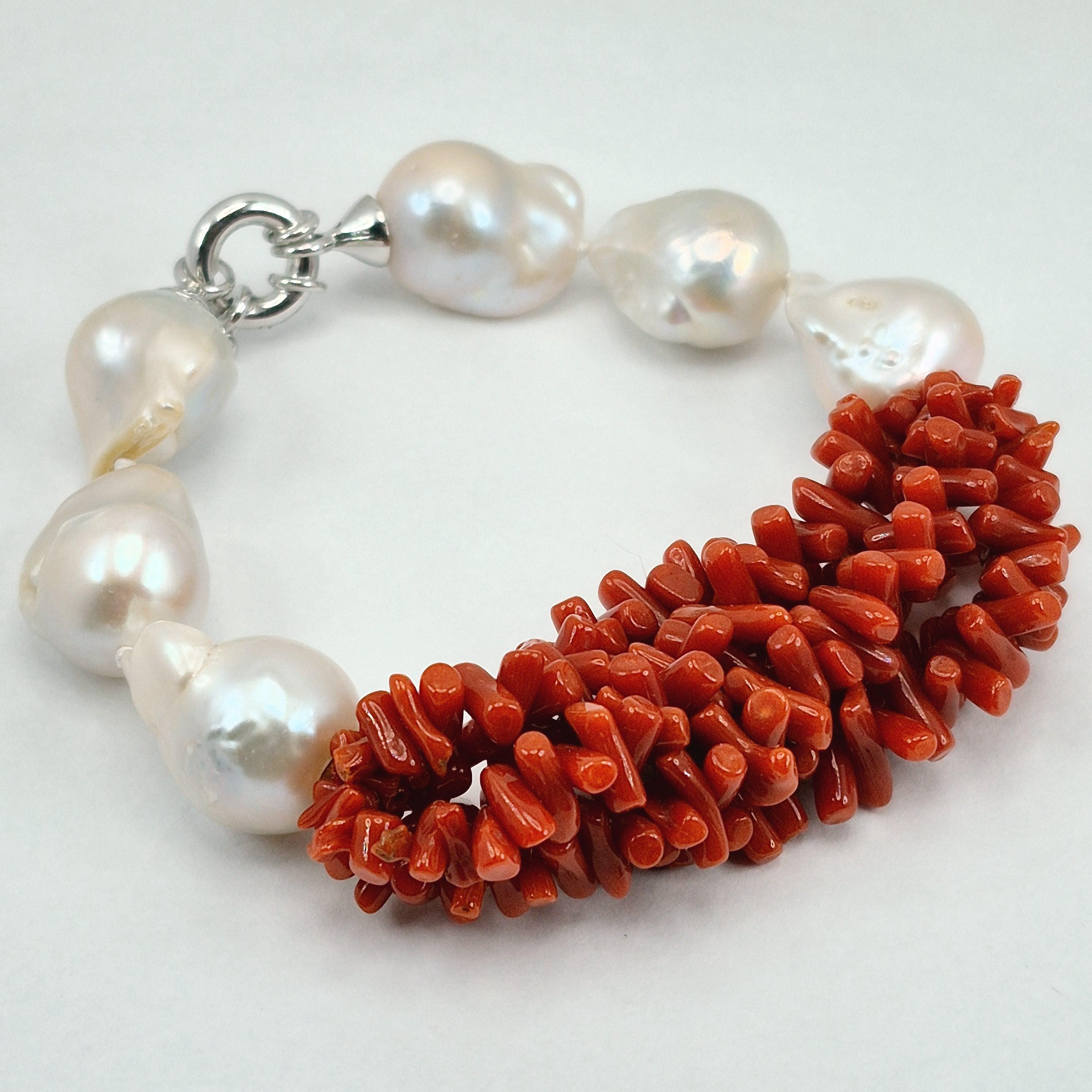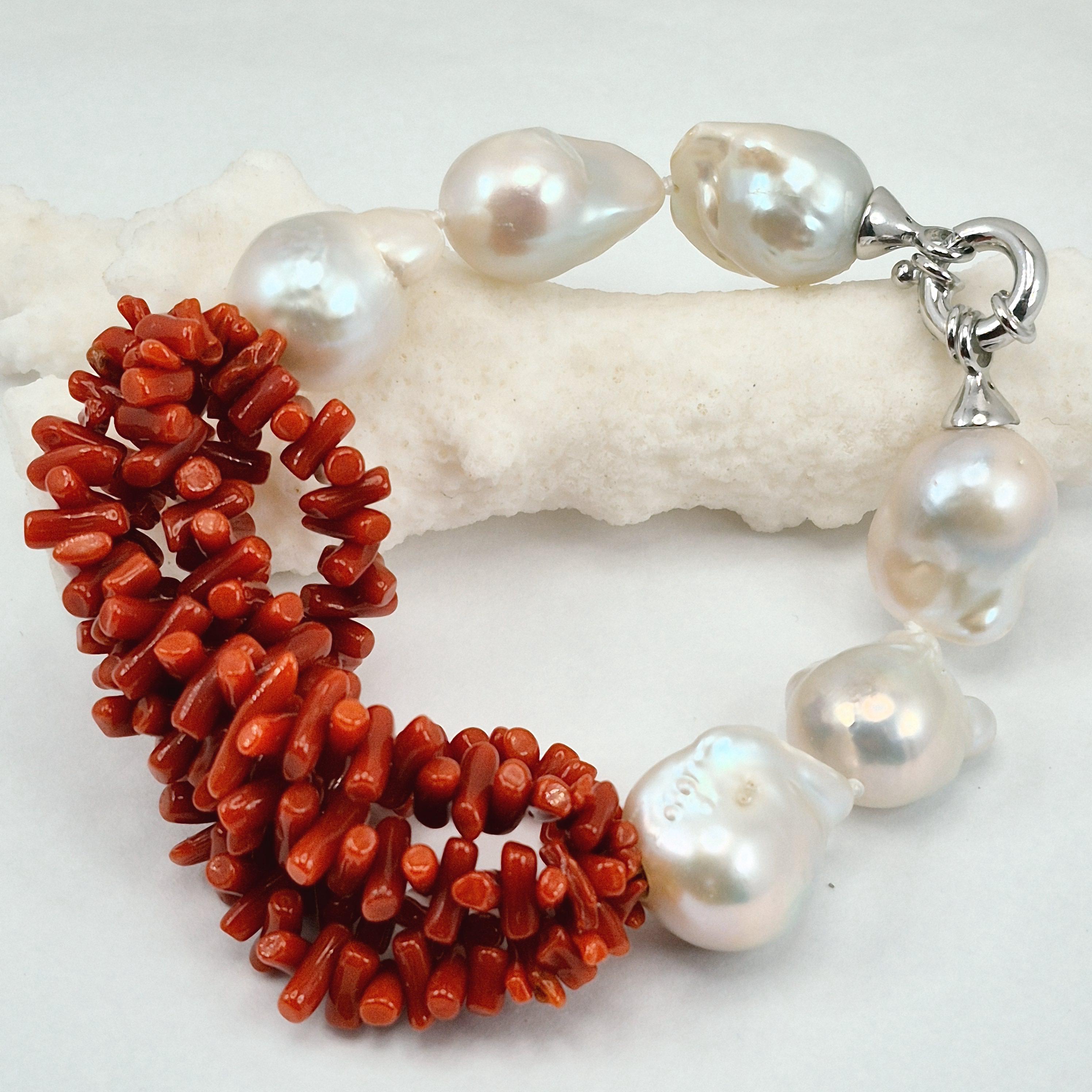 Beautiful and imposing bracelet in Mediterranean coral and Edison baroque freshwater cultured pearls of excellent quality from Asia.