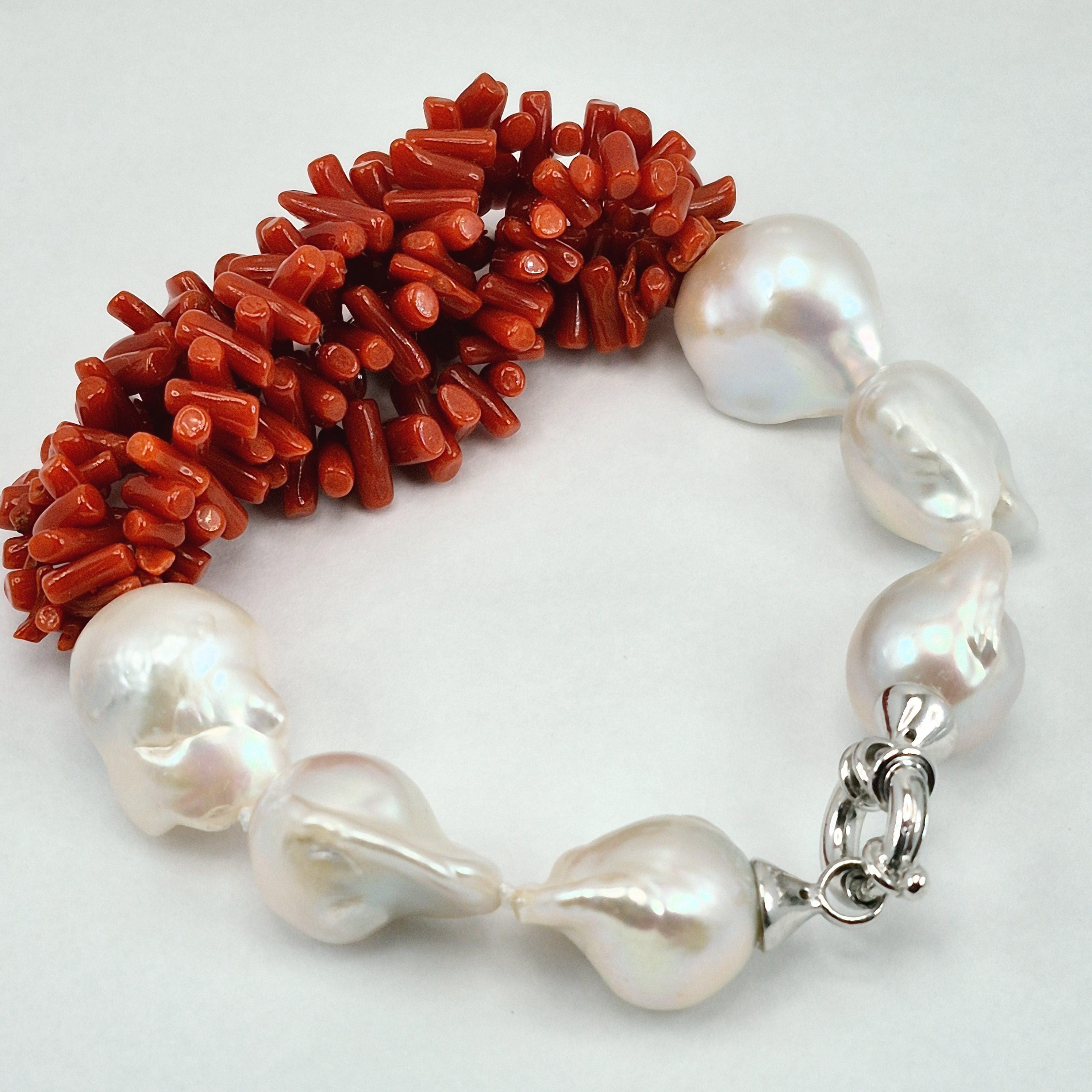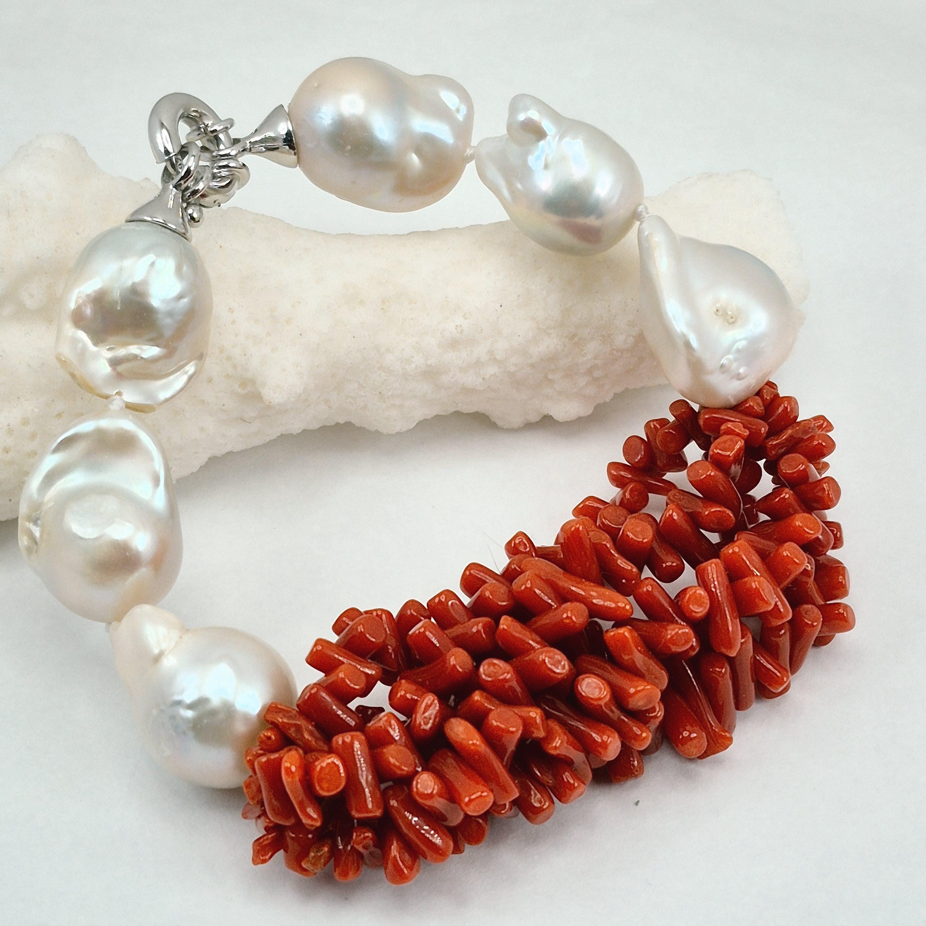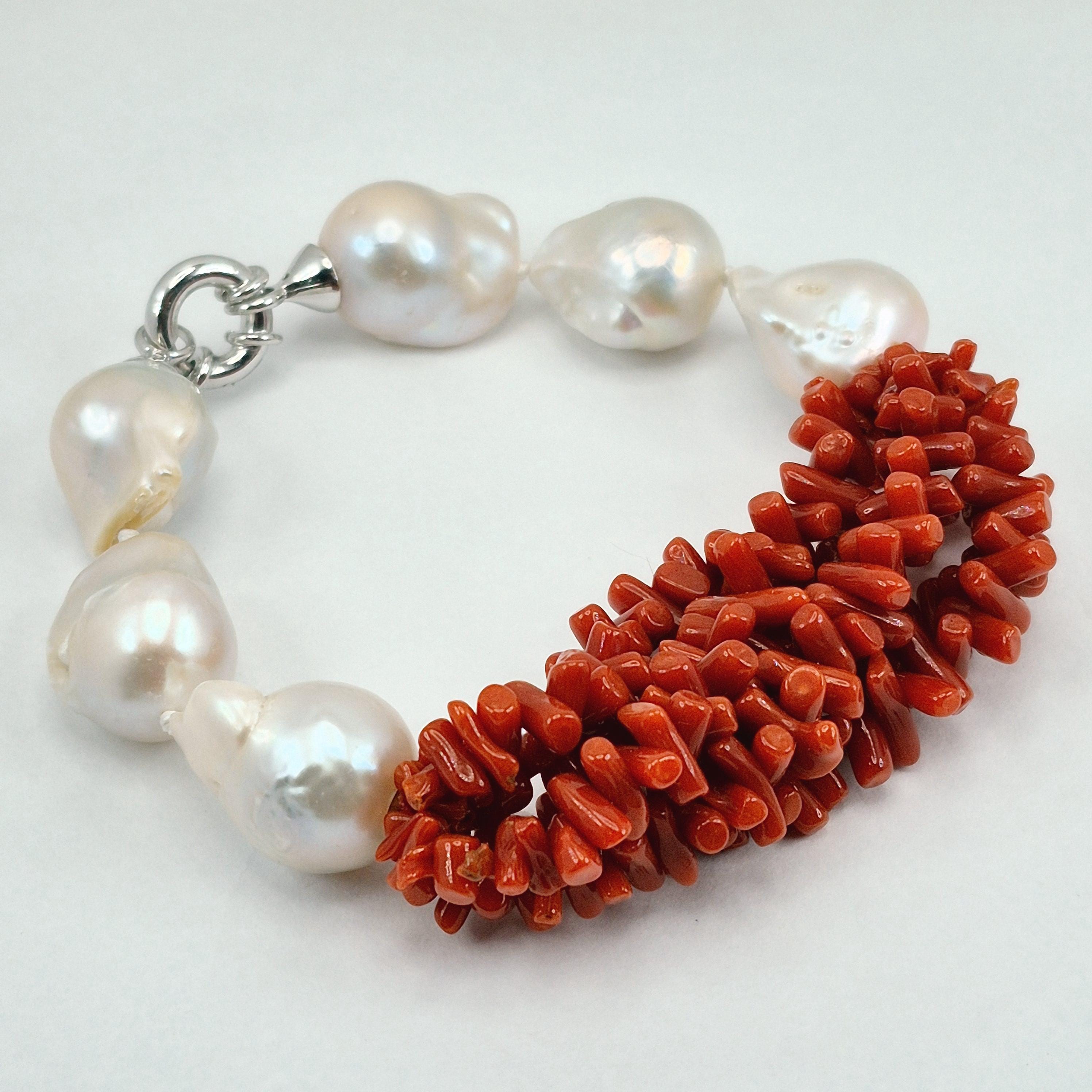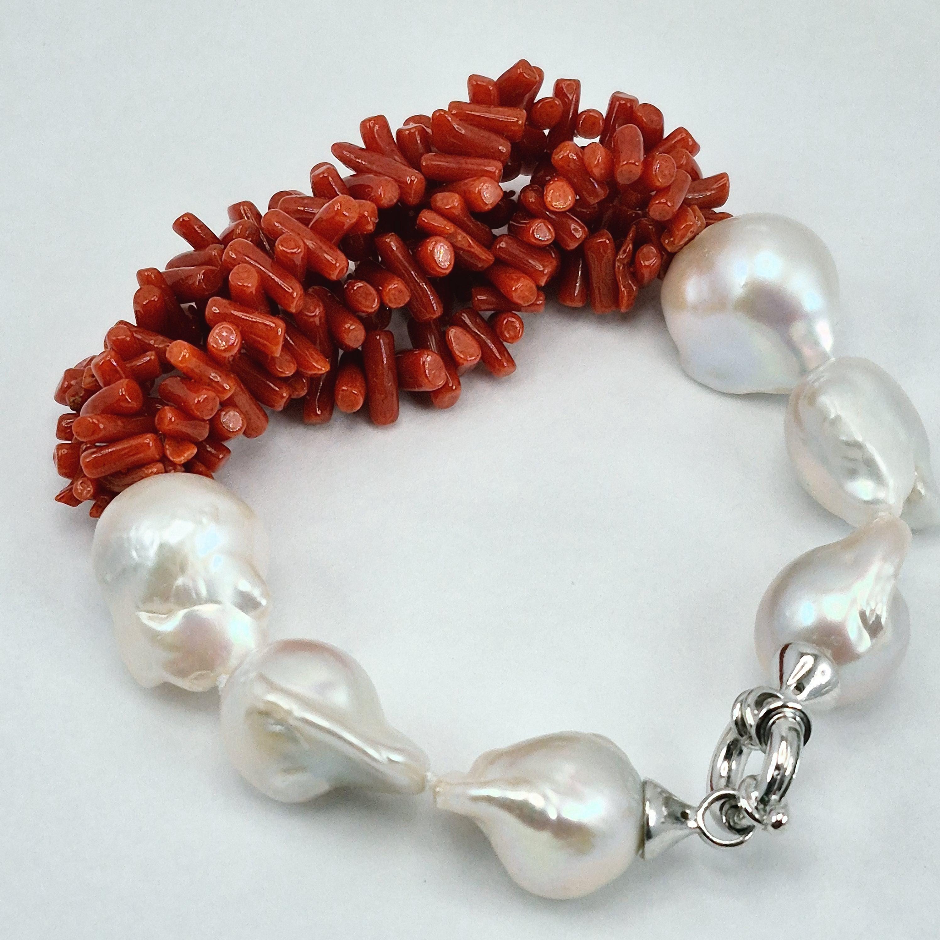 Beautiful and imposing bracelet in Mediterranean coral and Edison baroque freshwater cultured pearls of excellent quality from Asia.