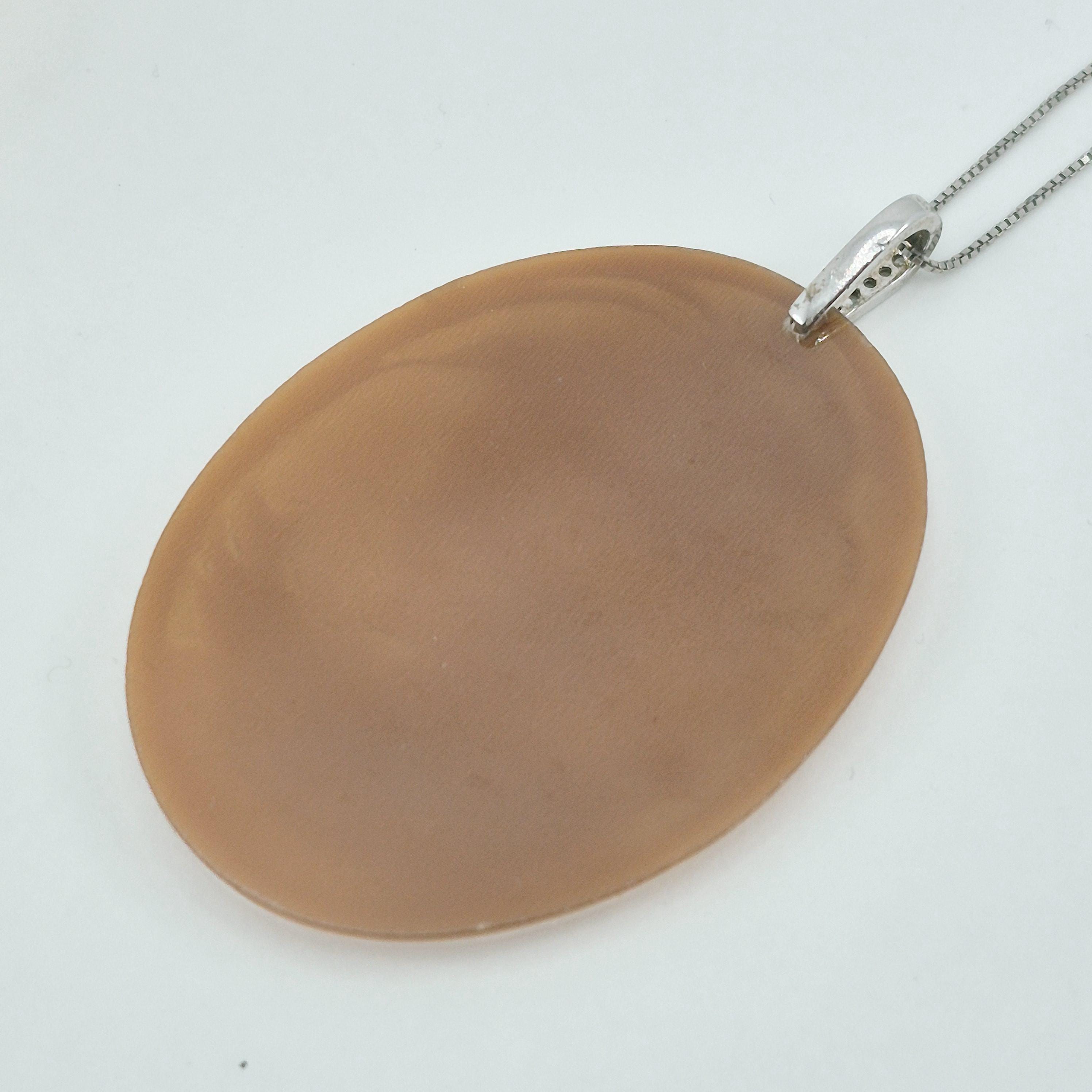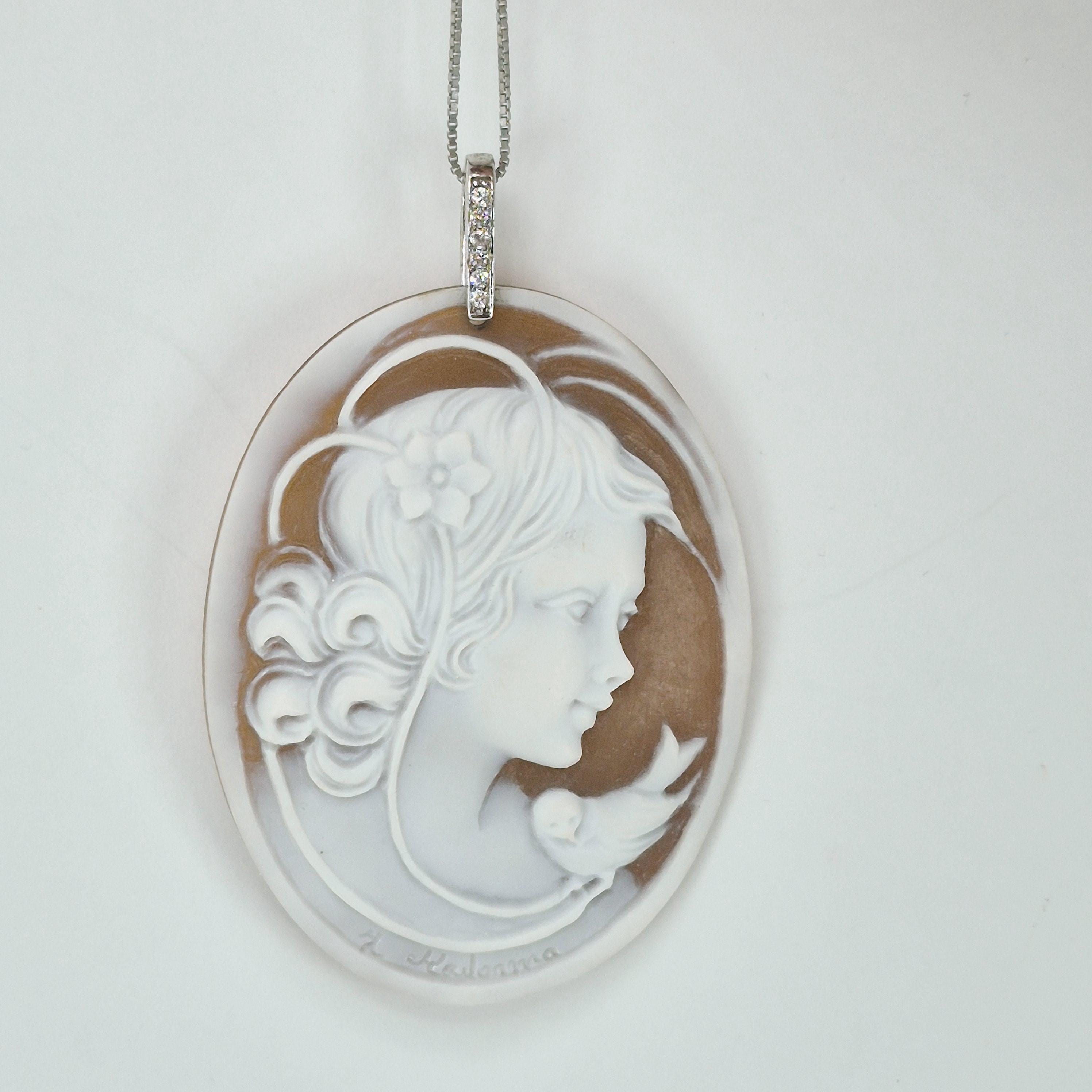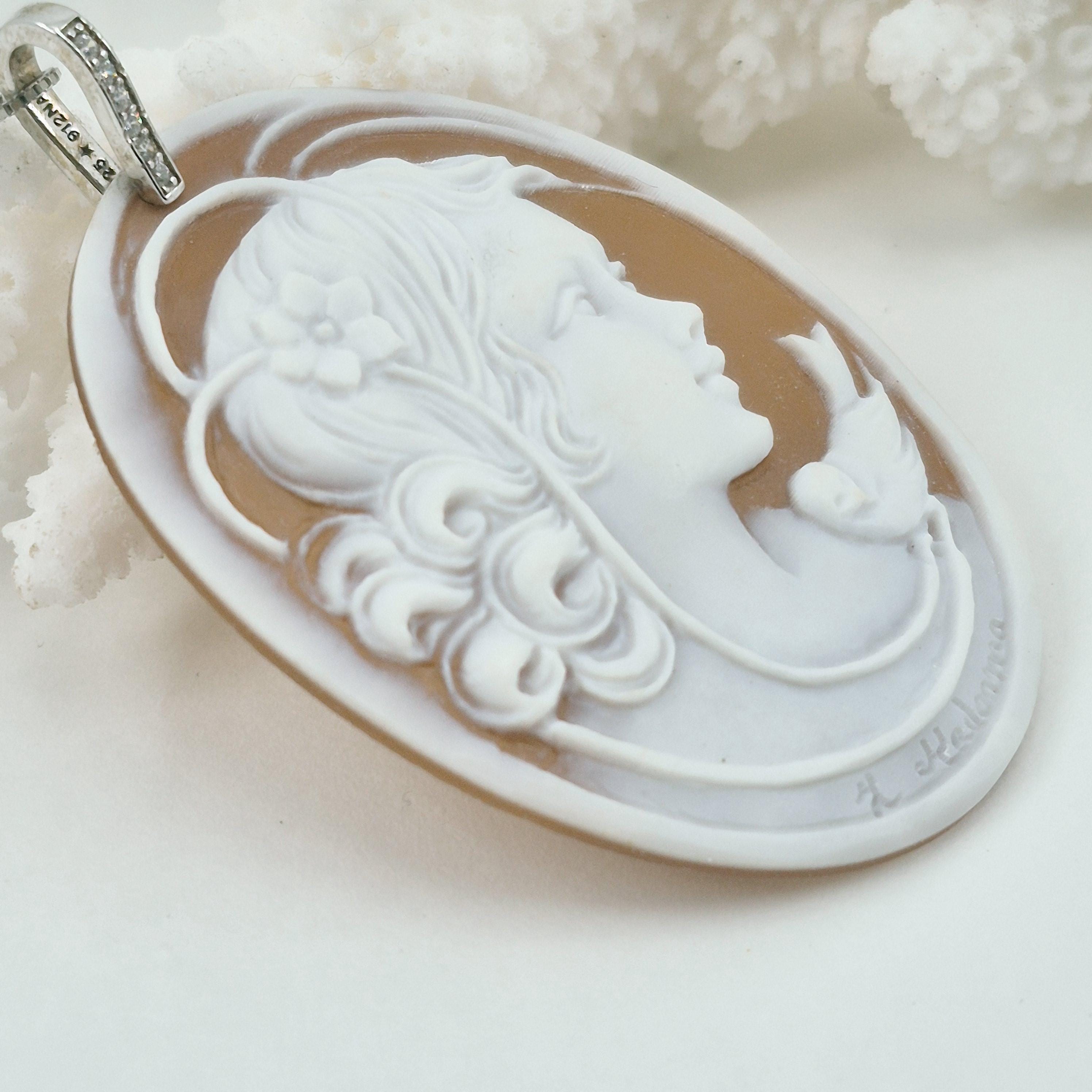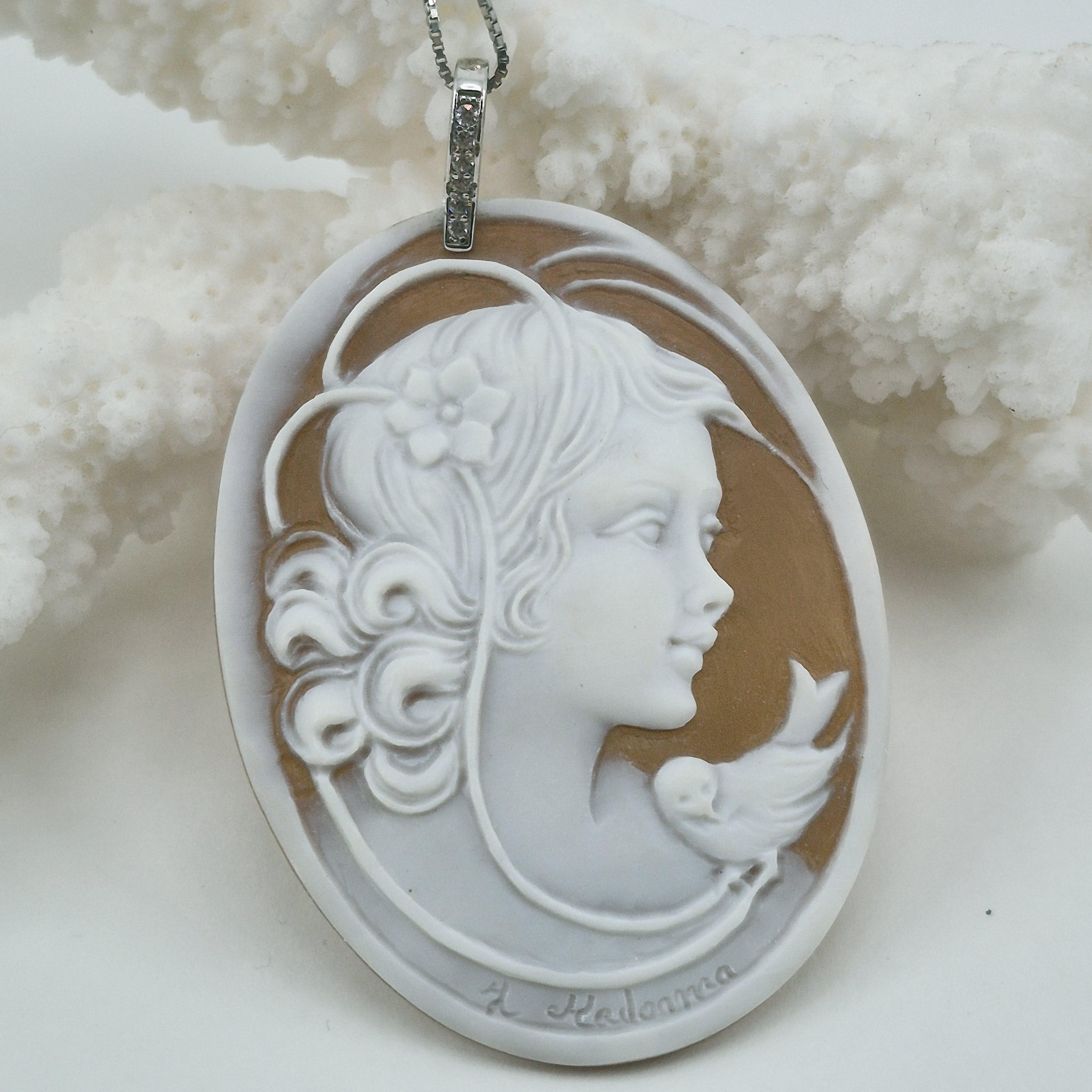 Enchanting engraving on sardonyx shell made in the mid-1900s by a skilled engraver from Torre del Greco F. Madonna in a unique creation being handcrafted and not the usual profile but a beautiful almost three-dimensional woman's face with gathered hair and a dove on her shoulder that creates a feeling of peace and well-being just by looking at it.