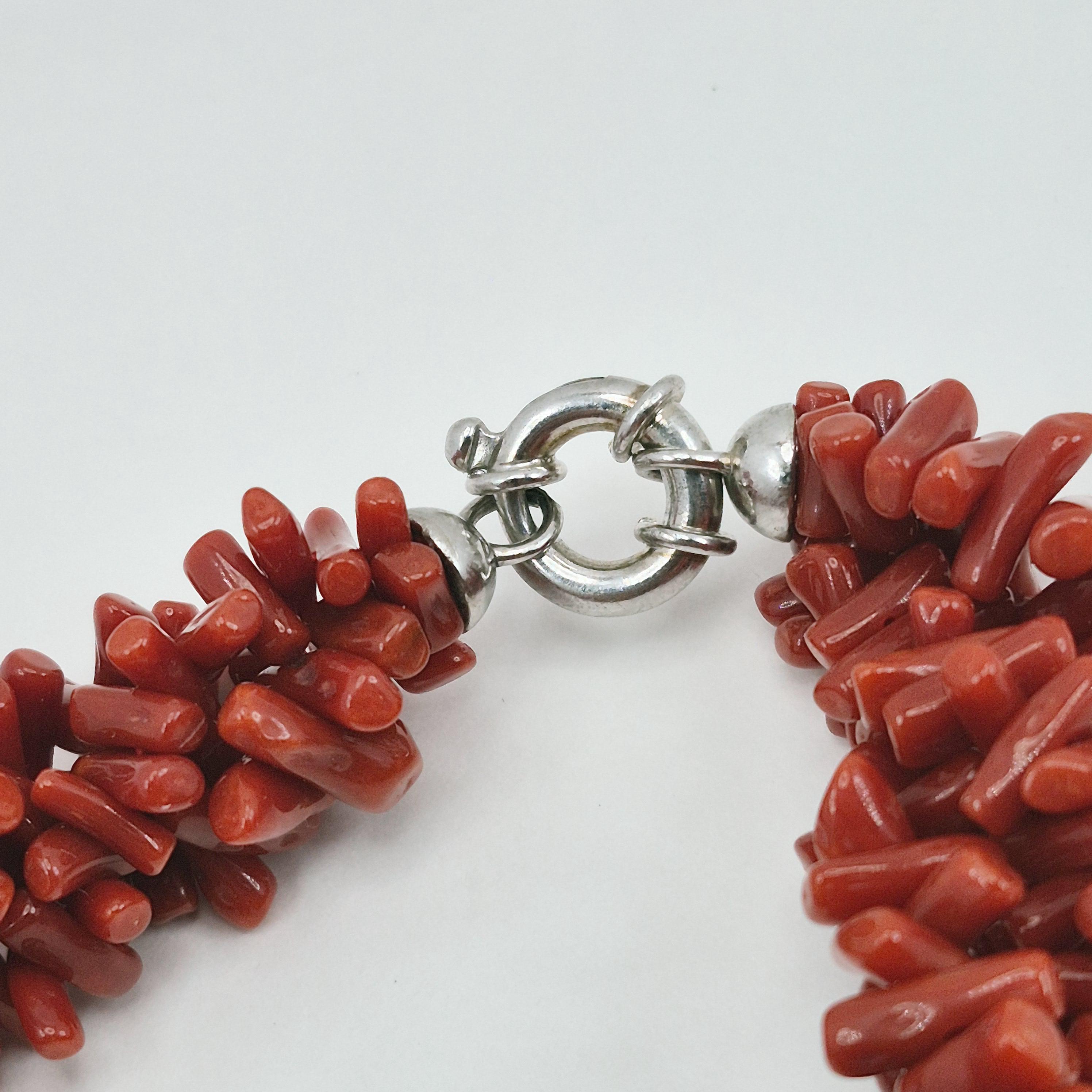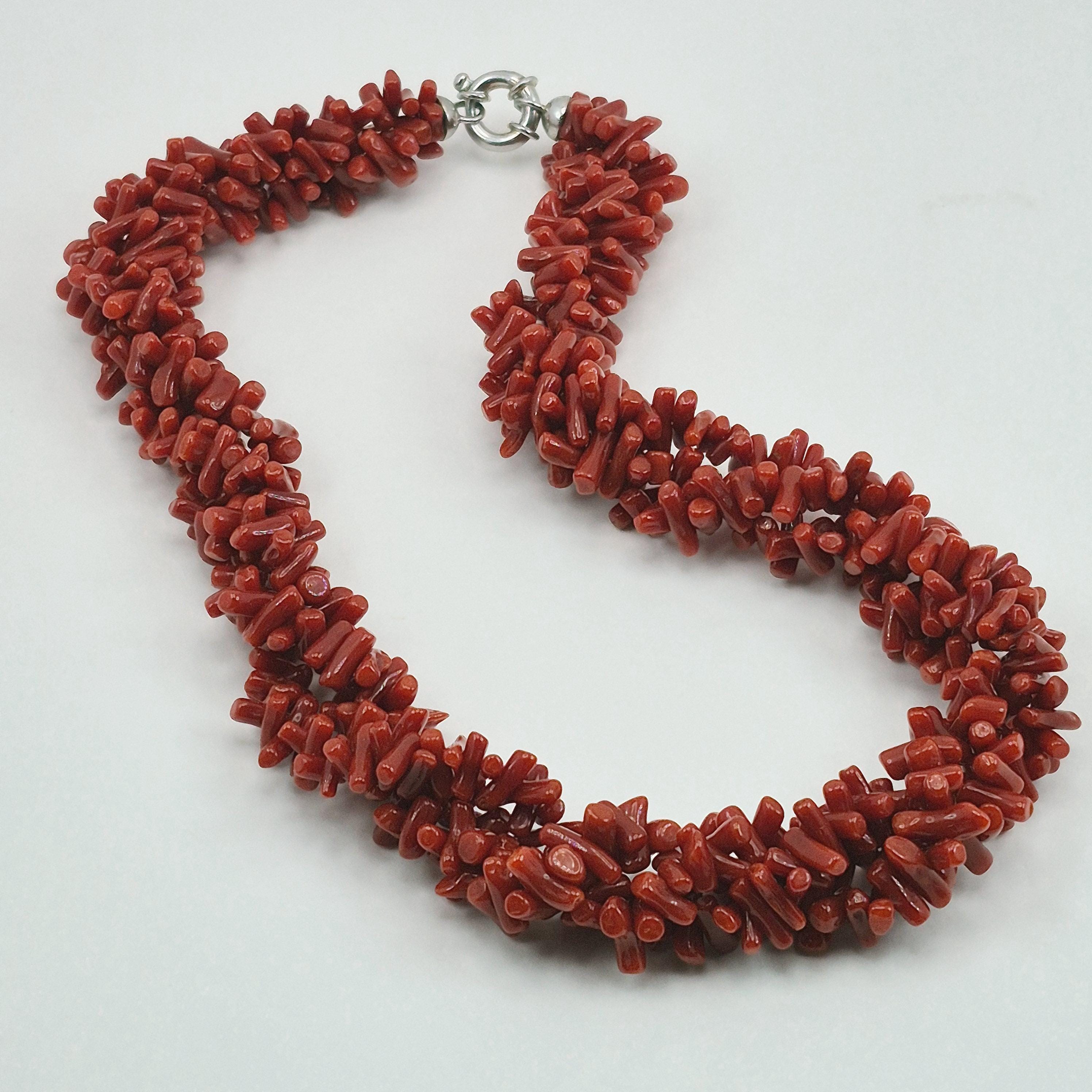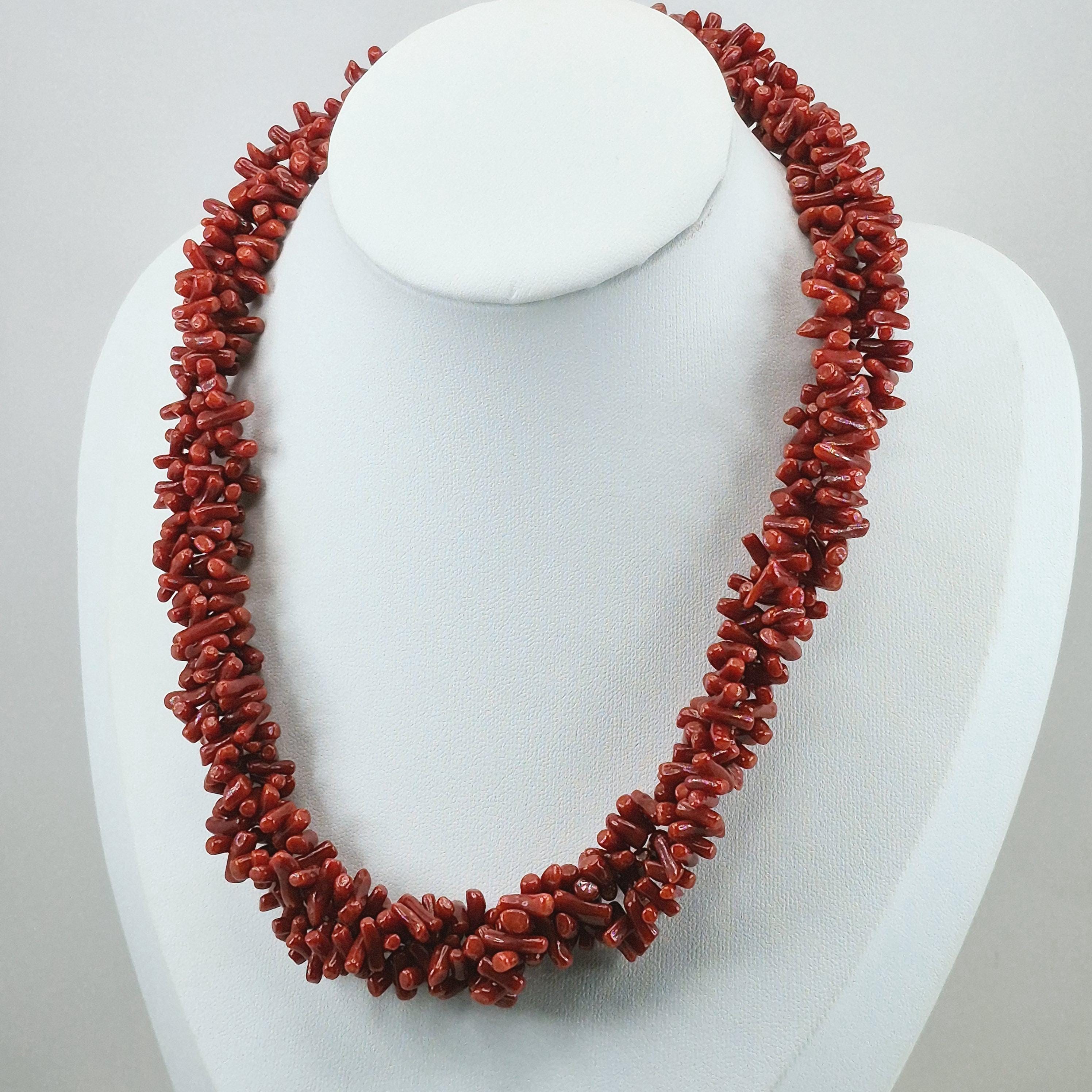 An enchanting and imposing three-strand torcion necklace in blood coral from the seas of Corsica where the coral is characterised by a darker red colour.
