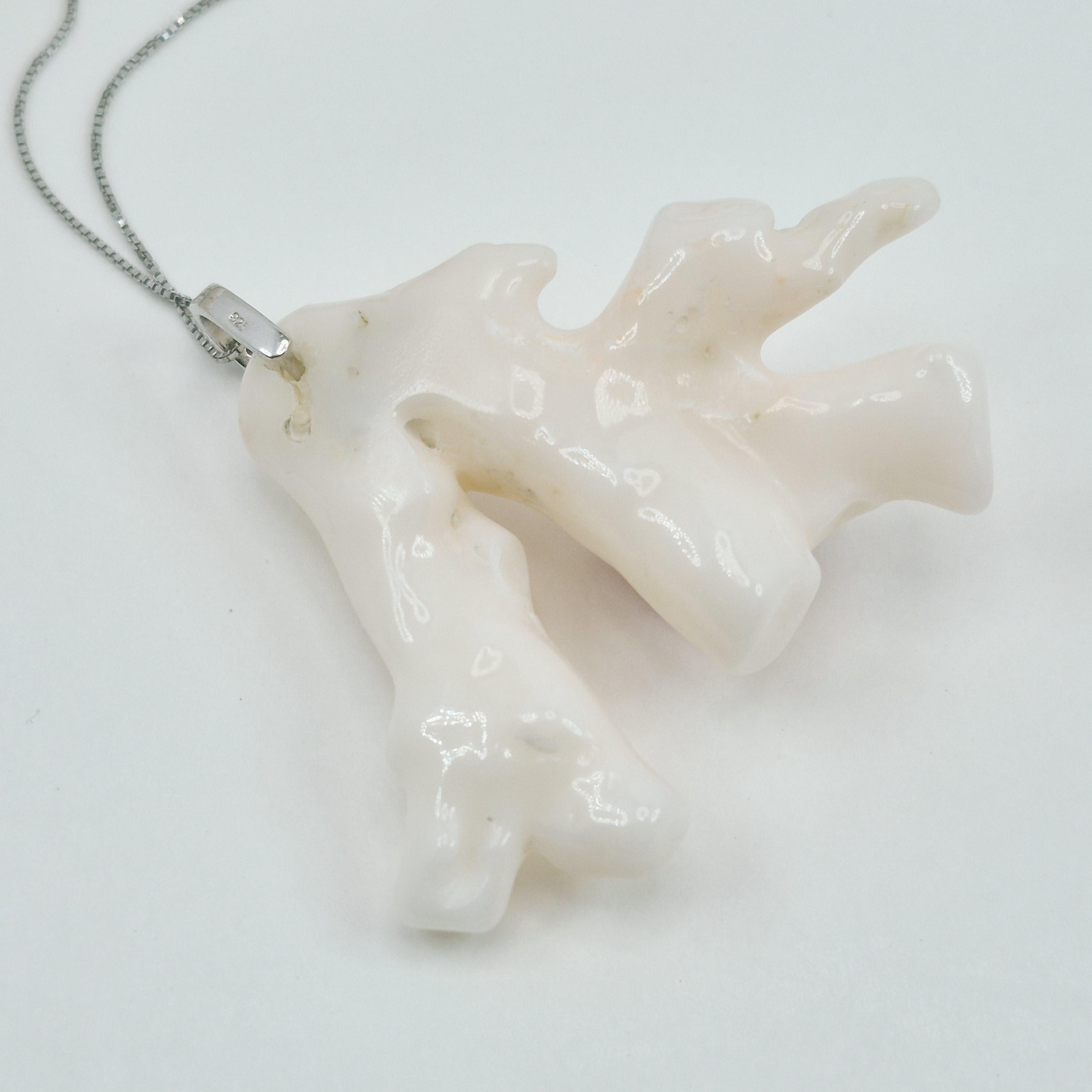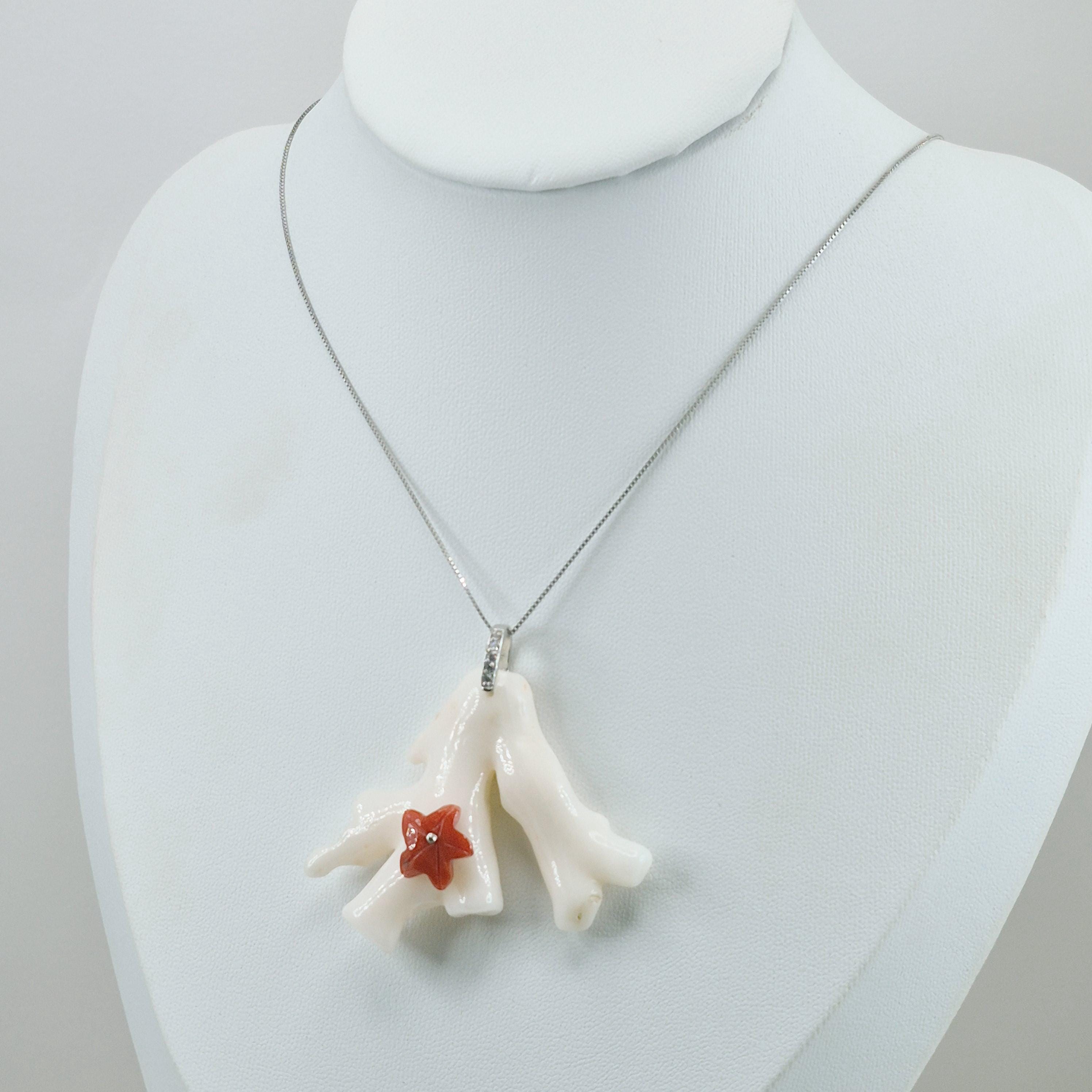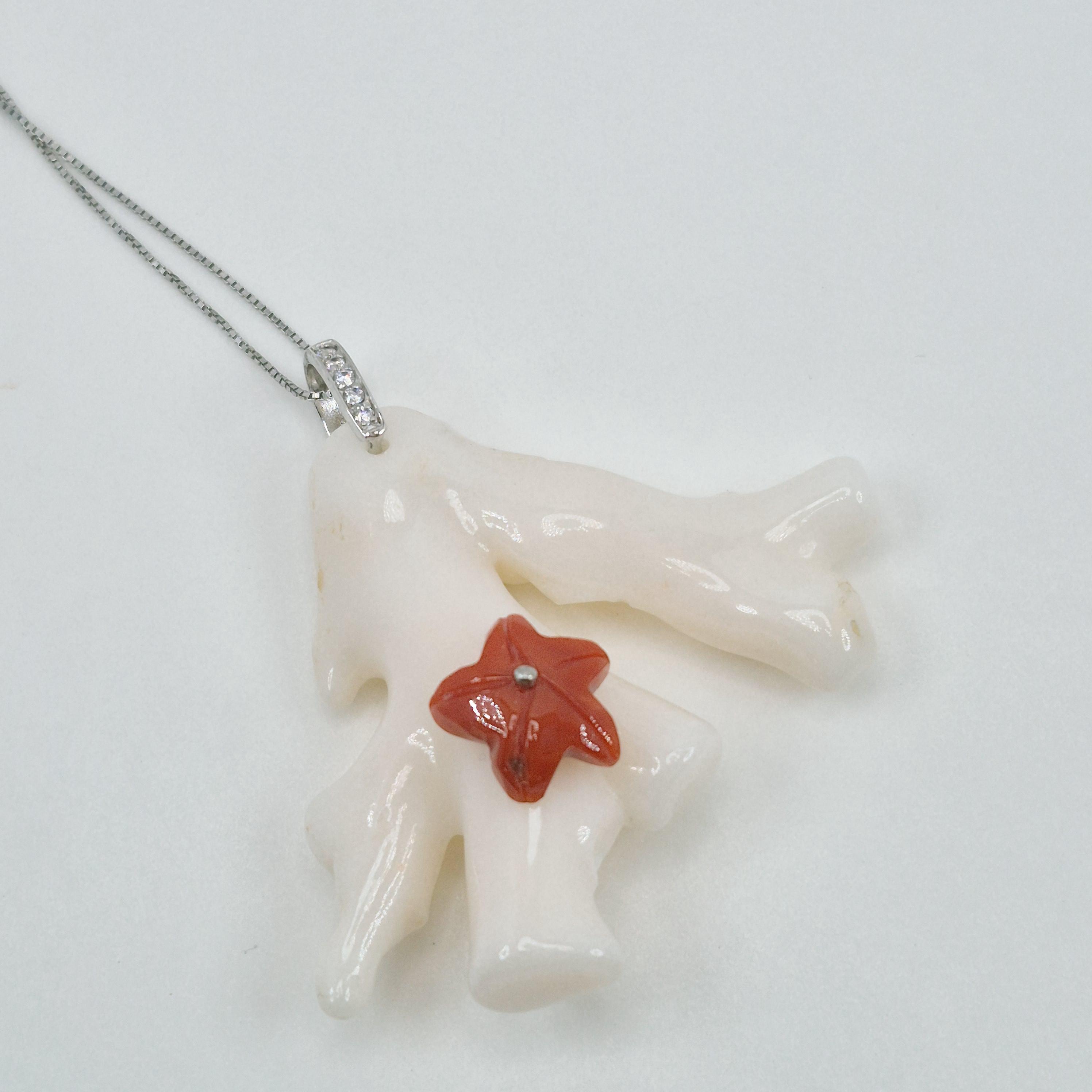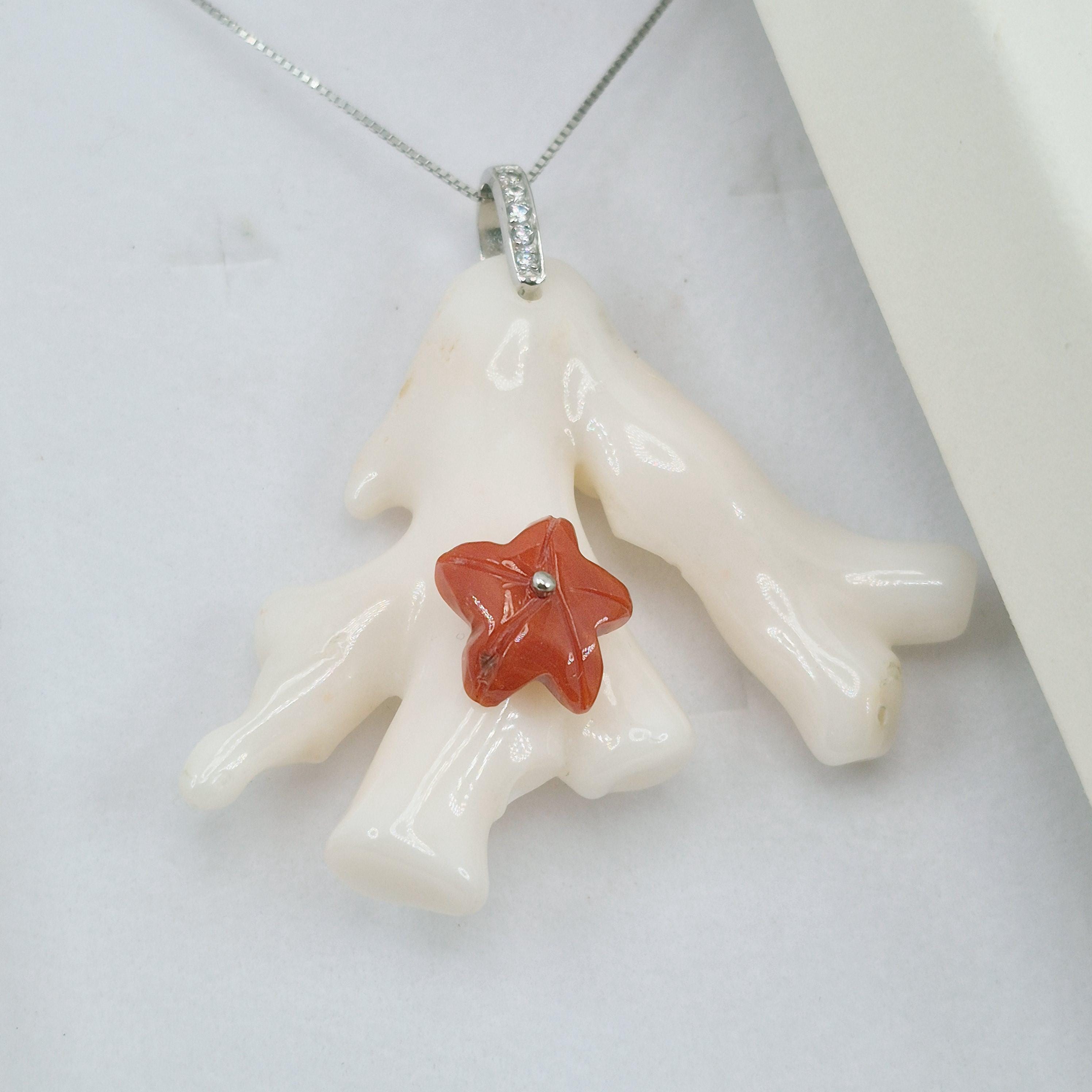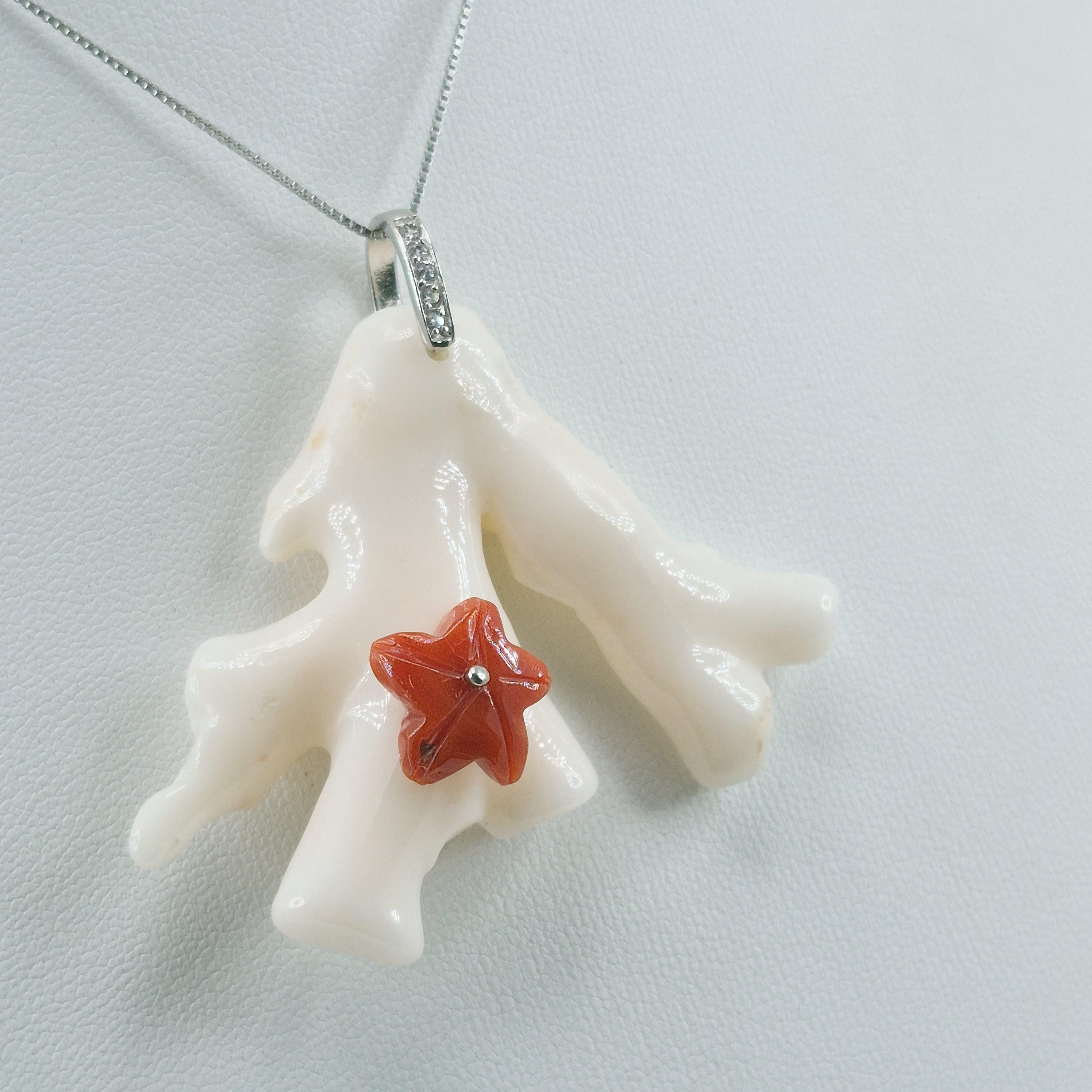 Stunning white coral branch from the seas of Asia and handcrafted leaving its natural shape with a hand-engraved Mediterranean coral starfish.