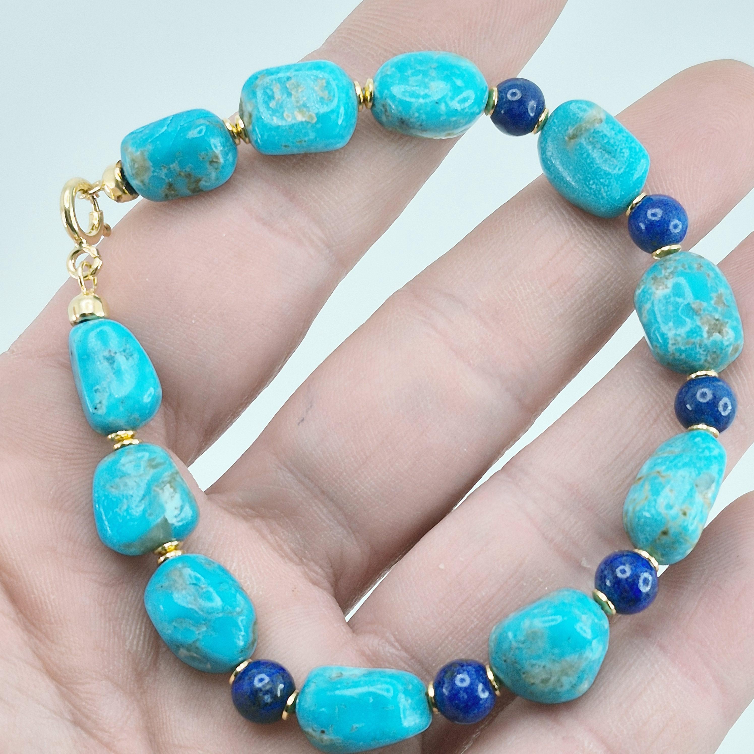 Set in gold-plated 925 silver. Turquoise stone width 7.50 mm-9.50 mm. Lapis lazuli spheres 6 mm.