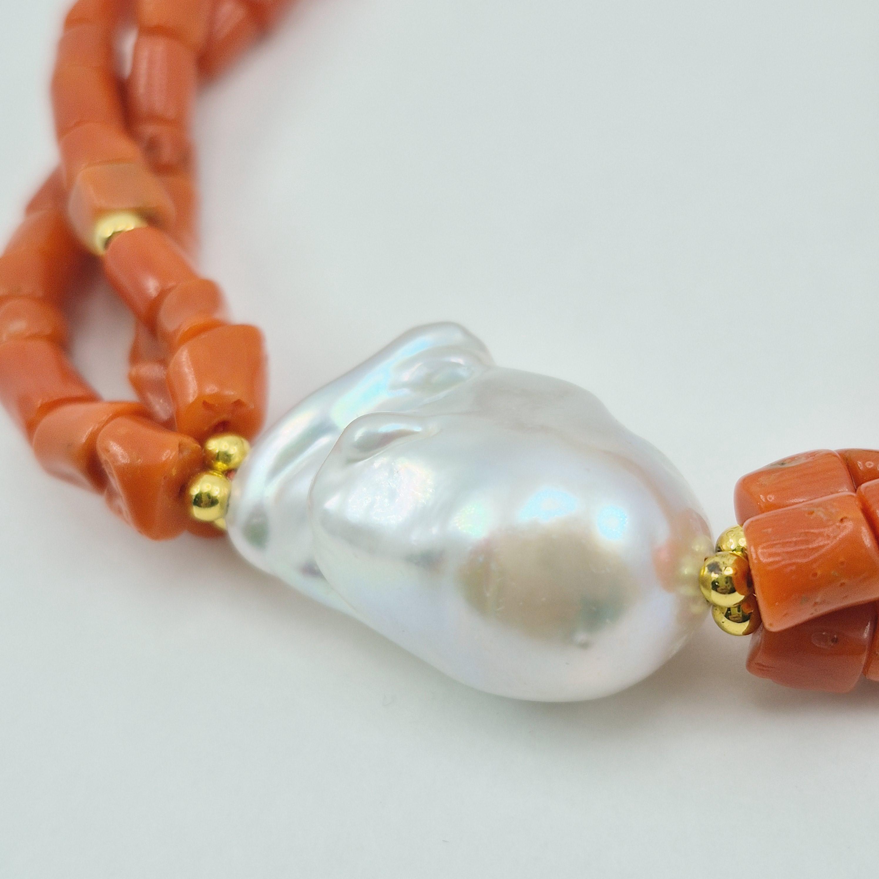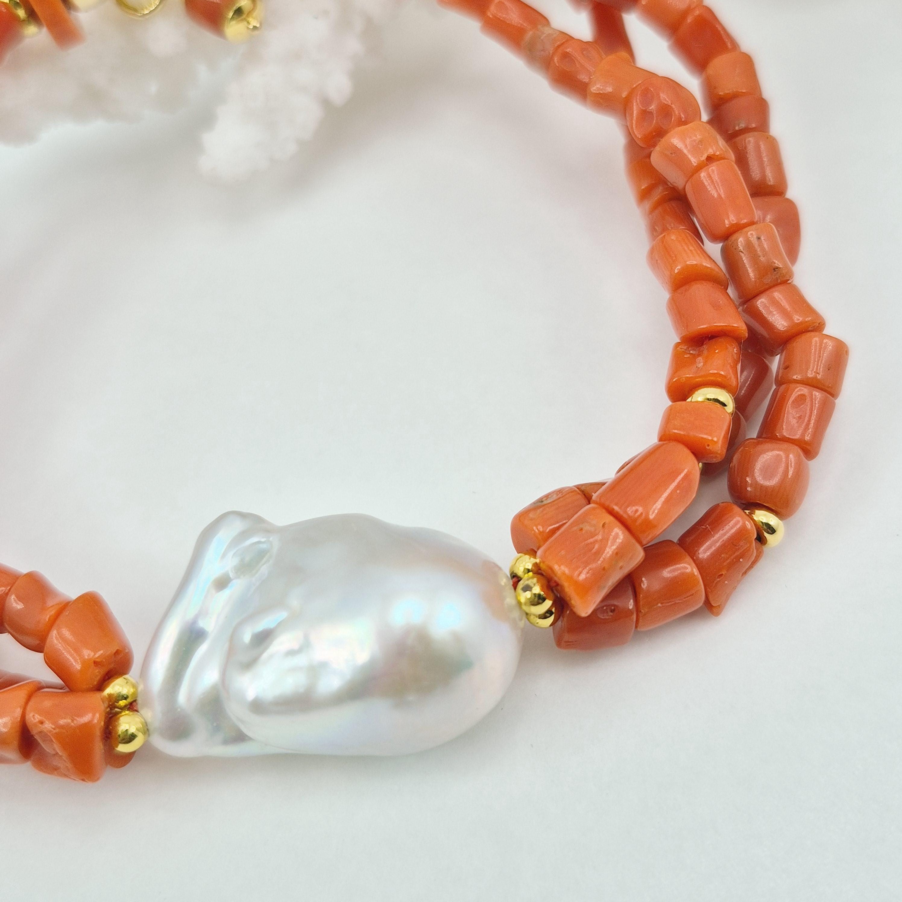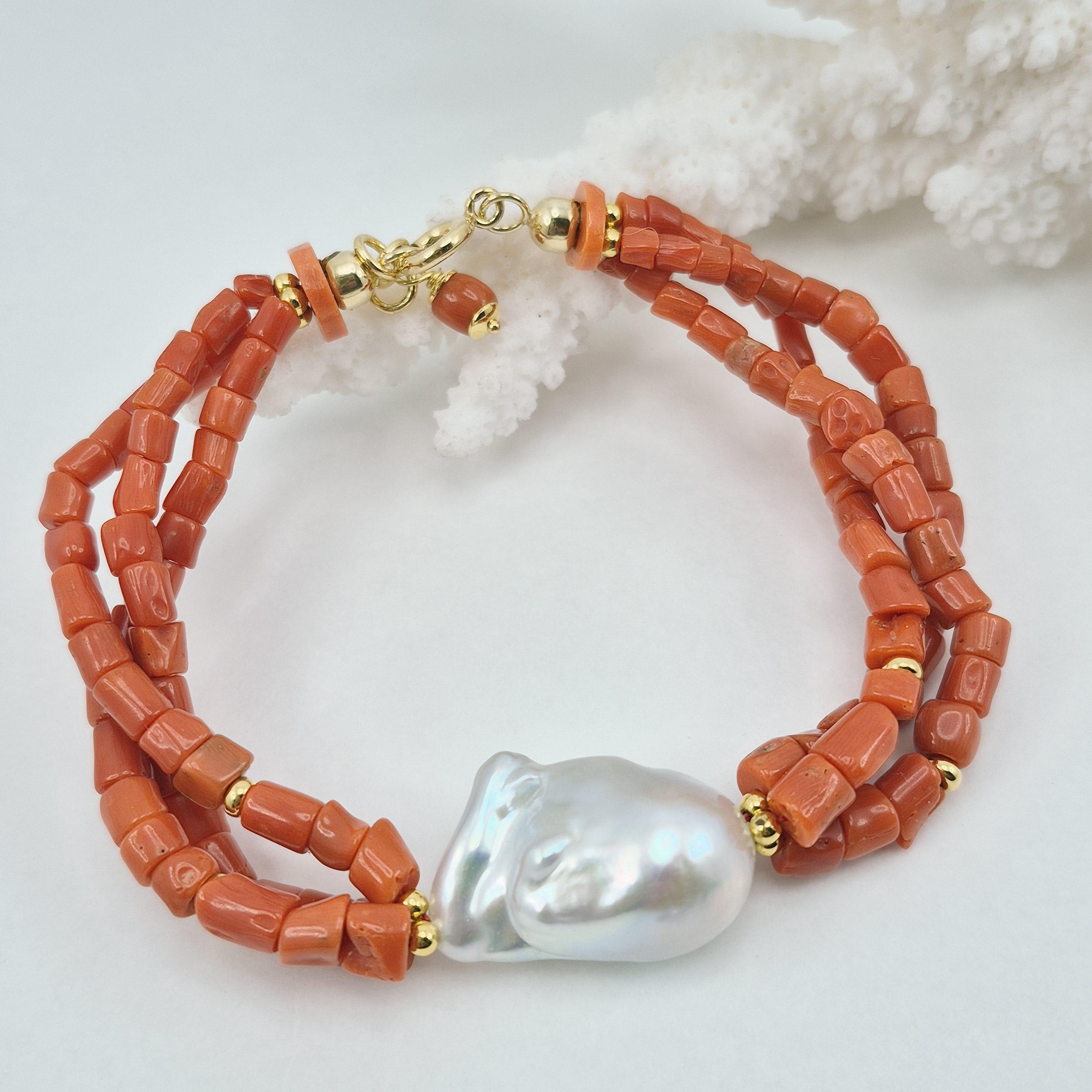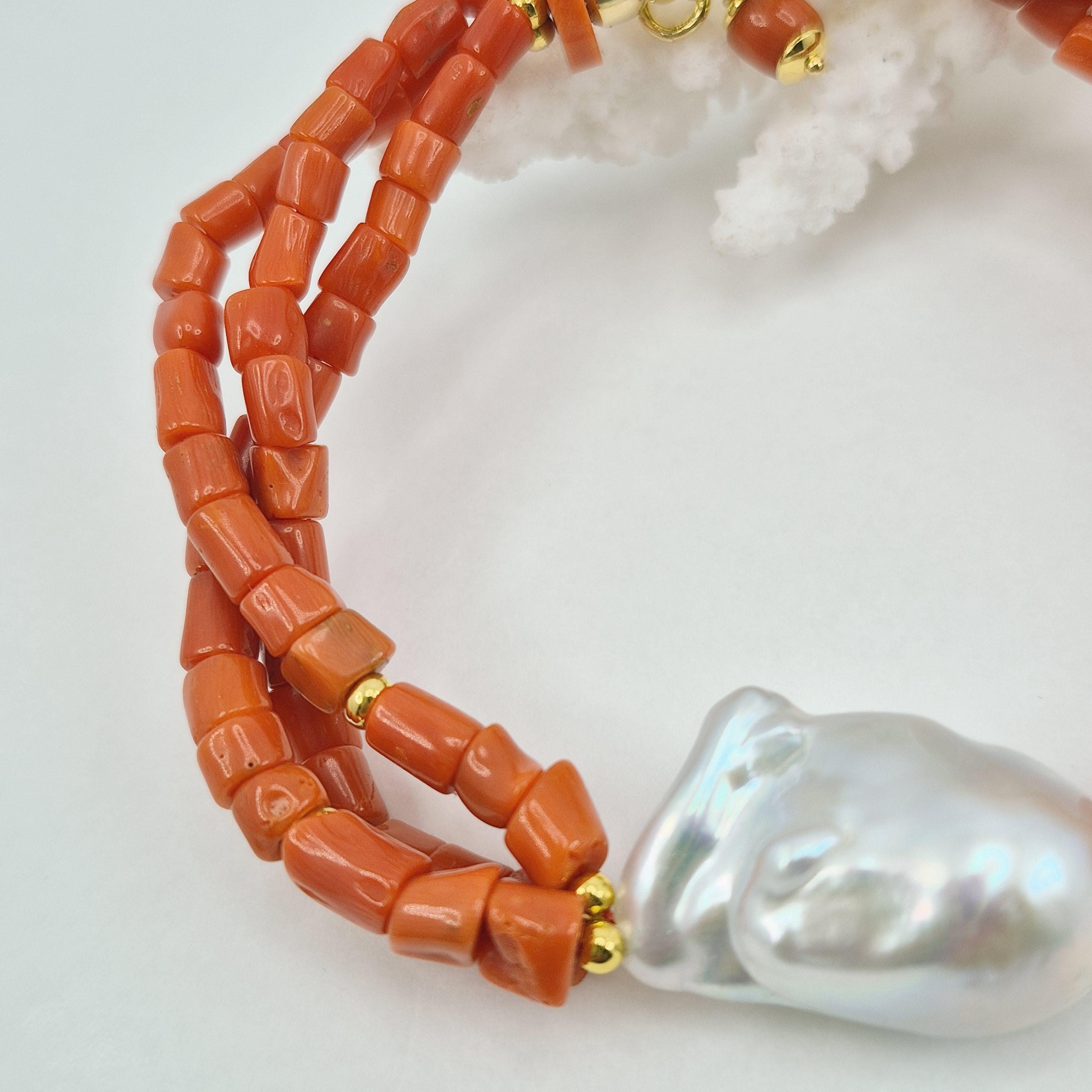 Beautiful Mediterranean coral bracelet illuminated by a freshwater baroque pearl from Asia