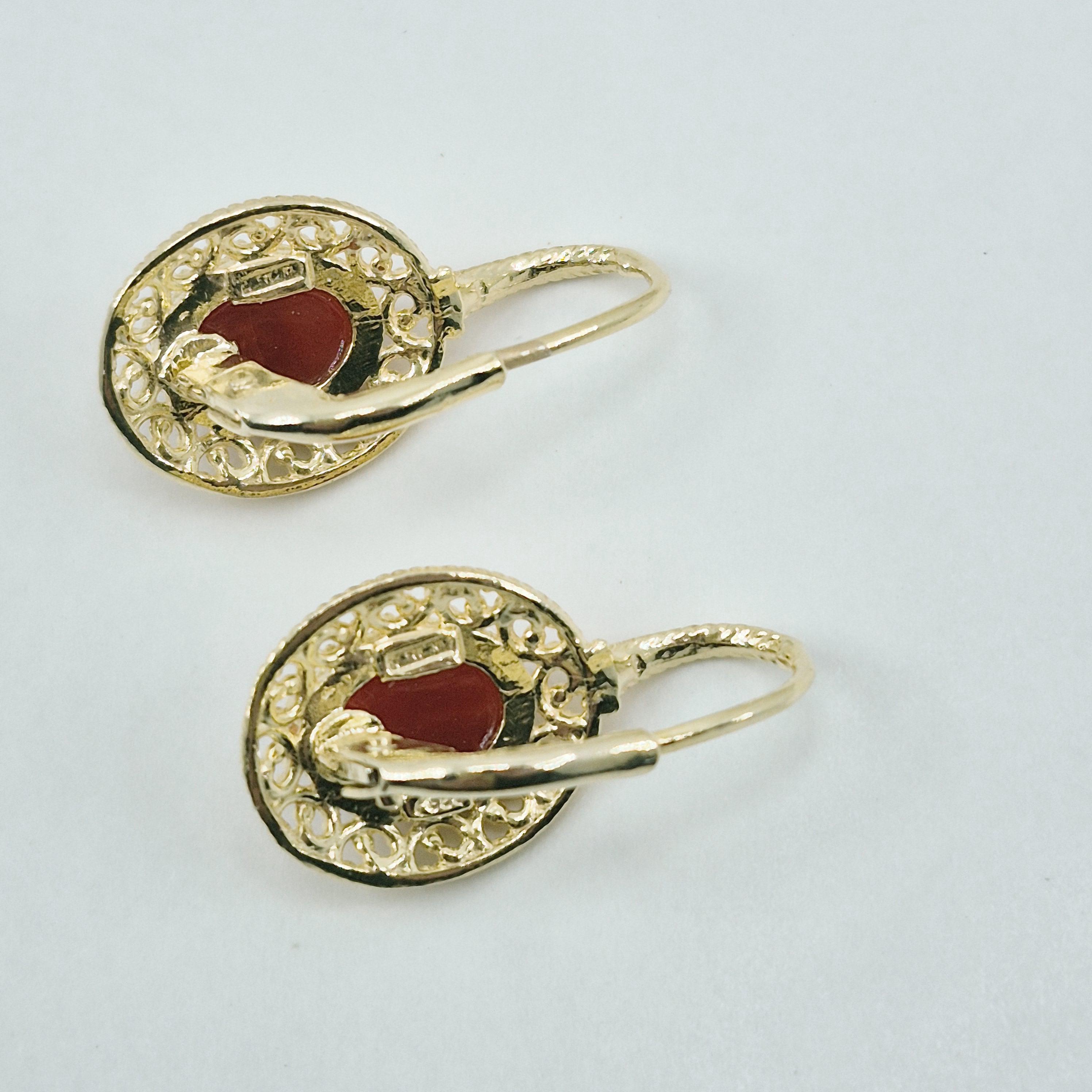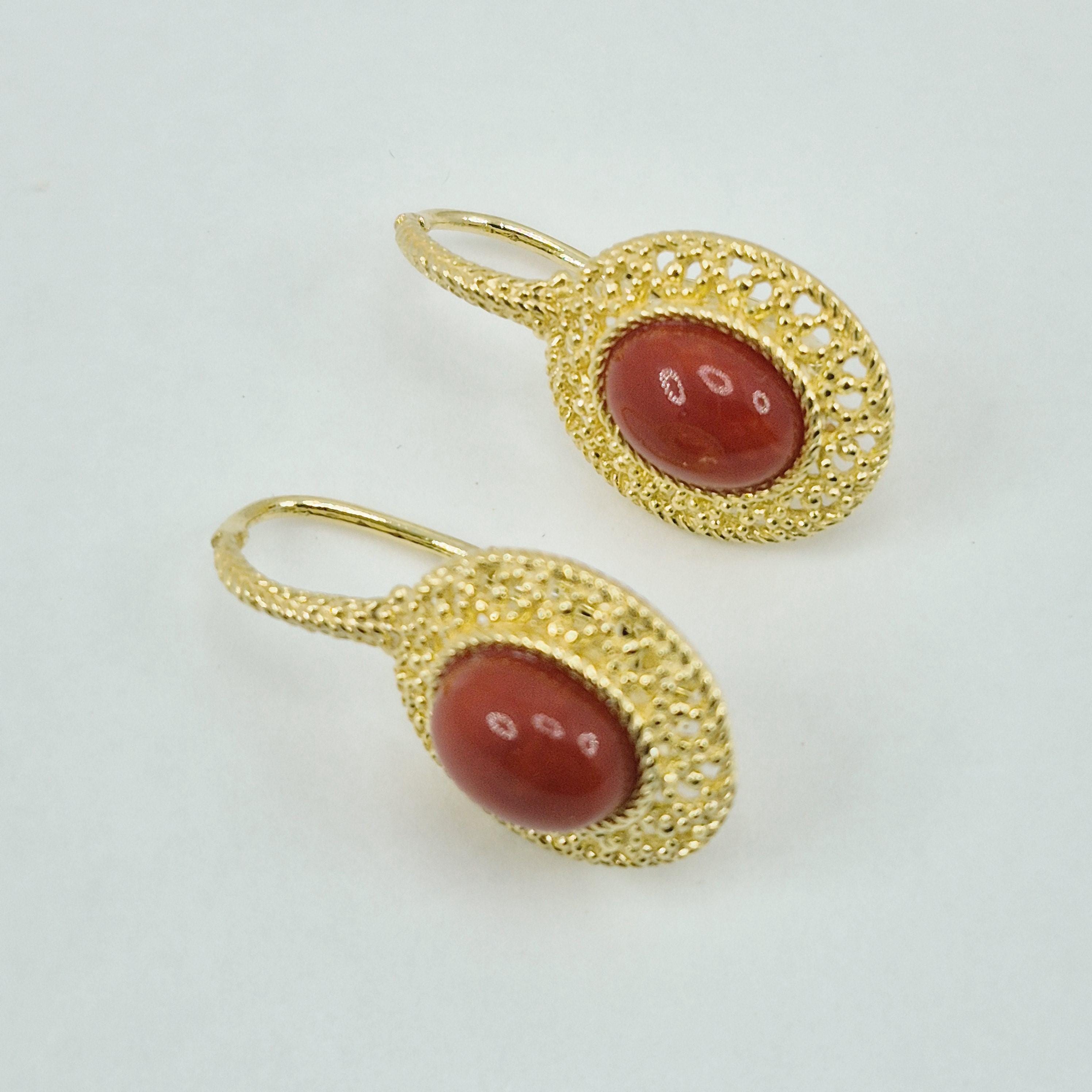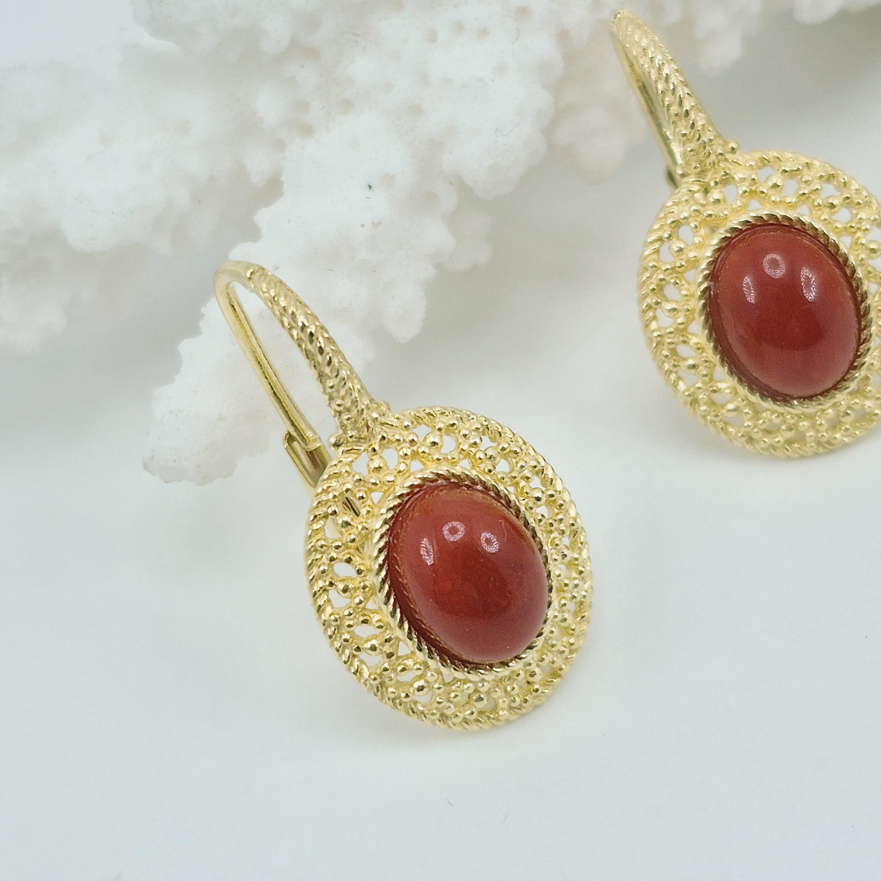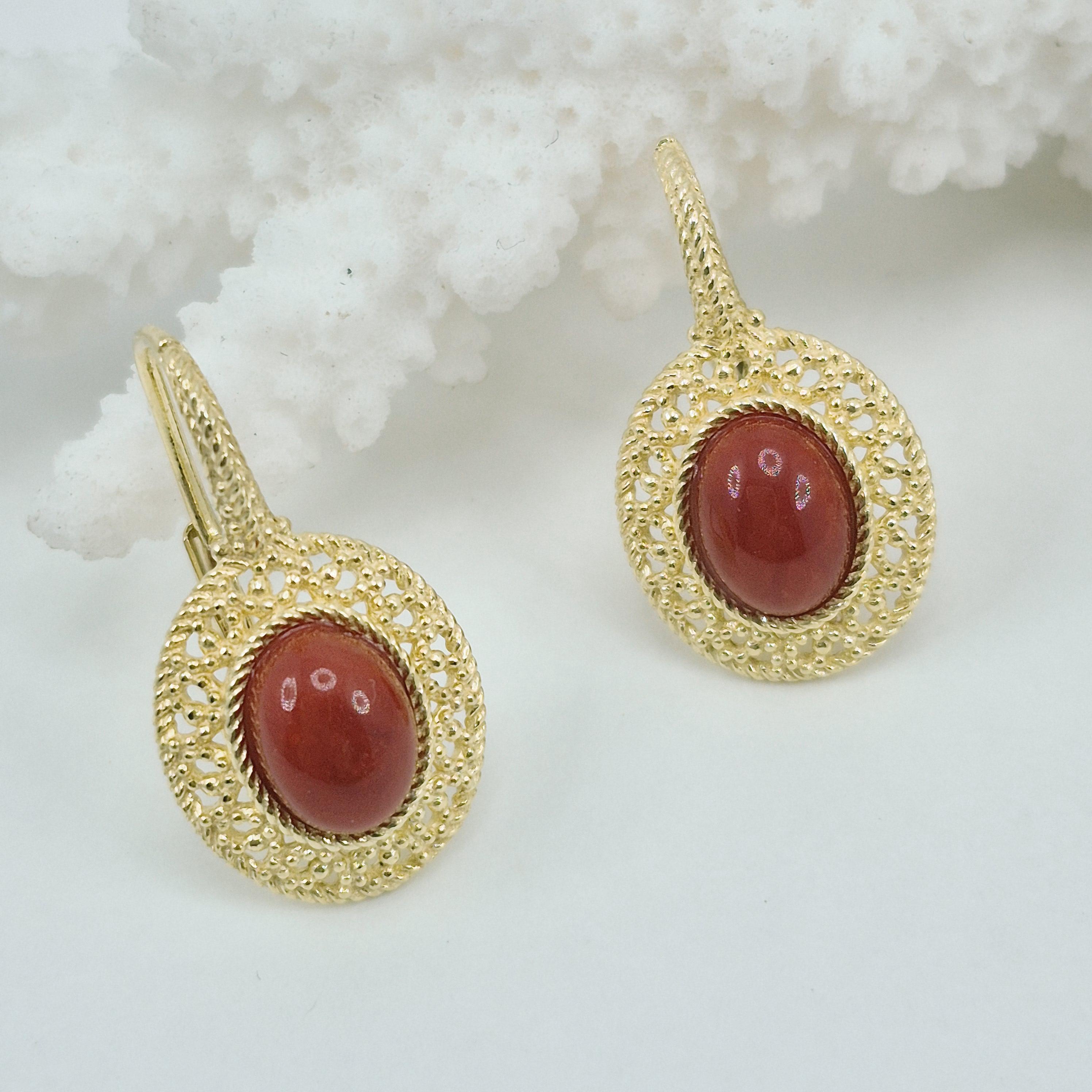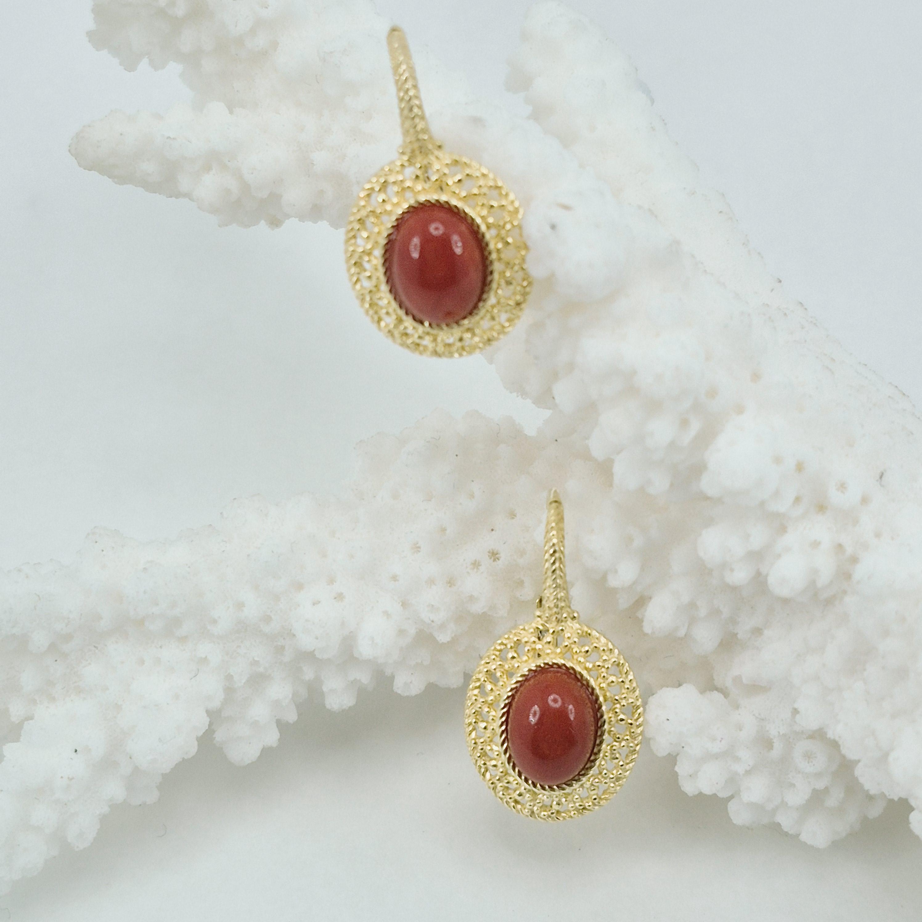 Beautiful, entirely handcrafted earrings with blood coral cabochons from the seas of Corsica, where the red coral has a very dark and elegant tone, and worked with the filigree technique.
