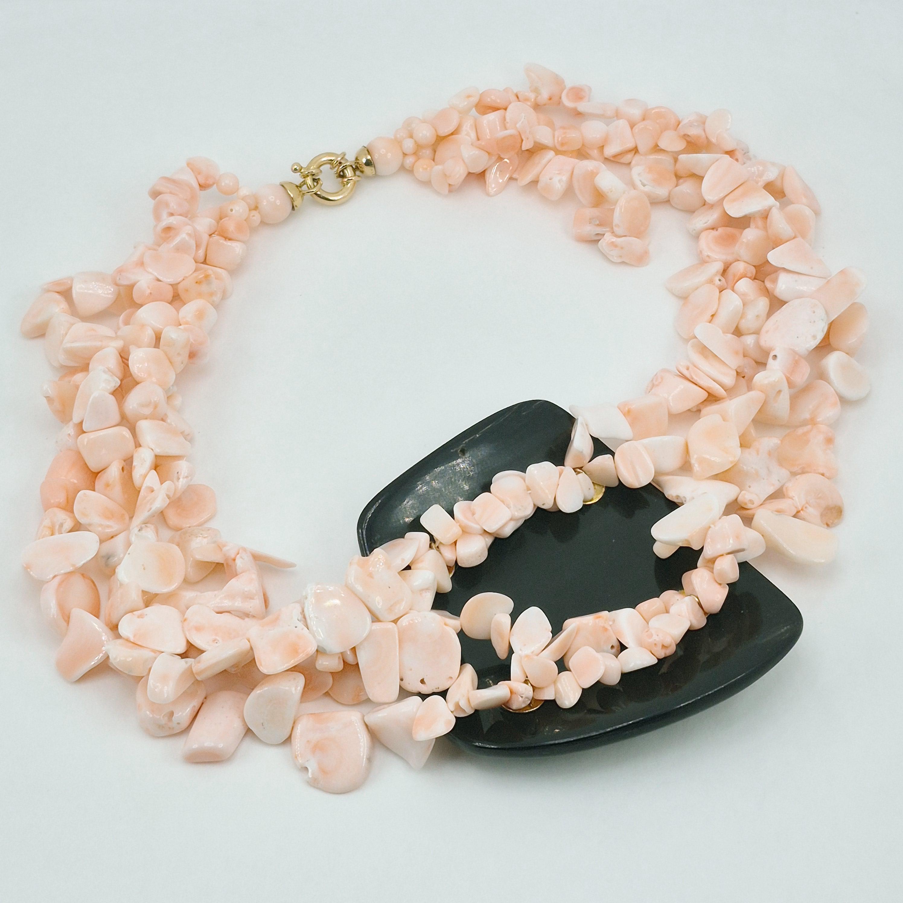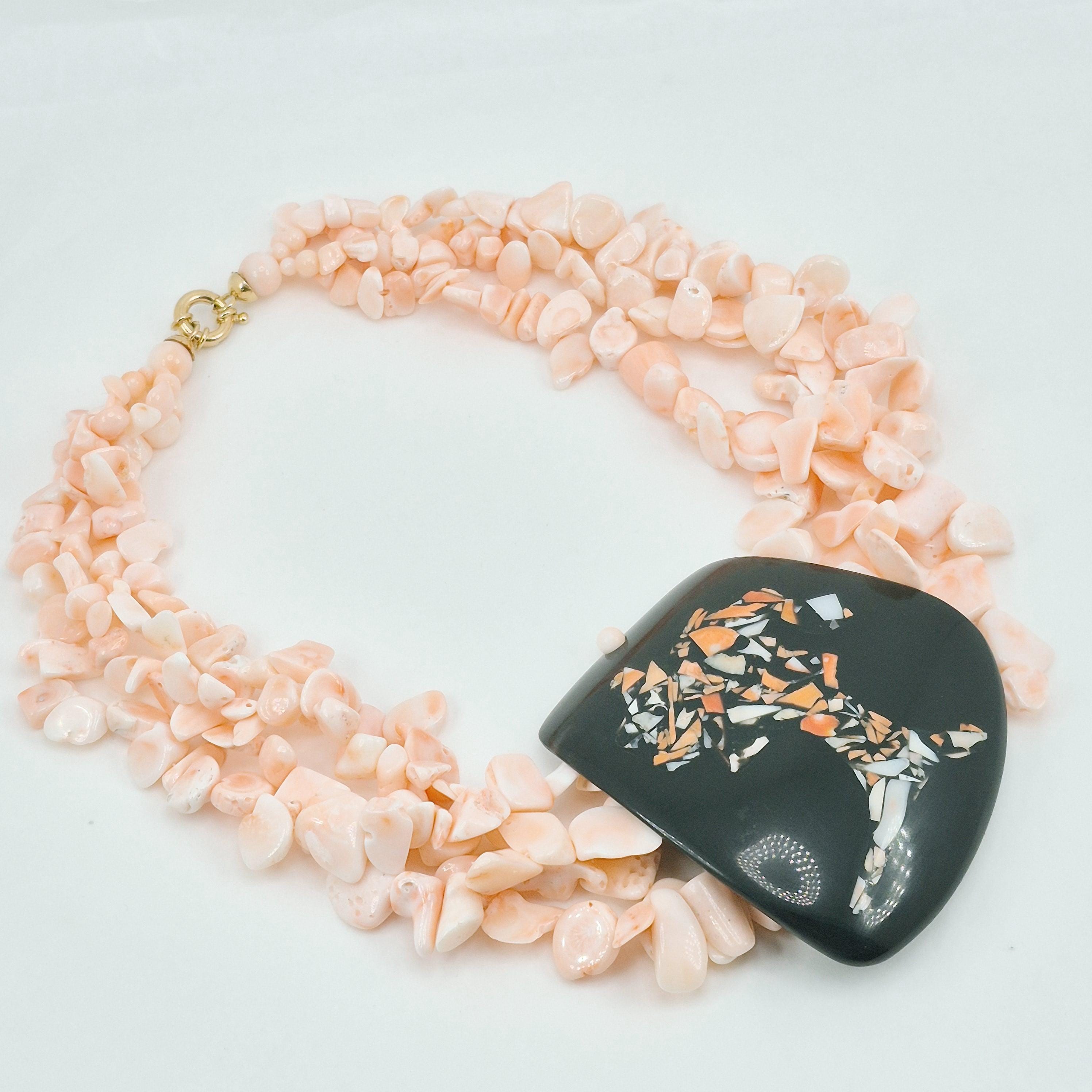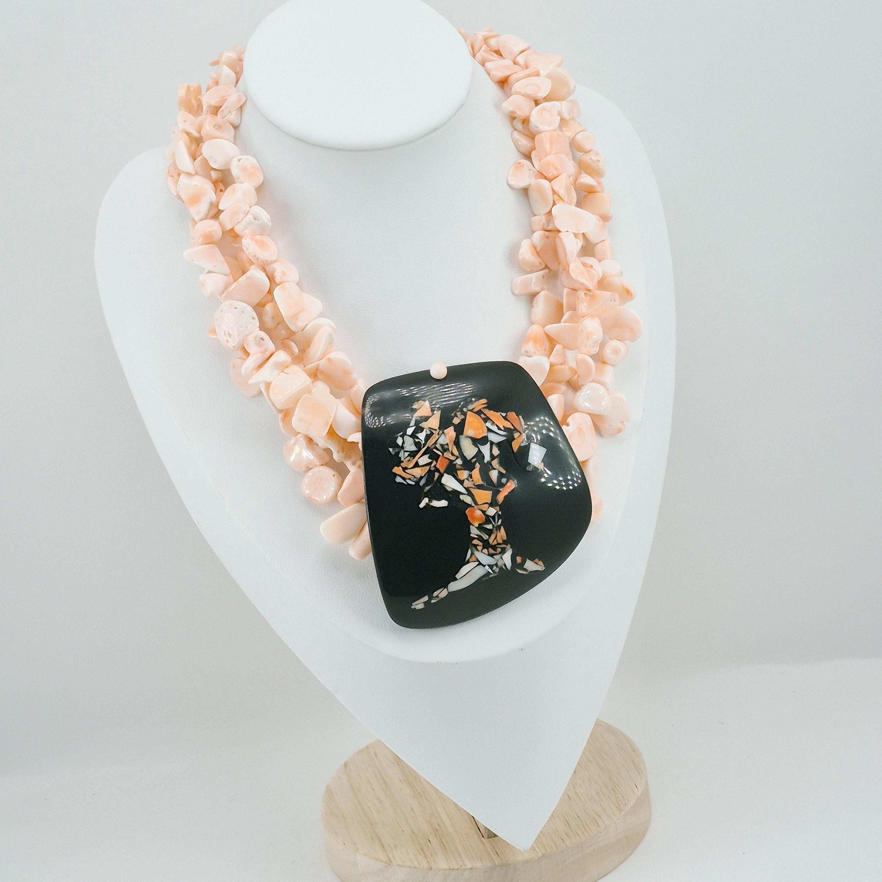Elegant and unique necklace made of pink coral from Asian seas and a bull's horn inlaid with coral.