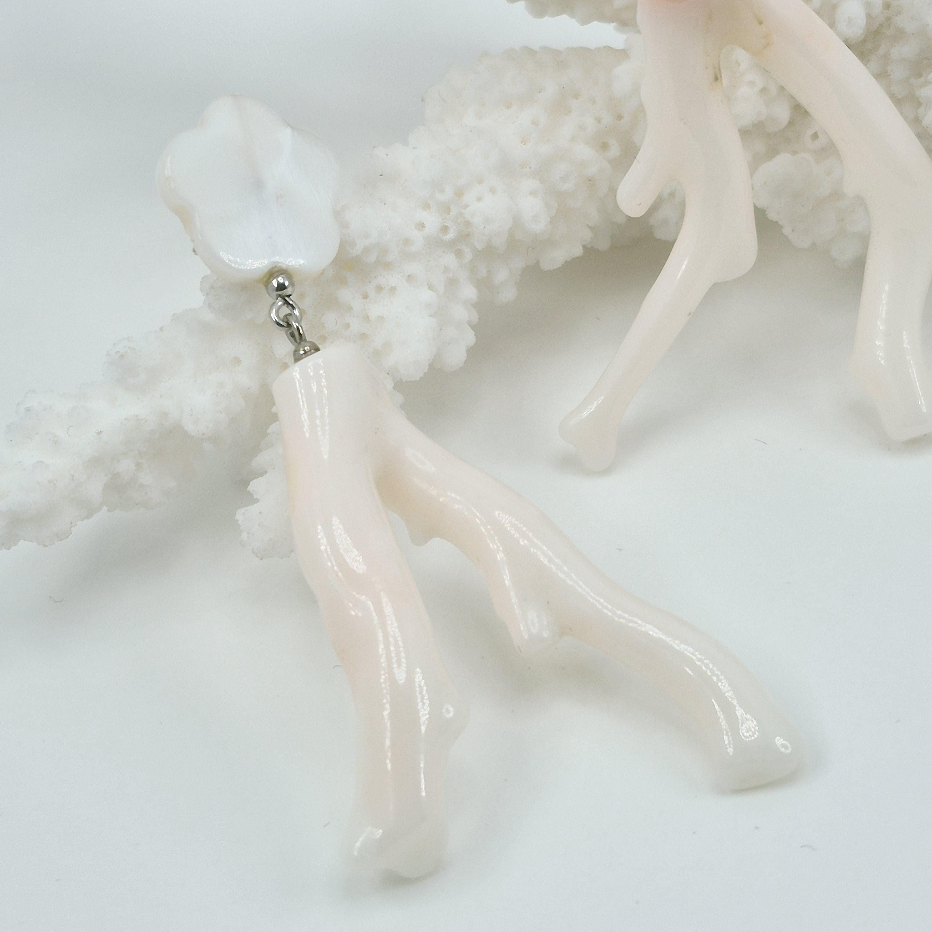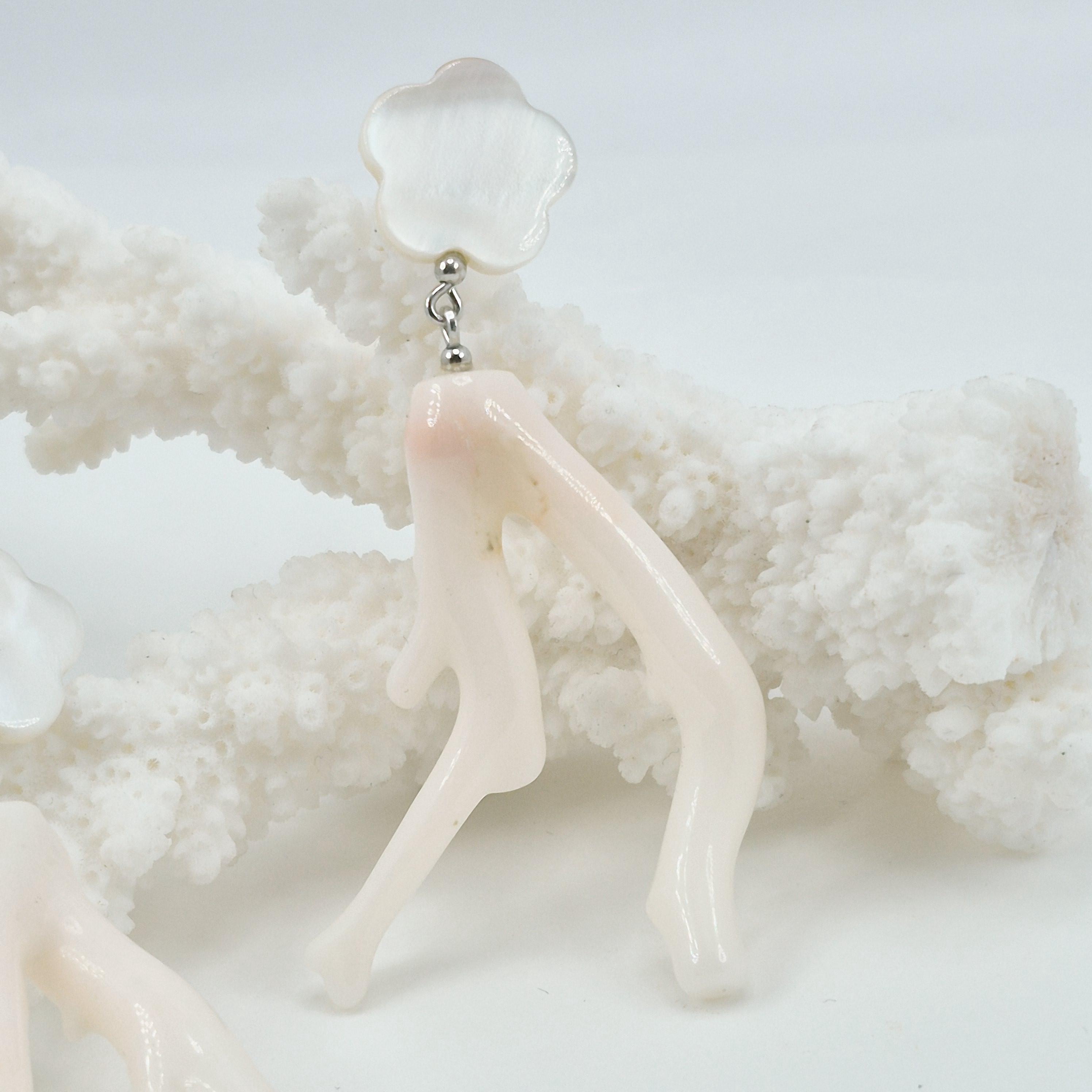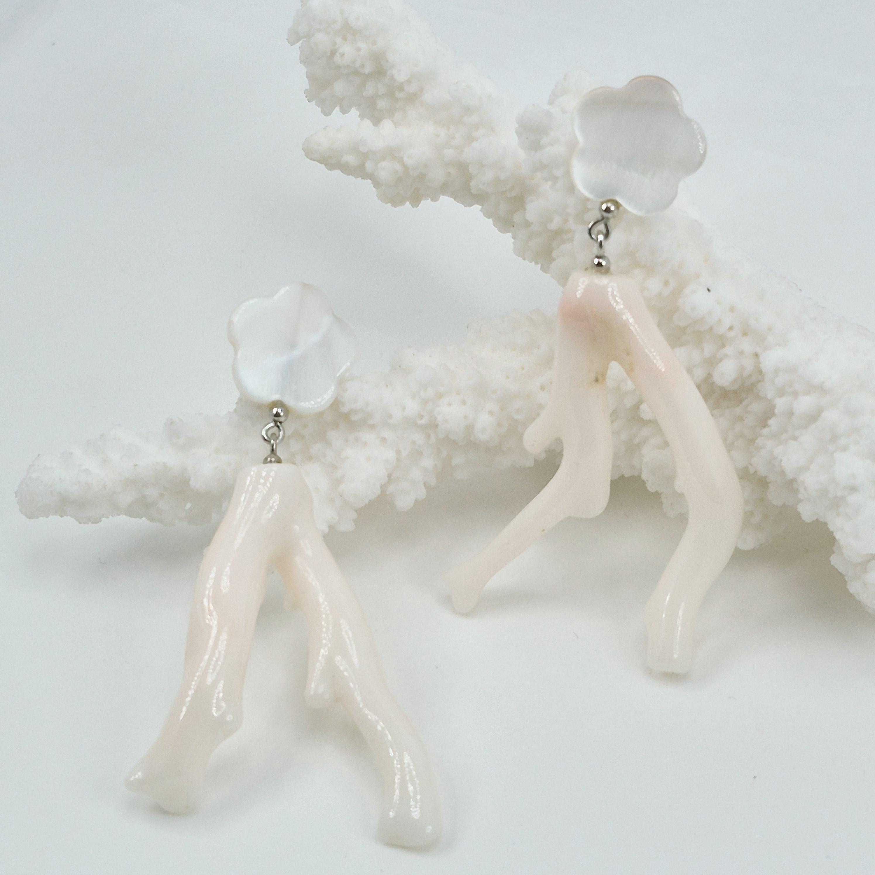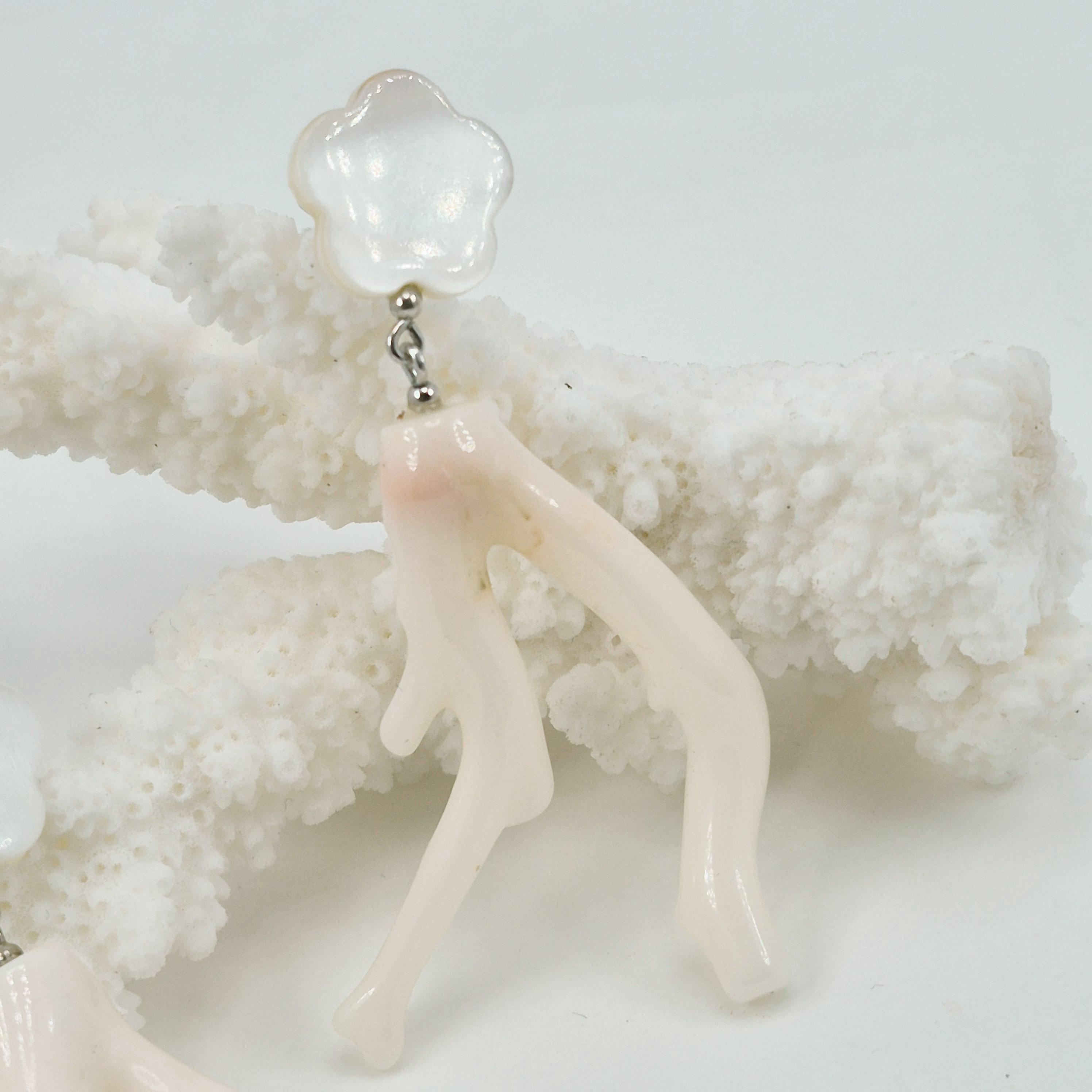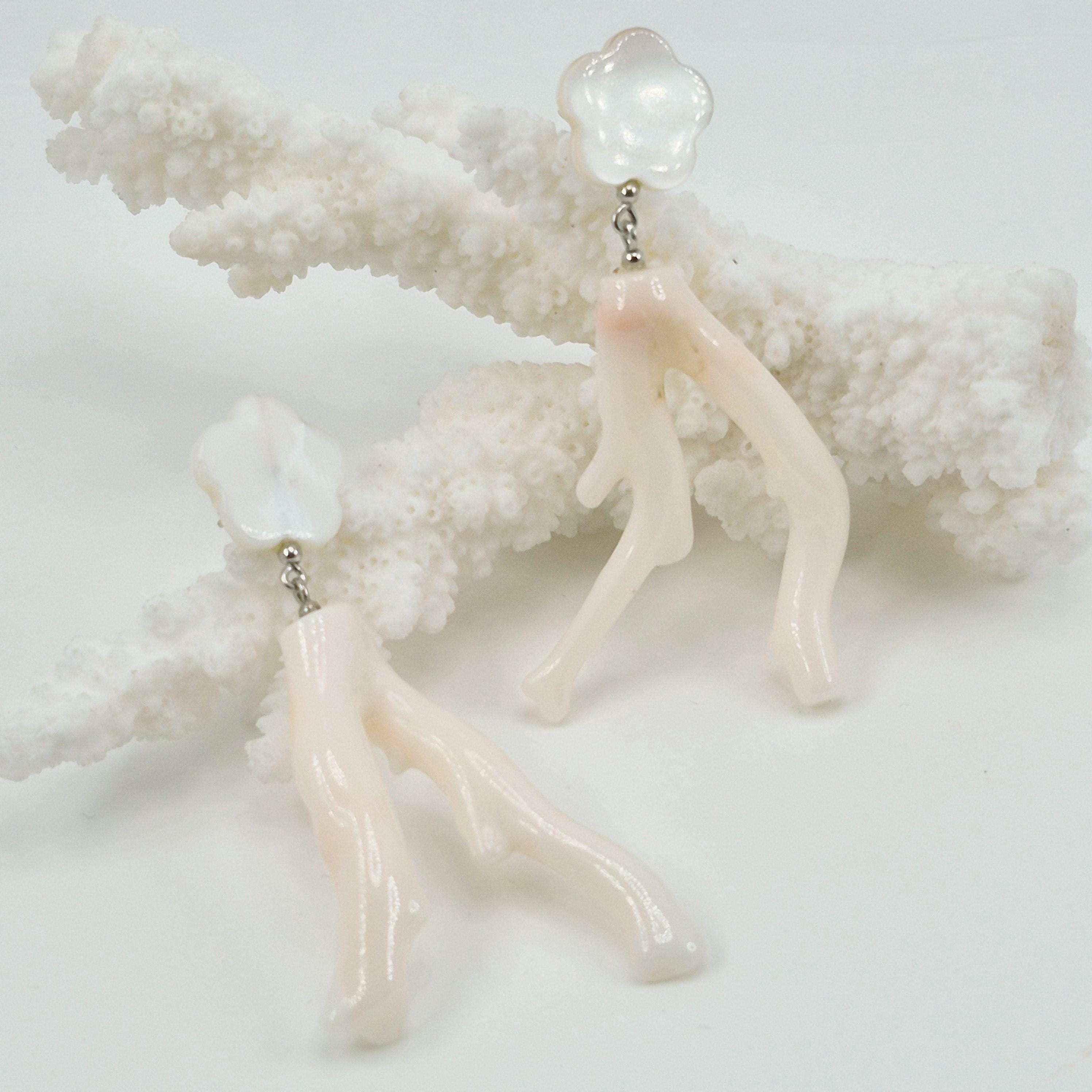 Coral branches left in their natural shape and mother-of-pearl flowers on the lobe that give even more brightness.