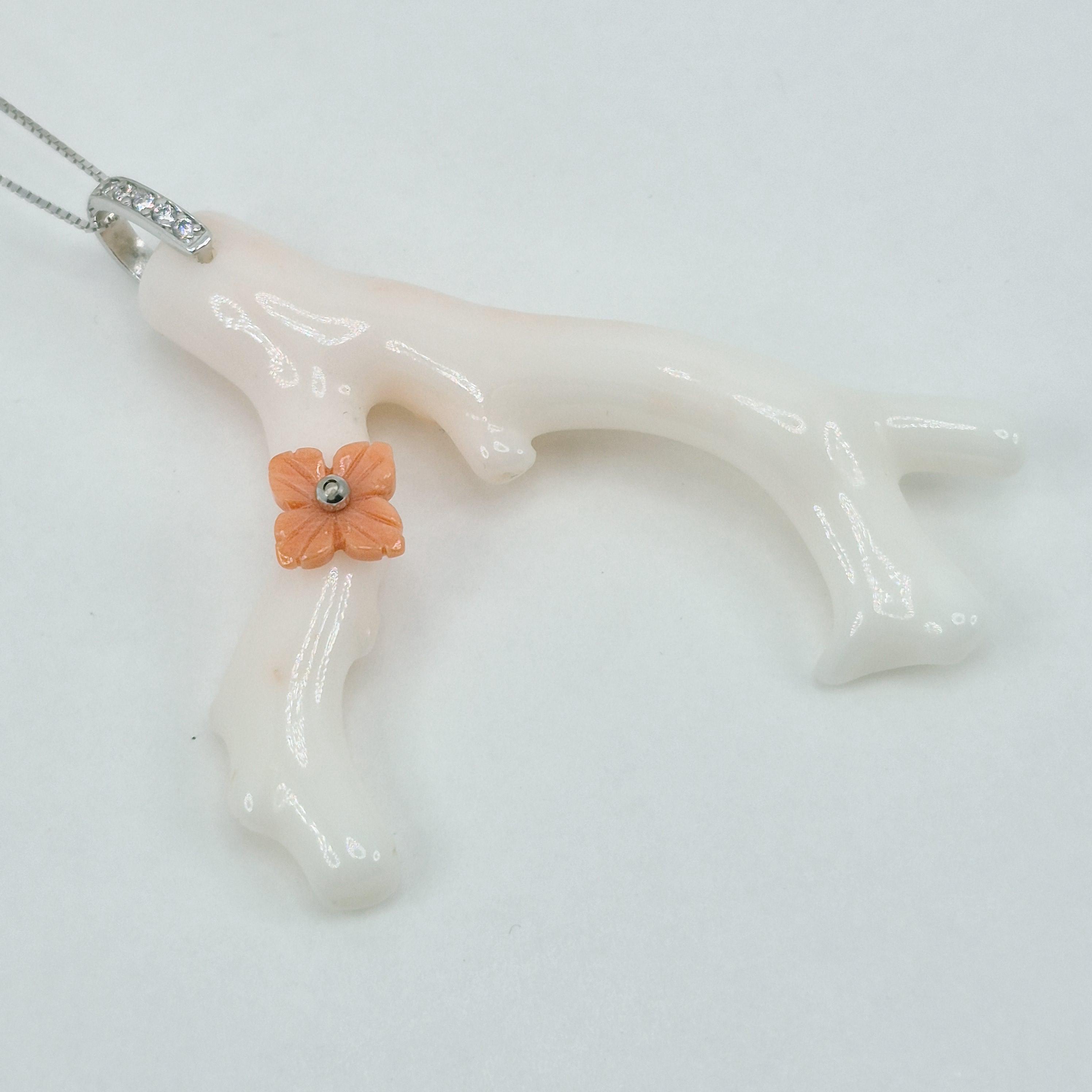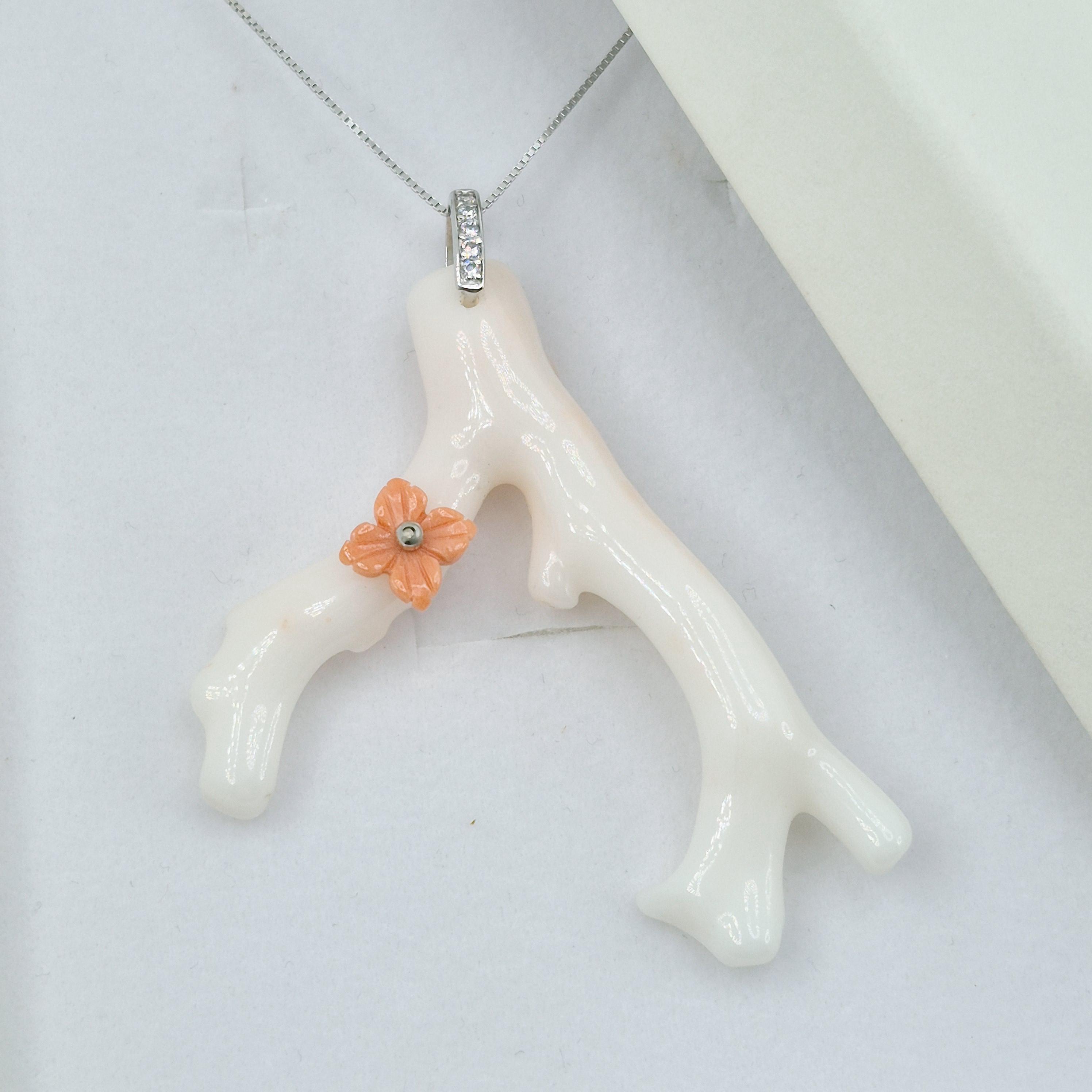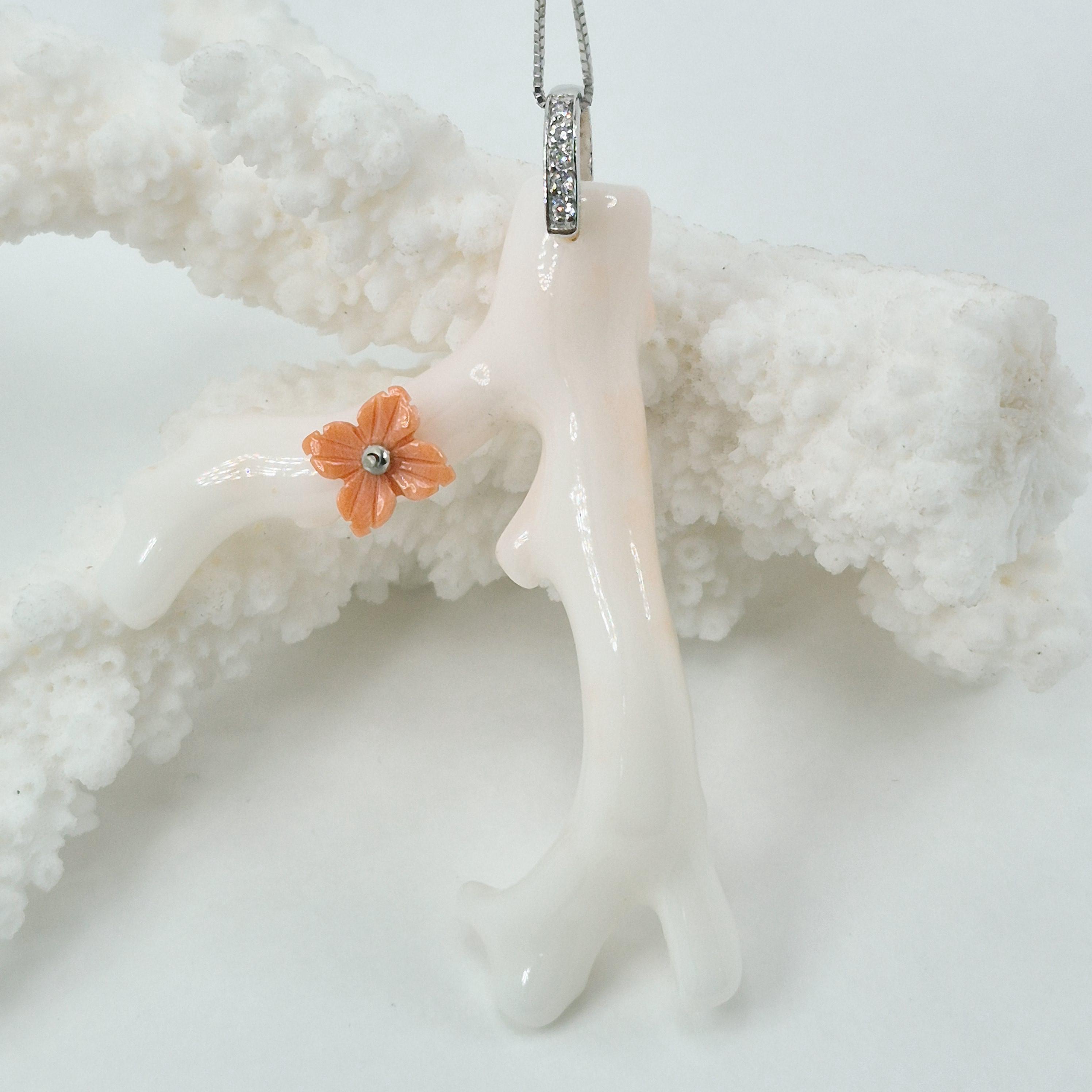 Stunning branch of pink coral in the most delicate shade, almost white, from the seas of Asia and handcrafted, leaving its natural shape with a hand-engraved Cerasuolo coral flower.