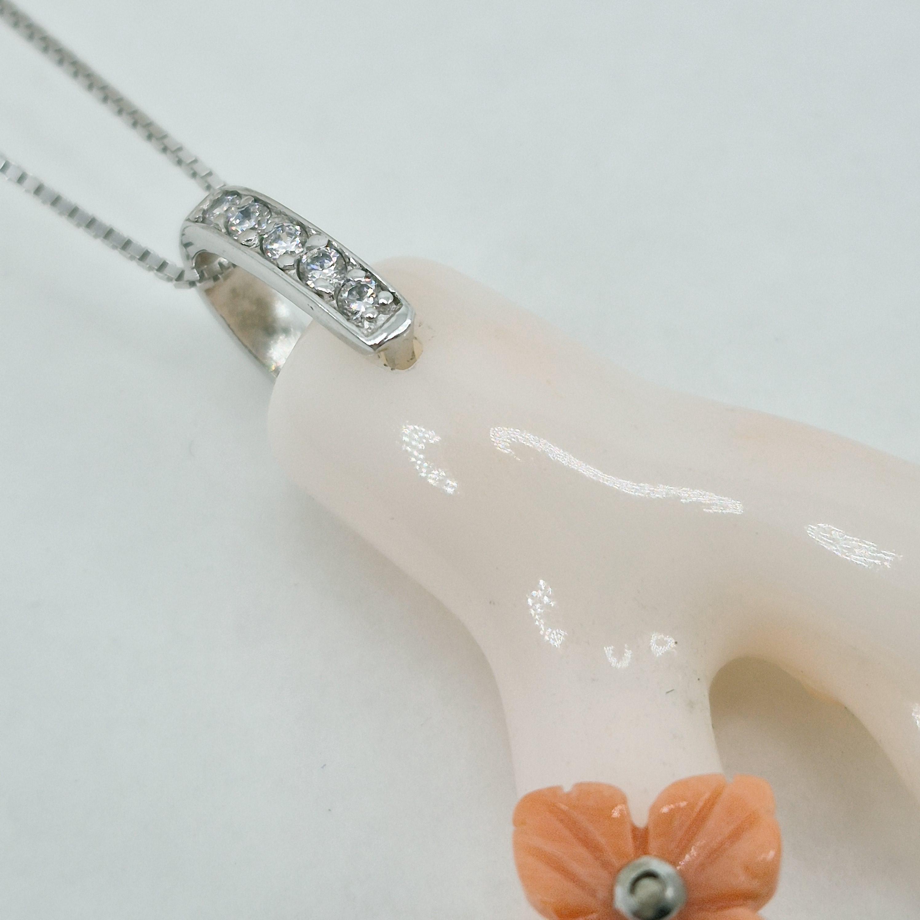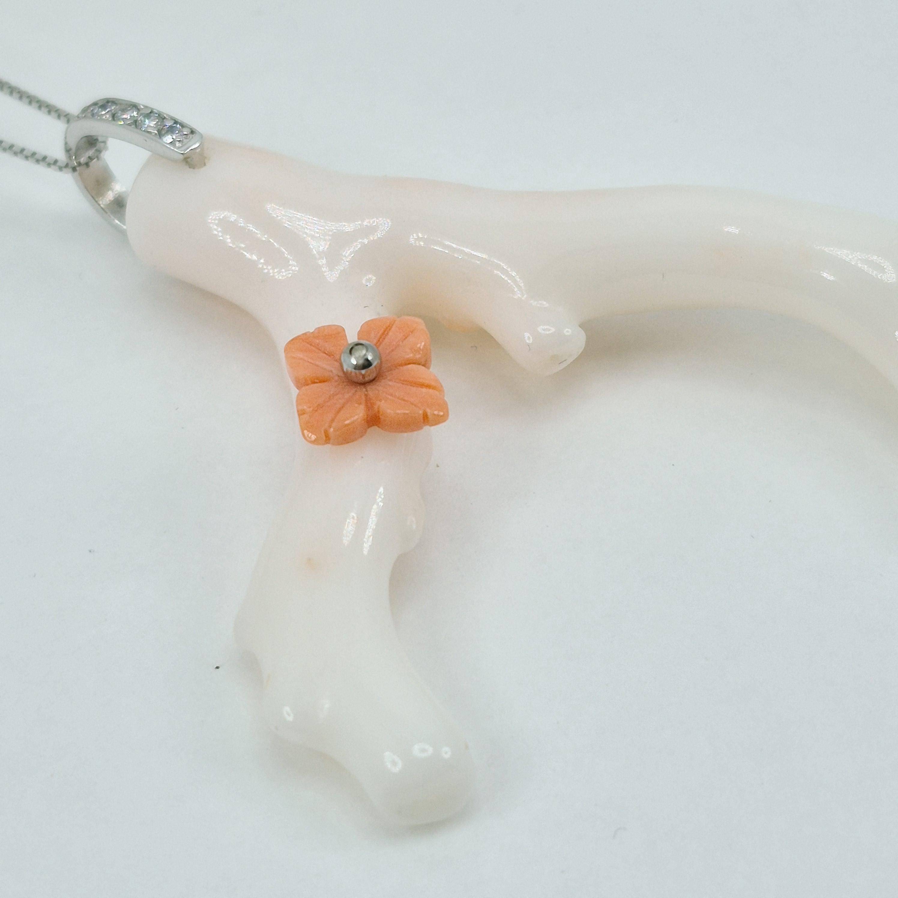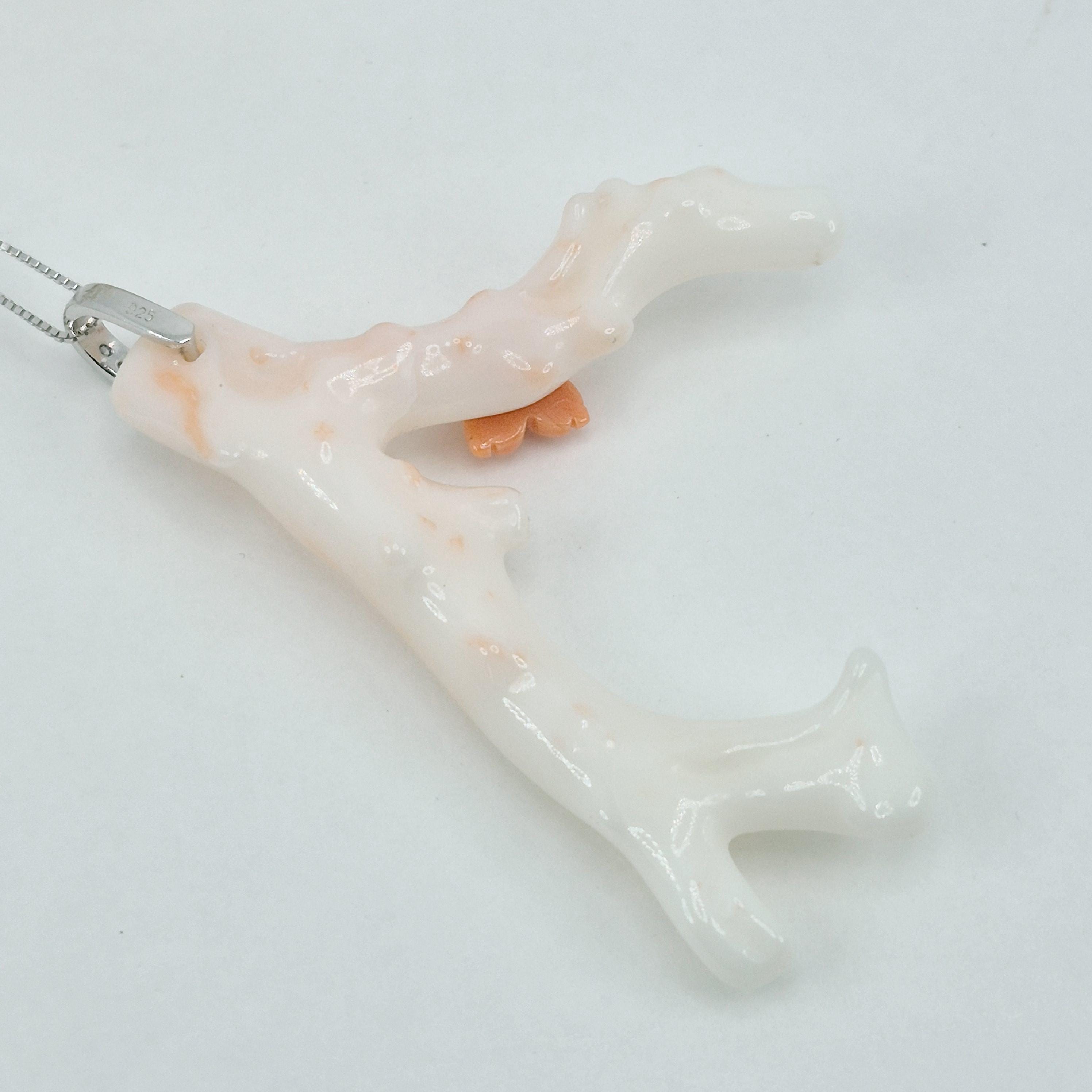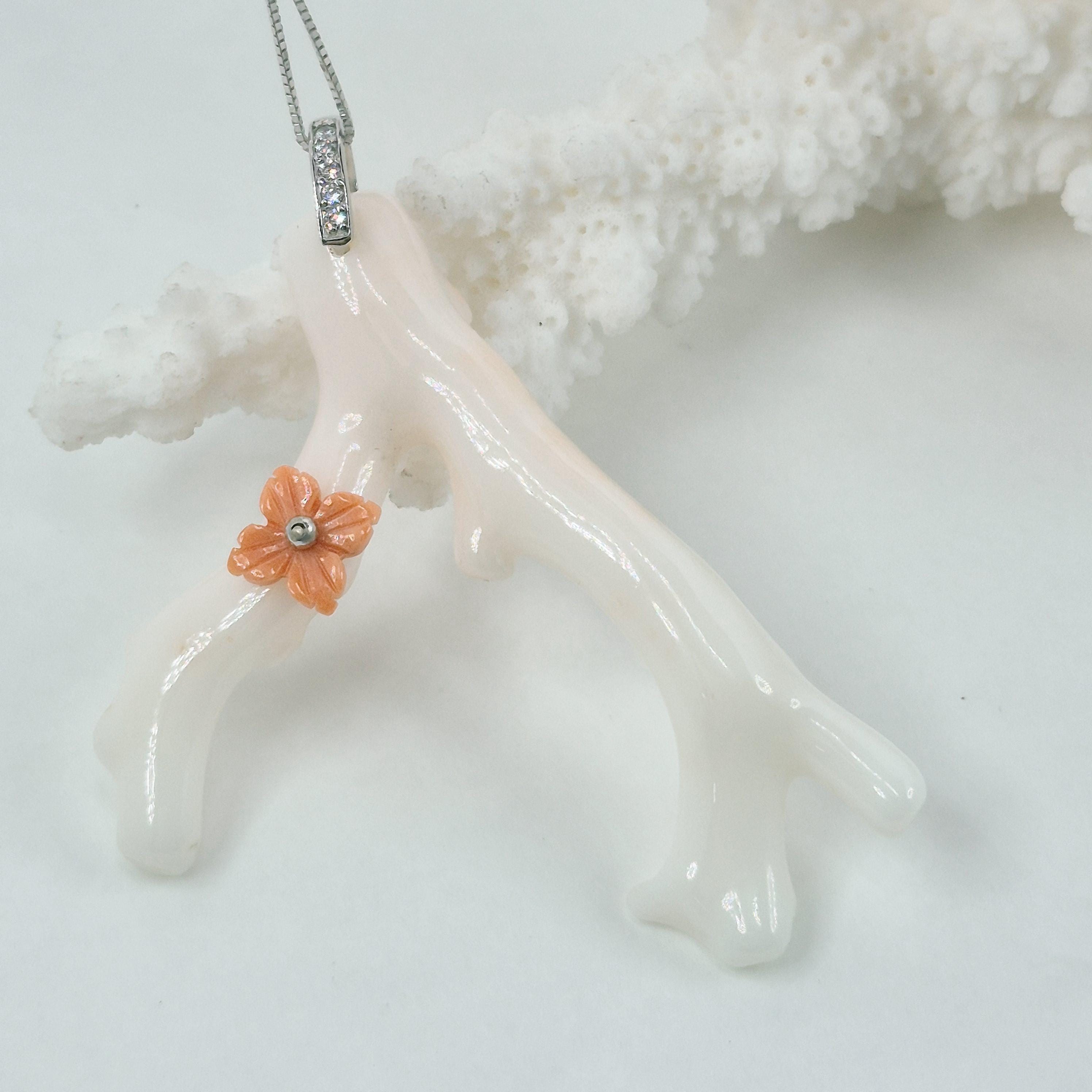 Stunning branch of pink coral in the most delicate shade, almost white, from the seas of Asia and handcrafted, leaving its natural shape with a hand-engraved Cerasuolo coral flower.