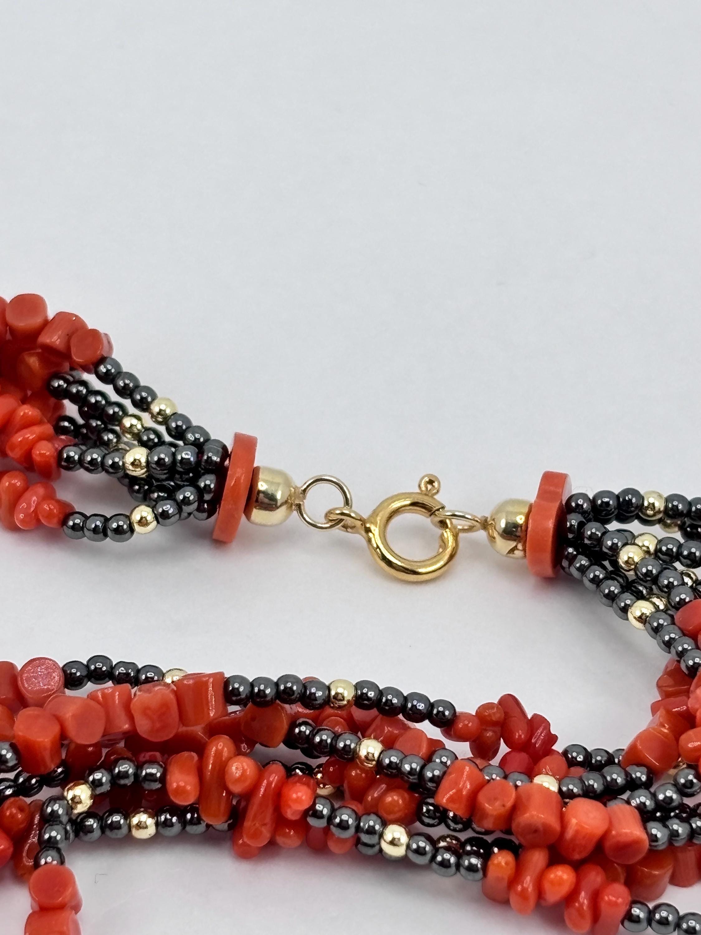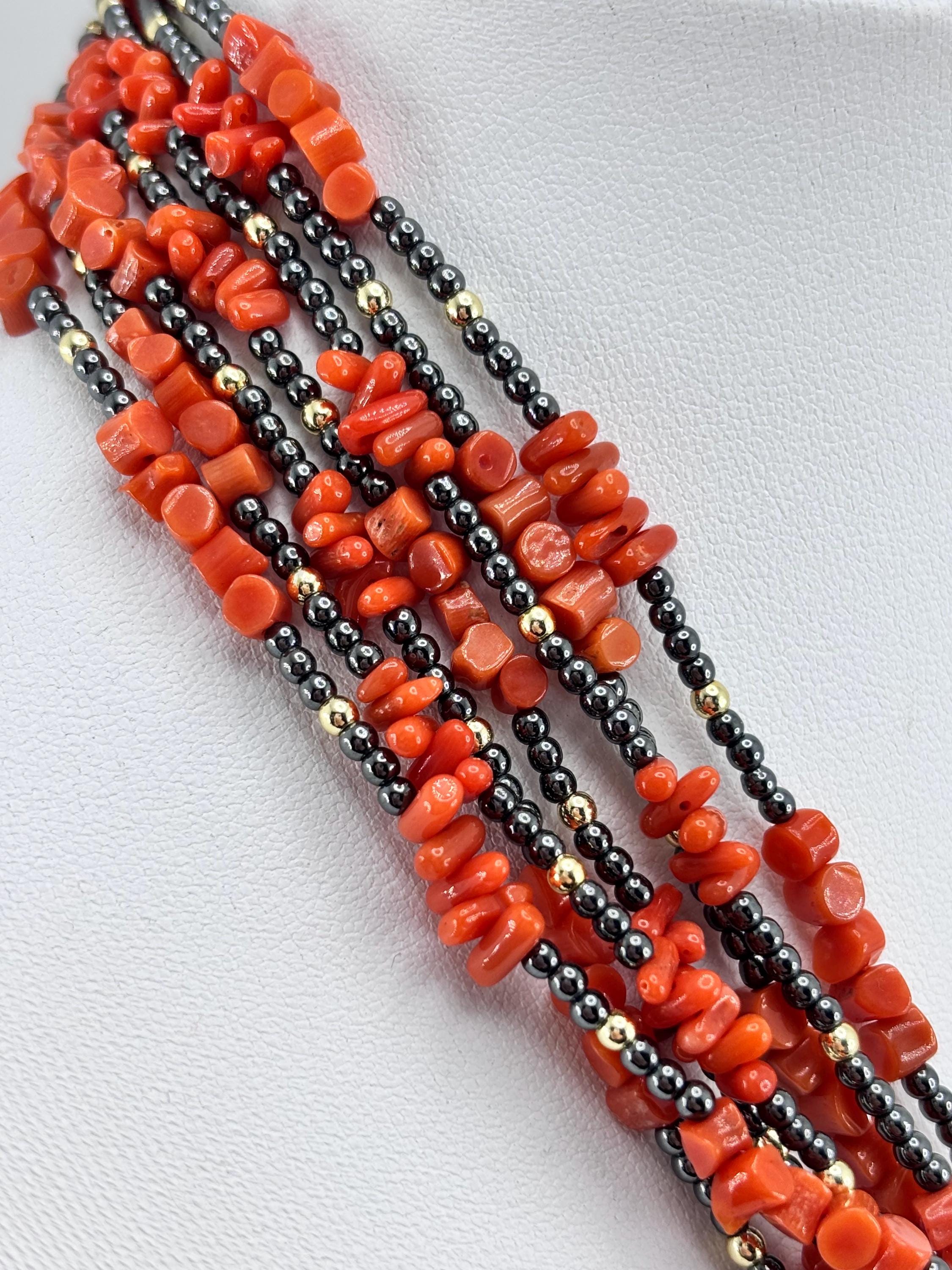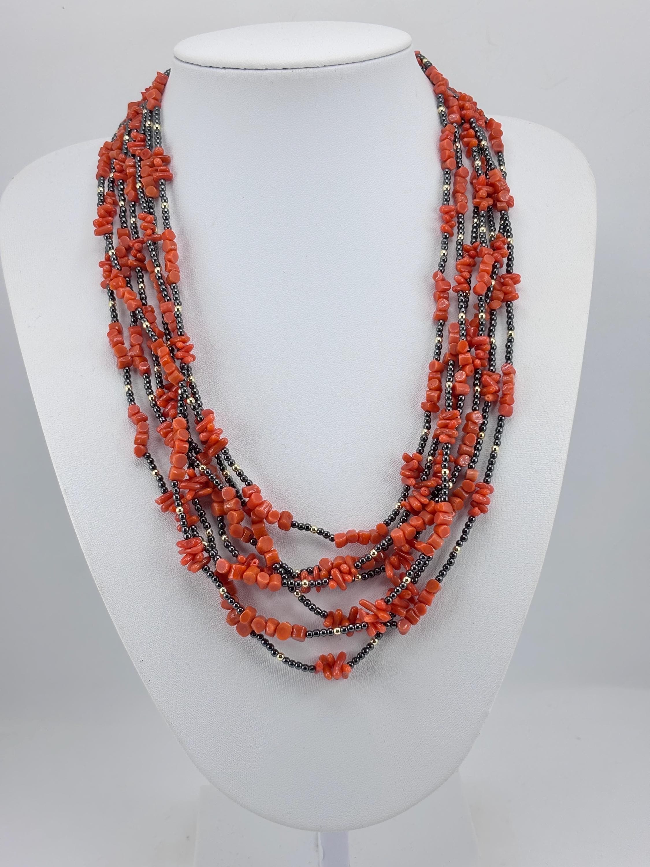 Collana a 7 fili in corallo rosso proveniente dal Mar Mediterraneo e sfere in ematite grigia e dorata con chiusura in Argento 925 placcato in oro. Collana unica e realizzata e lavorata da artigiani a Torre del Greco.