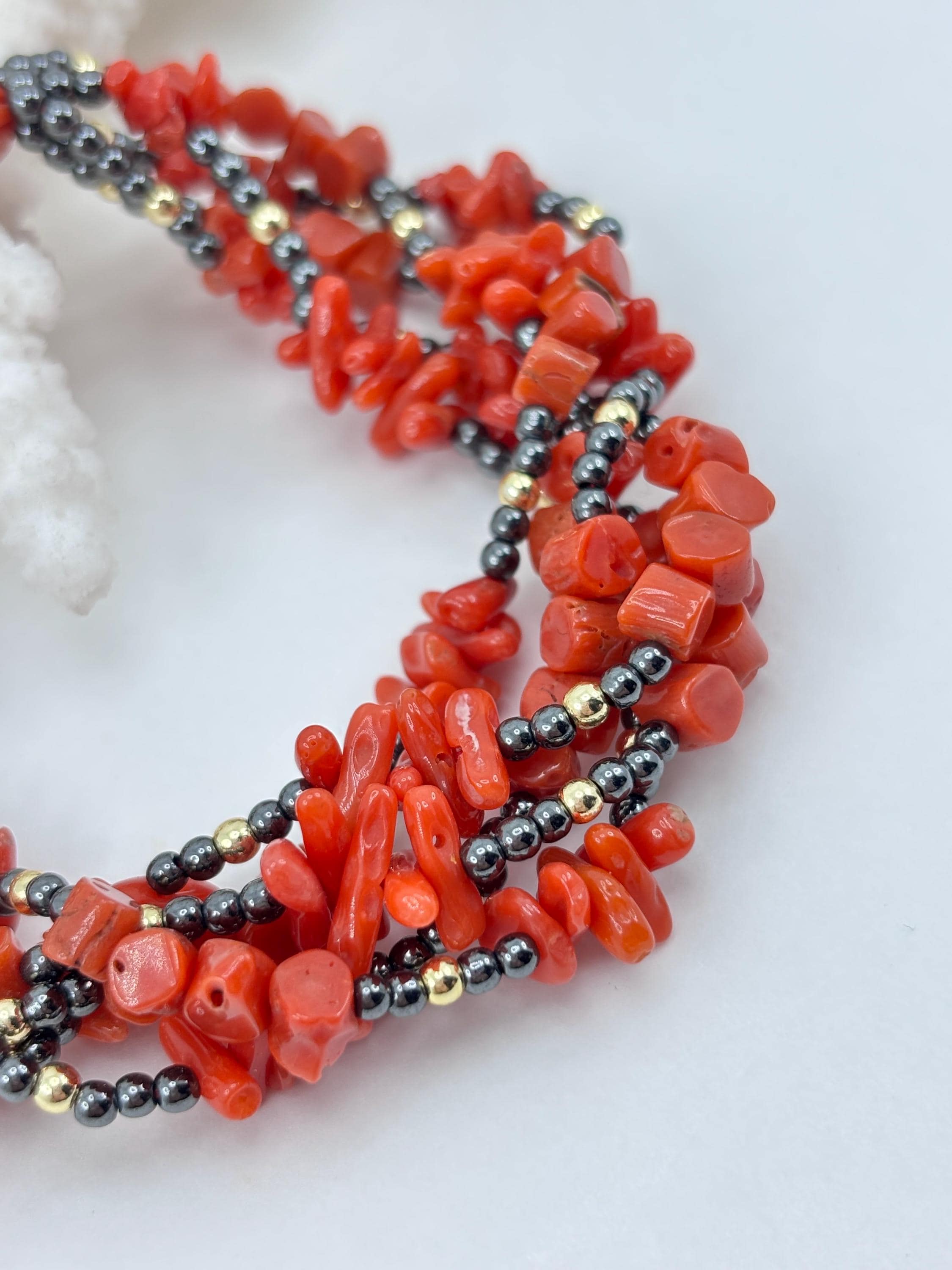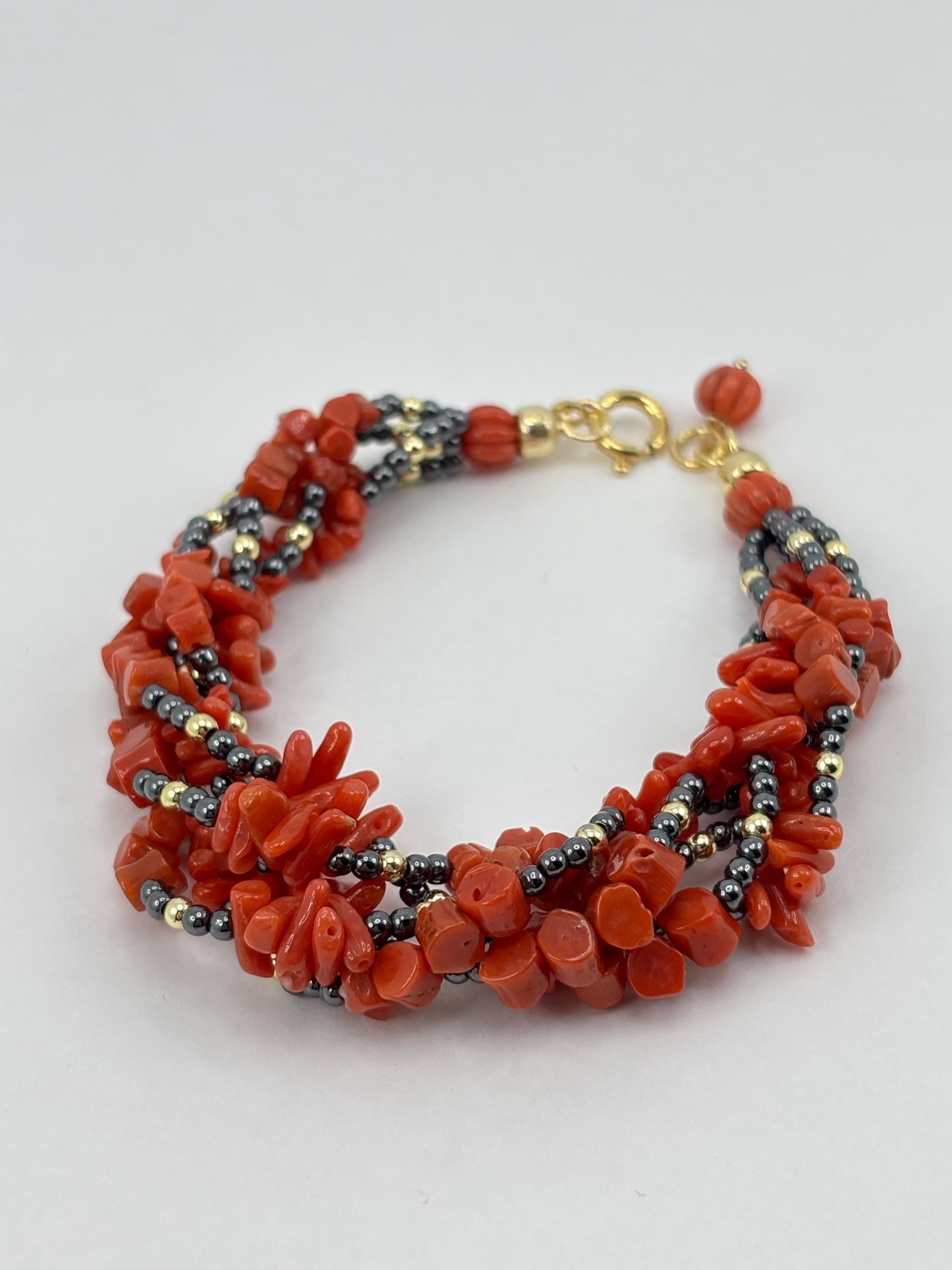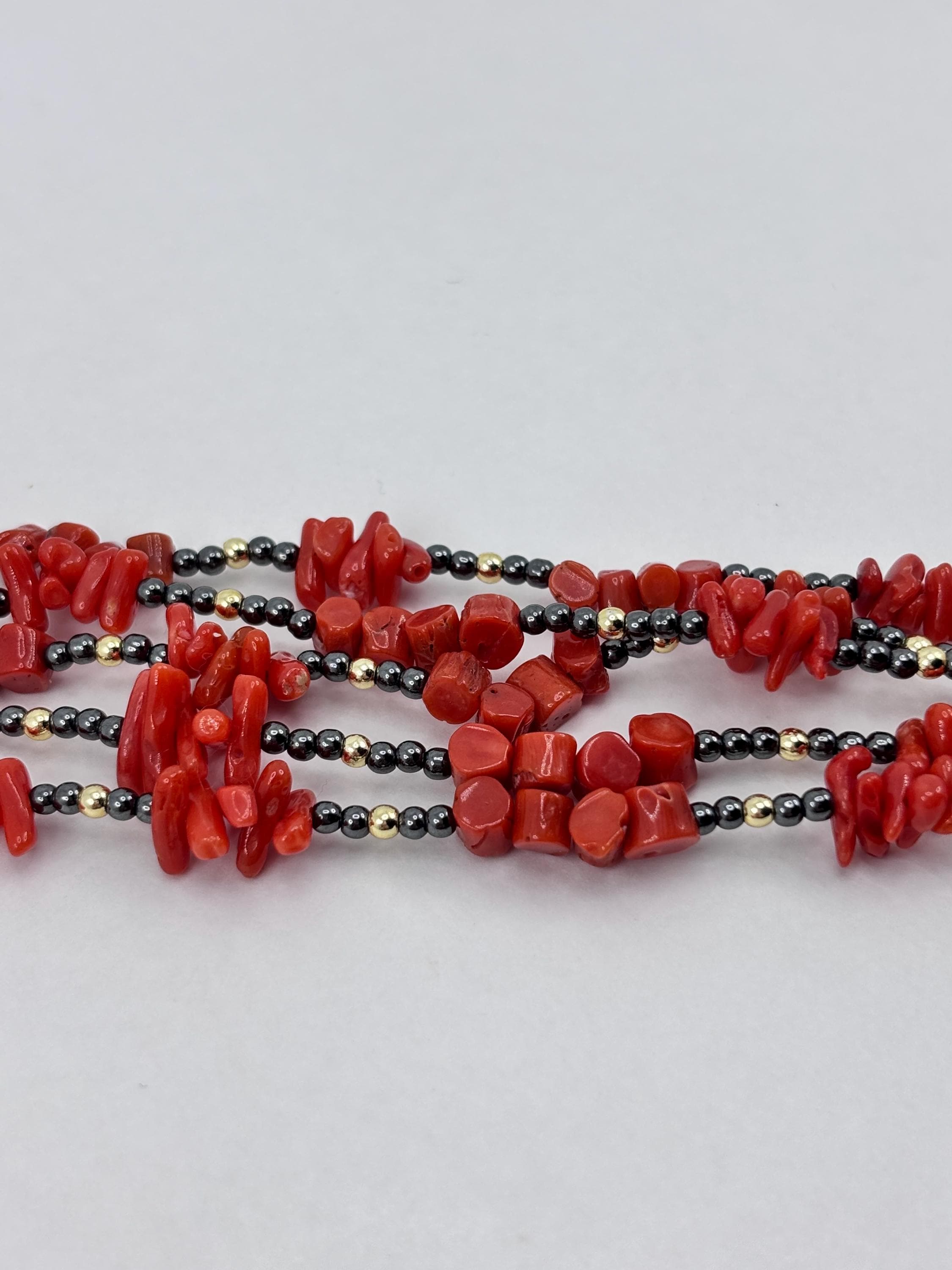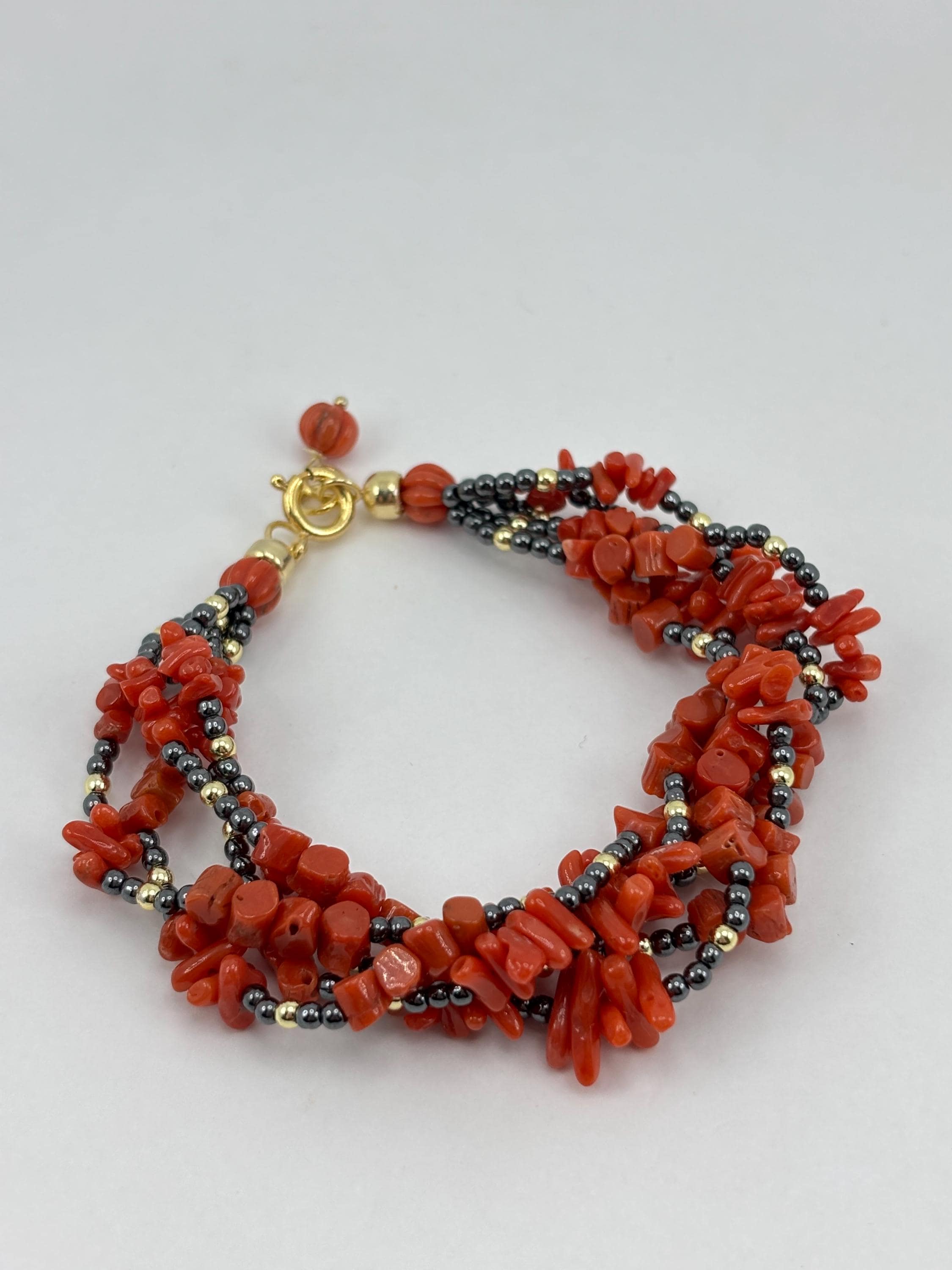 Bracciale a 5 fili in corallo rosso proveniente dal Mar Mediterraneo e sfere in ematite grigia e dorata con chiusura in Argento 925 placcato in oro. Bracciale unico e realizzato e lavorato da artigiani a Torre del Greco.