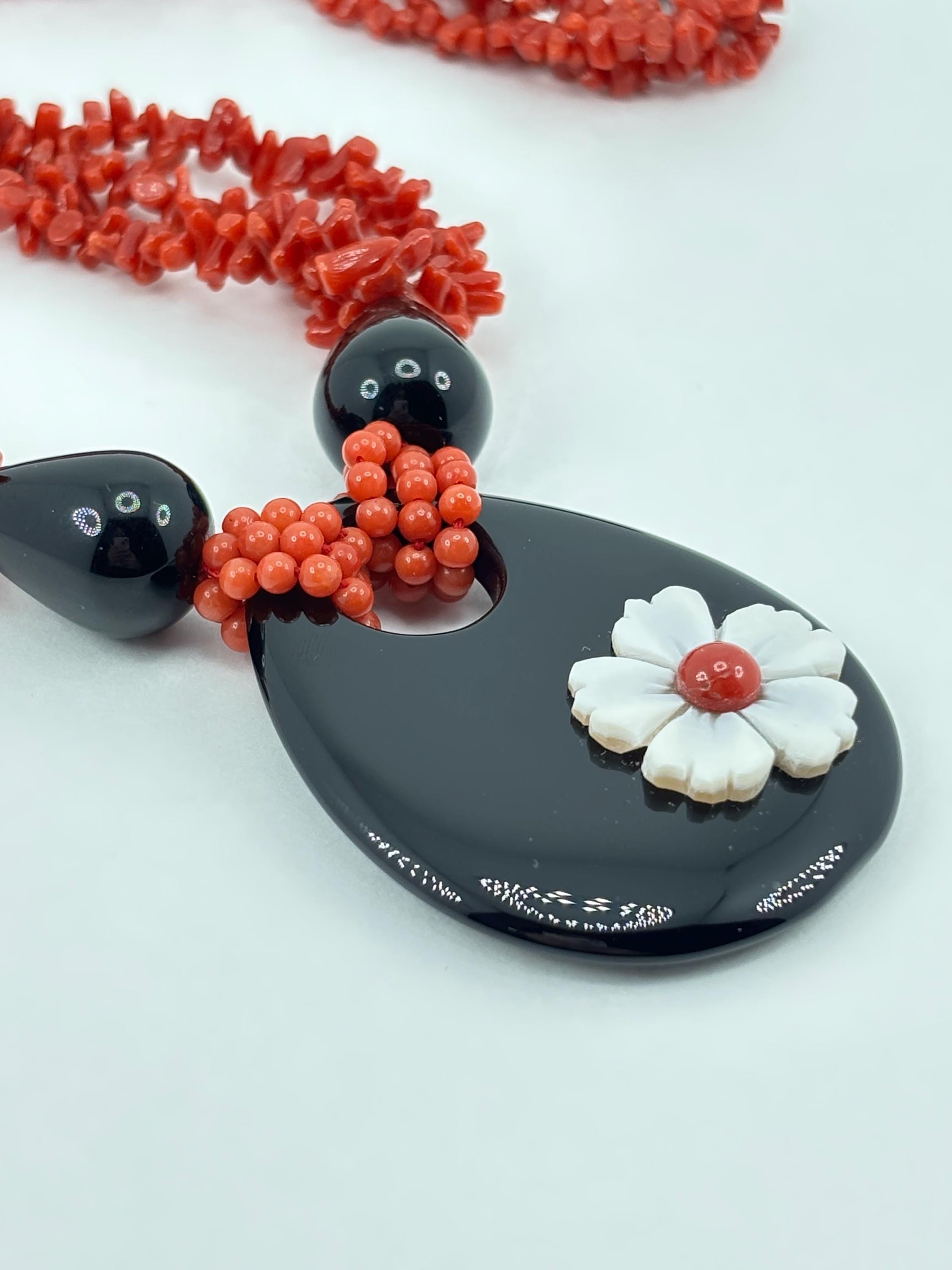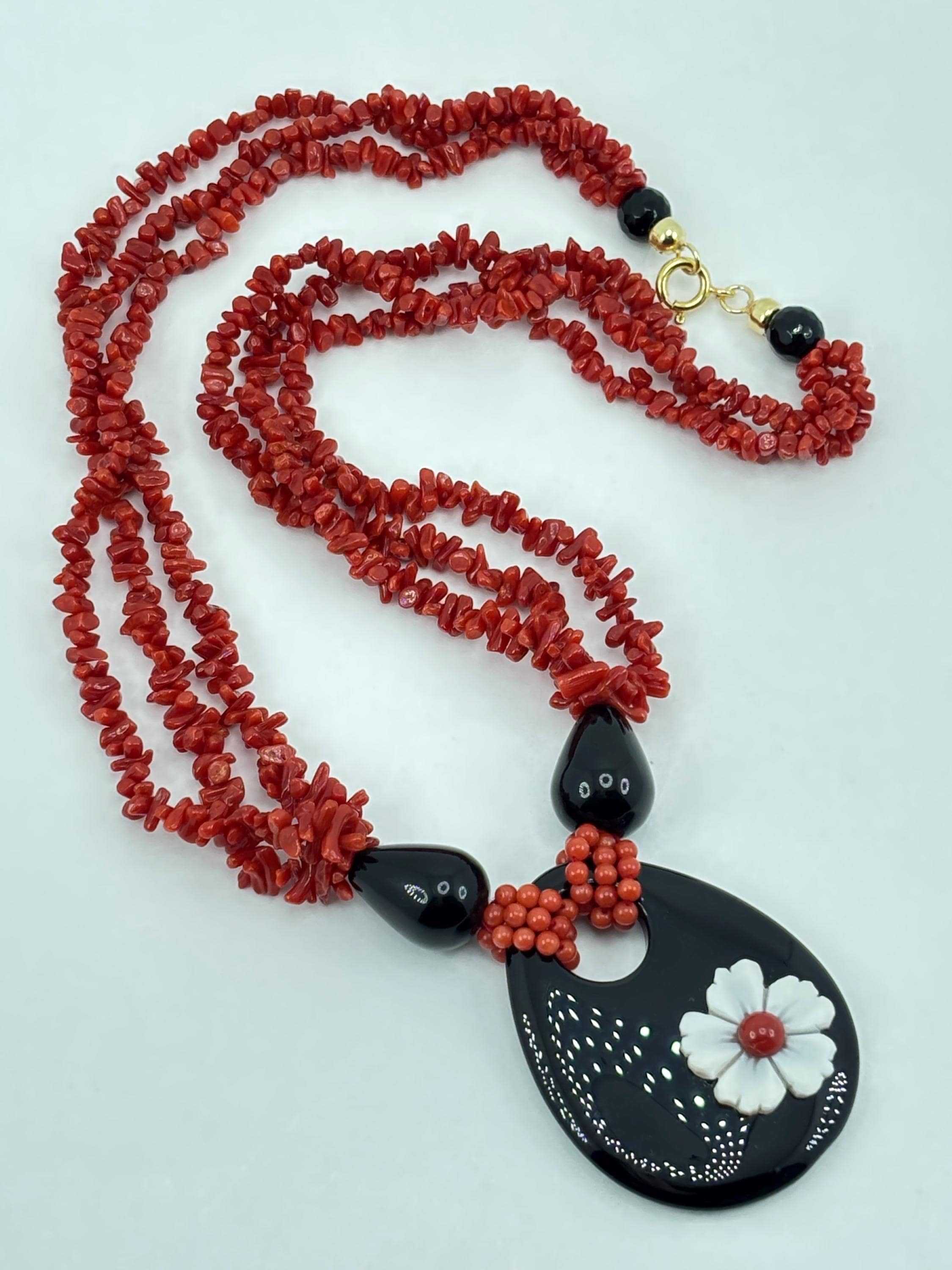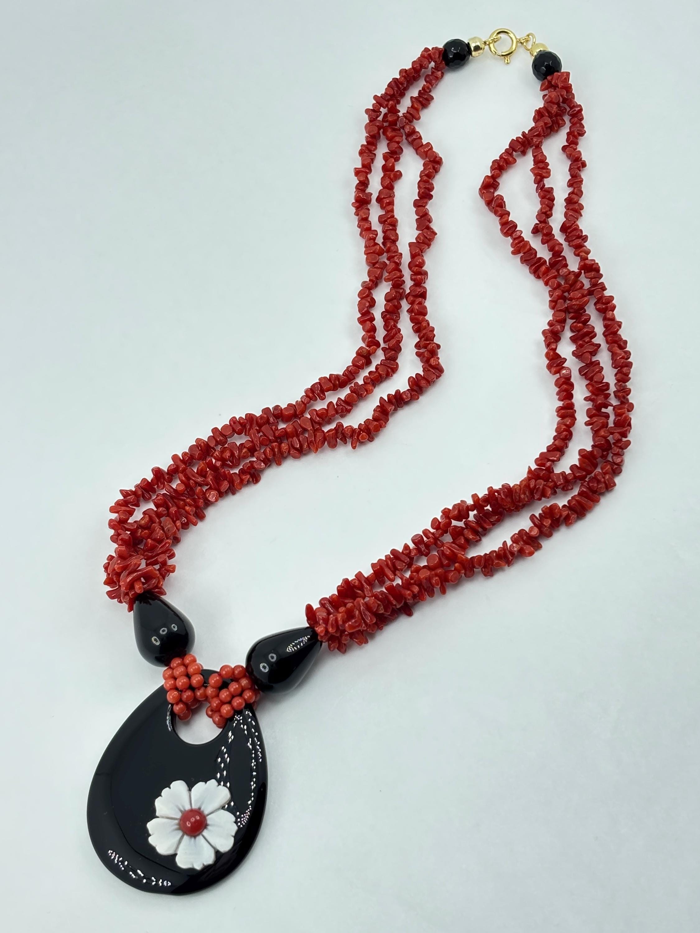 Collana a 3 fili in corallo del Mar Mediterraneo con goccia in onice naturale e fiore in cameo inciso su conchiglia cassis madagascariensis e chiusura in argento 925 placcato in oro. Tale gioiello è stato lavorato e realizzato da artigiani a Torre del Greco.