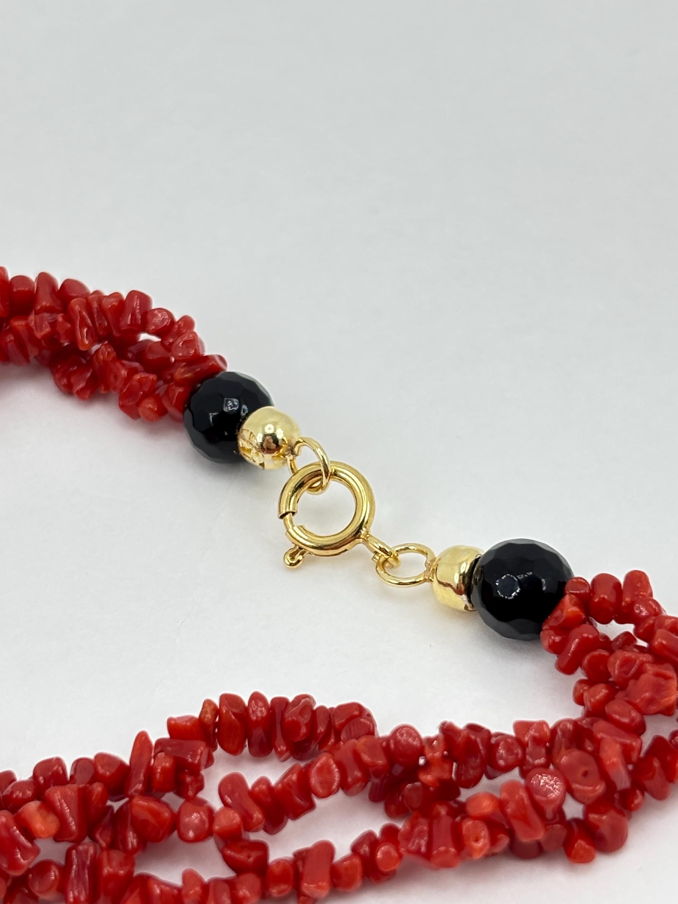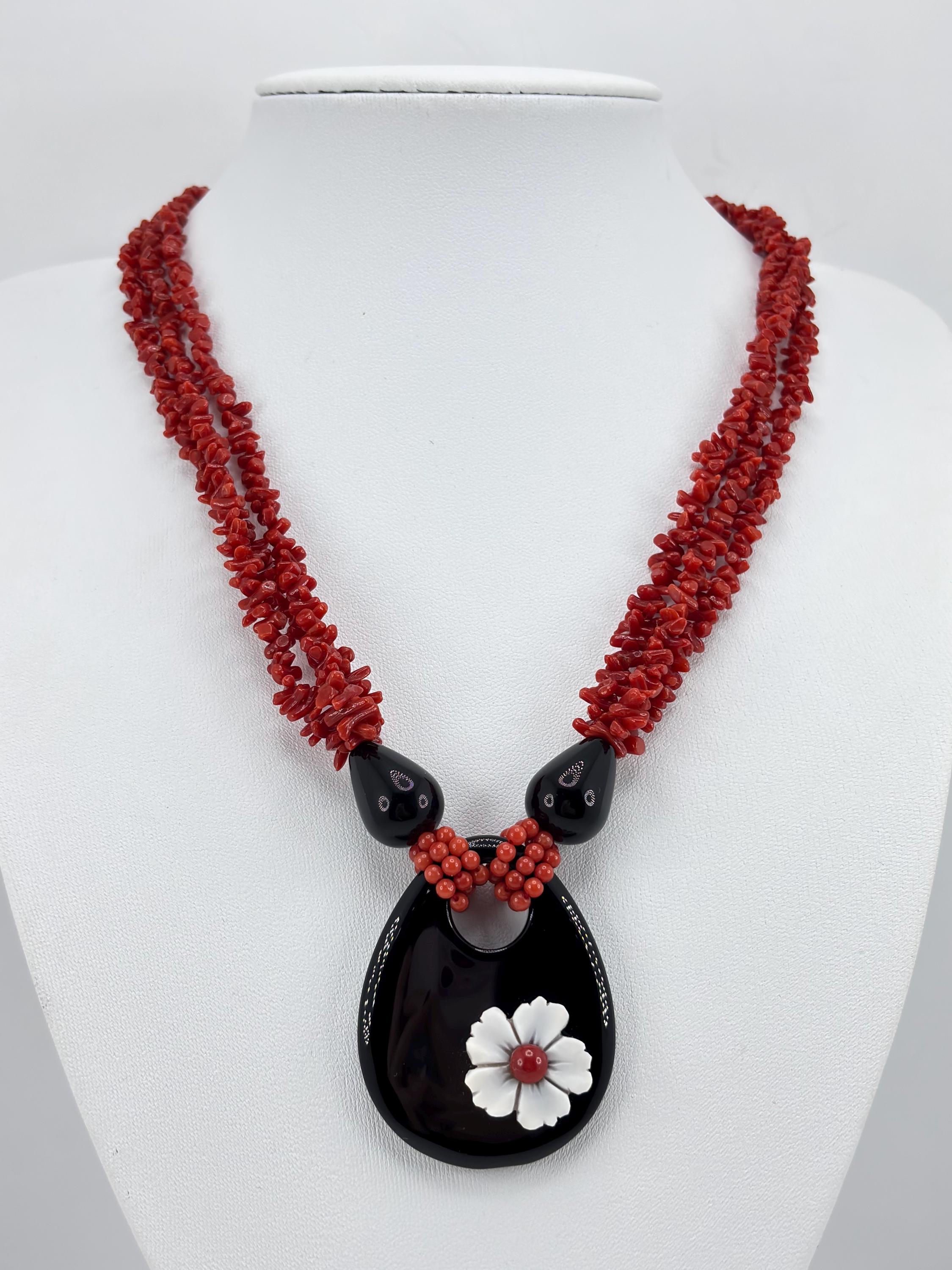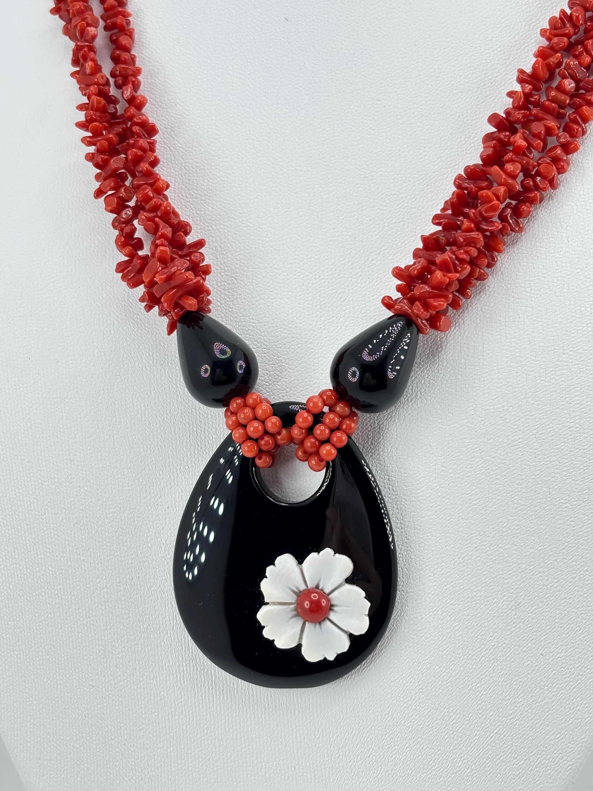 Collana a 3 fili in corallo del Mar Mediterraneo con goccia in onice naturale e fiore in cameo inciso su conchiglia cassis madagascariensis e chiusura in argento 925 placcato in oro. Tale gioiello è stato lavorato e realizzato da artigiani a Torre del Greco.