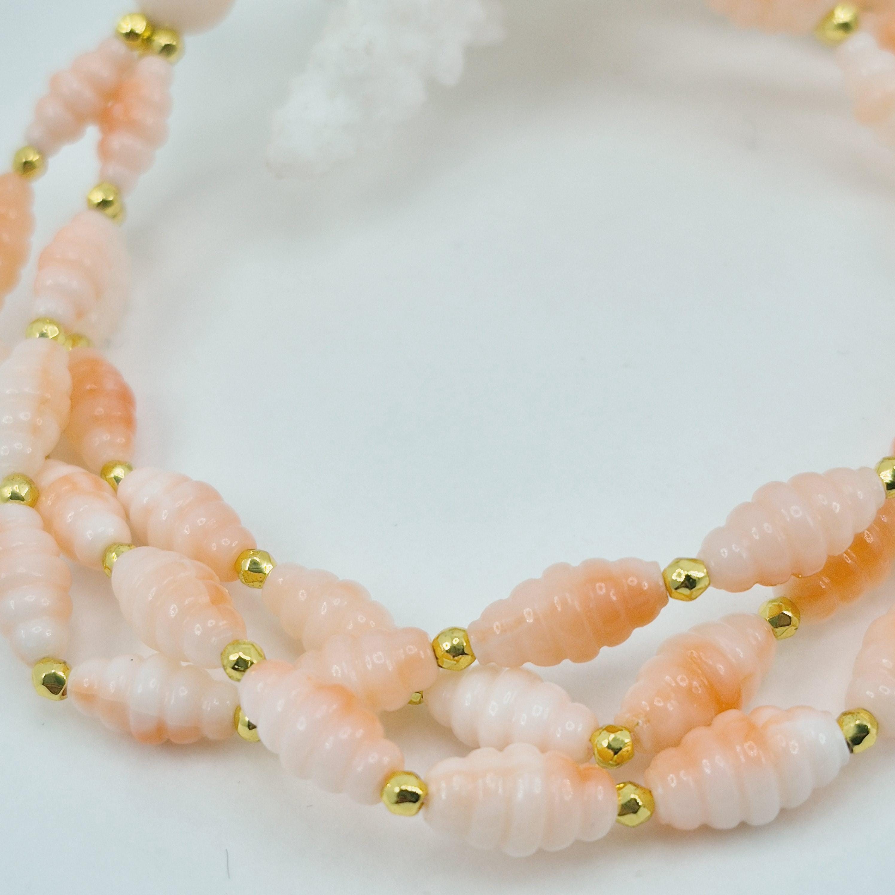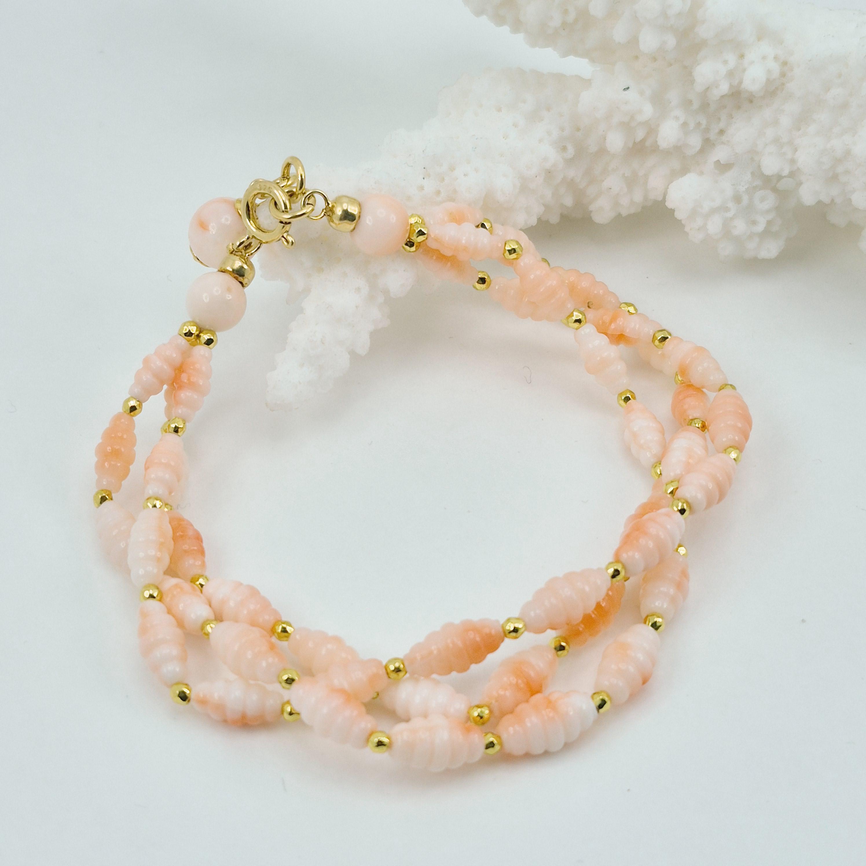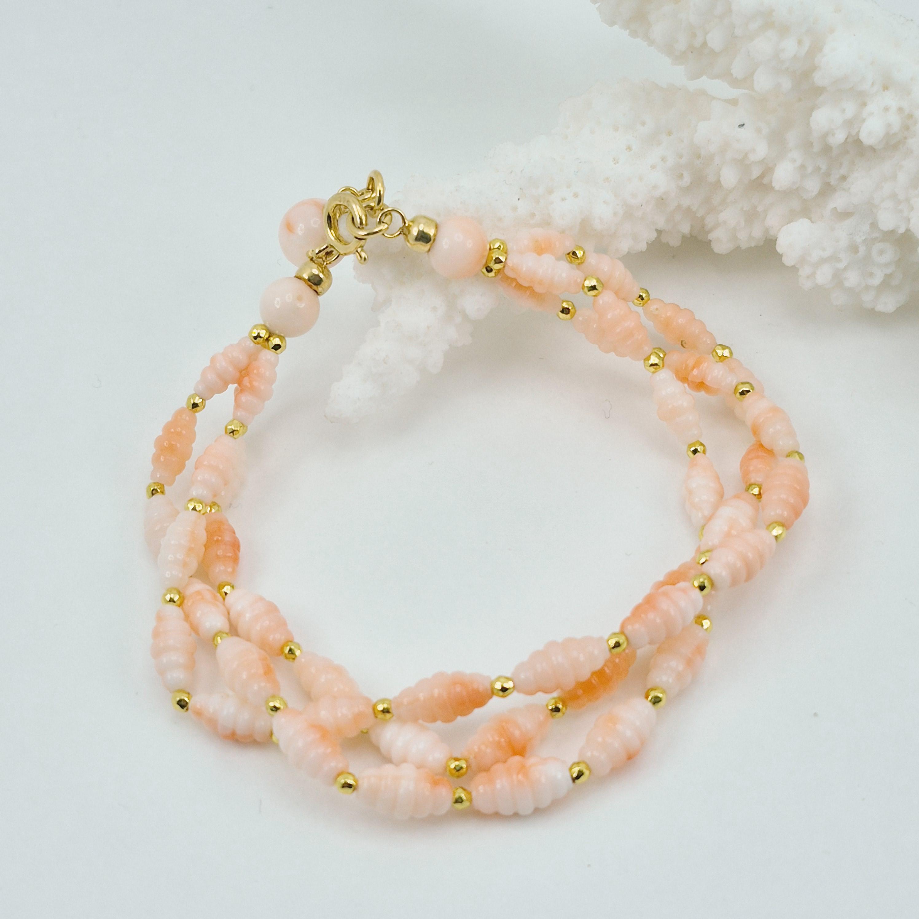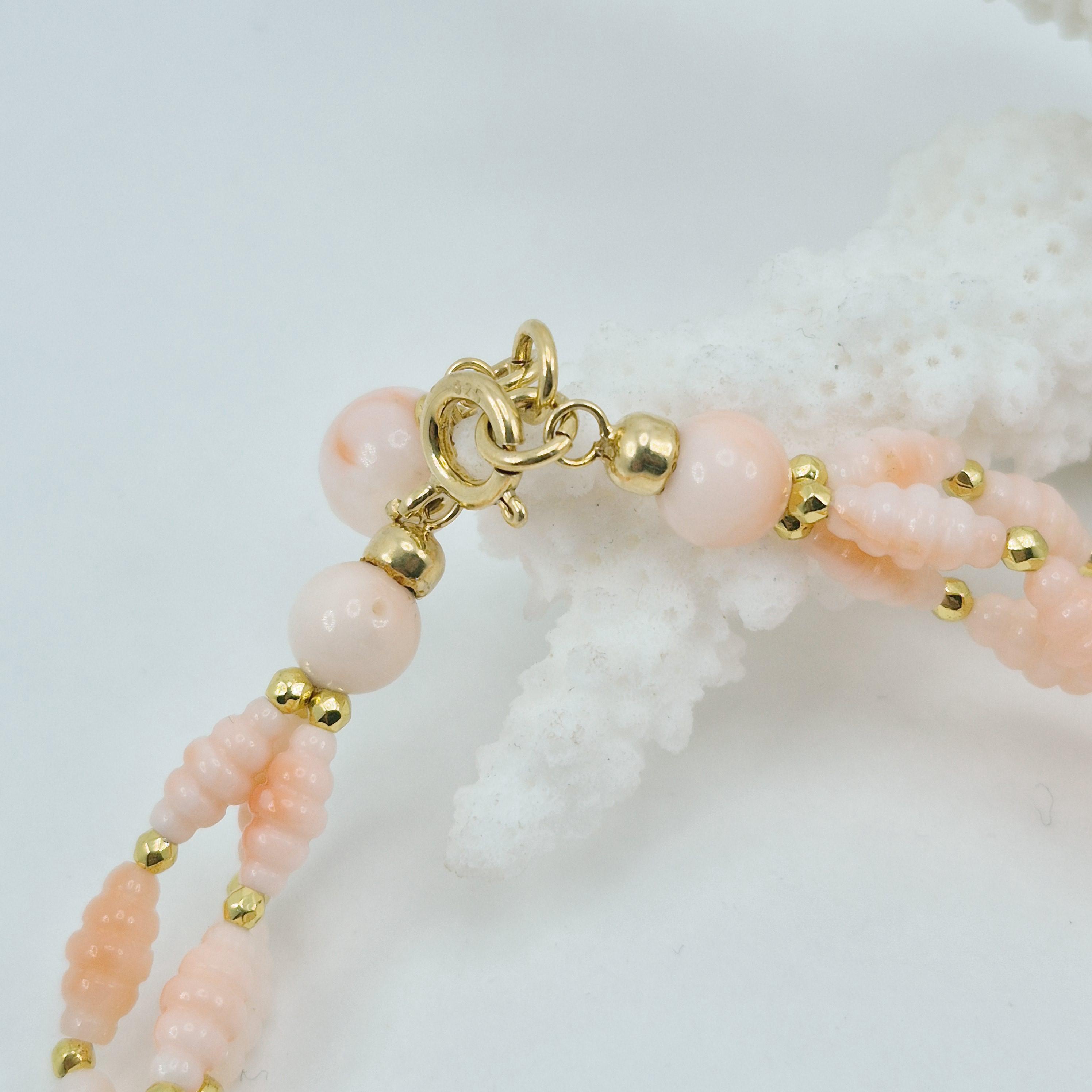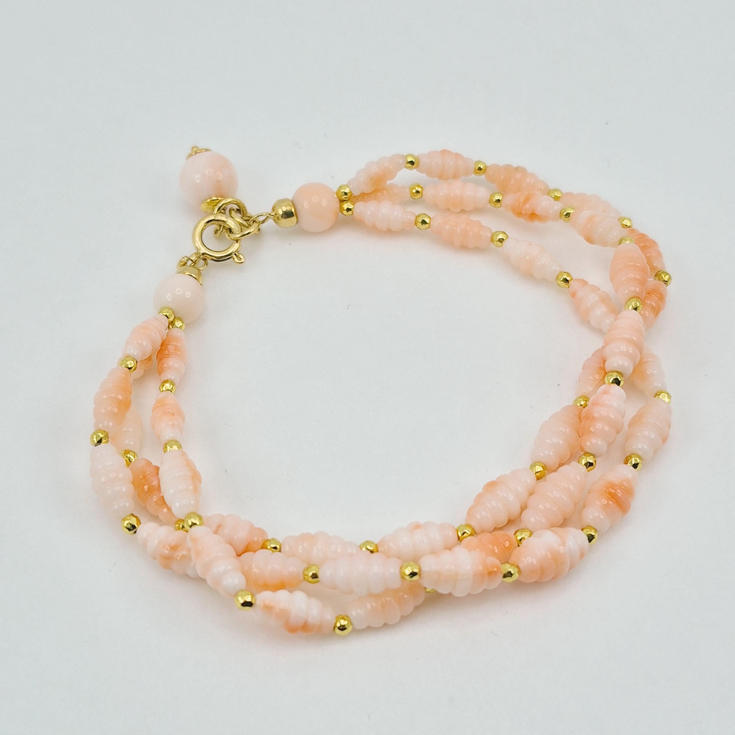 Three-strand bracelet in engraved pink coral from Asian seas, alternating with faceted golden hematite spheres that lend the piece a dazzling sparkle. A gold-plated 925 silver clasp with a gold-plated 925 silver extension allows for adjustable length. This piece is handcrafted and crafted by artisans in Torre del Greco.