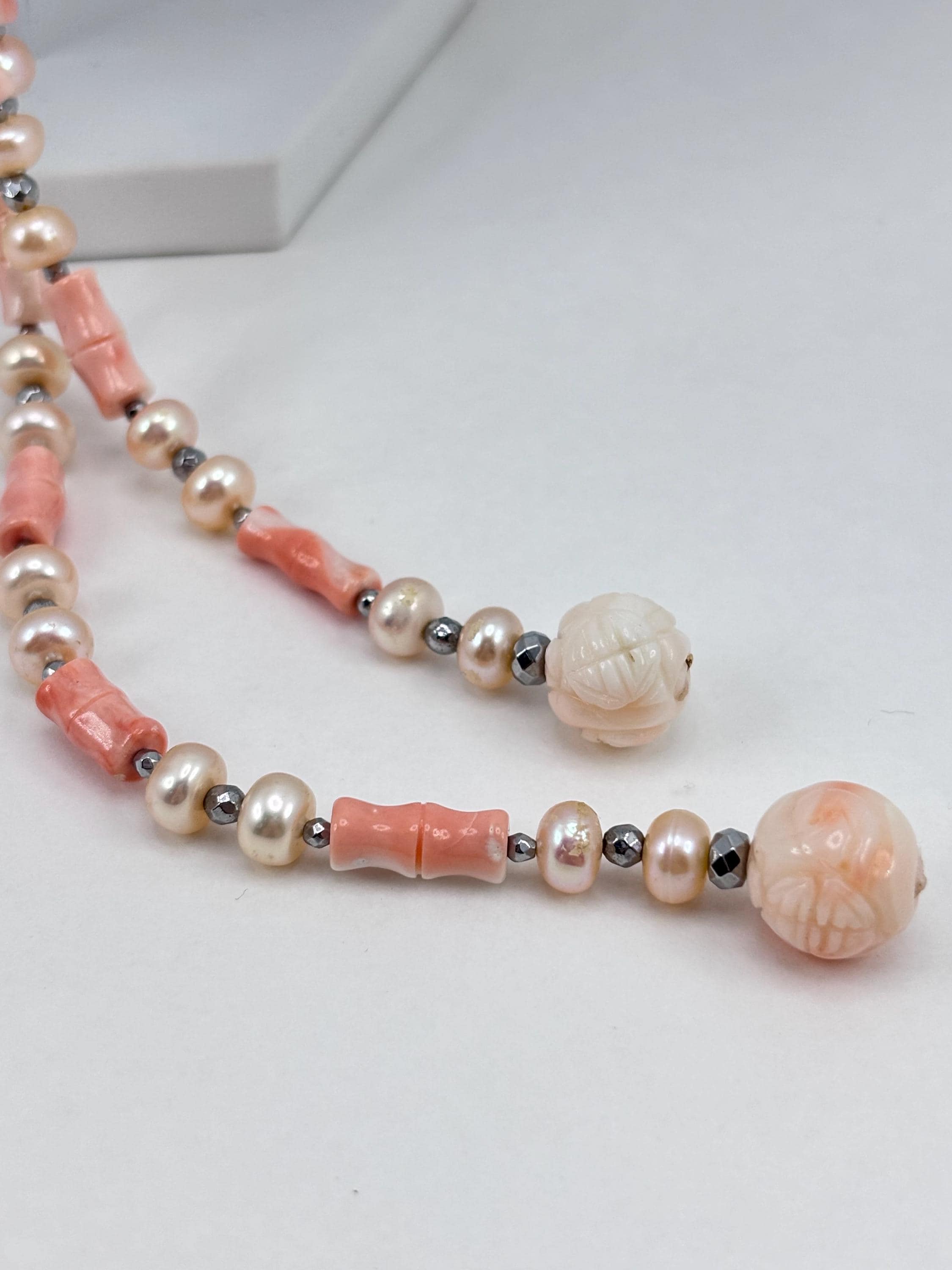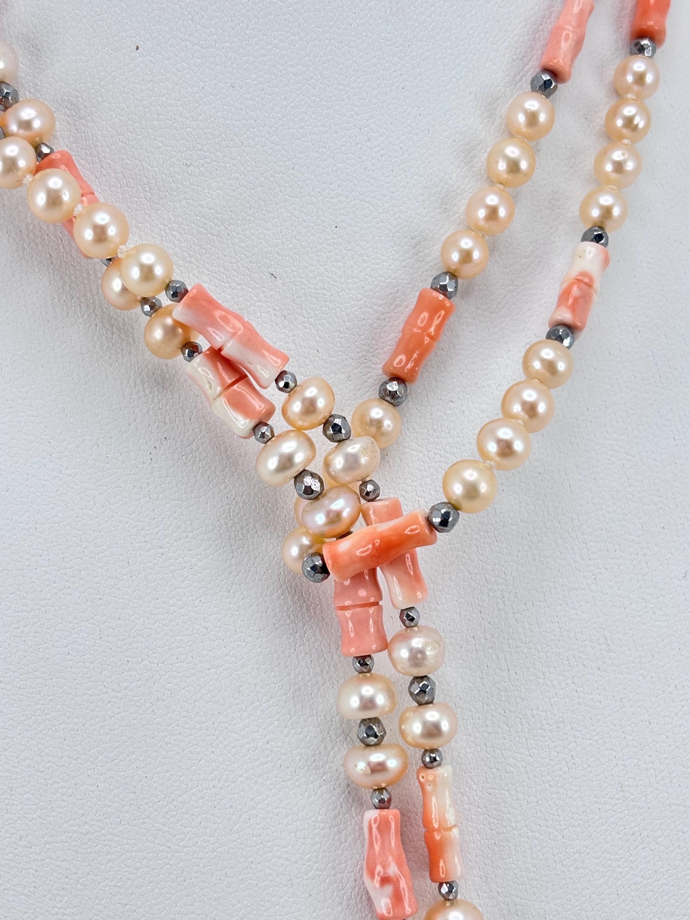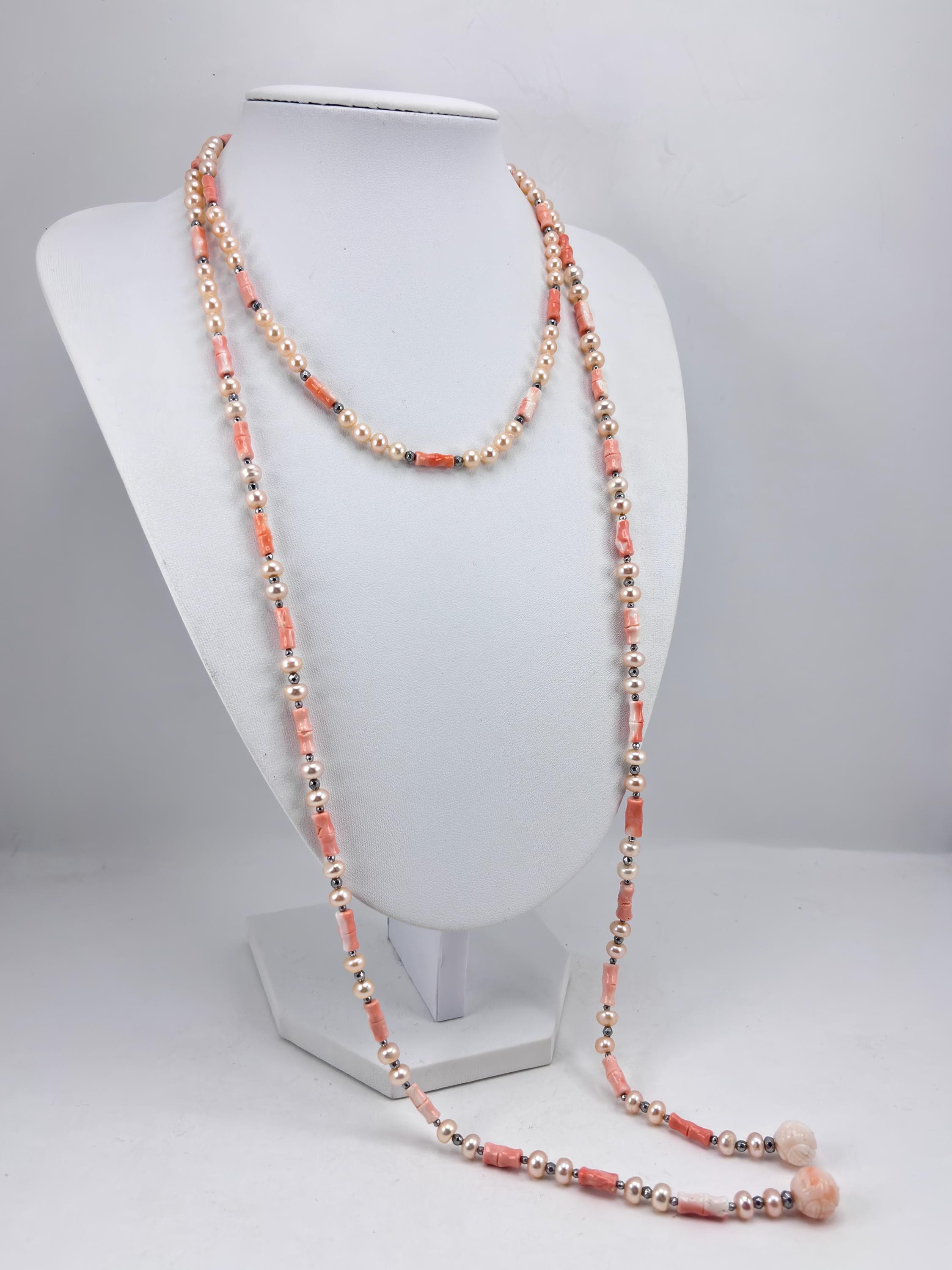 Sciarpa in corallo rosa lavorato con questa particolare forma a cannette e perle miste coltivate d’acqua dolce con luminosa tonalità champagne, arricchita con sfere sfaccettate in ematite argentata. La particolarità del gioiello risiede nella sua versatilità nell’indossarla.
