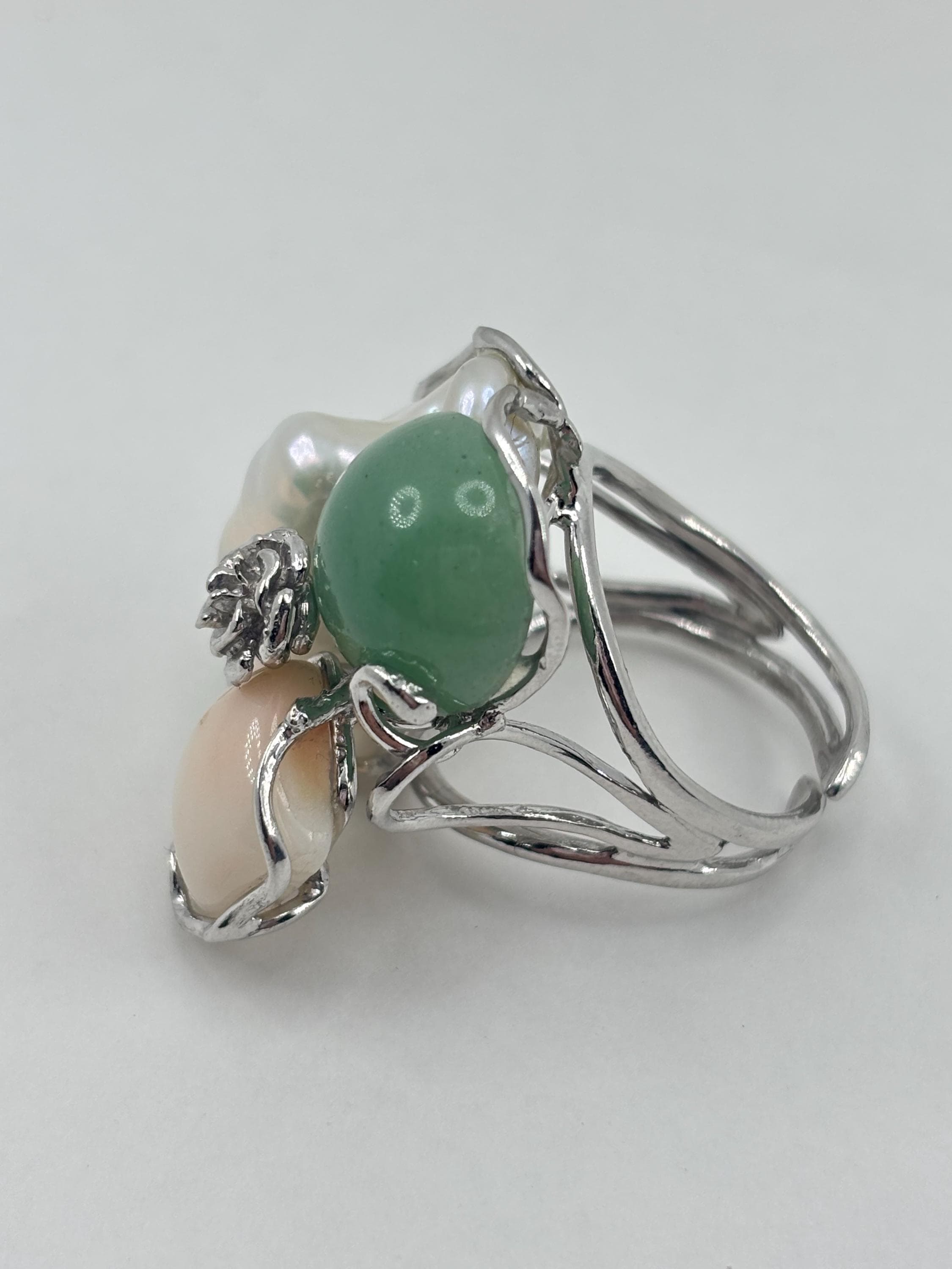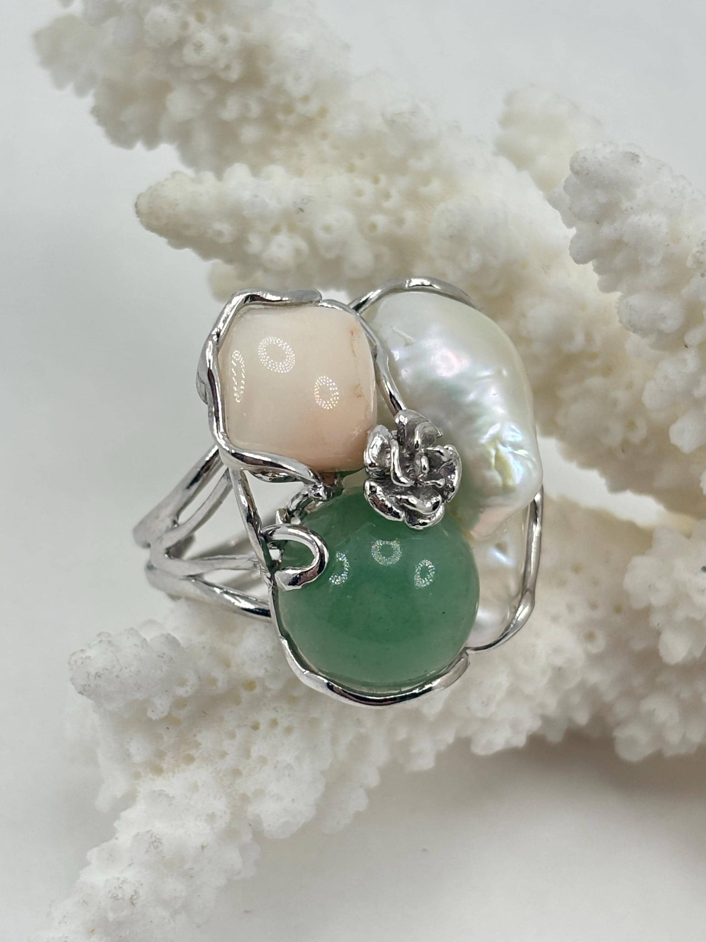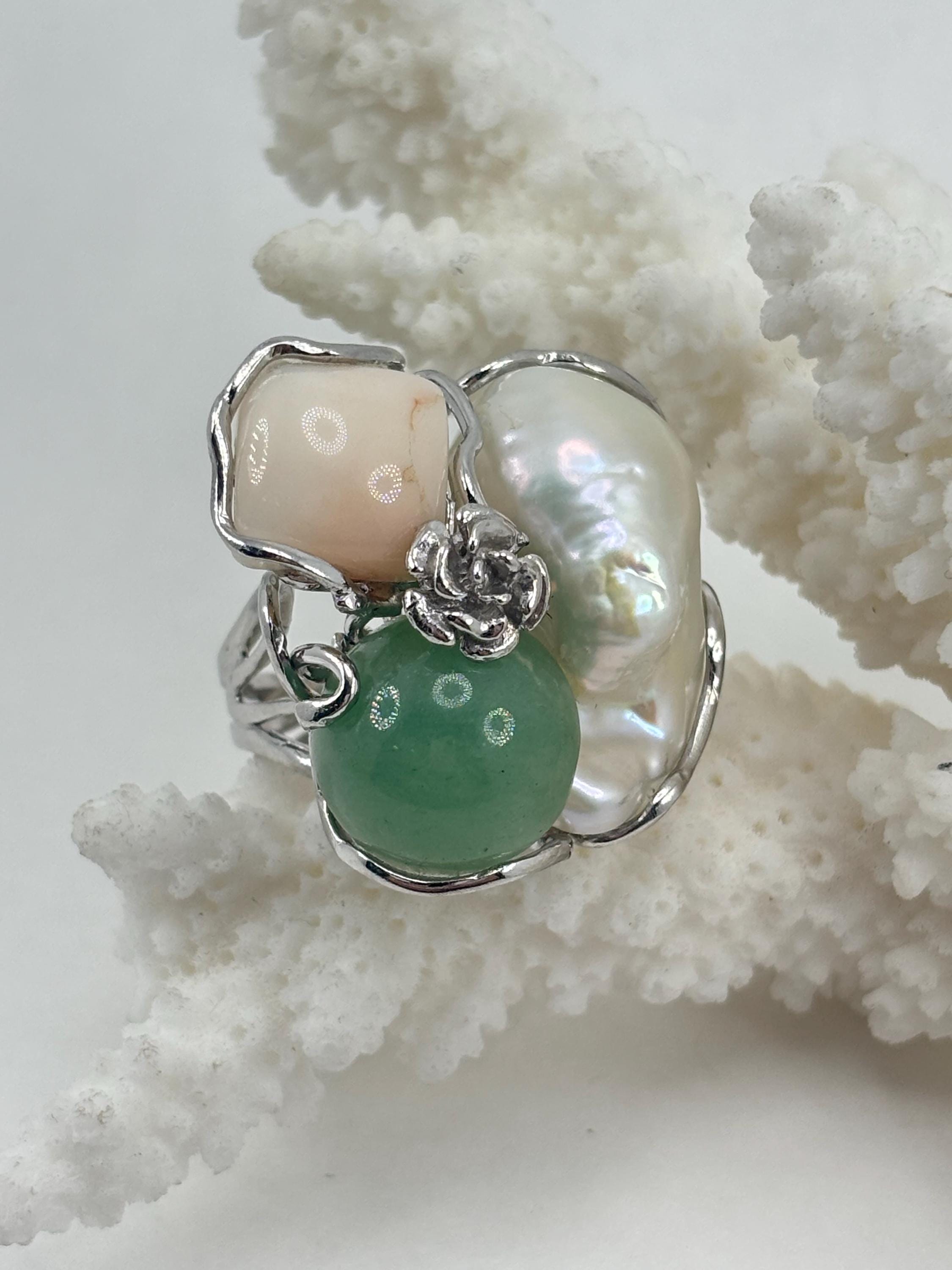 Multi-stone ring with a cultured freshwater baroque pearl, natural jade stone, and pink coral from Asian seas, set in 925 silver. An imposing and unique piece of jewelry, handcrafted and handcrafted by artisans from Torre del Greco.