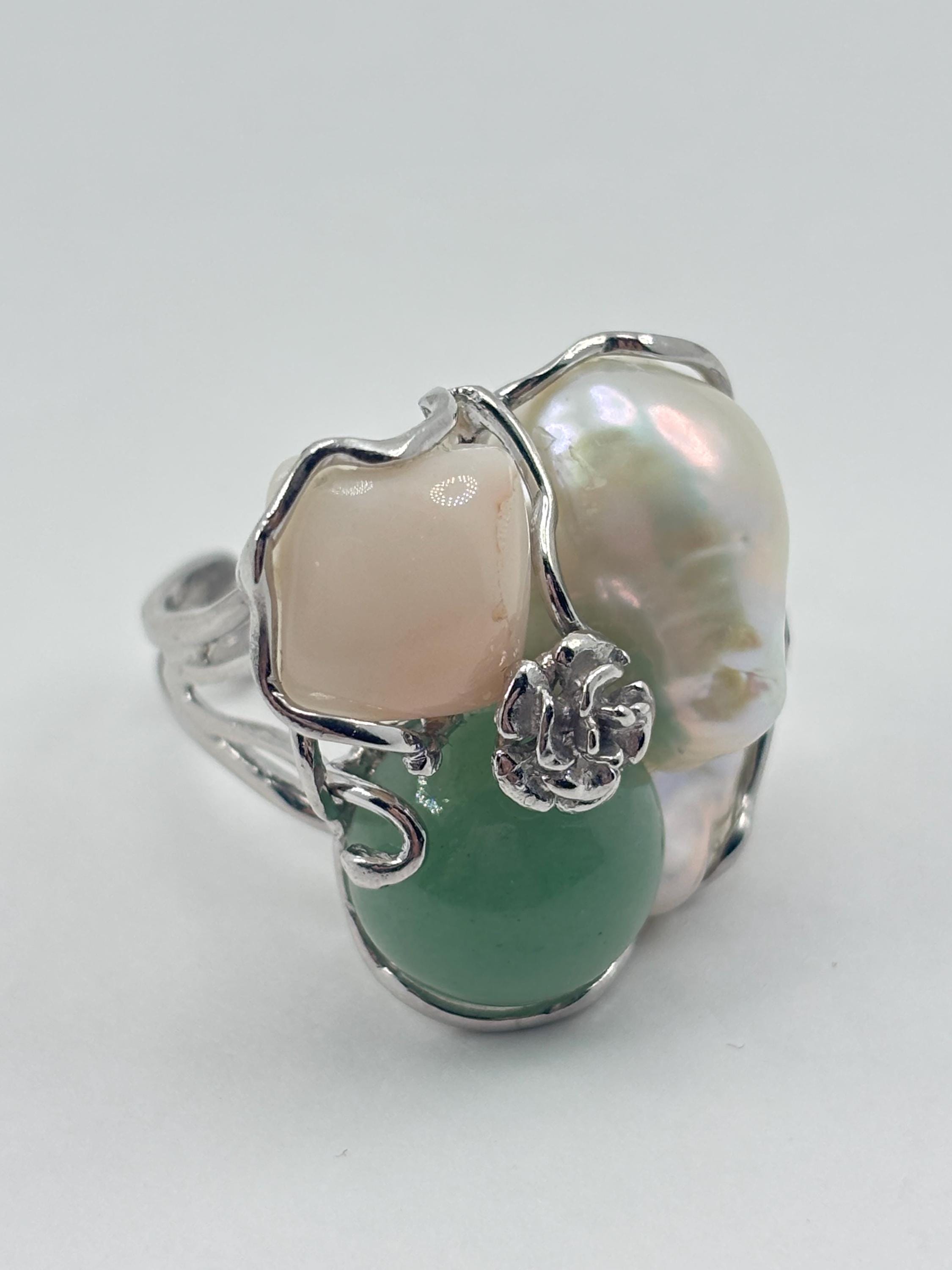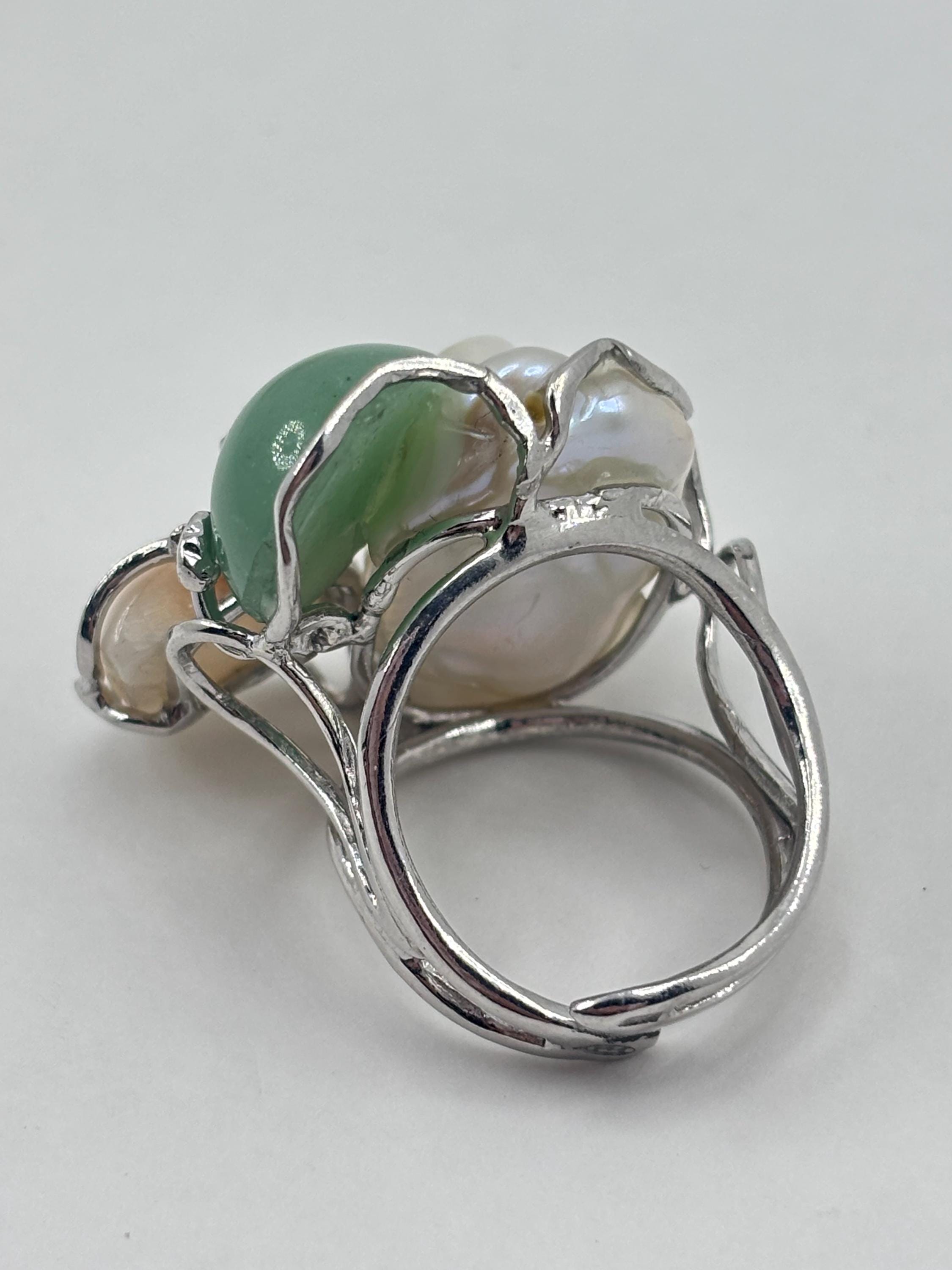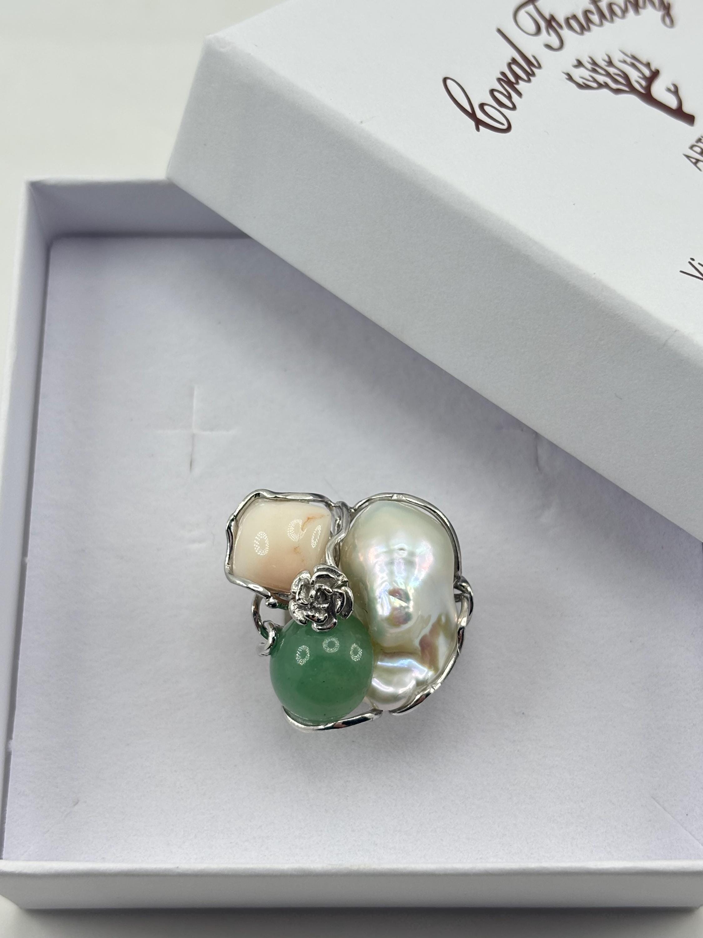 Multi-stone ring with a cultured freshwater baroque pearl, natural jade stone, and pink coral from Asian seas, set in 925 silver. An imposing and unique piece of jewelry, handcrafted and handcrafted by artisans from Torre del Greco.