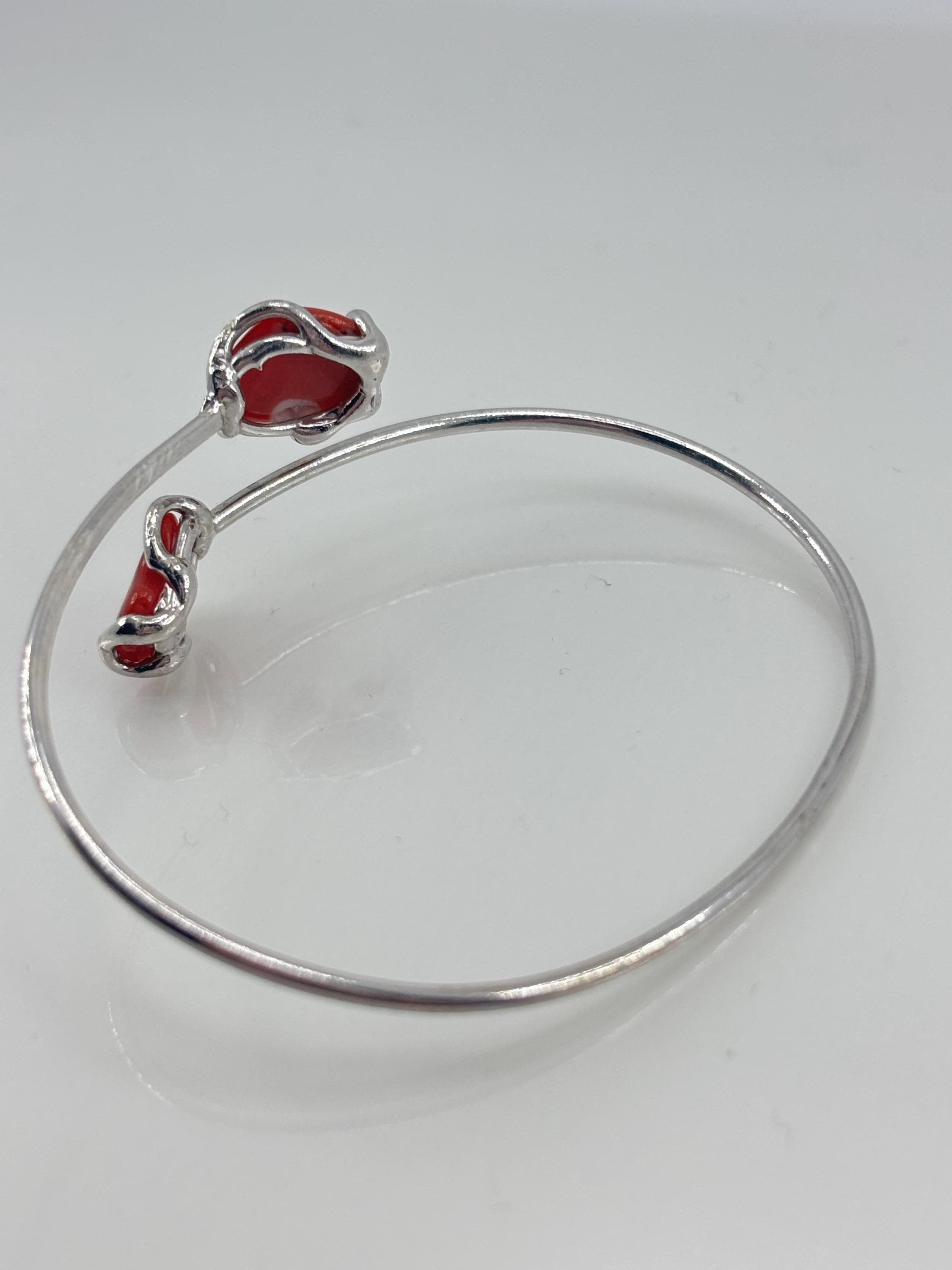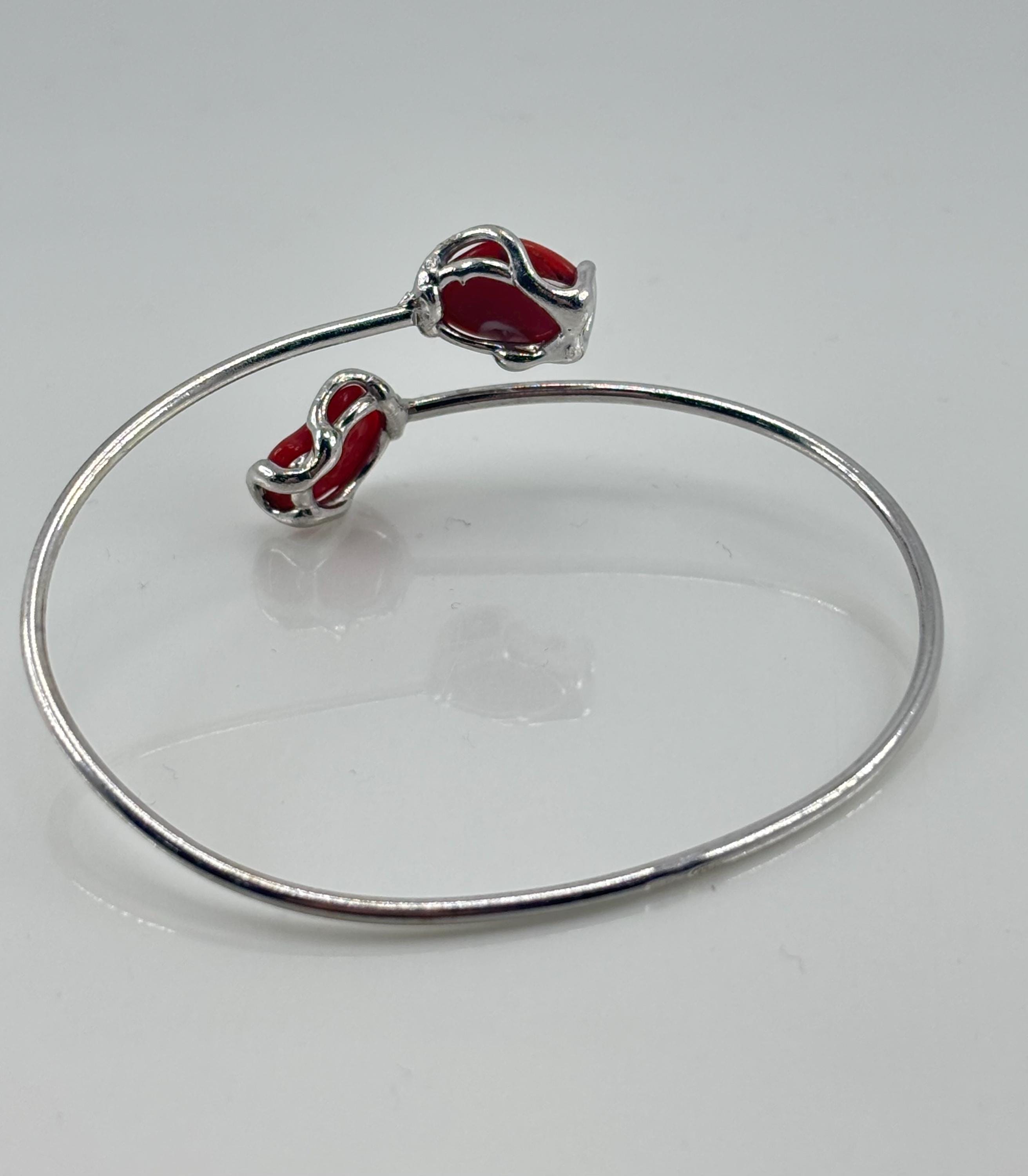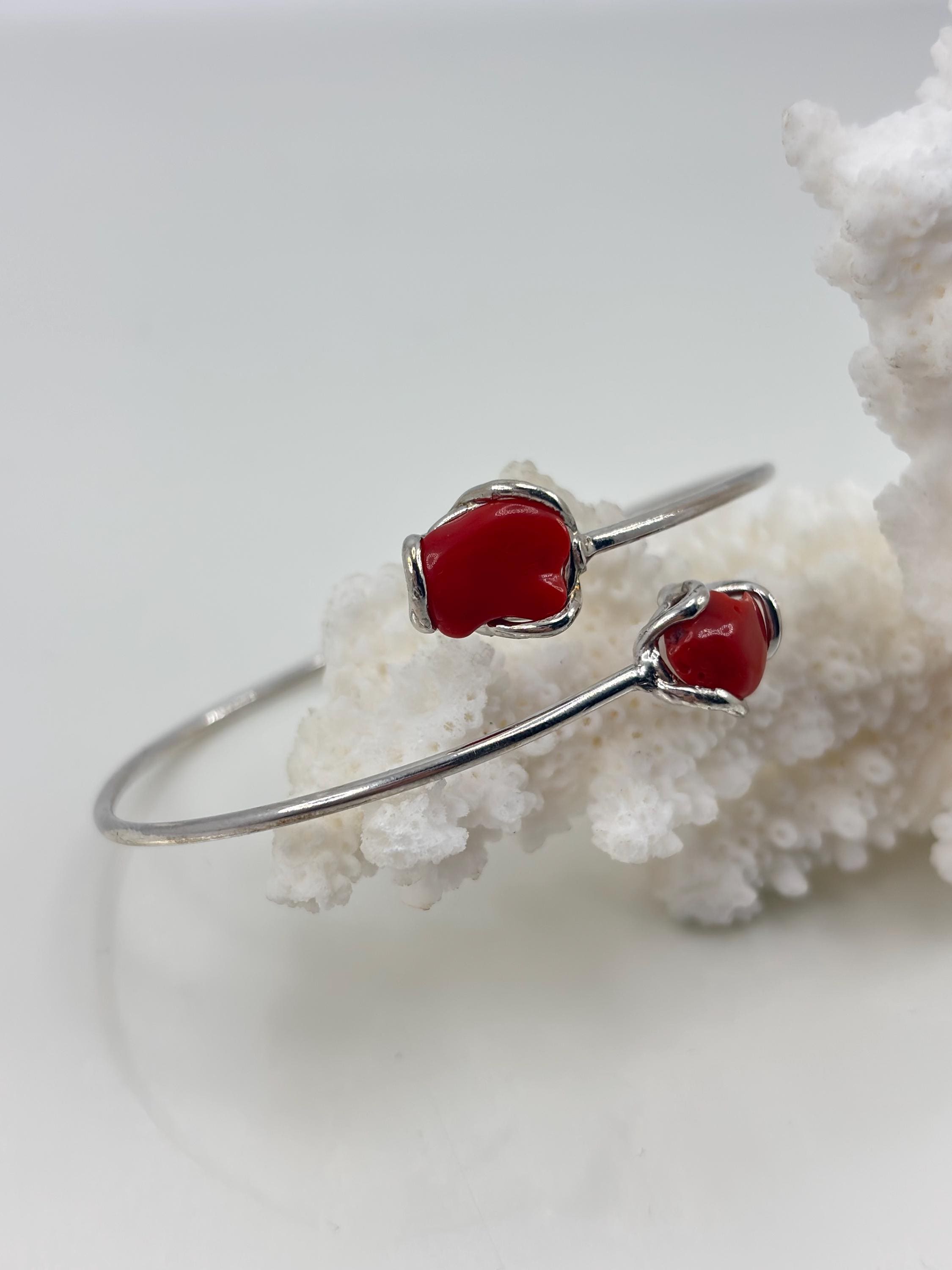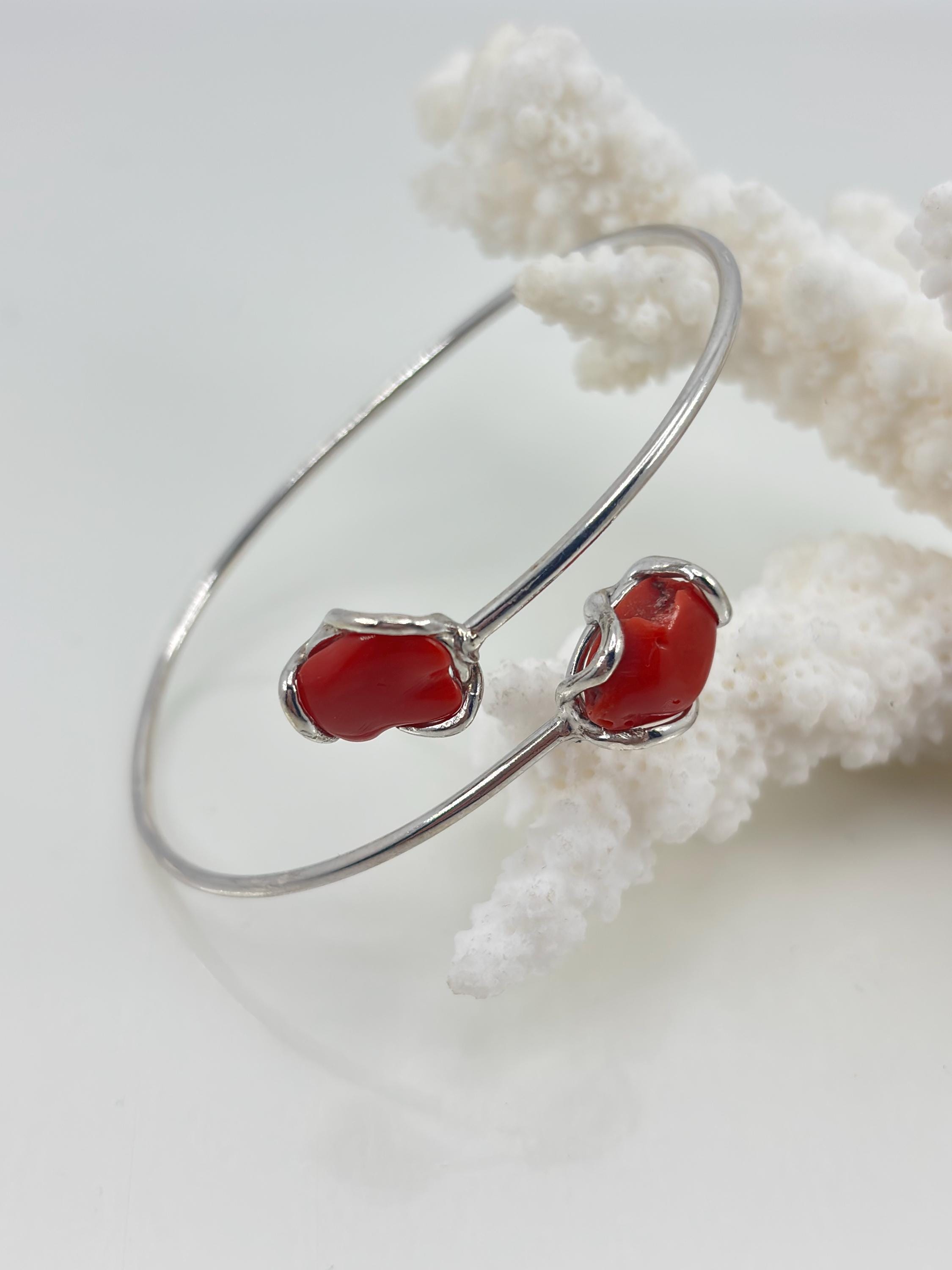 Adjustable rigid bracelet in red coral from the Mediterranean Sea with a 925 silver setting.