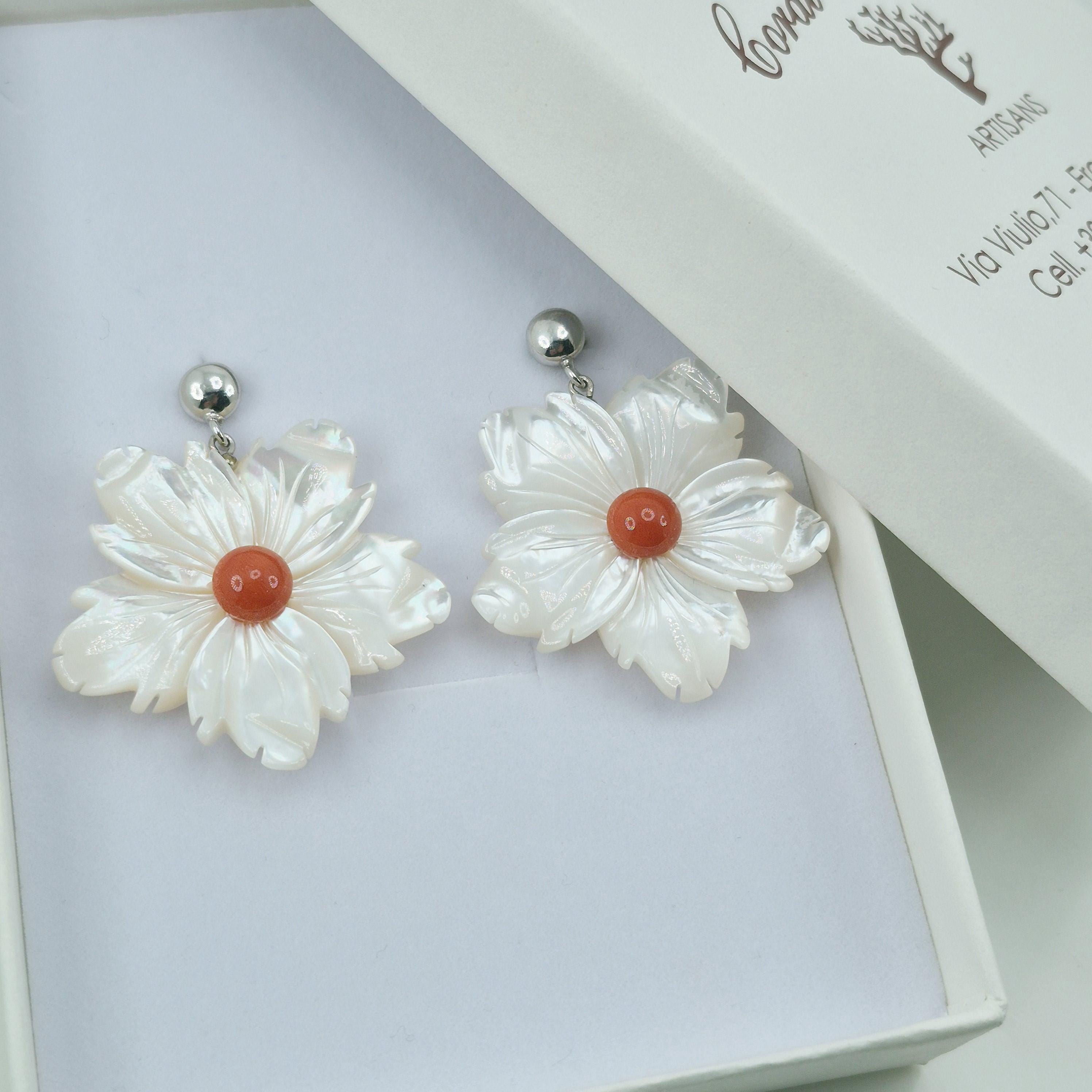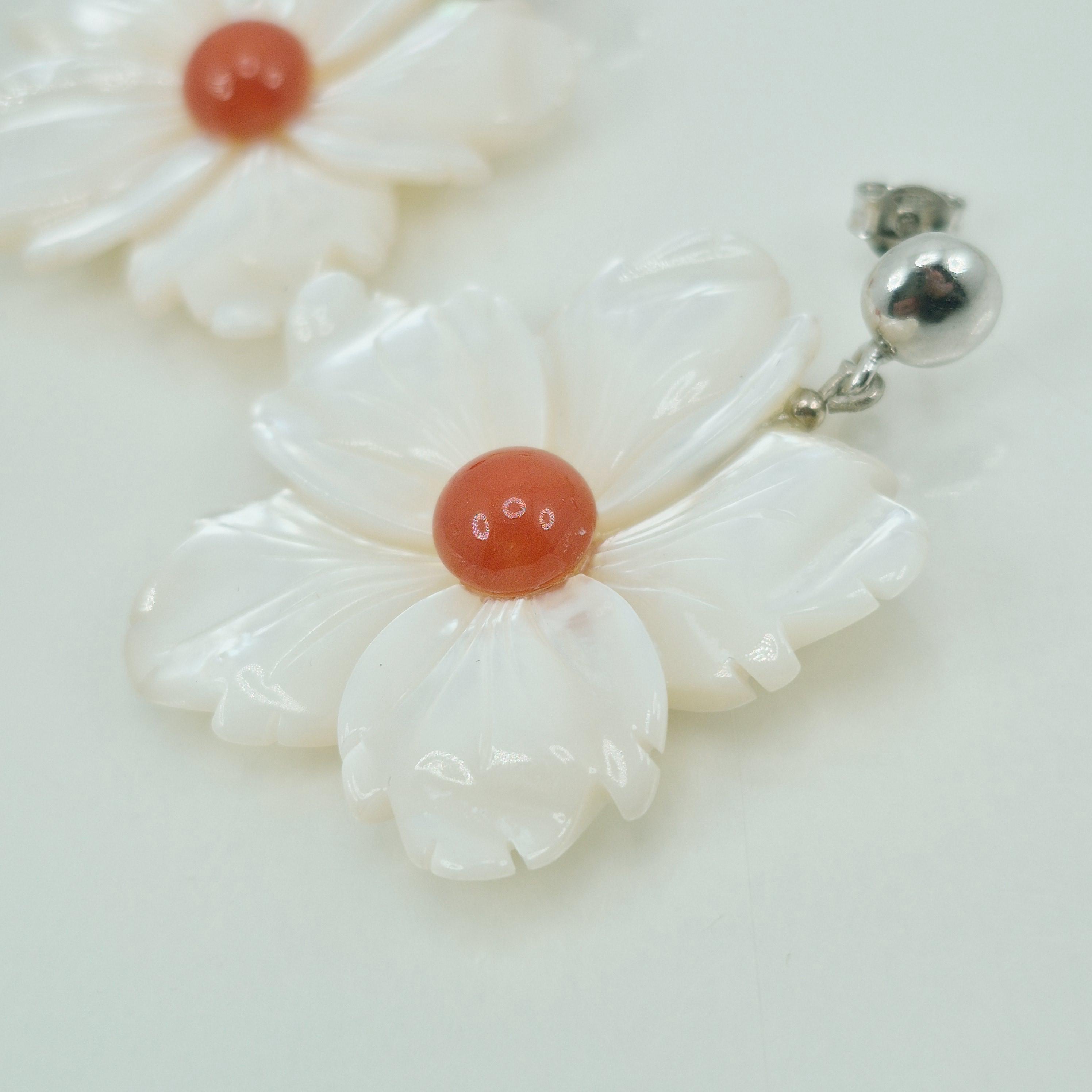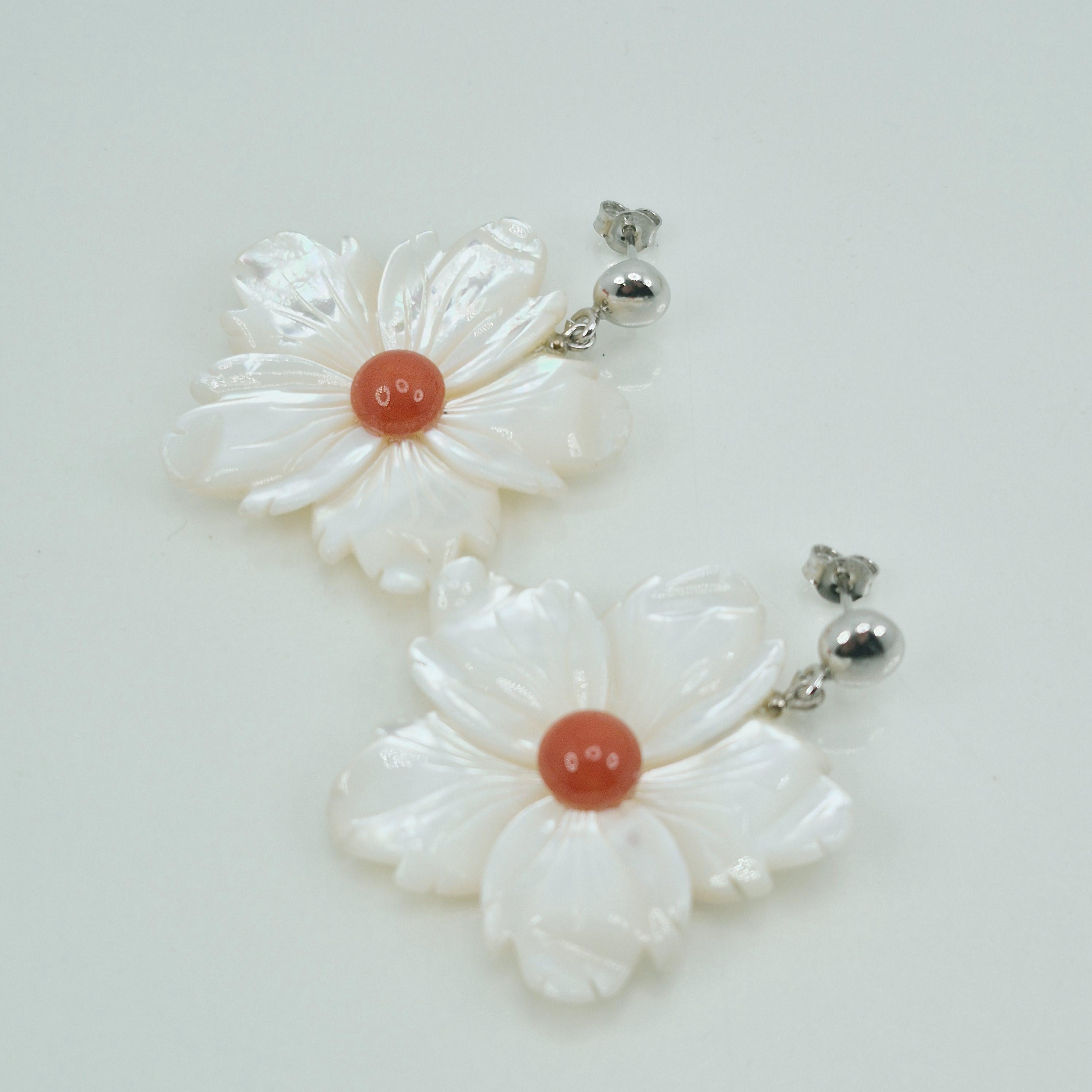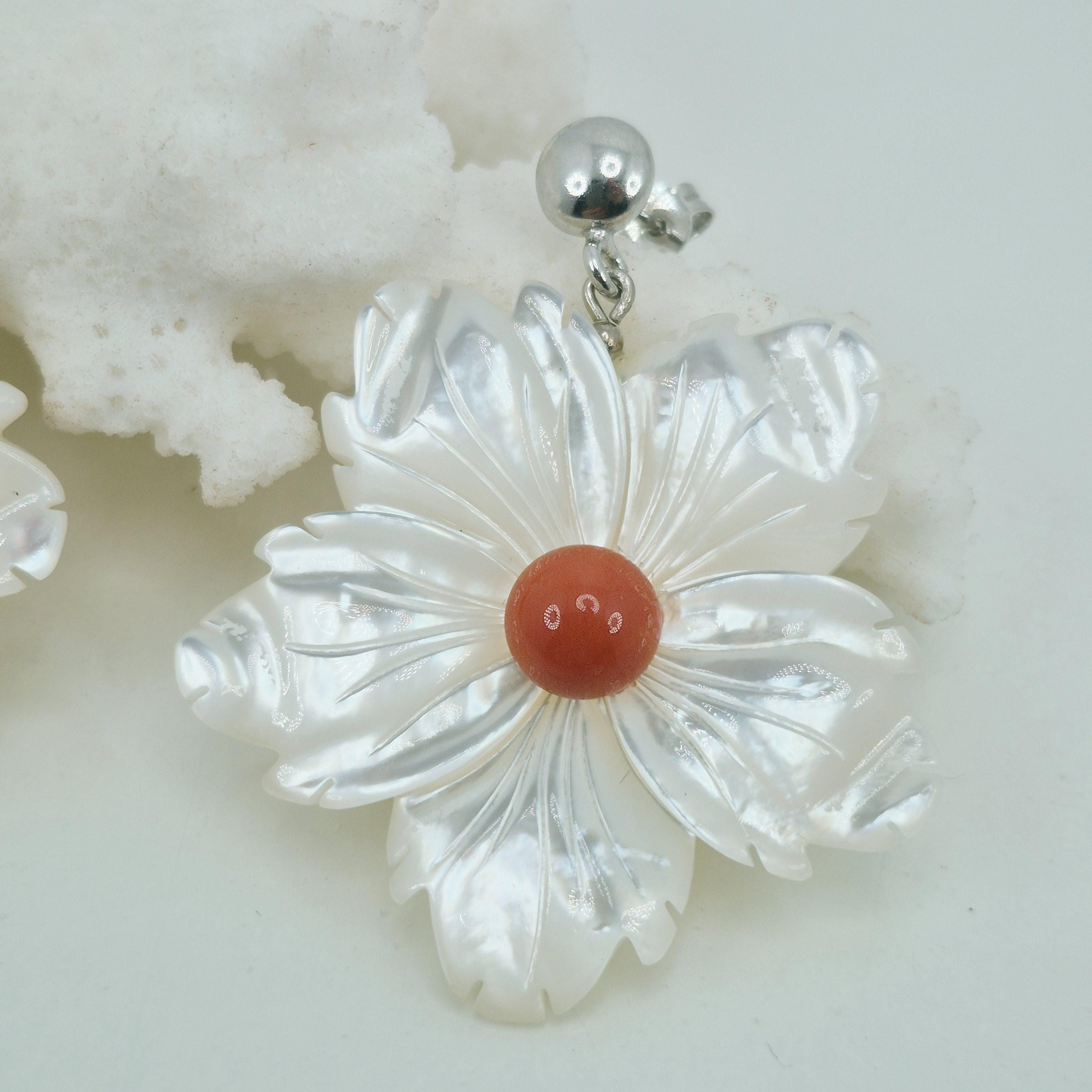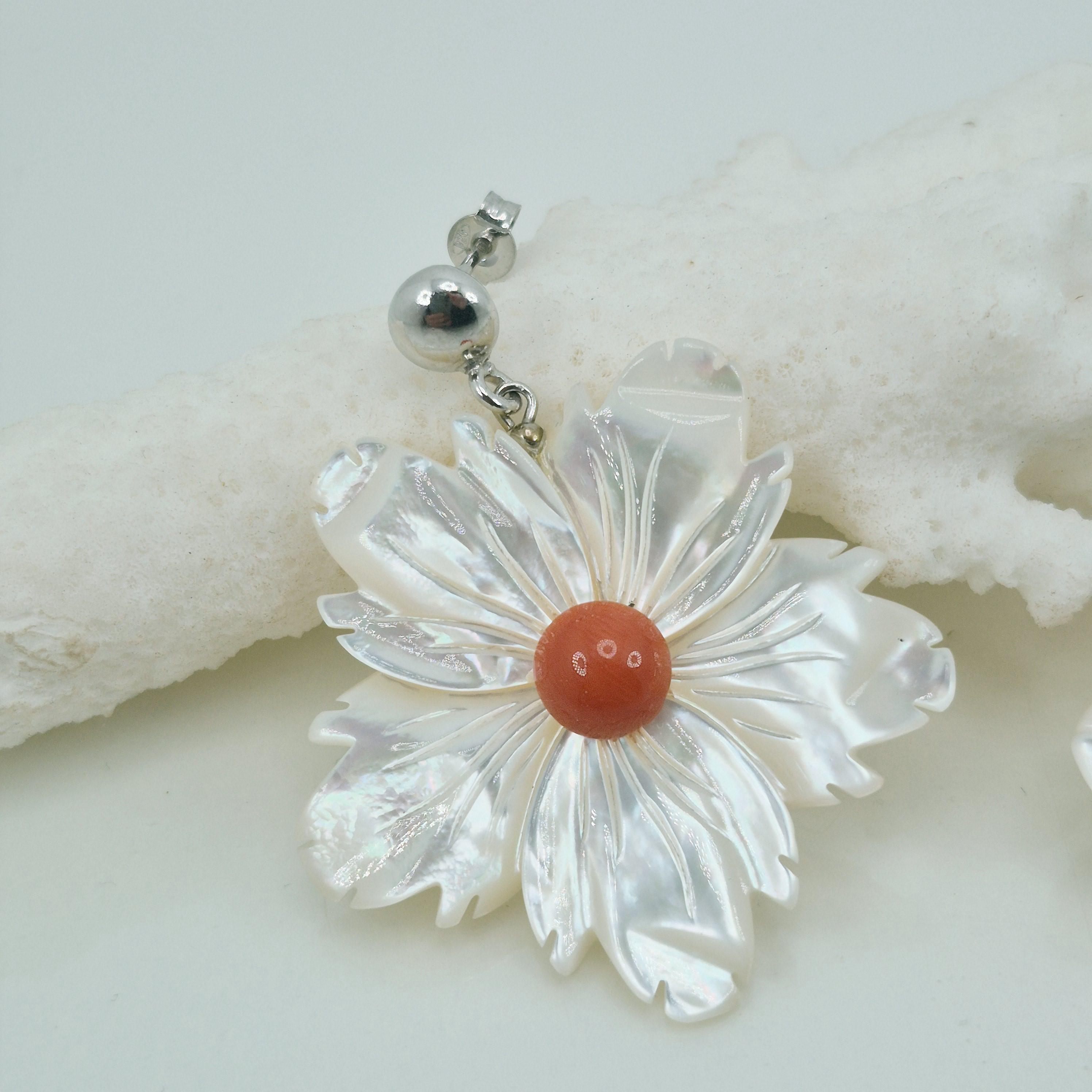Incantevoli orecchini con fiore in madreperla e bottone centrale in corallo Mediterraneo. Montato in argento 925 Realizzati e lavorati da artigiani di Torre del Greco.