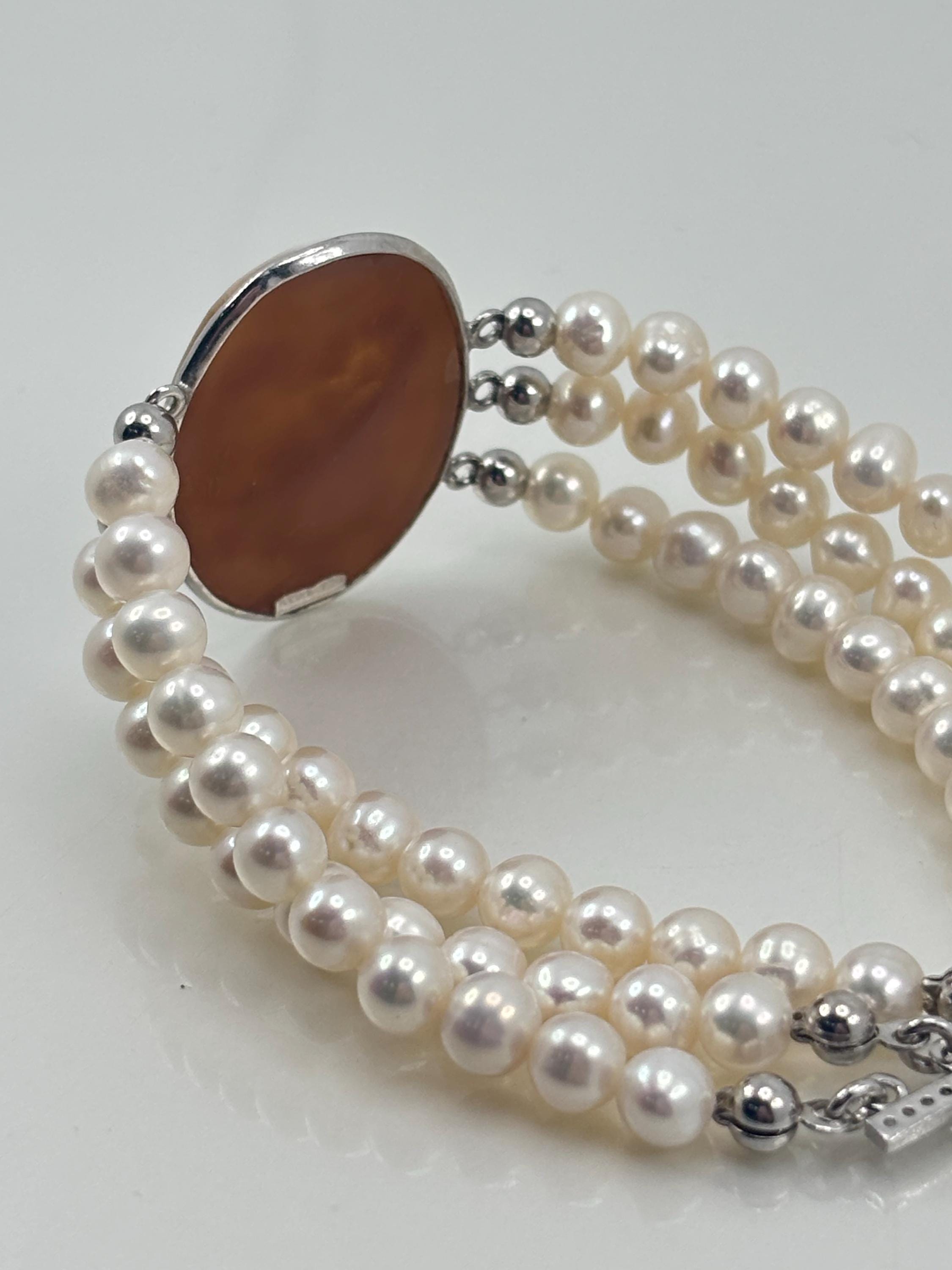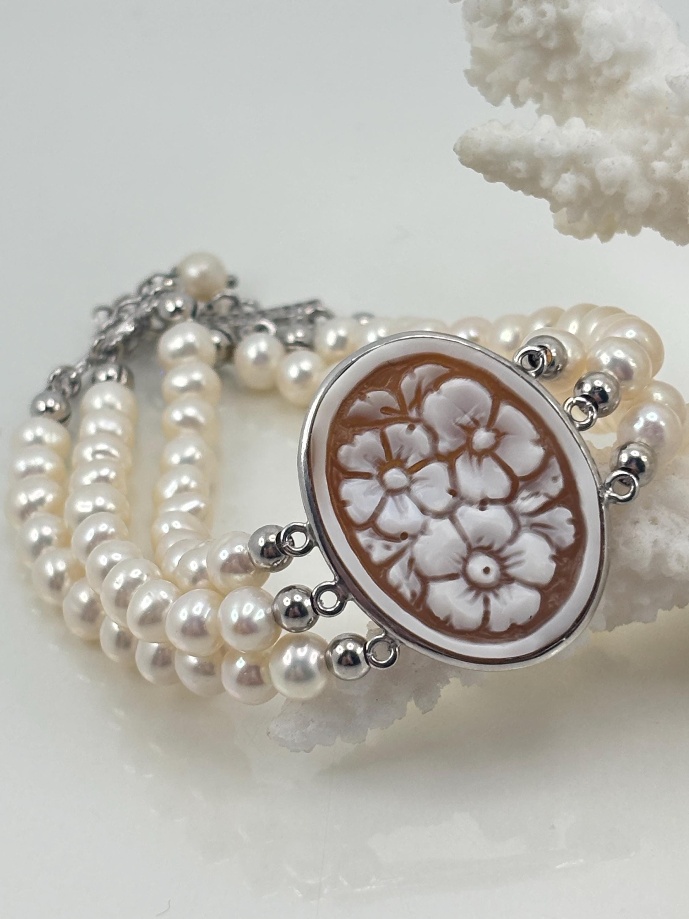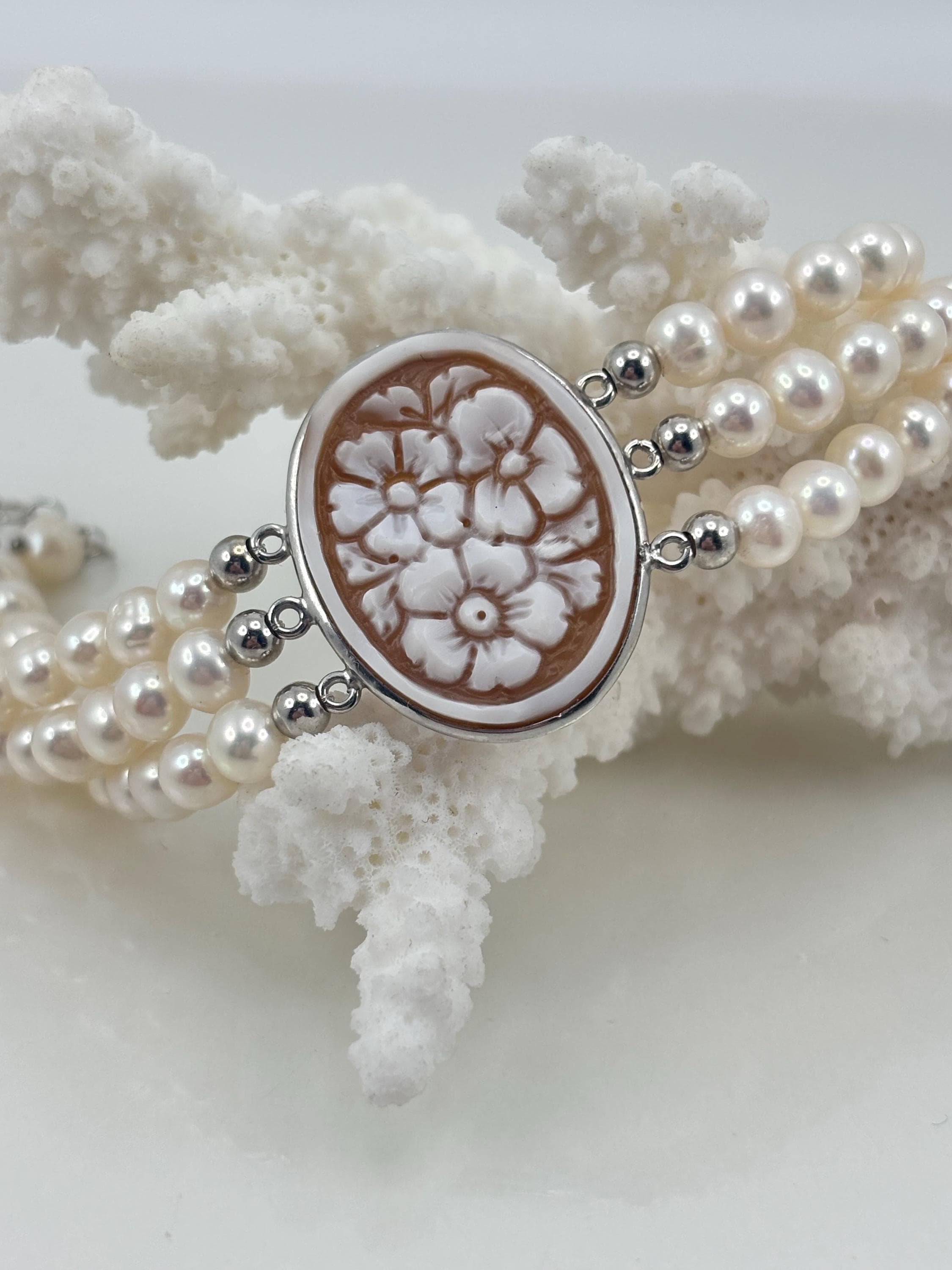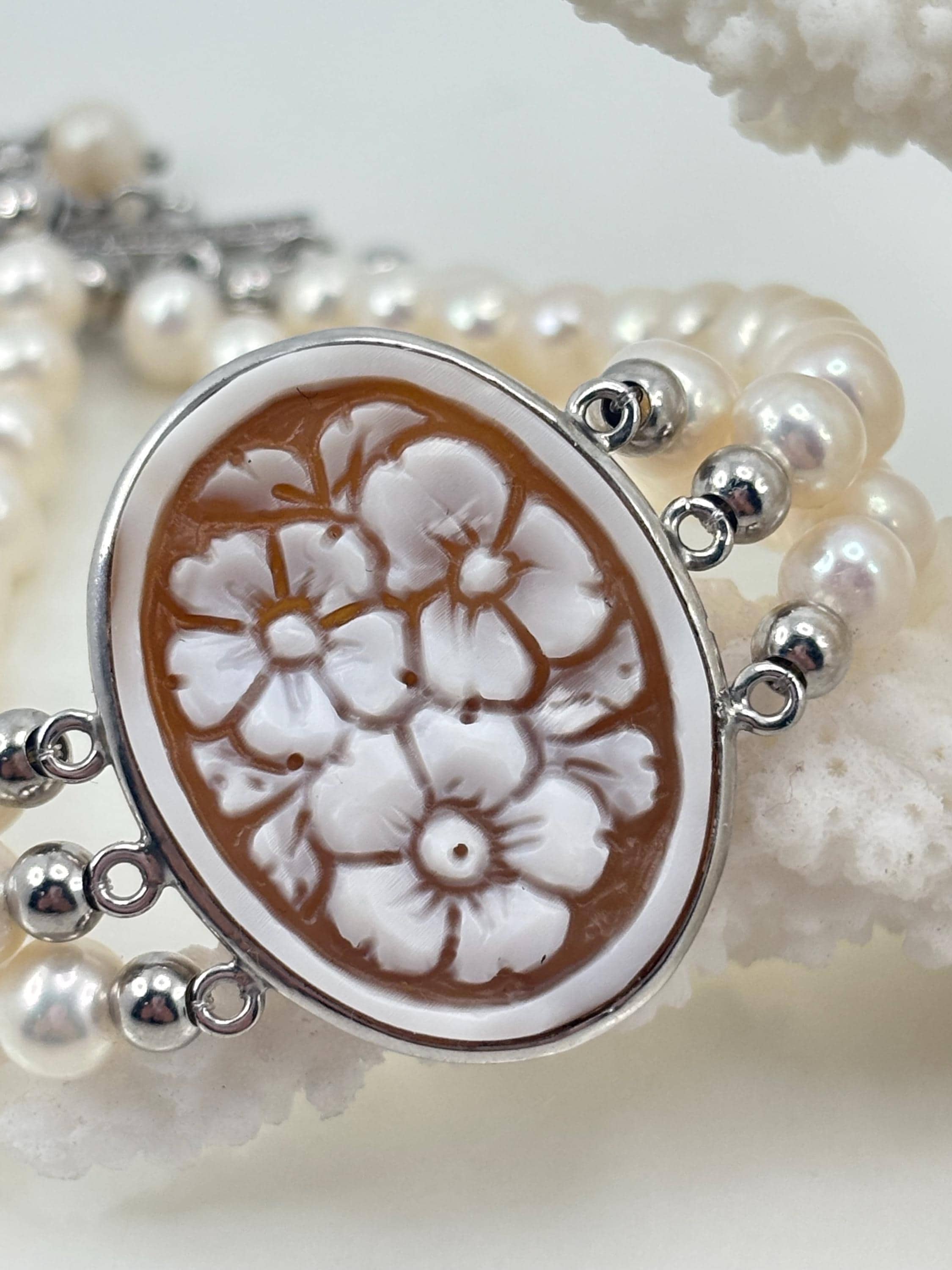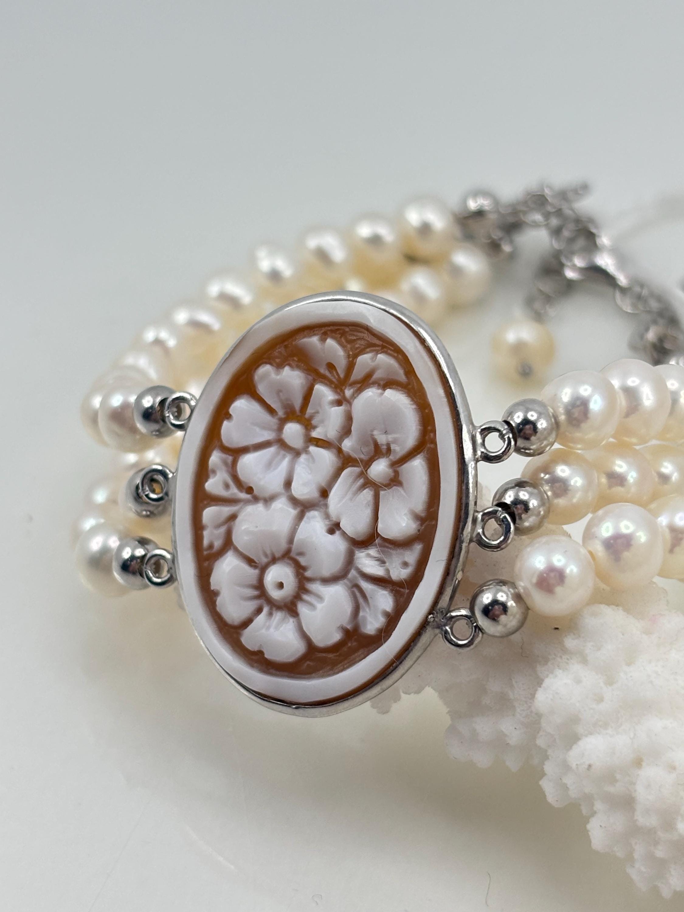 Bracelet in freshwater cultured pearls from Asia, floral cameo engraved on a Madagascan cassis shell and a 925 silver and zirconia setting, a jewel crafted and created by artisans from Torre del Greco, with attention to the smallest details, which gives shine and elegance.