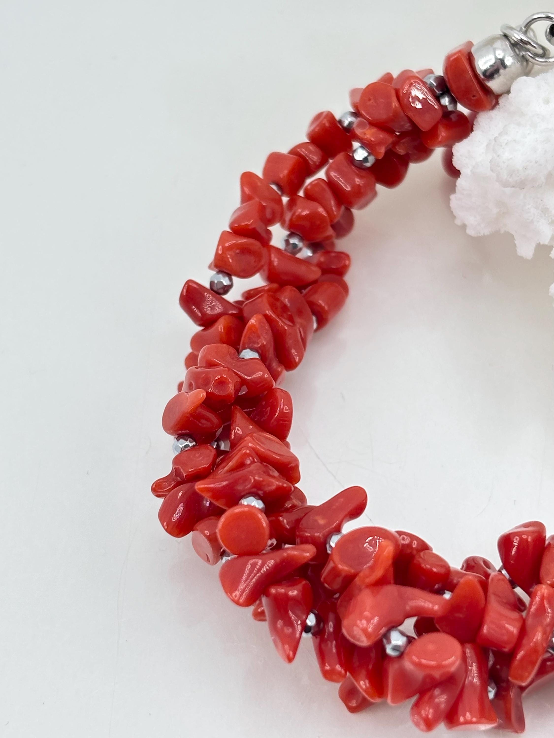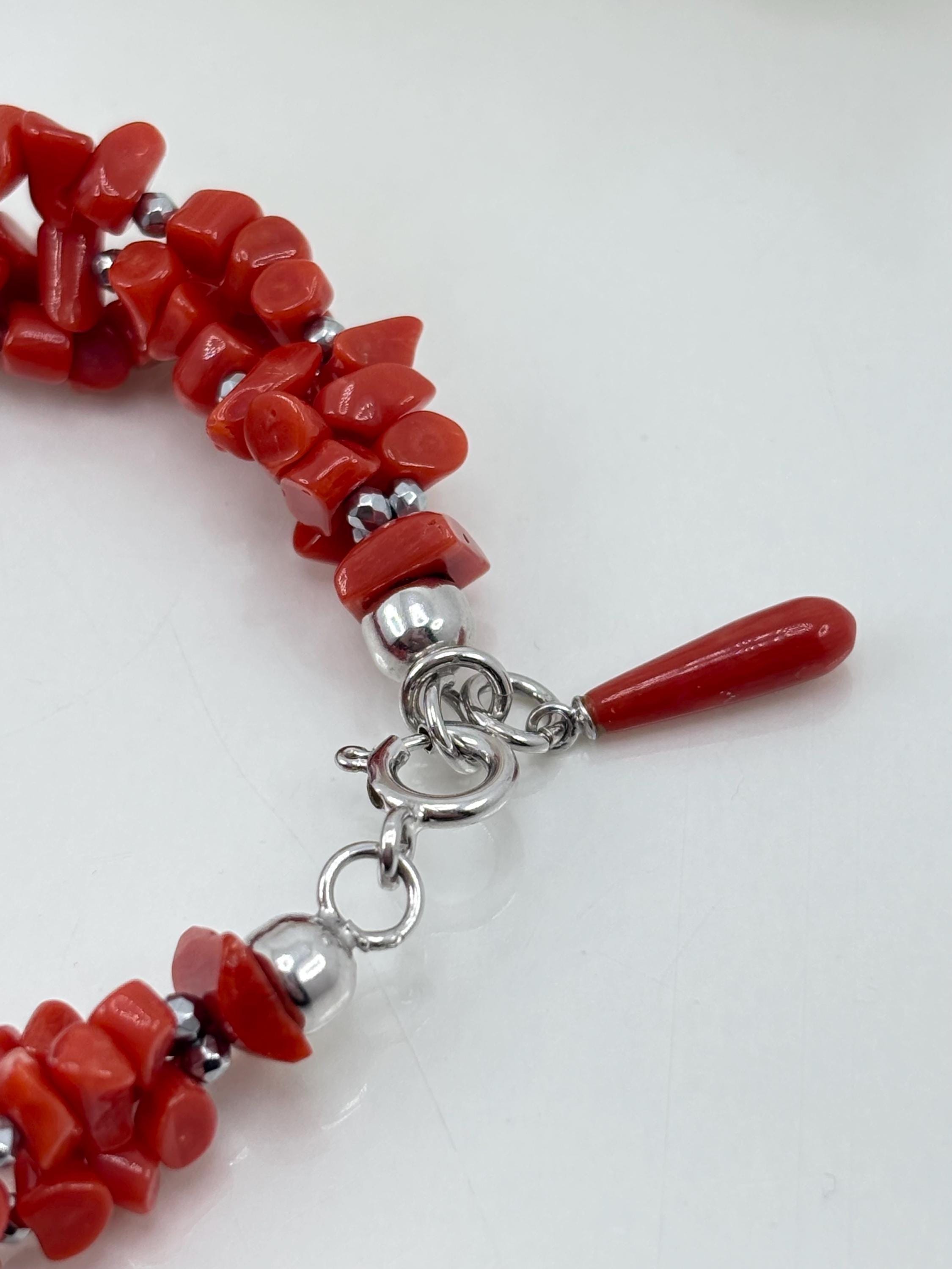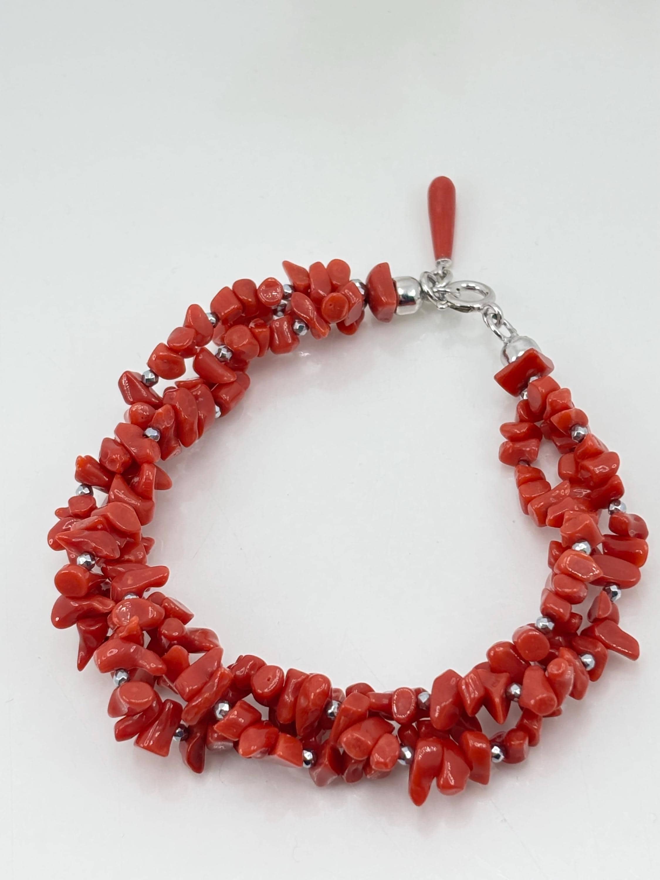 Three-strand bracelet in red coral from the Mediterranean Sea in the shape of flakes and faceted spheres in gray hematite that give the jewel brightness, 925 silver clasp. Crafted and made by artisans from Torre del Greco.