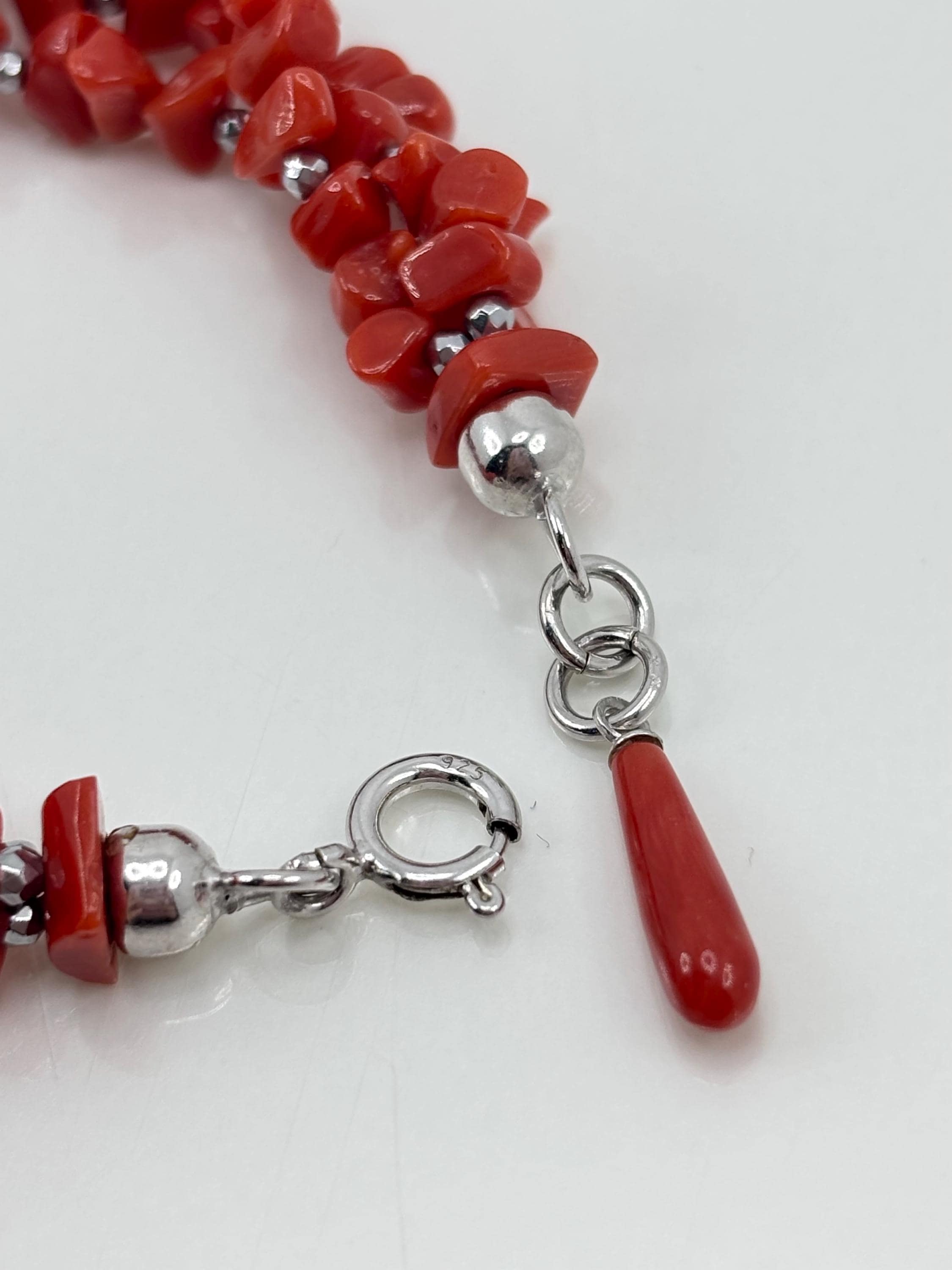 3-strand bracelet in red CORAL from the Mediterranean Sea and grey hematite spheres with 925 SILVER clasp