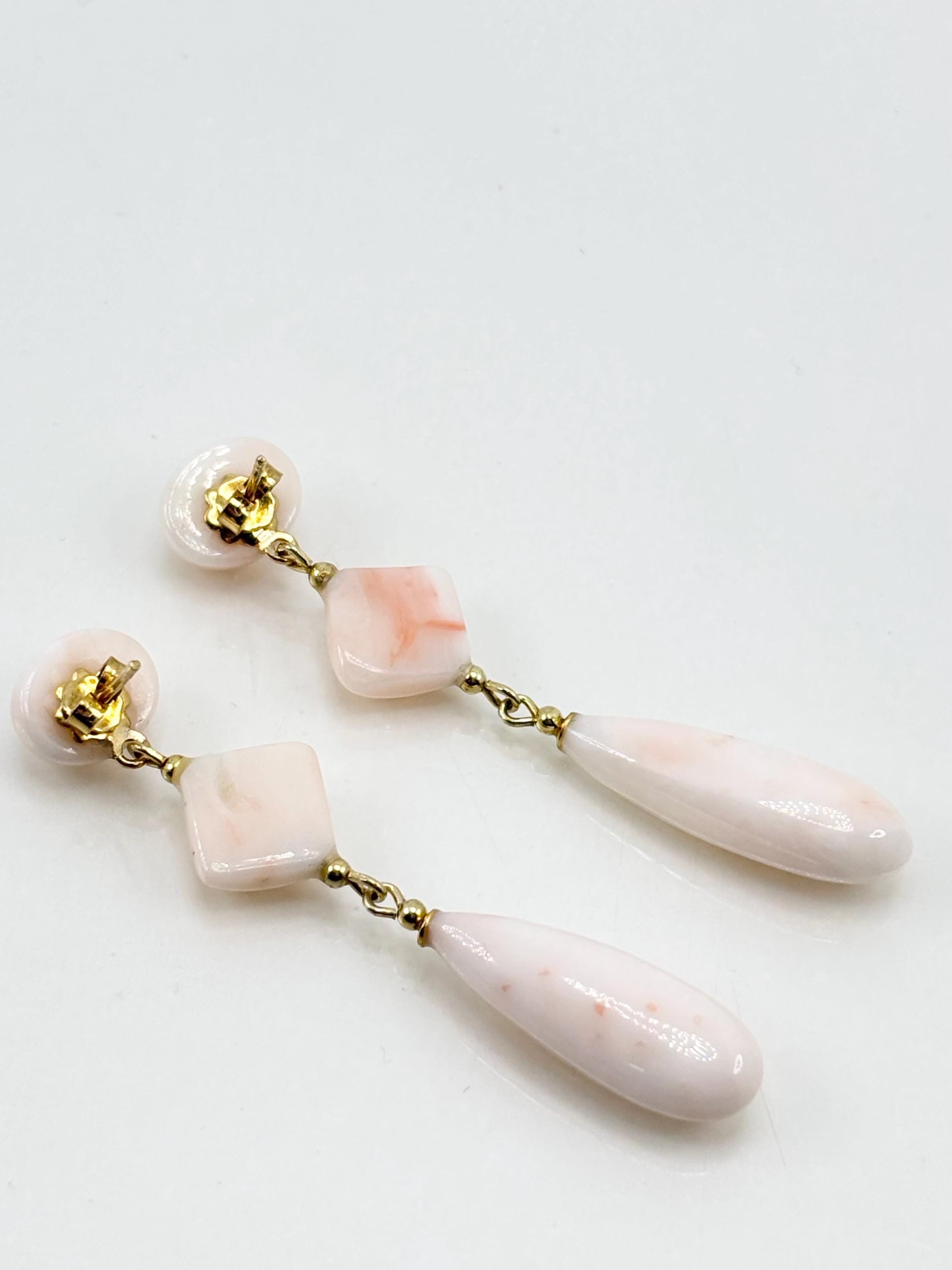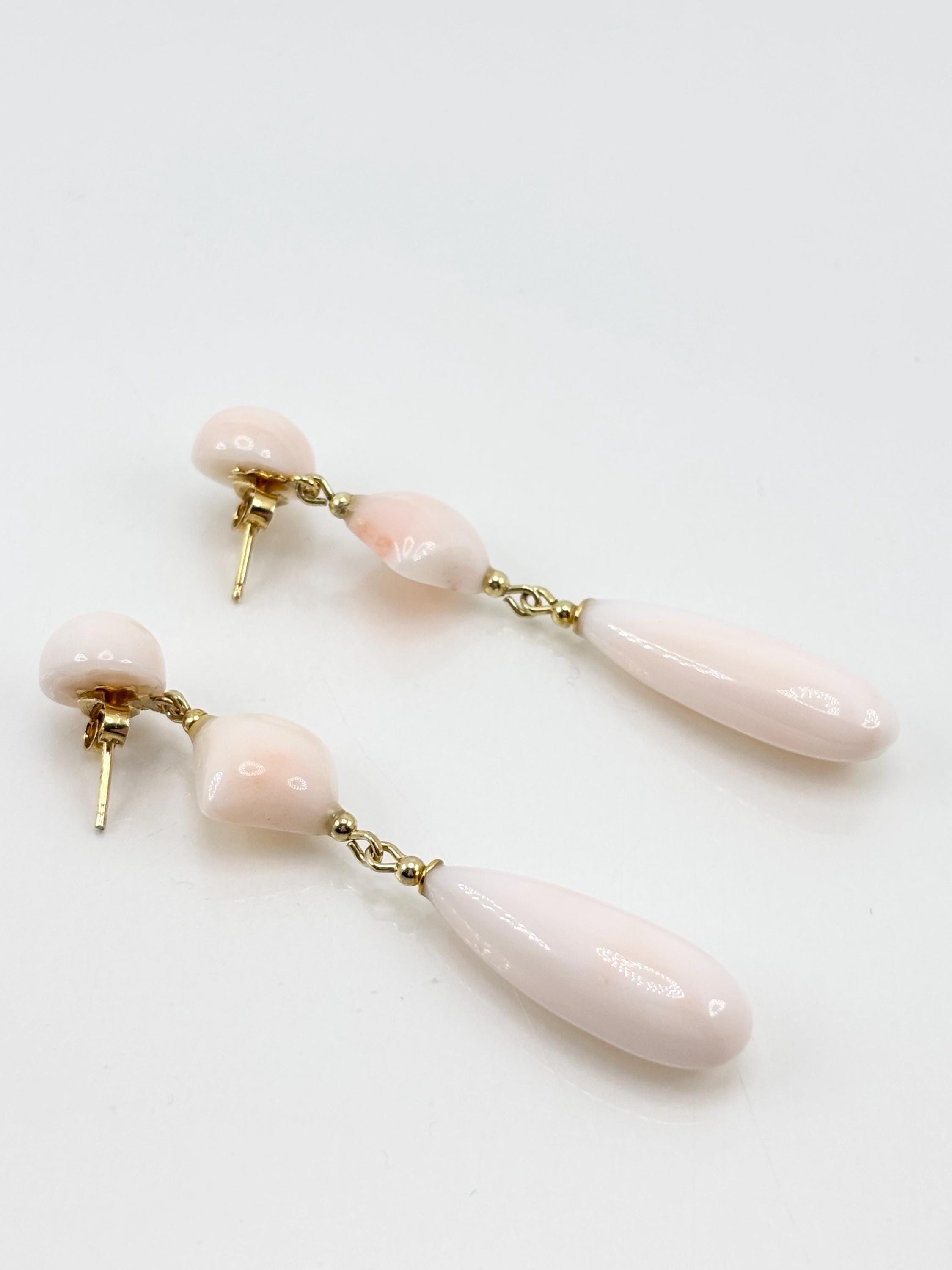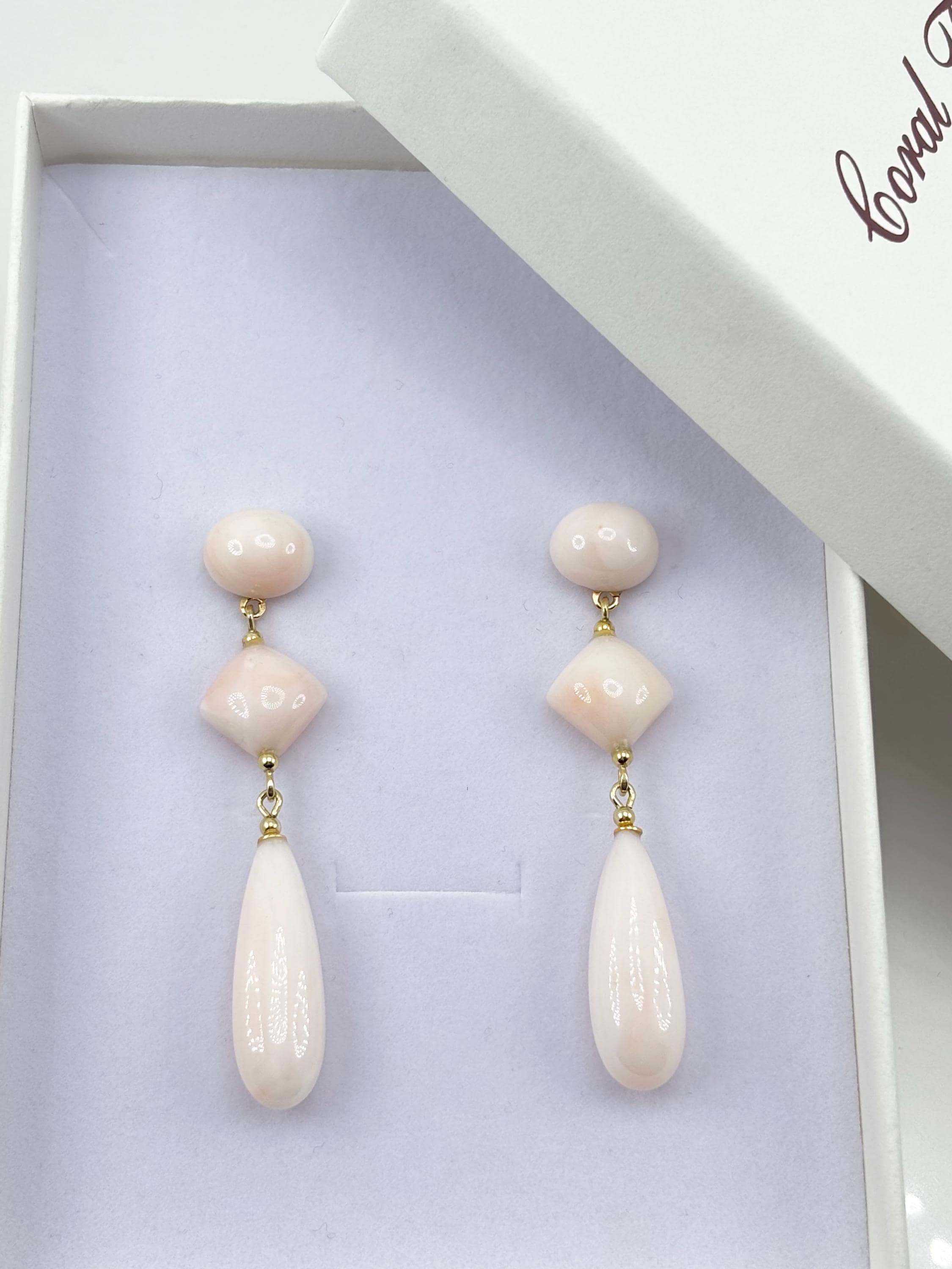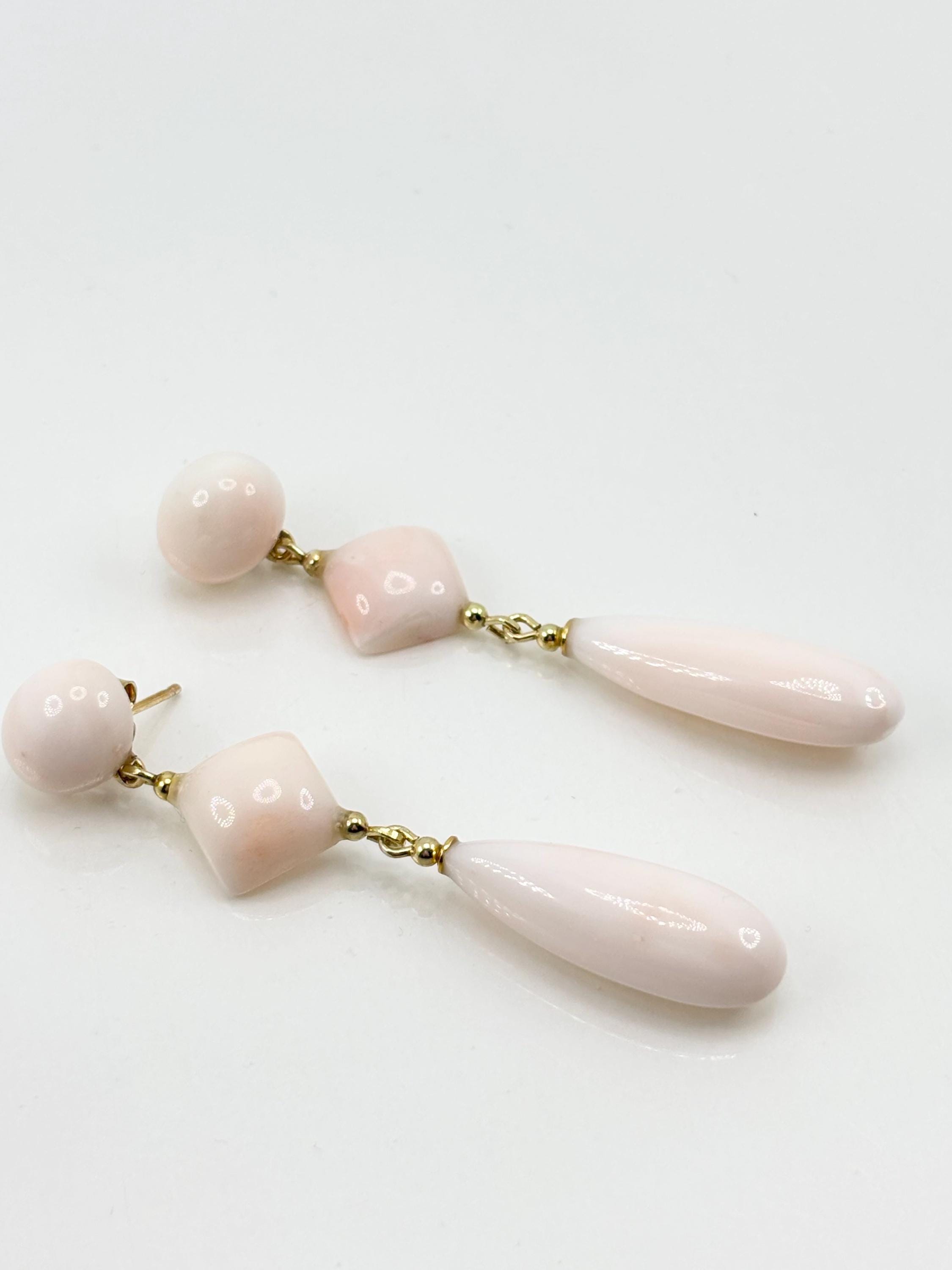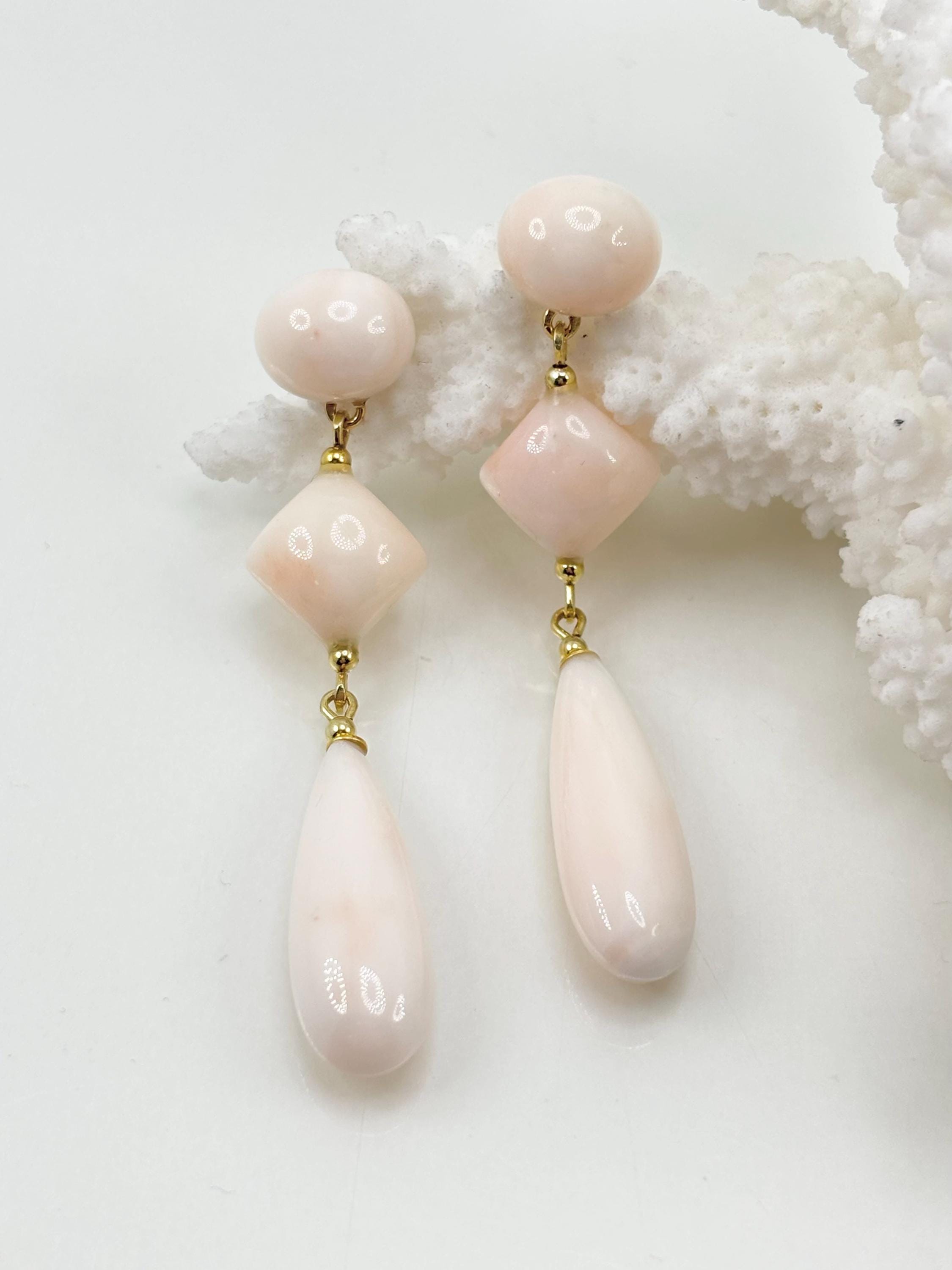Dangling stud earrings in pink coral, an elegant and ethereal color typical of coral harvested in the Pacific Ocean, versatile and natural. Set in gold-plated 925 silver. Crafted and handcrafted by artisans in Torre del Greco.