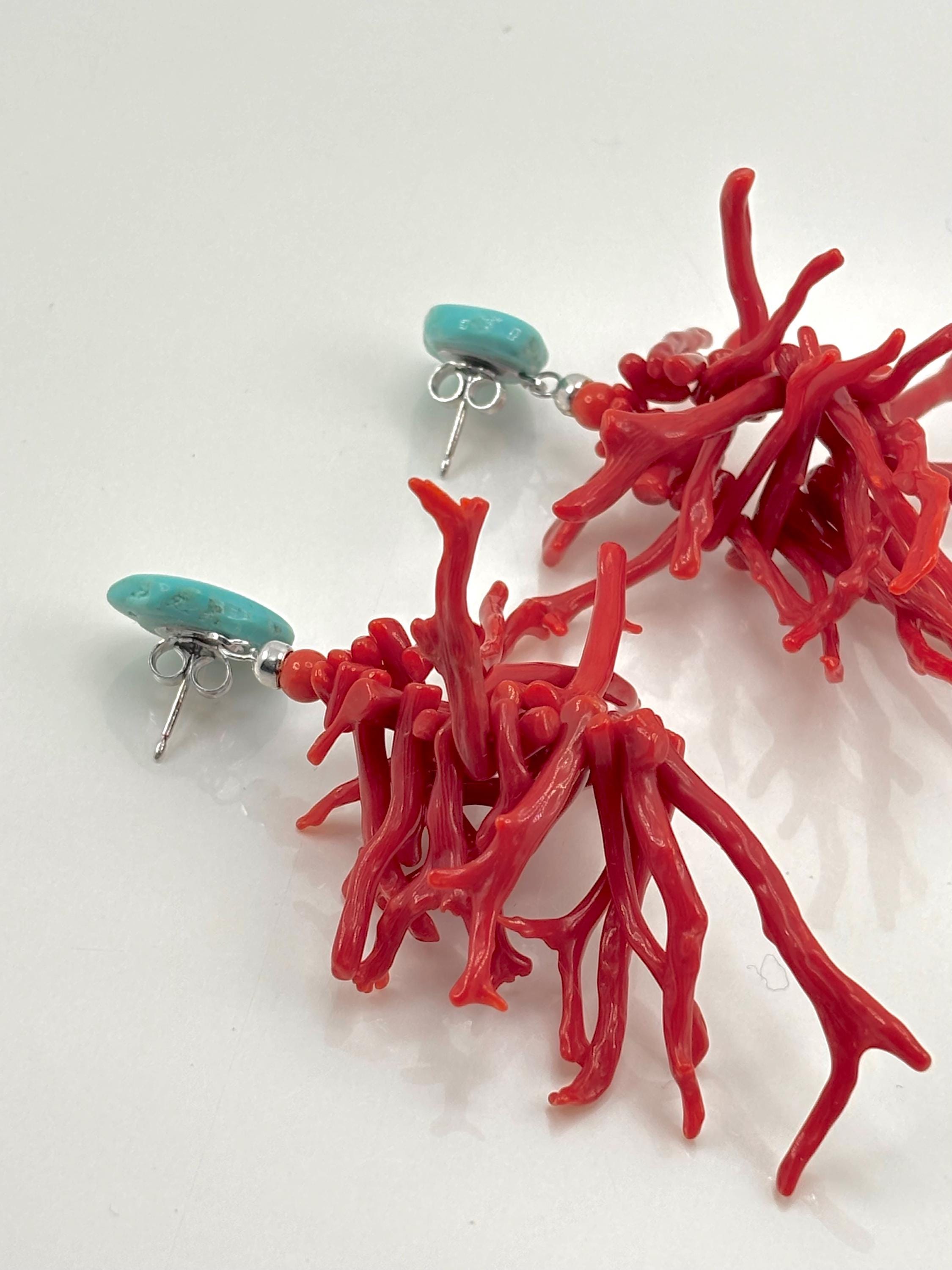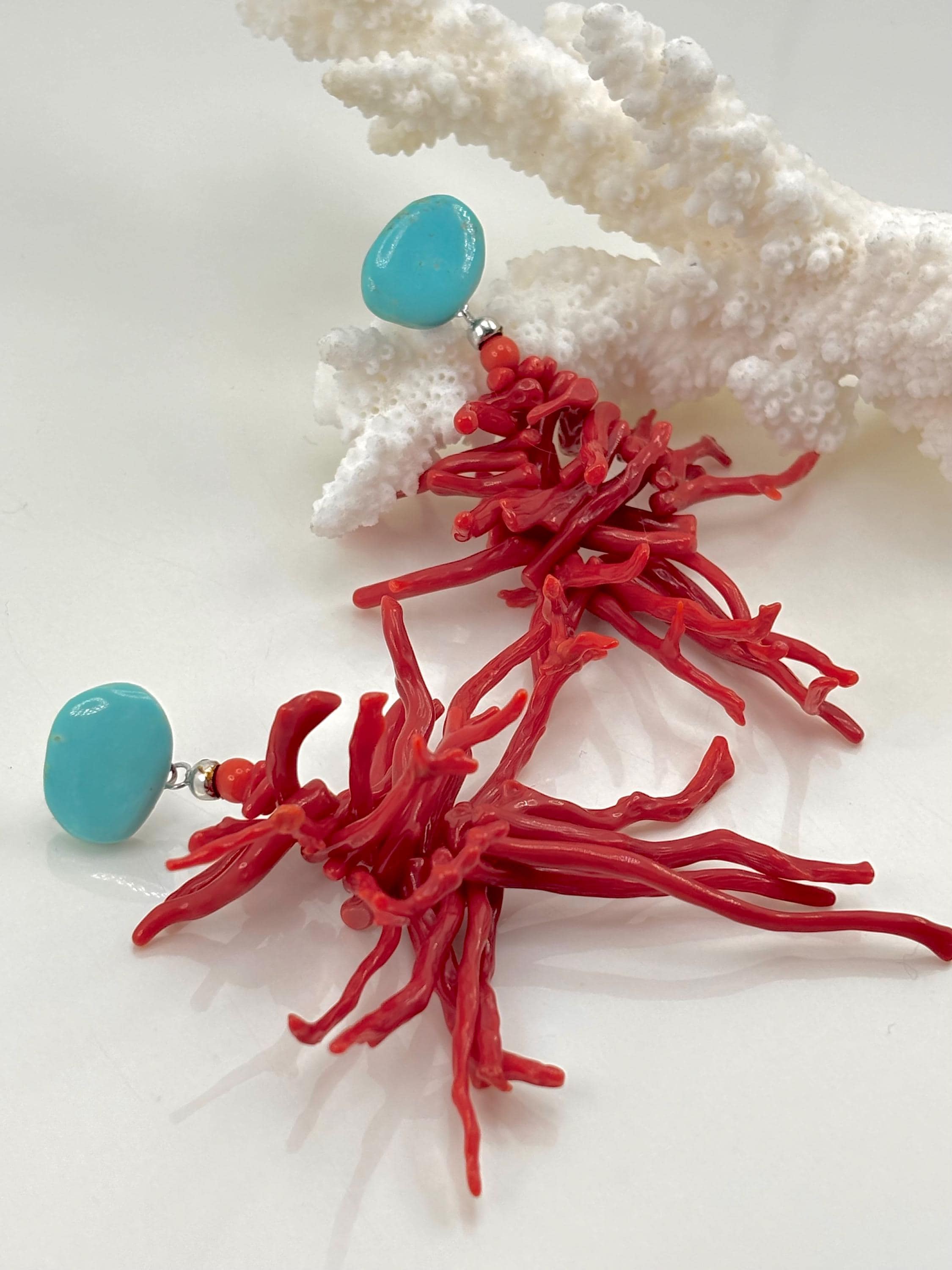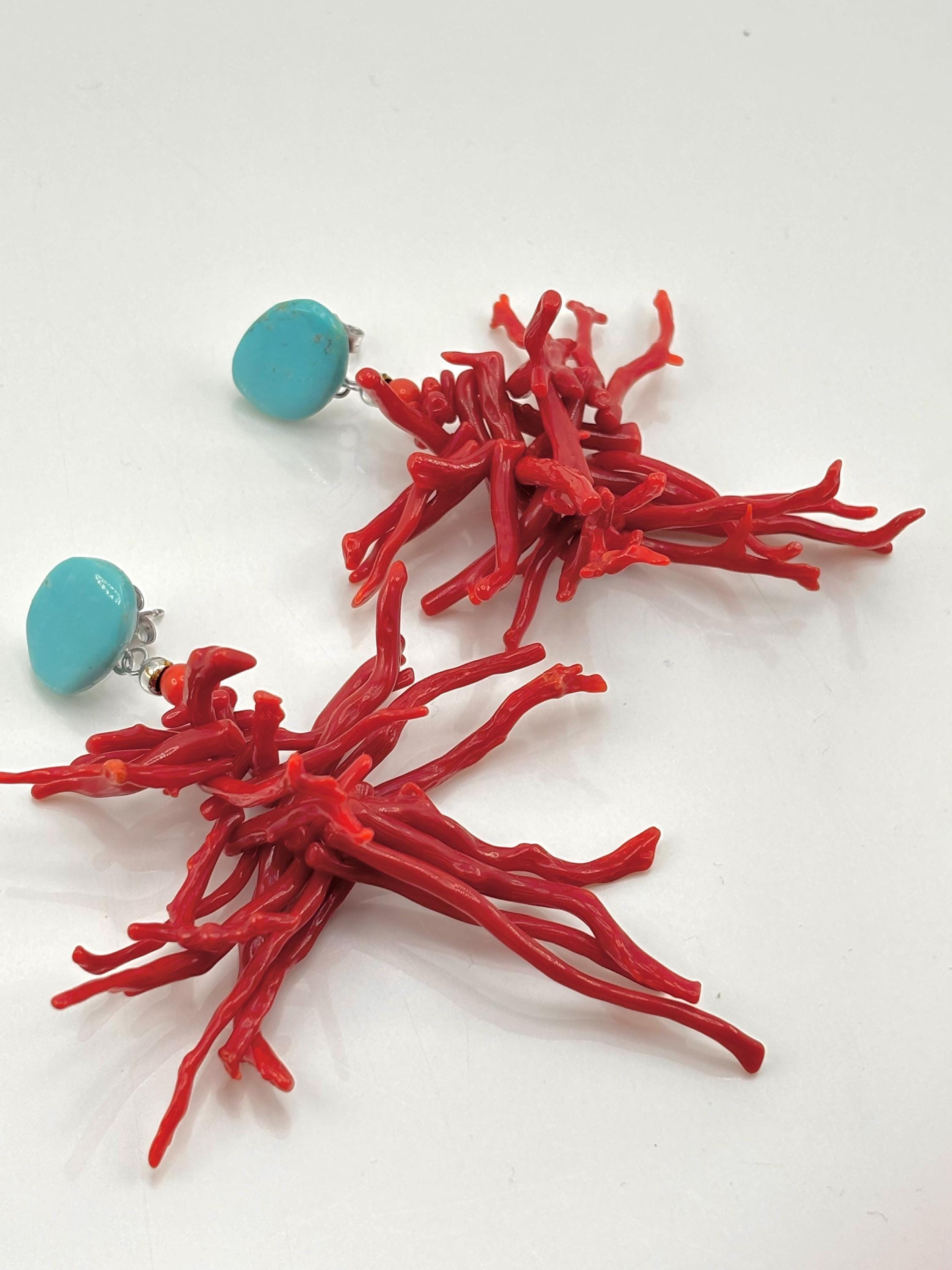Stud earrings with natural red coral branches from the Mediterranean Sea and natural Turquoise shape, a mineral from the mines of Arizona (USA), set in 925 silver. Made and crafted by artisans from Torre del Greco.