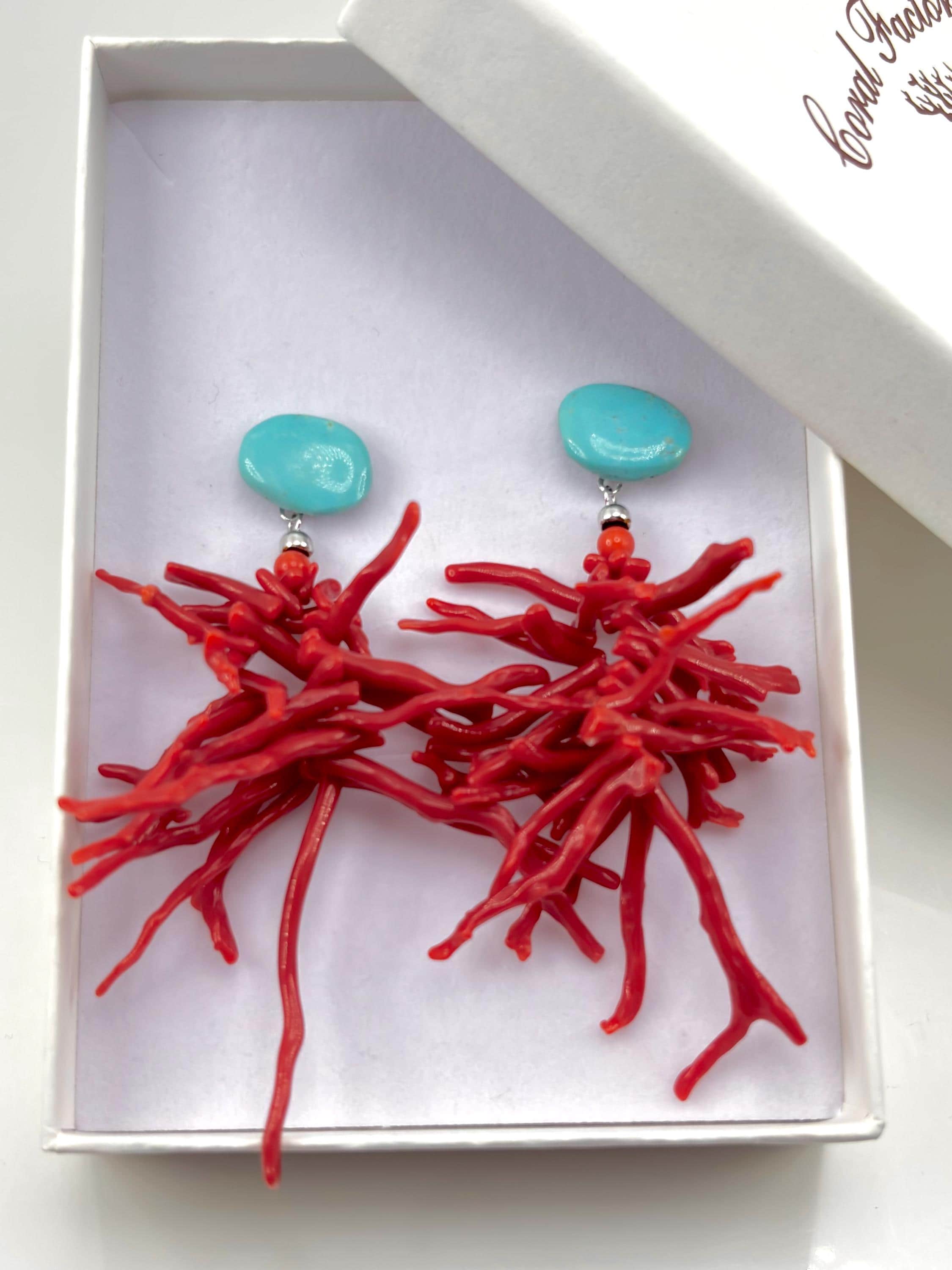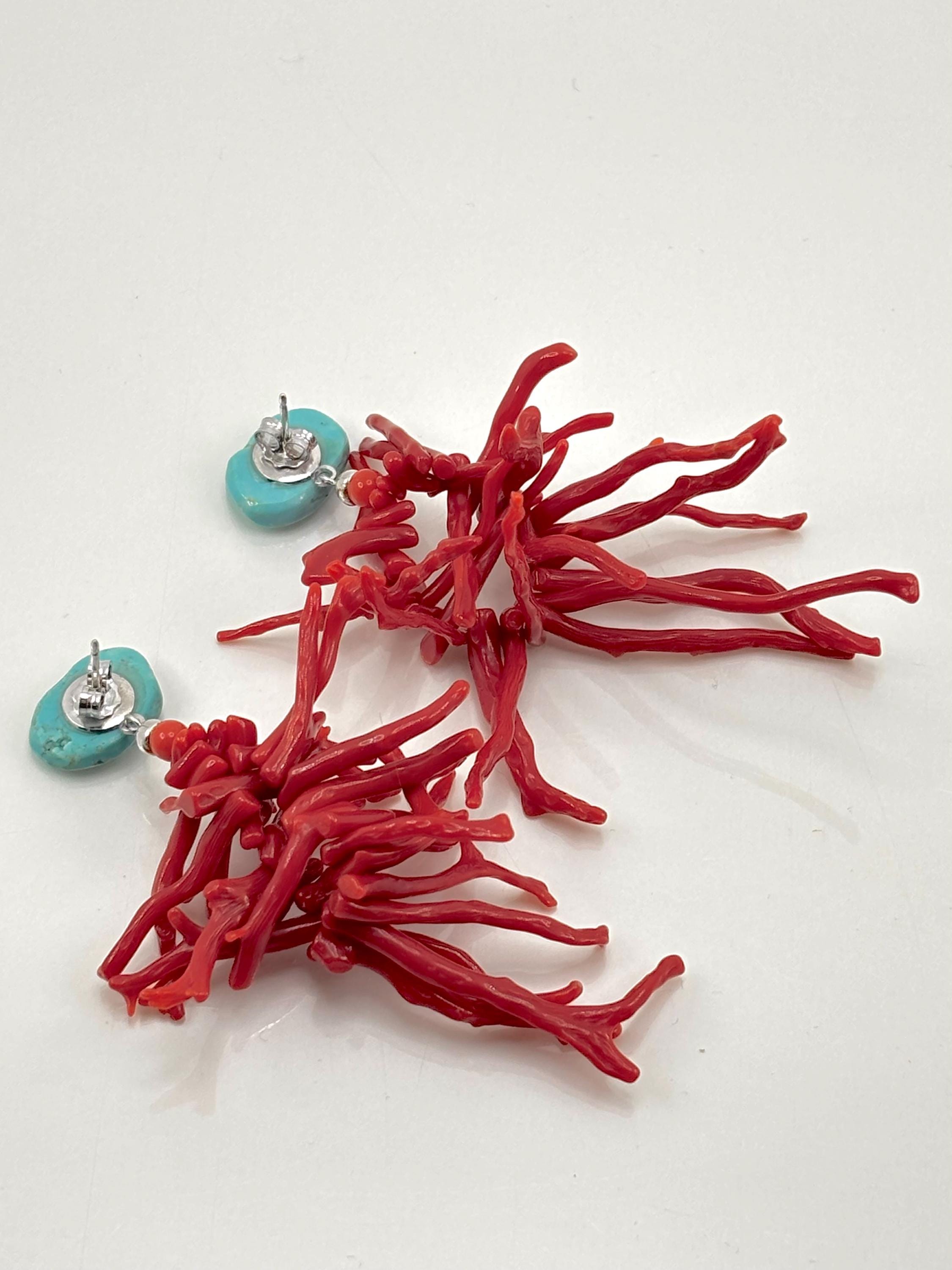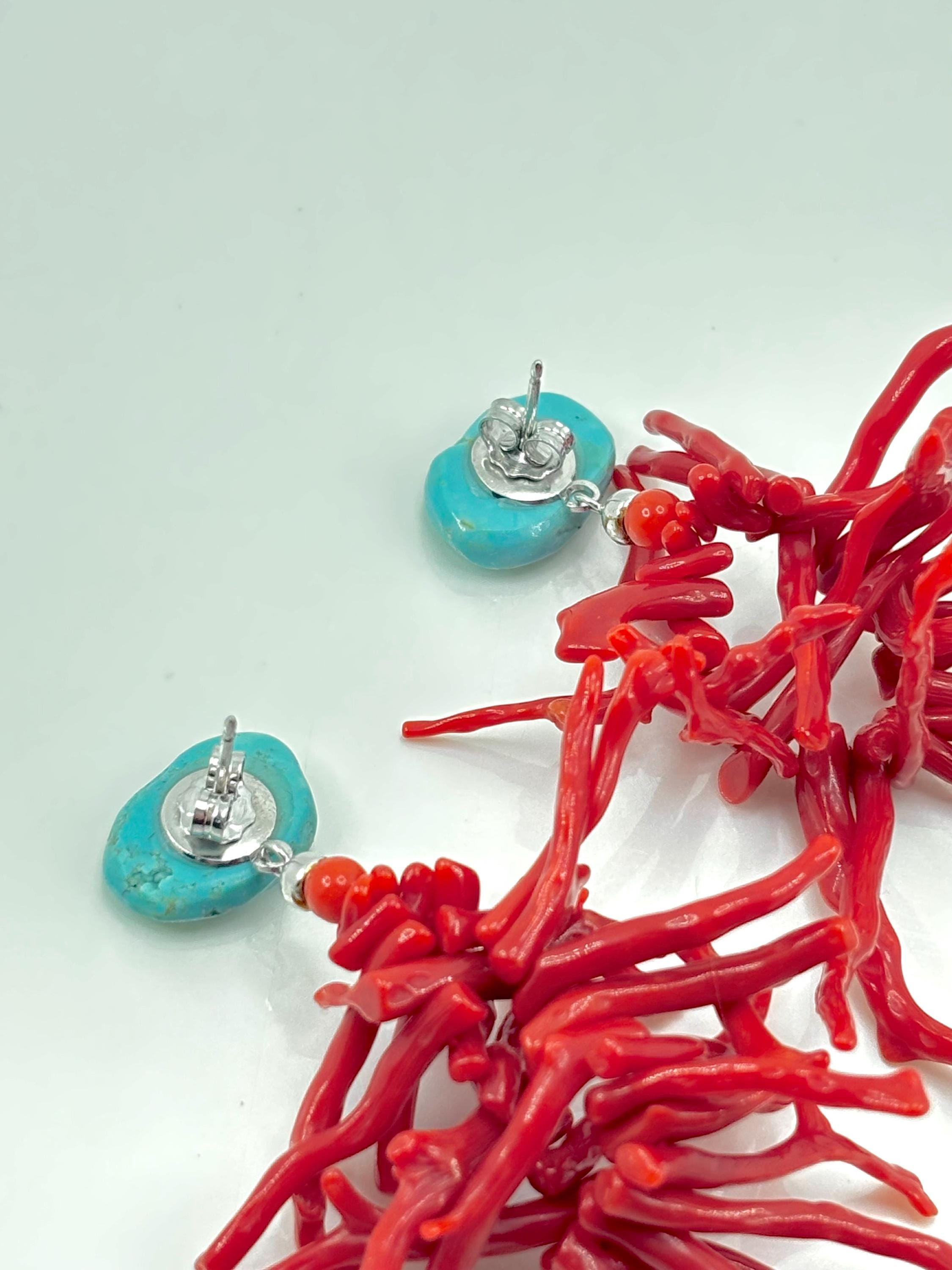 Stud earrings with natural red coral branches from the Mediterranean Sea and natural Turquoise shape, a mineral from the mines of Arizona (USA), set in 925 silver. Made and crafted by artisans from Torre del Greco.