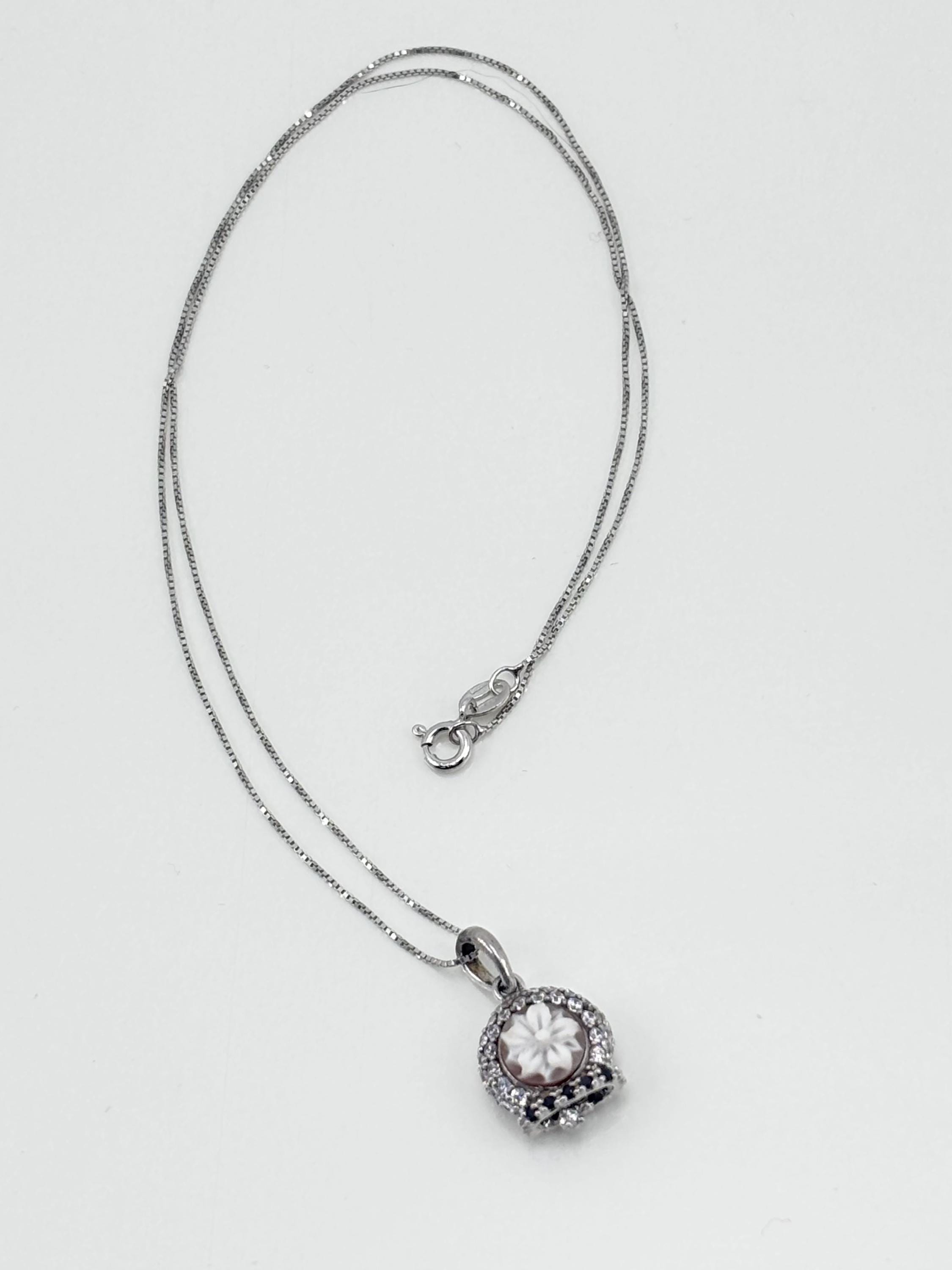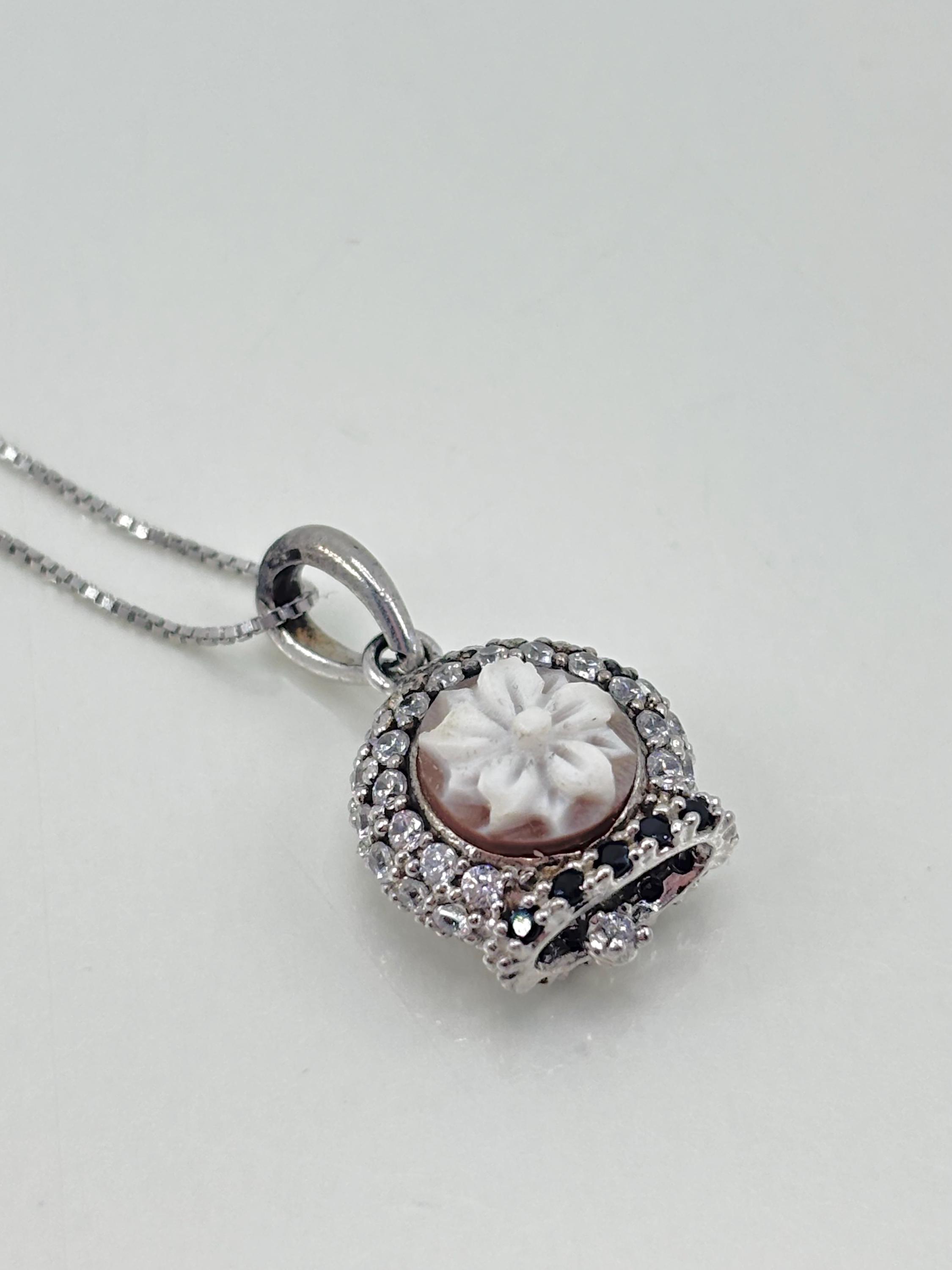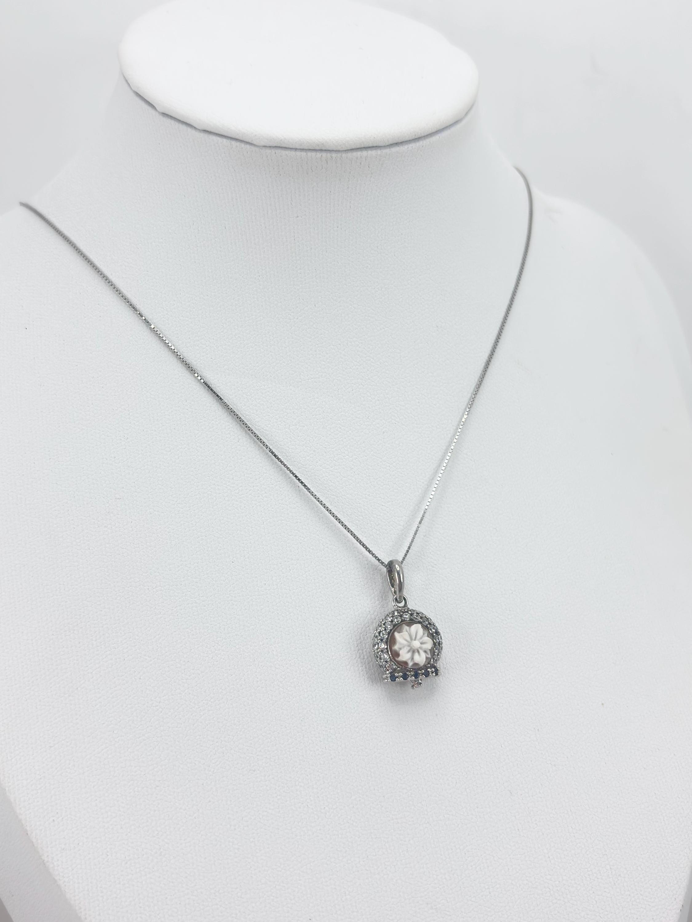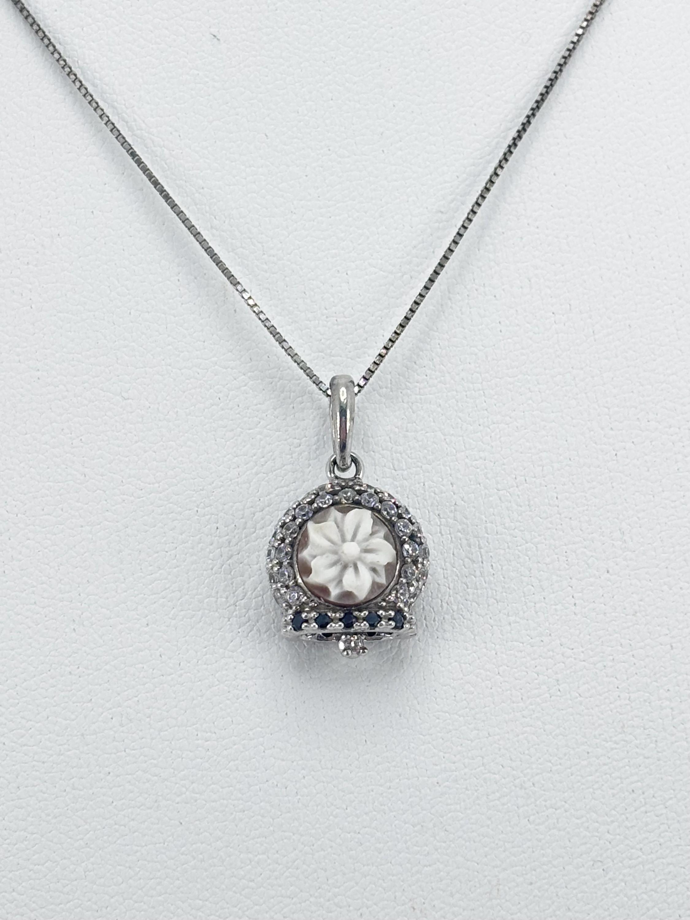 Ciondolo sbrilluccicante a forma di campanellina in argento 925 completamente ricoperto da zirconi, con cameo floreale inciso in su conchiglia cassis madagascariens. Gioiello versatile perfetto come idea regalo, con catenina in Argento 925. Realizzato e lavorato da artigiani di Torre del Greco.