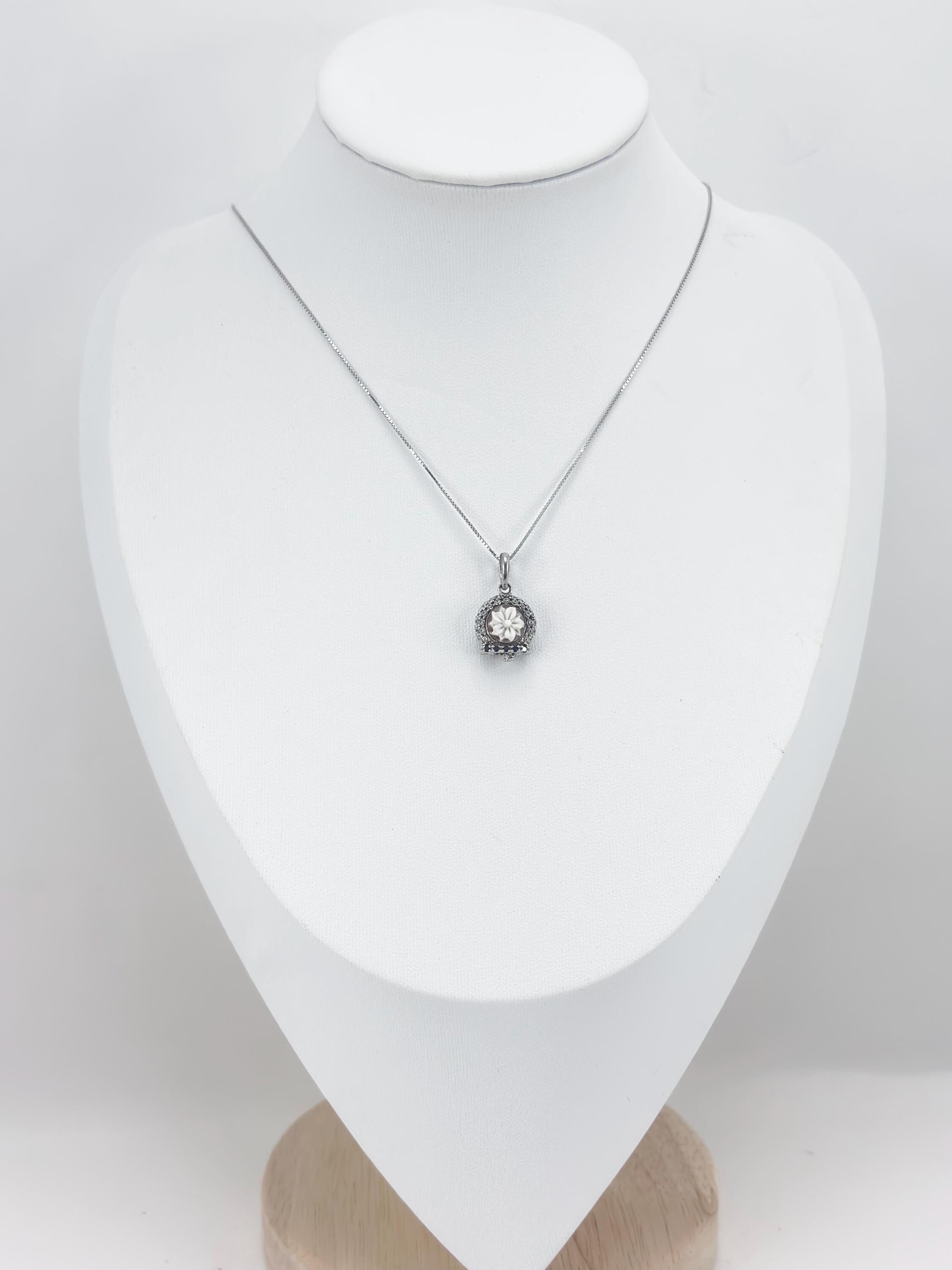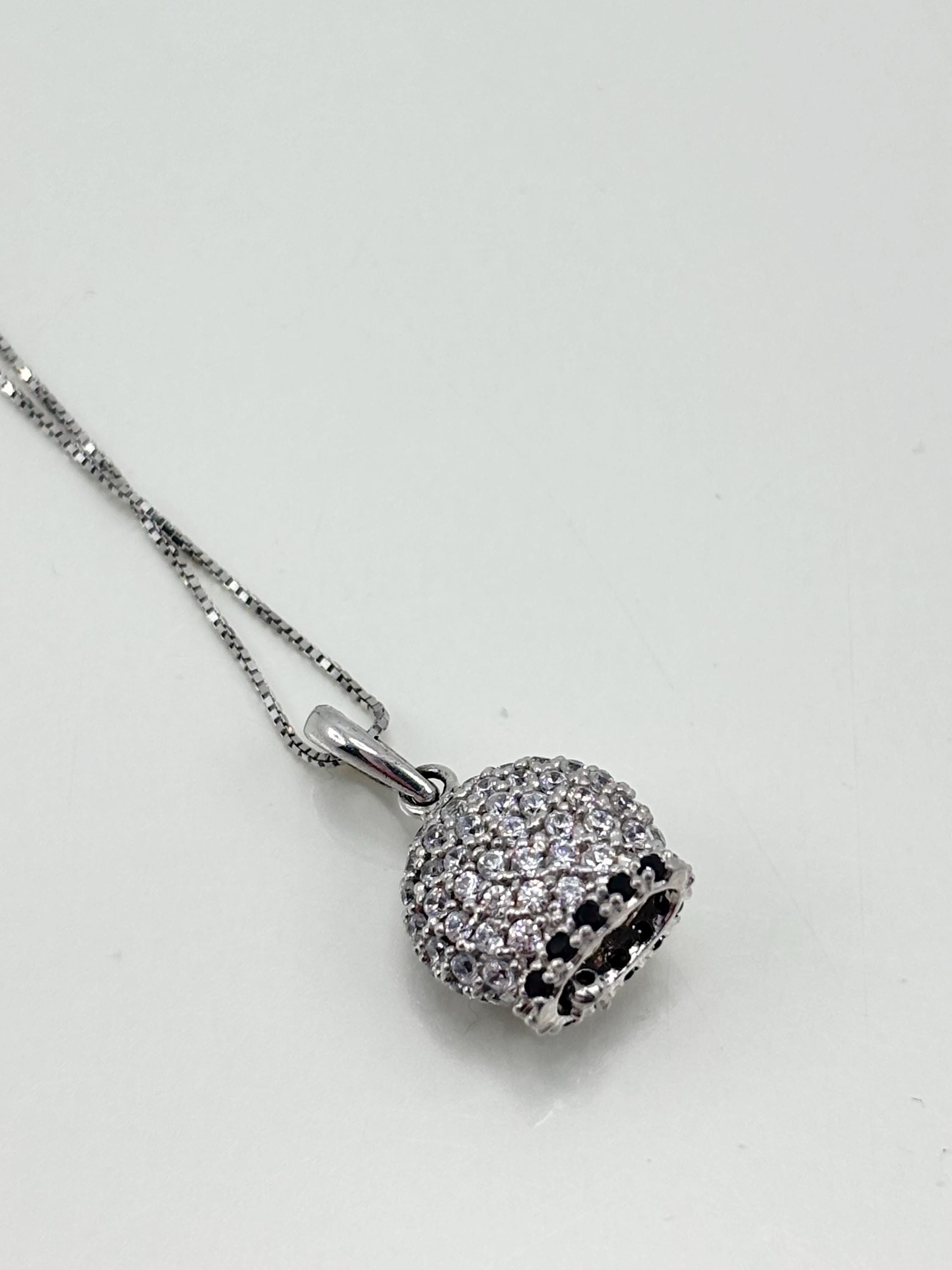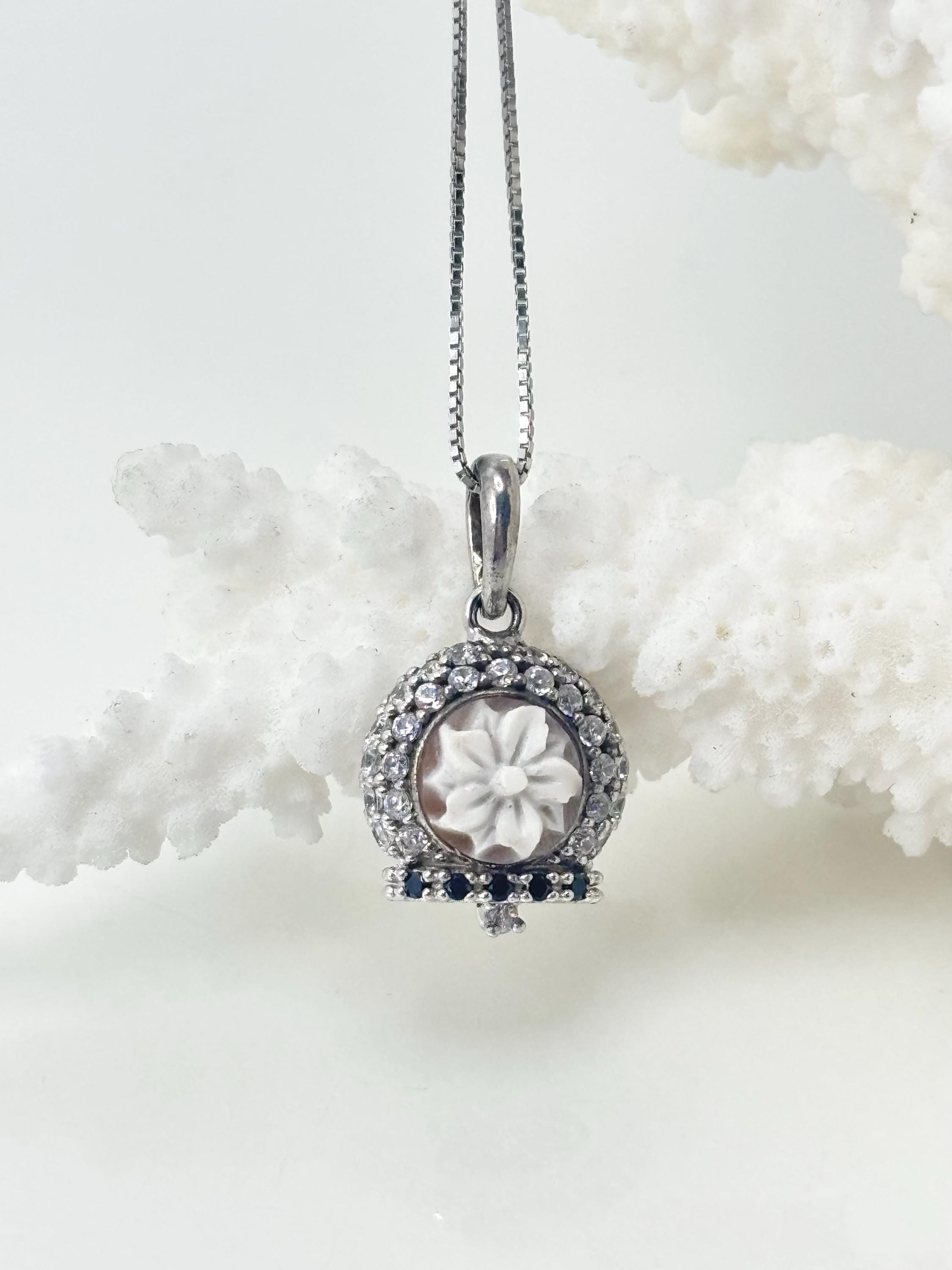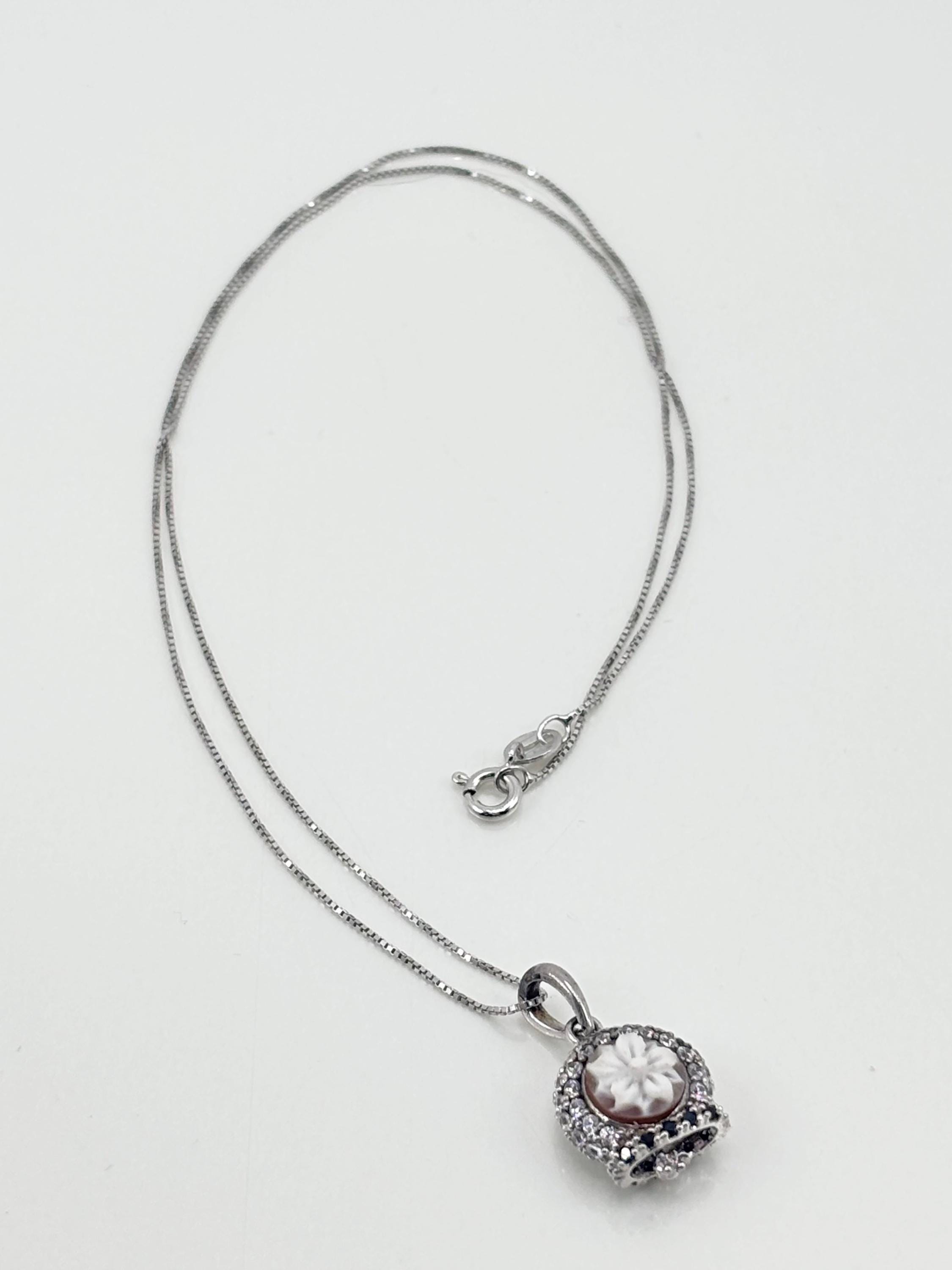 Ciondolo sbrilluccicante a forma di campanellina in argento 925 completamente ricoperto da zirconi, con cameo floreale inciso in su conchiglia cassis madagascariens. Gioiello versatile perfetto come idea regalo, con catenina in Argento 925. Realizzato e lavorato da artigiani di Torre del Greco.