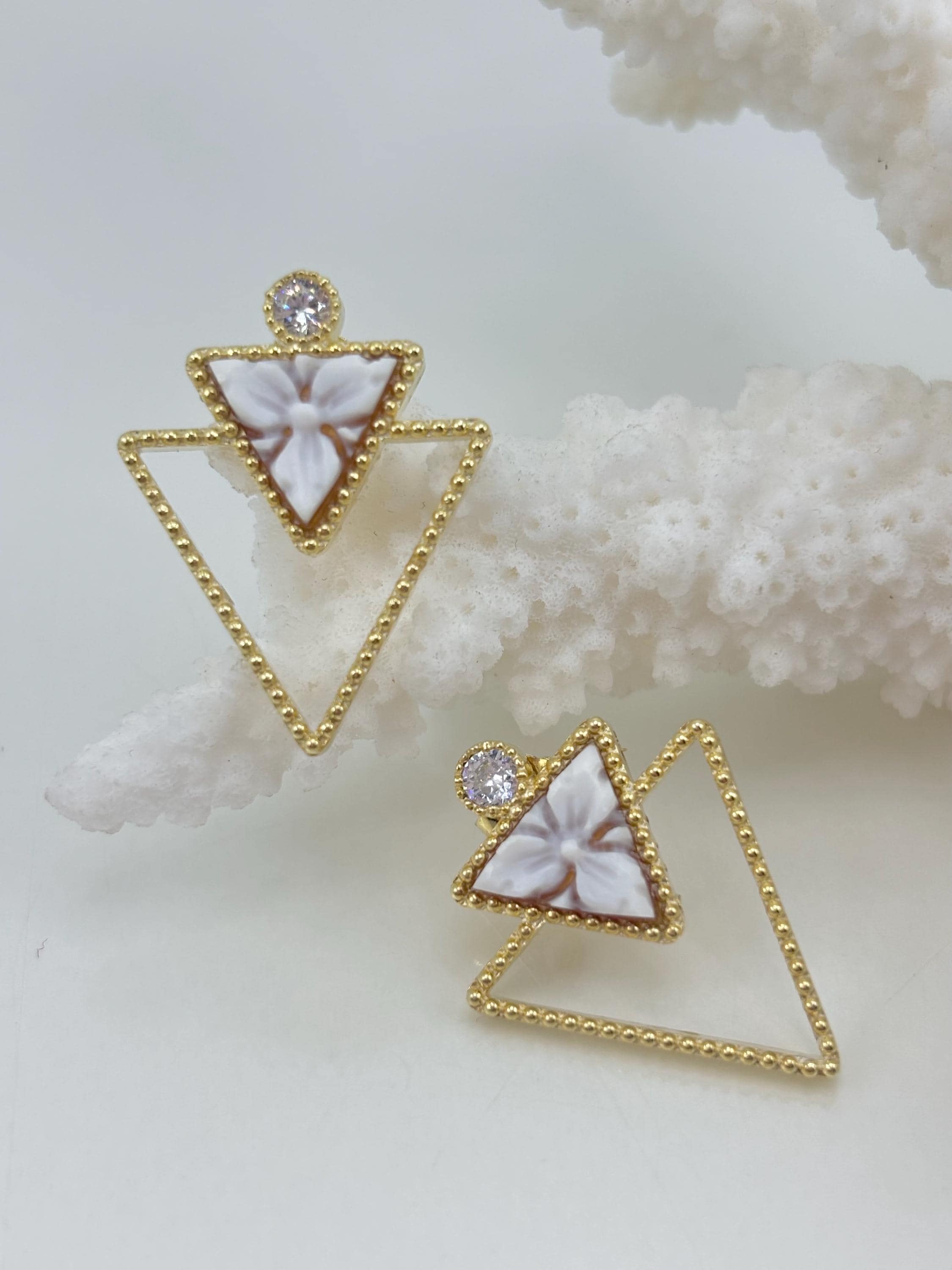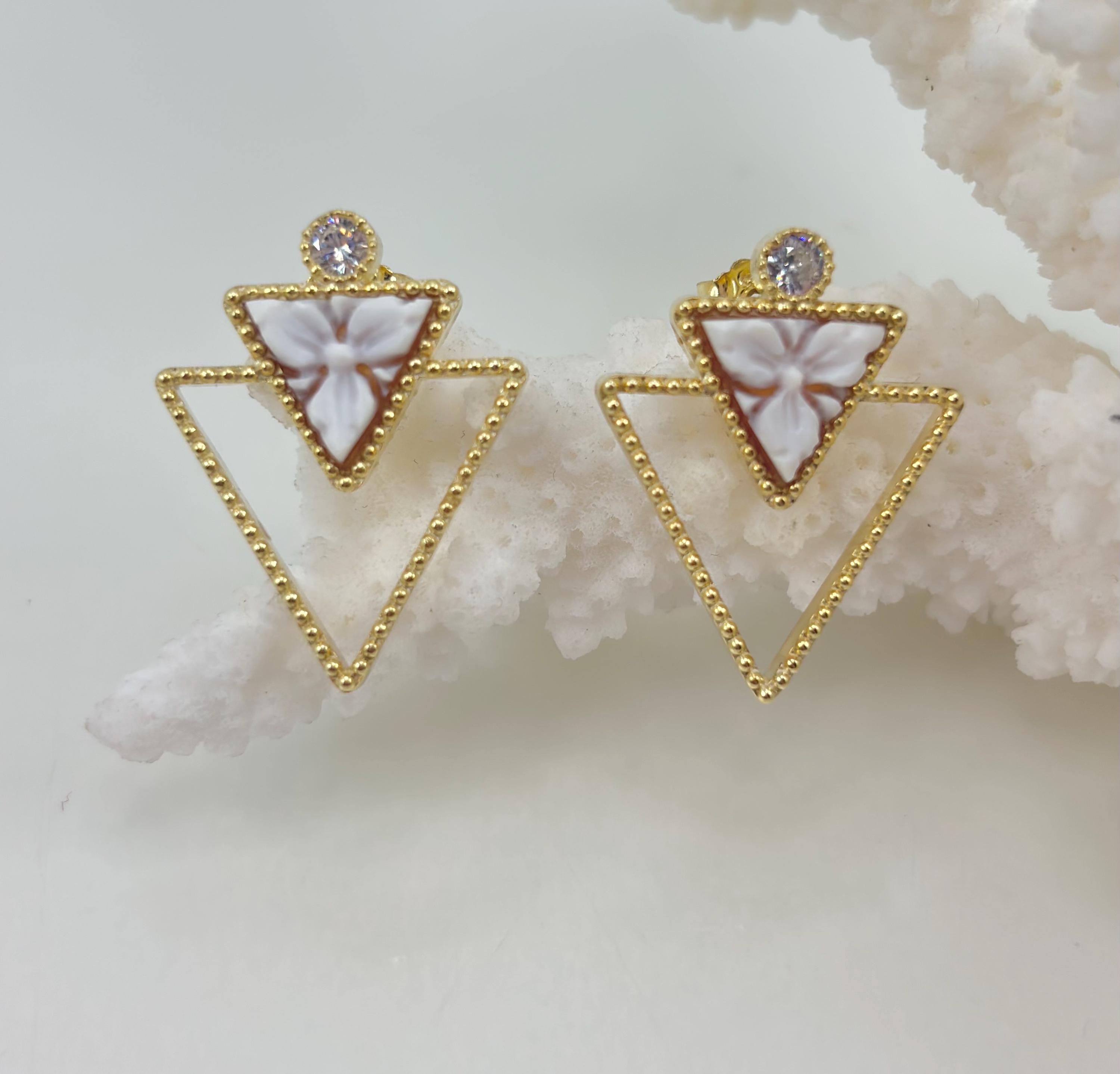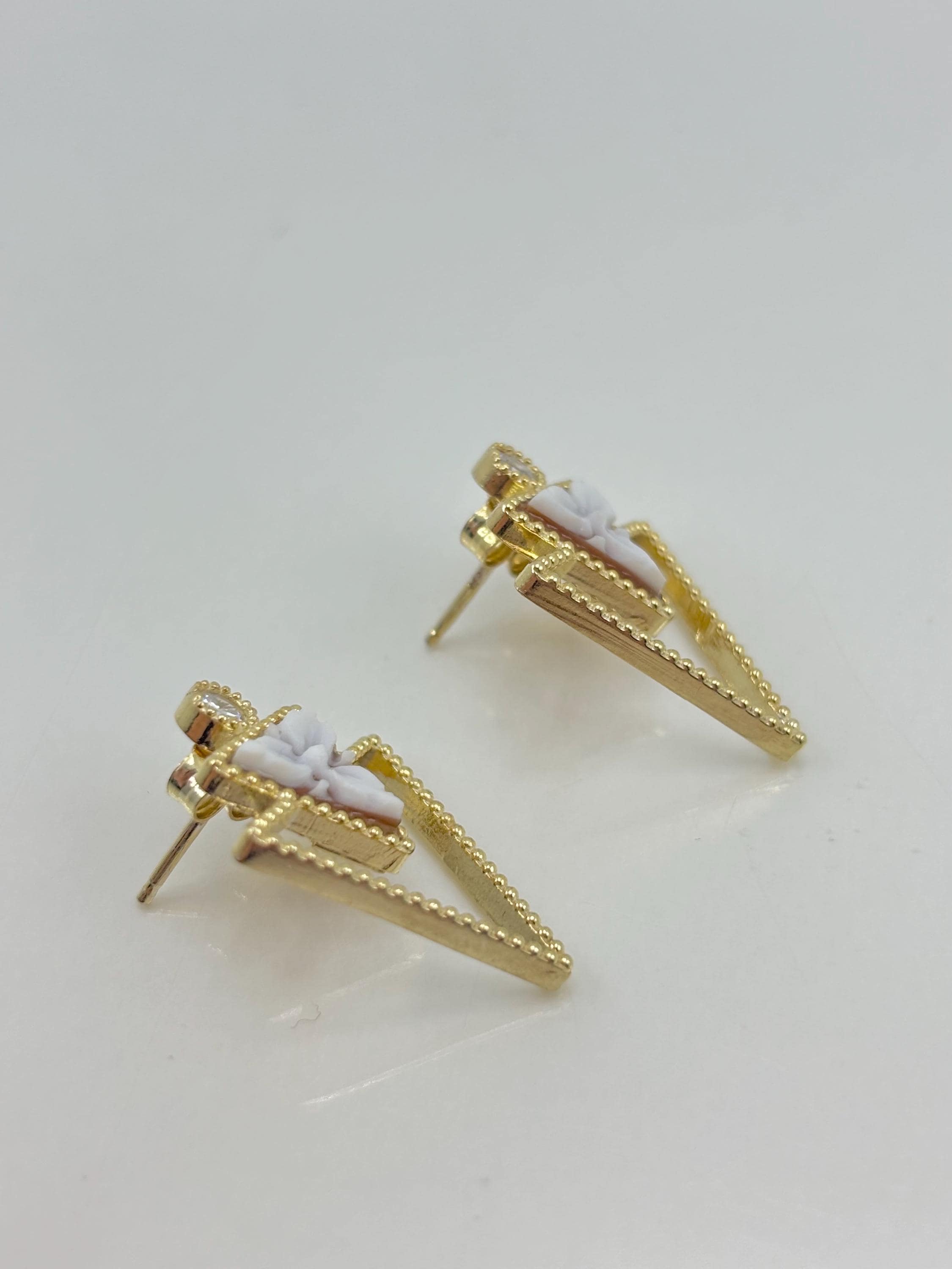 Orecchini al lobo geometrici con cameo floreale inciso su conchiglia Cassis Madagascariens e montatura in Argento 925 placcato in oro e zircone luminoso. Un must have versatile perfetto come idea regalo. Lavorato e realizzato interamente da artigiani di Torre del Greco.