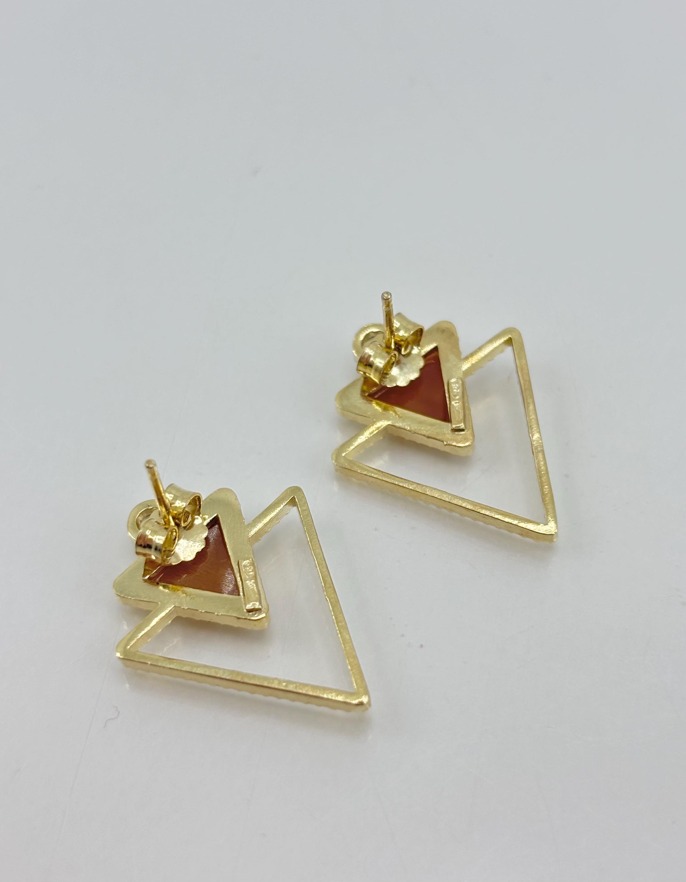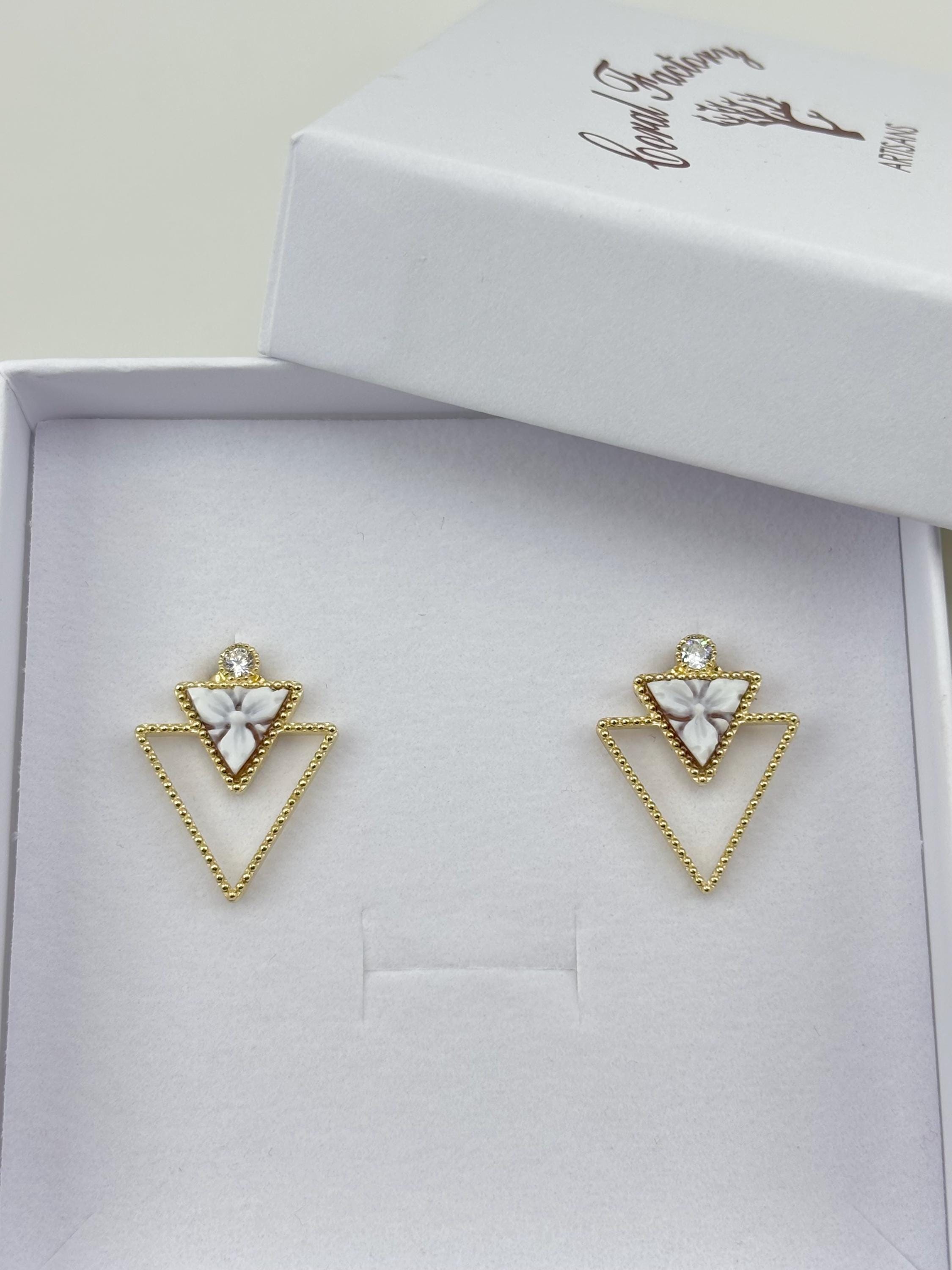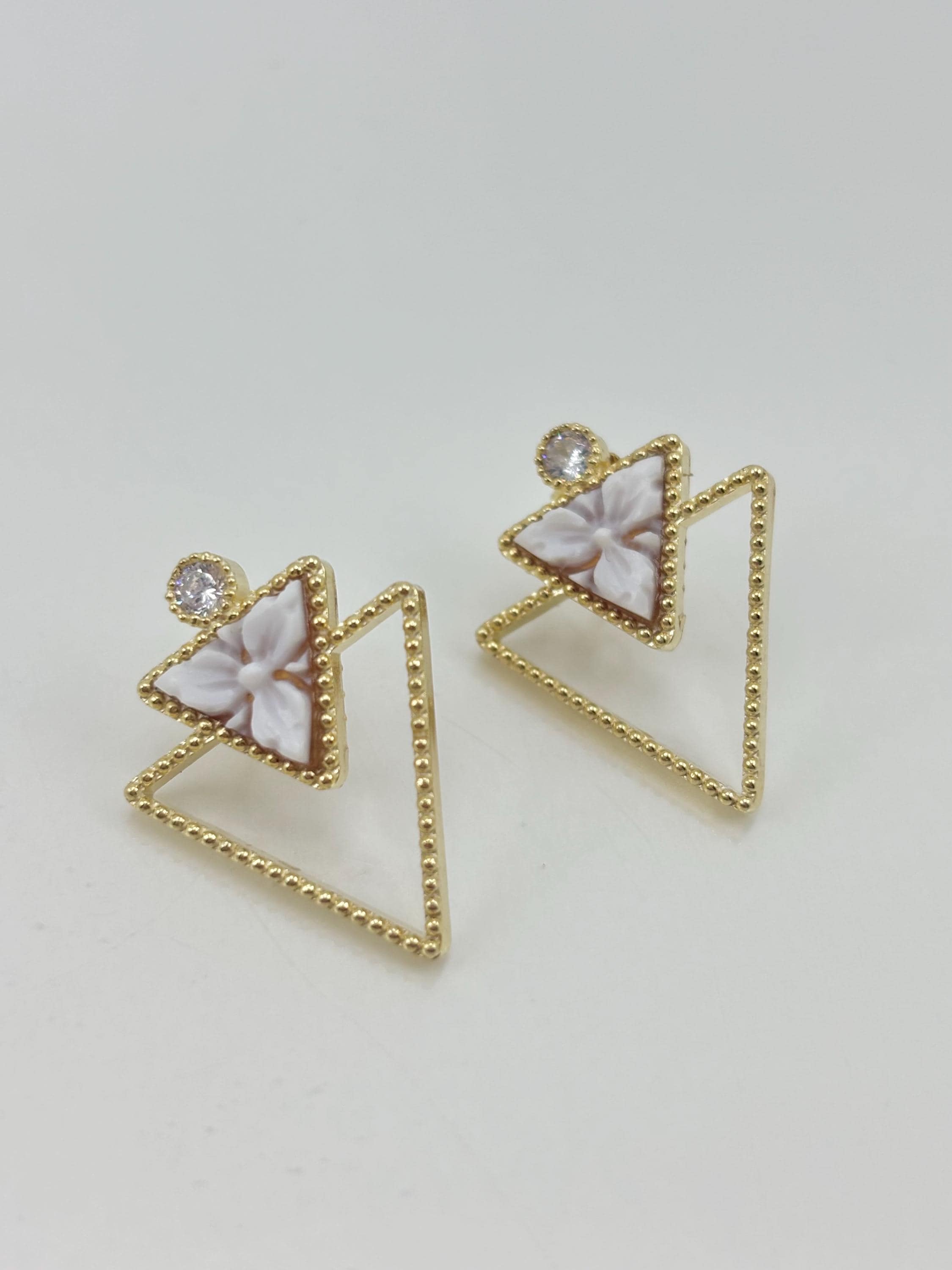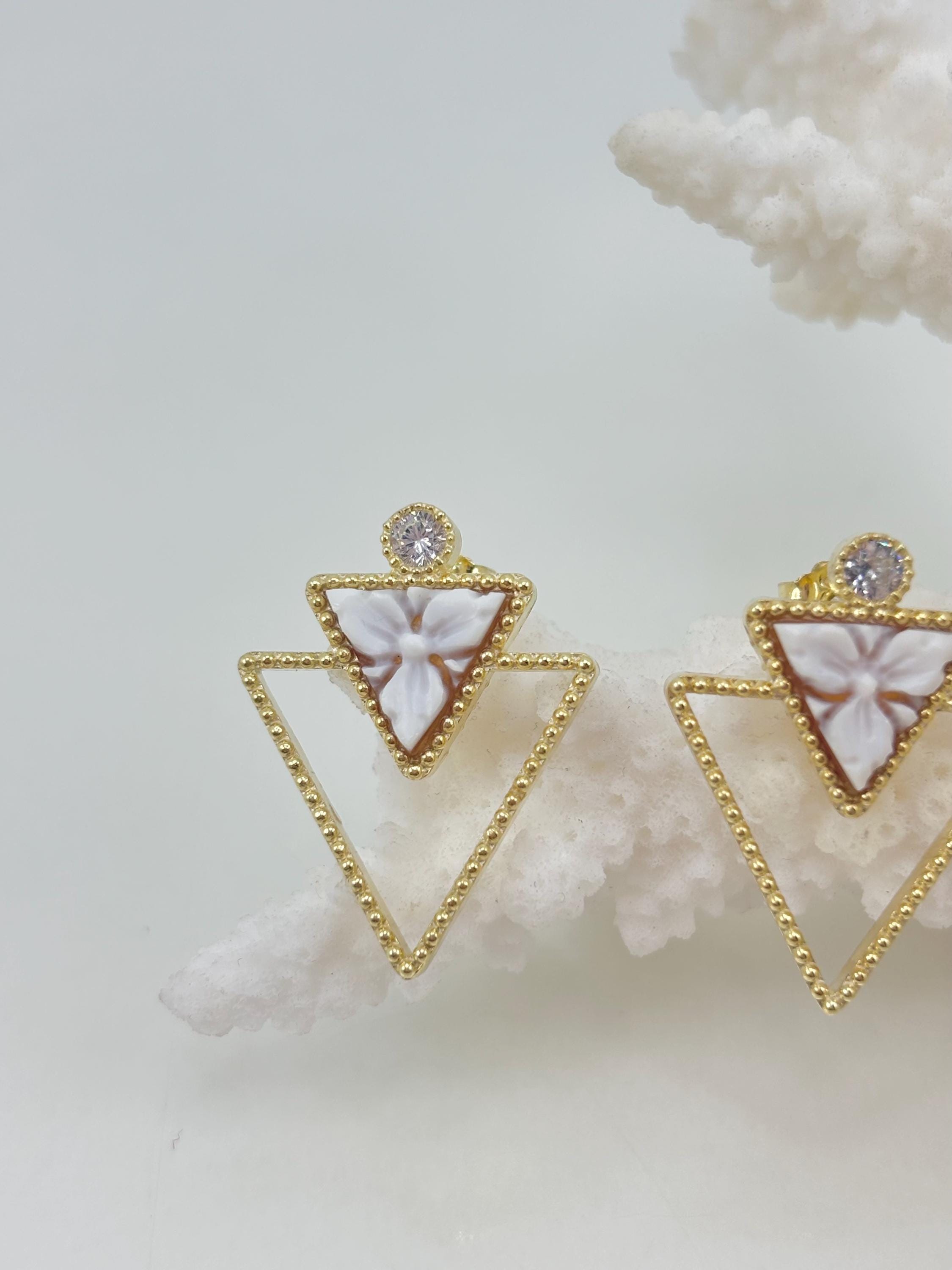 Orecchini al lobo geometrici con cameo floreale inciso su conchiglia Cassis Madagascariens e montatura in Argento 925 placcato in oro e zircone luminoso. Un must have versatile perfetto come idea regalo. Lavorato e realizzato interamente da artigiani di Torre del Greco.