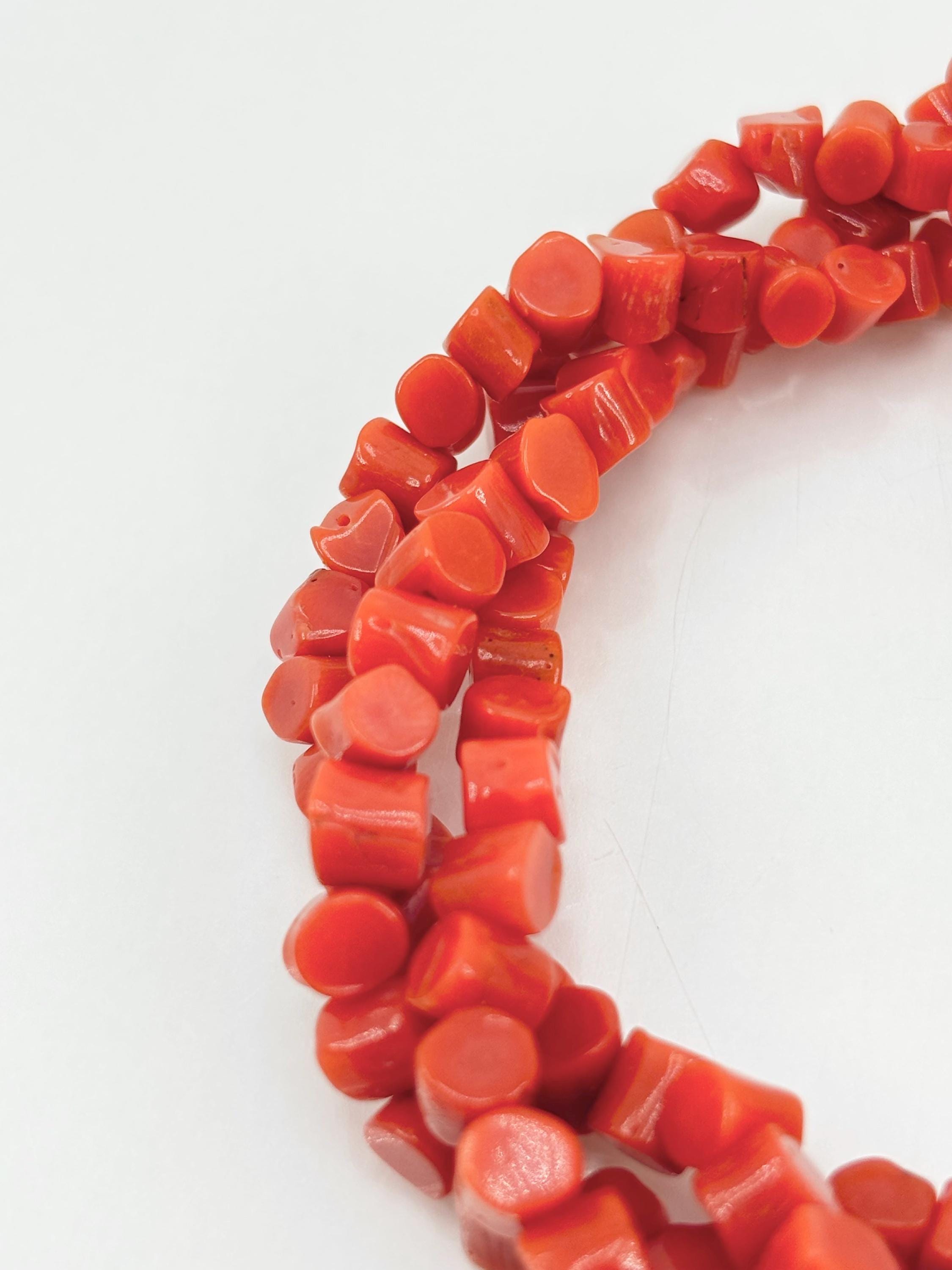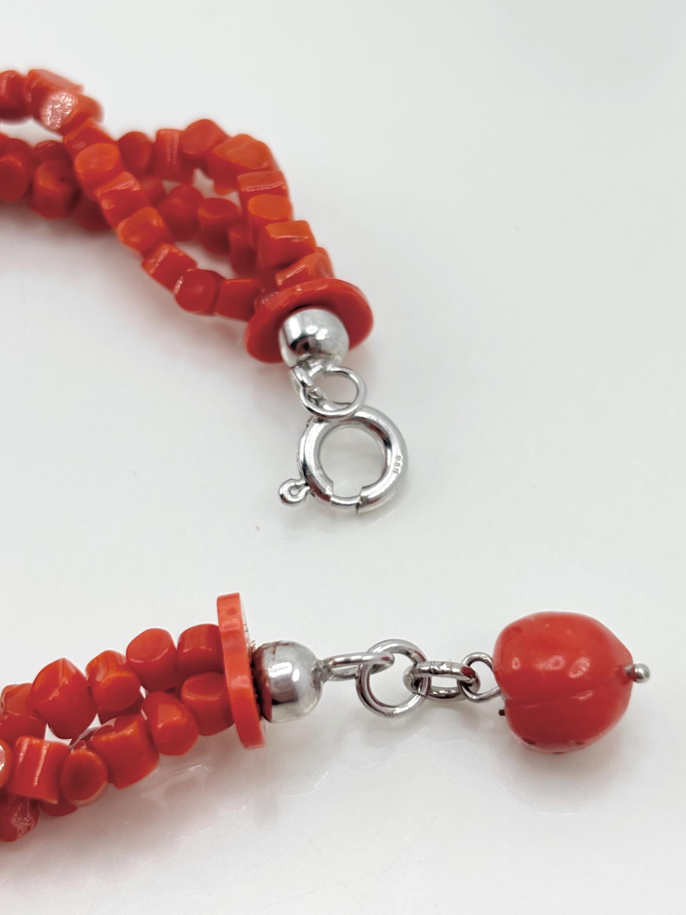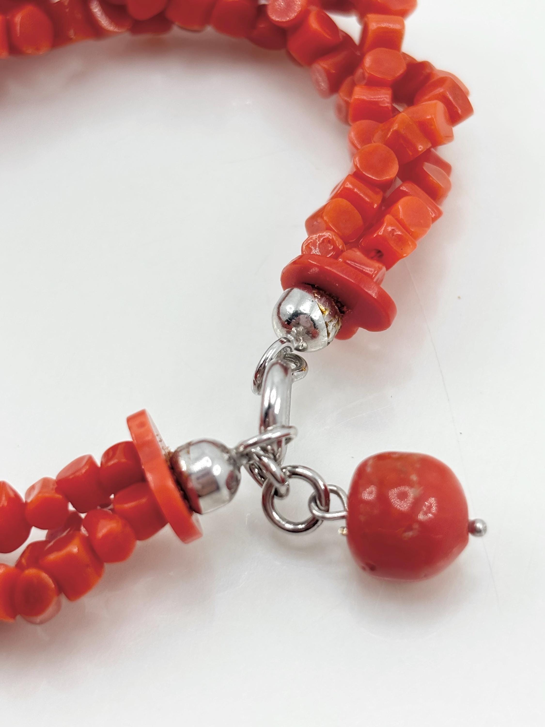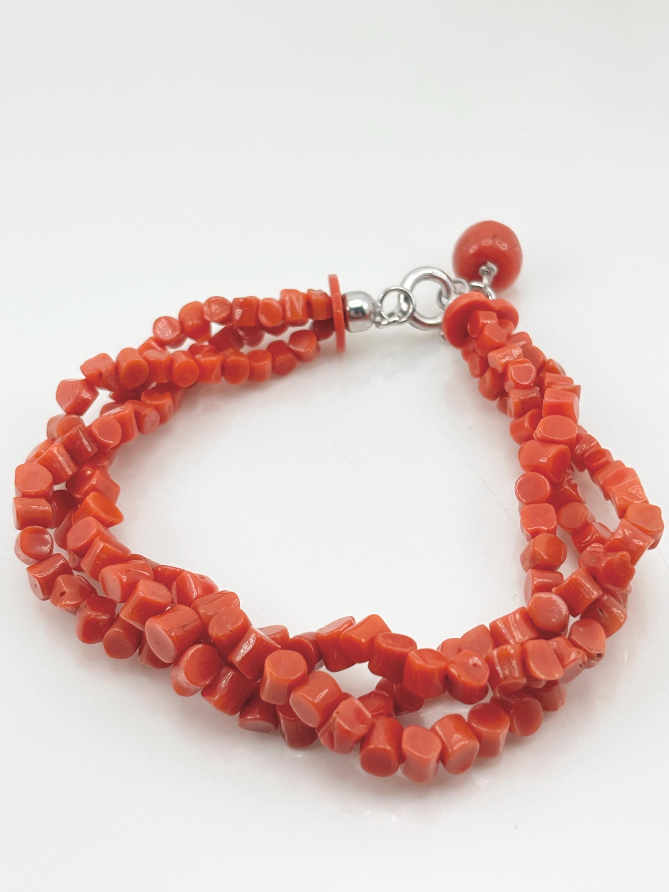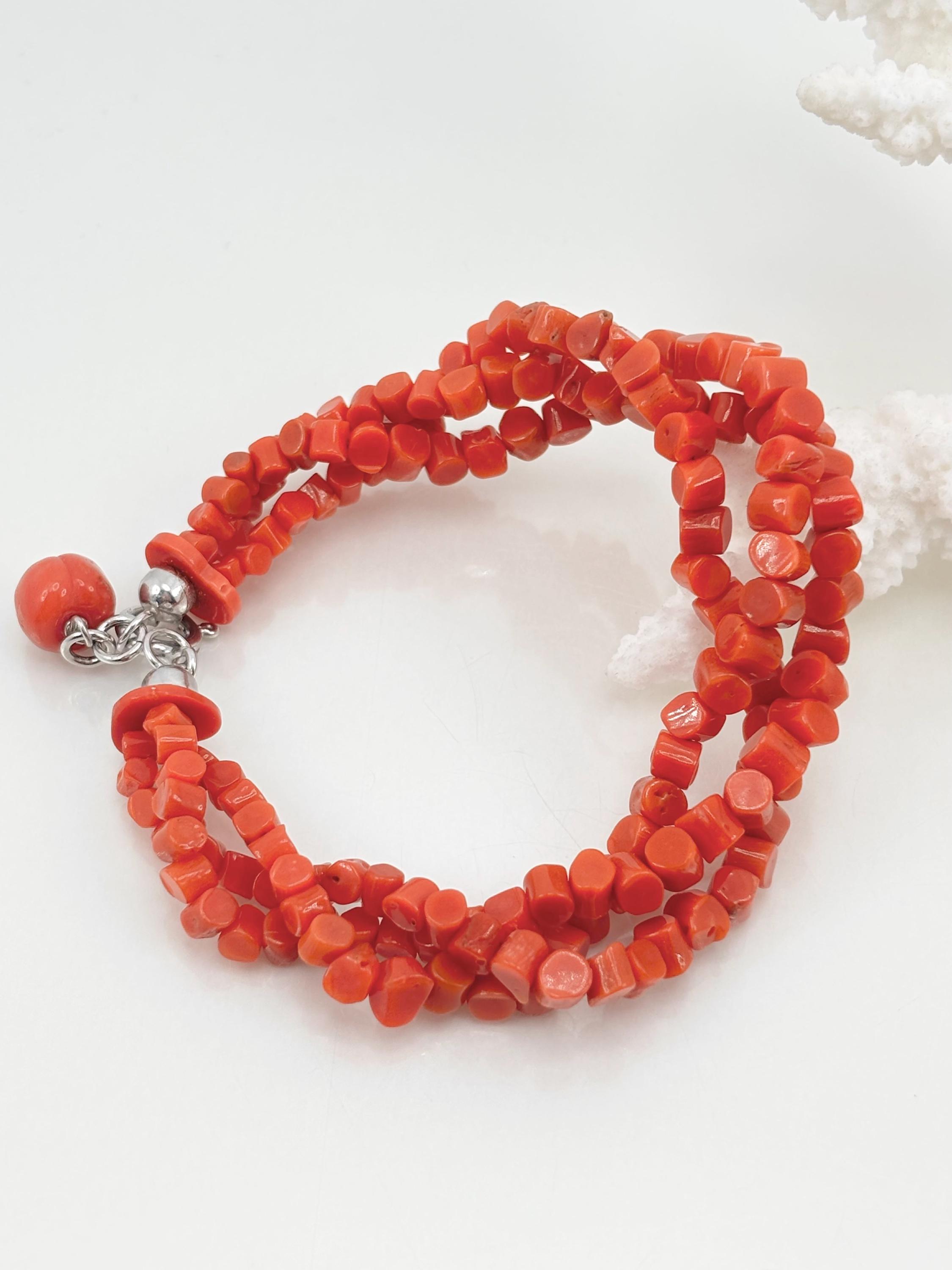 Bracciale modello torchon con sassetti di corallo rosso naturale proveniente dal Mar Mediterraneo, chiusura in Argento 925, gioiello lavorato e realizzato da Artigiani di Torre del Greco.