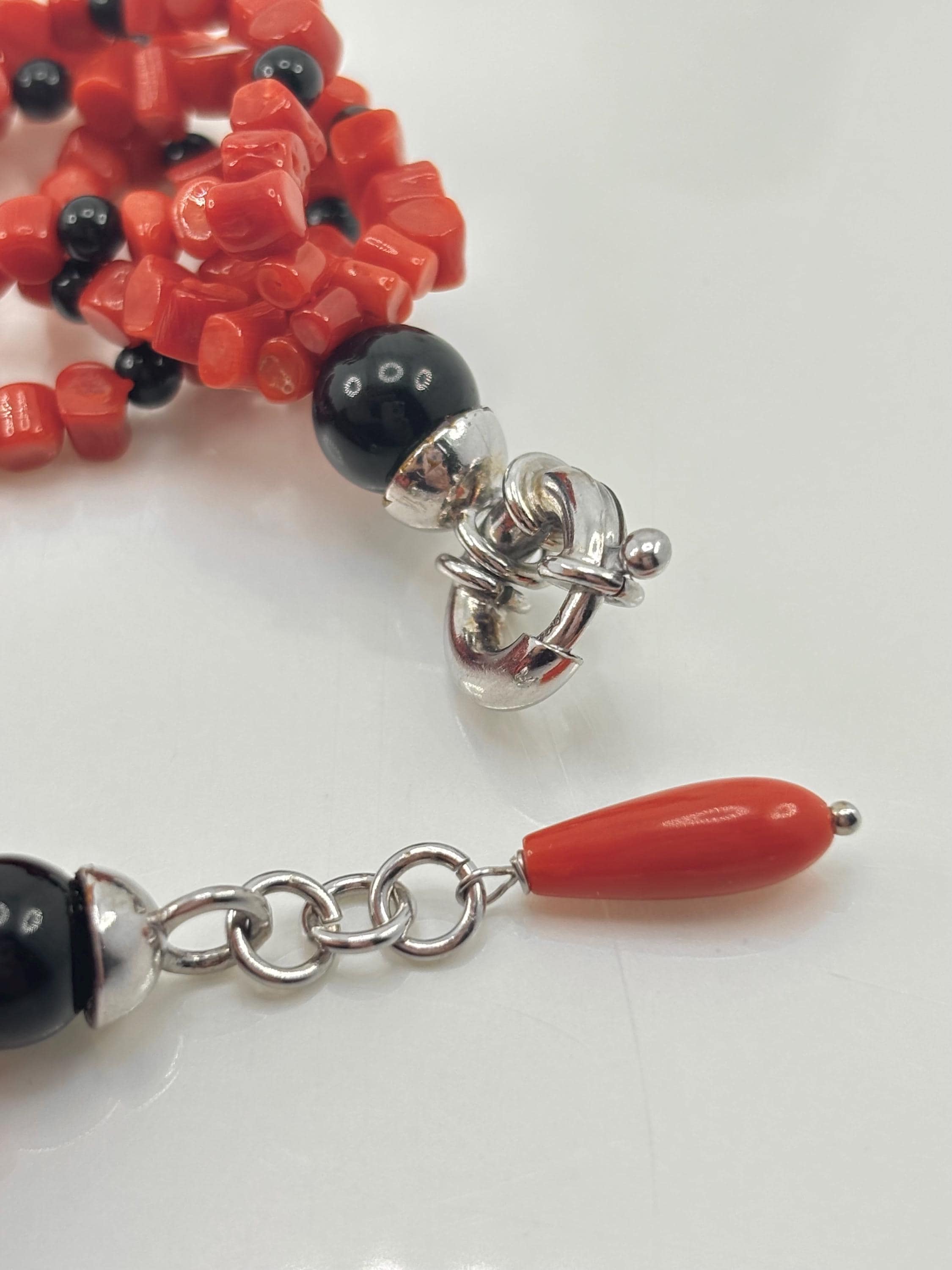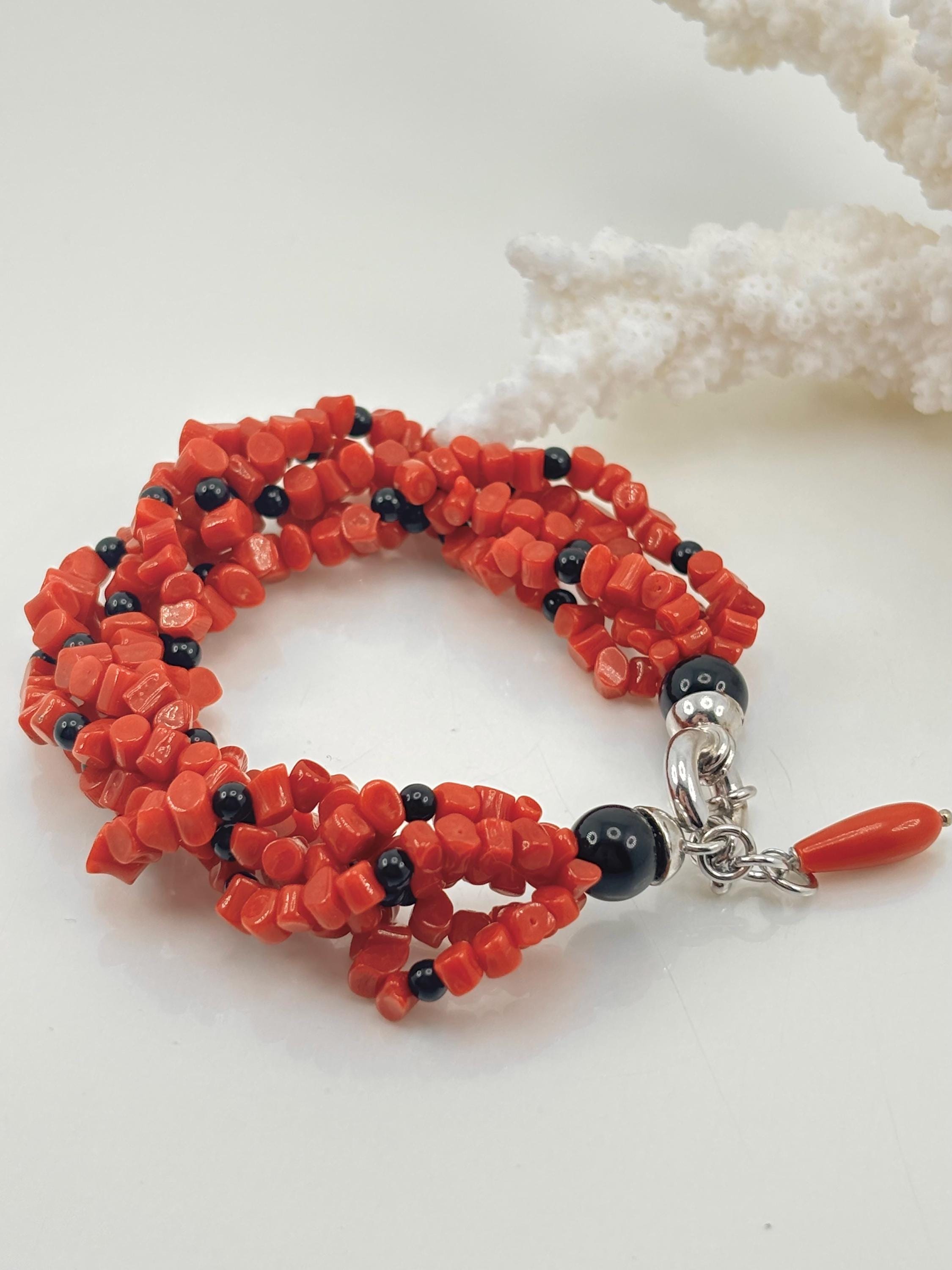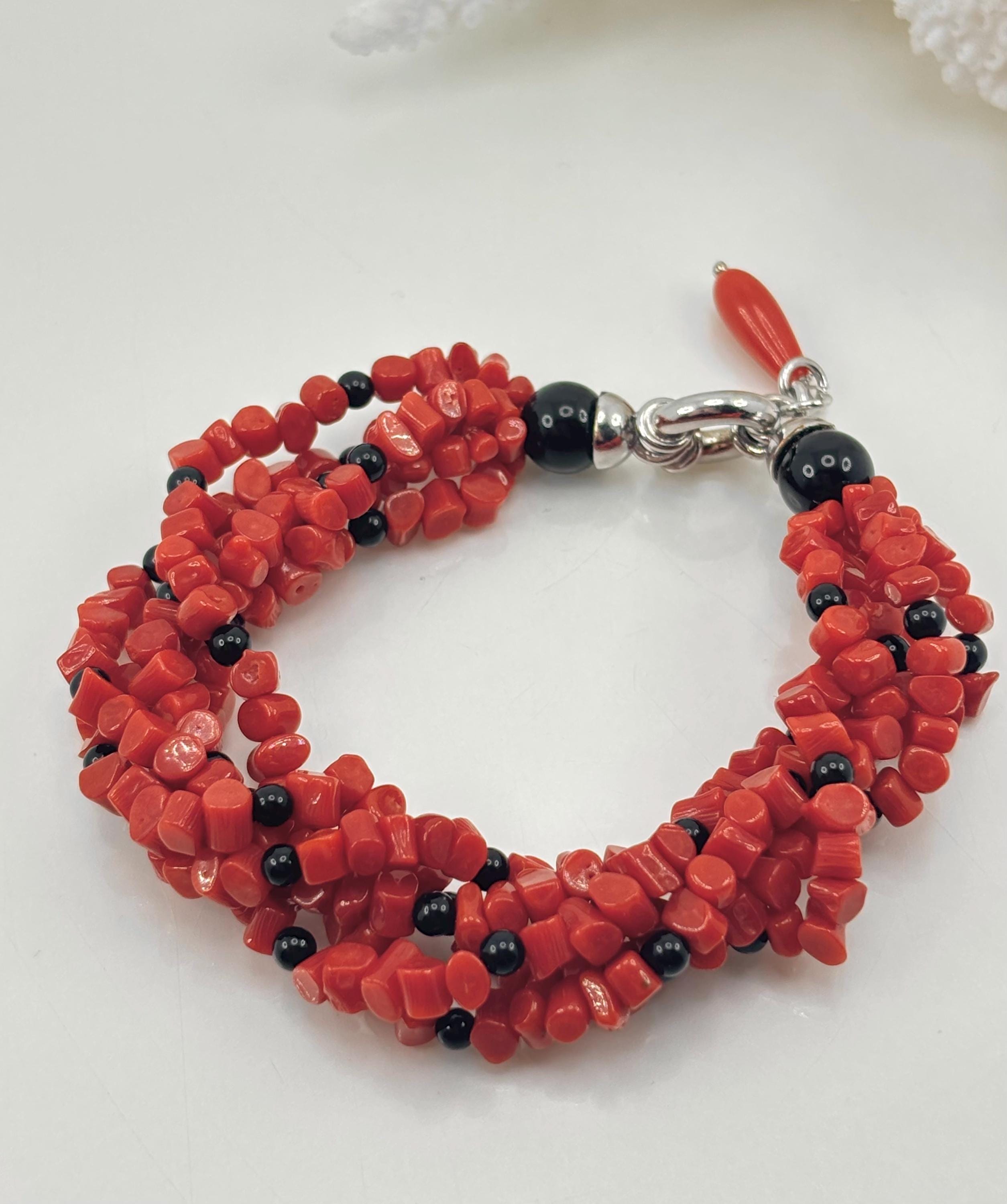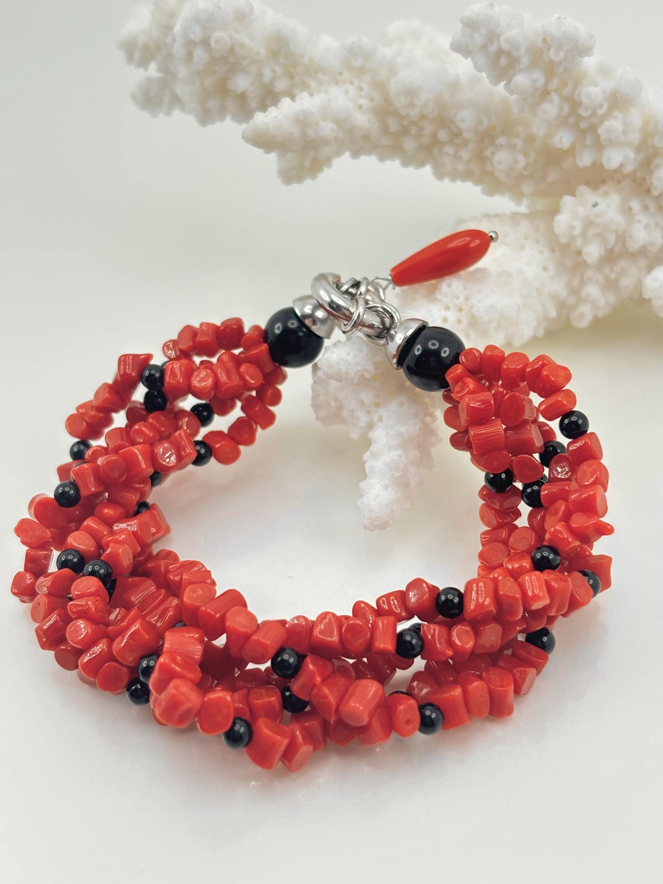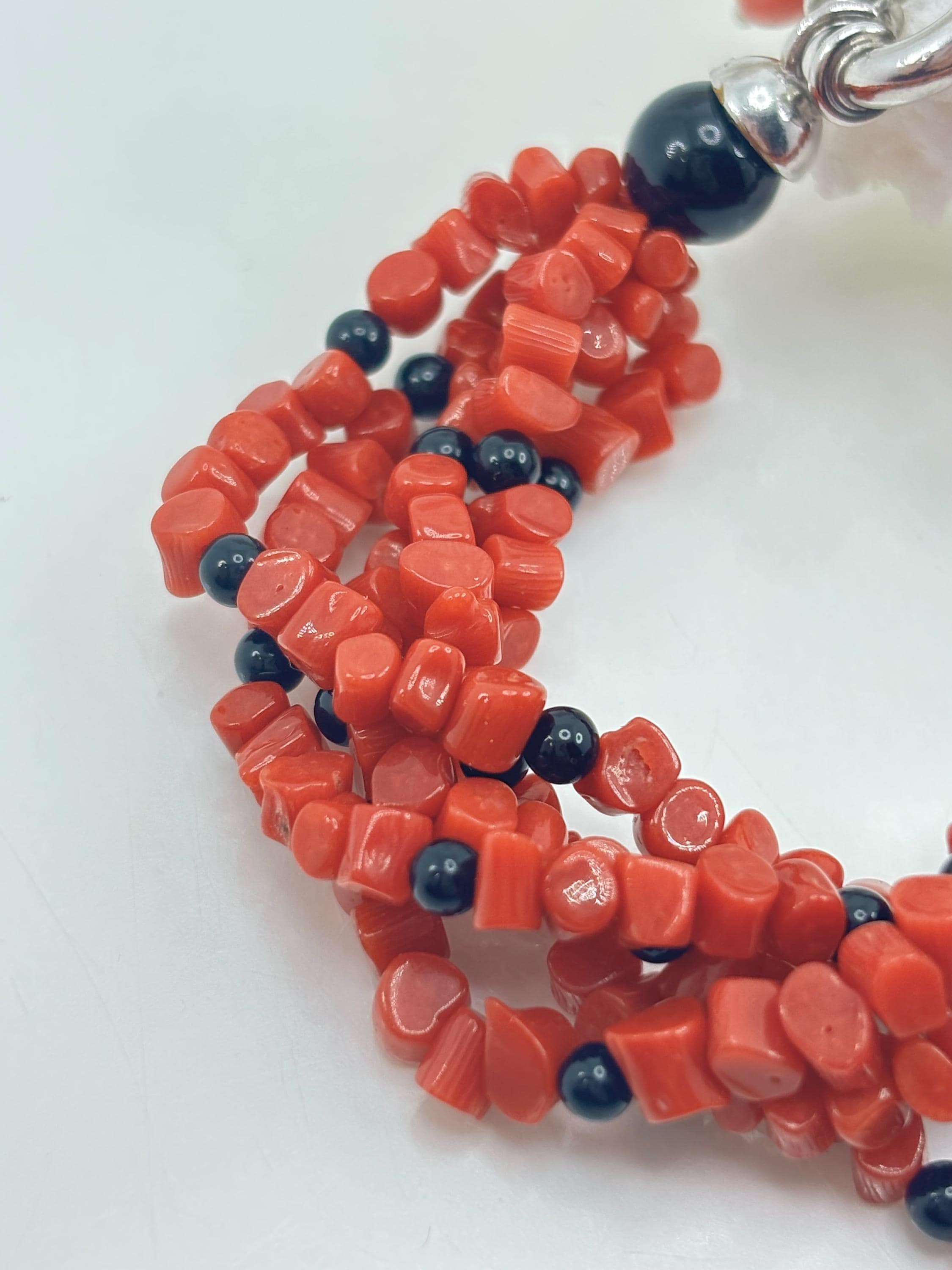 Bracciale a 5 fili modello torchon in sassetti di corallo rosso naturale proveniente dal Mar Mediterraneo e sfere in onice naturale, chiusura in argento 925. Gioiello lavorato e realizzato da esperti artigiani di Torre del Greco.