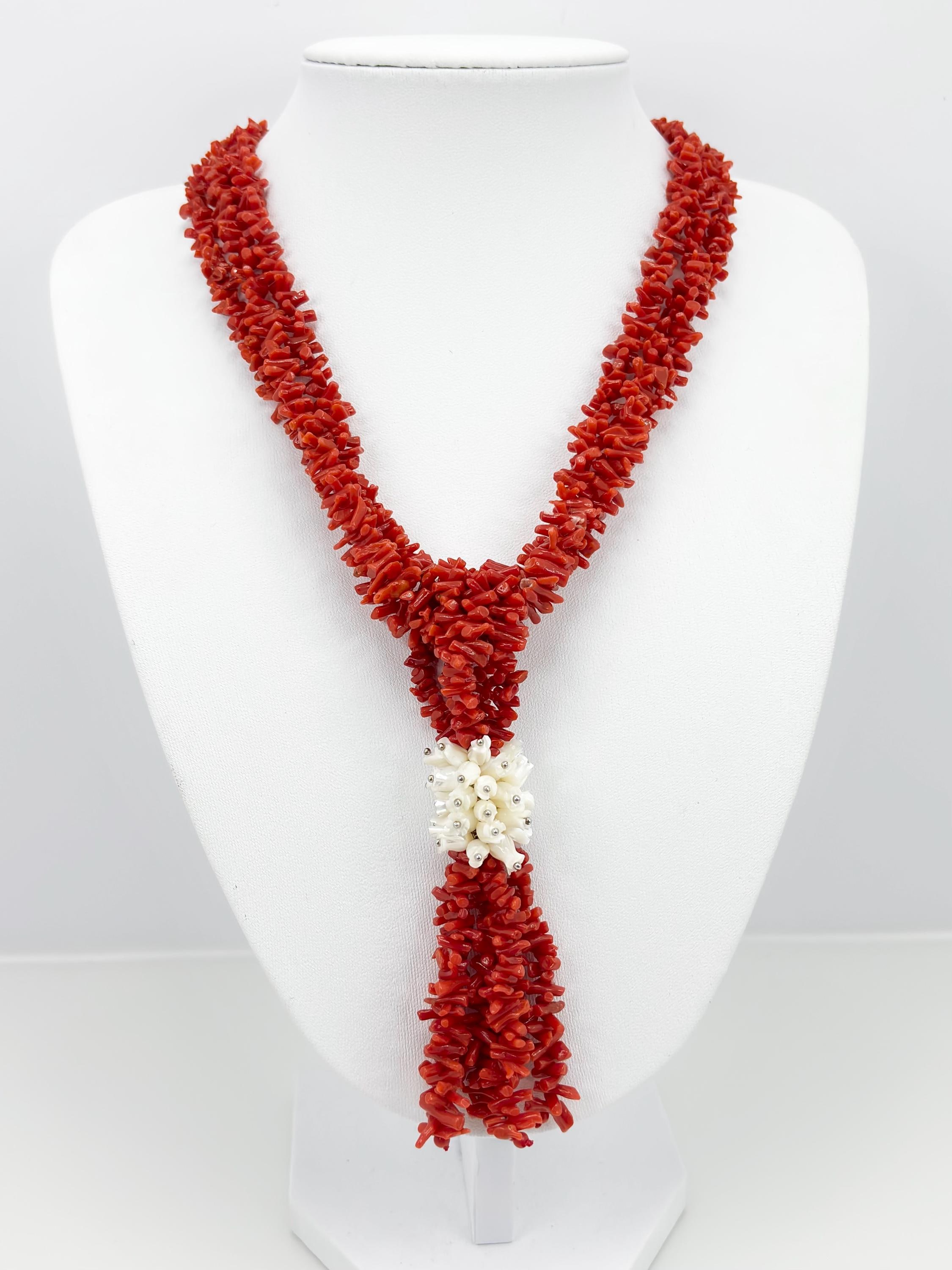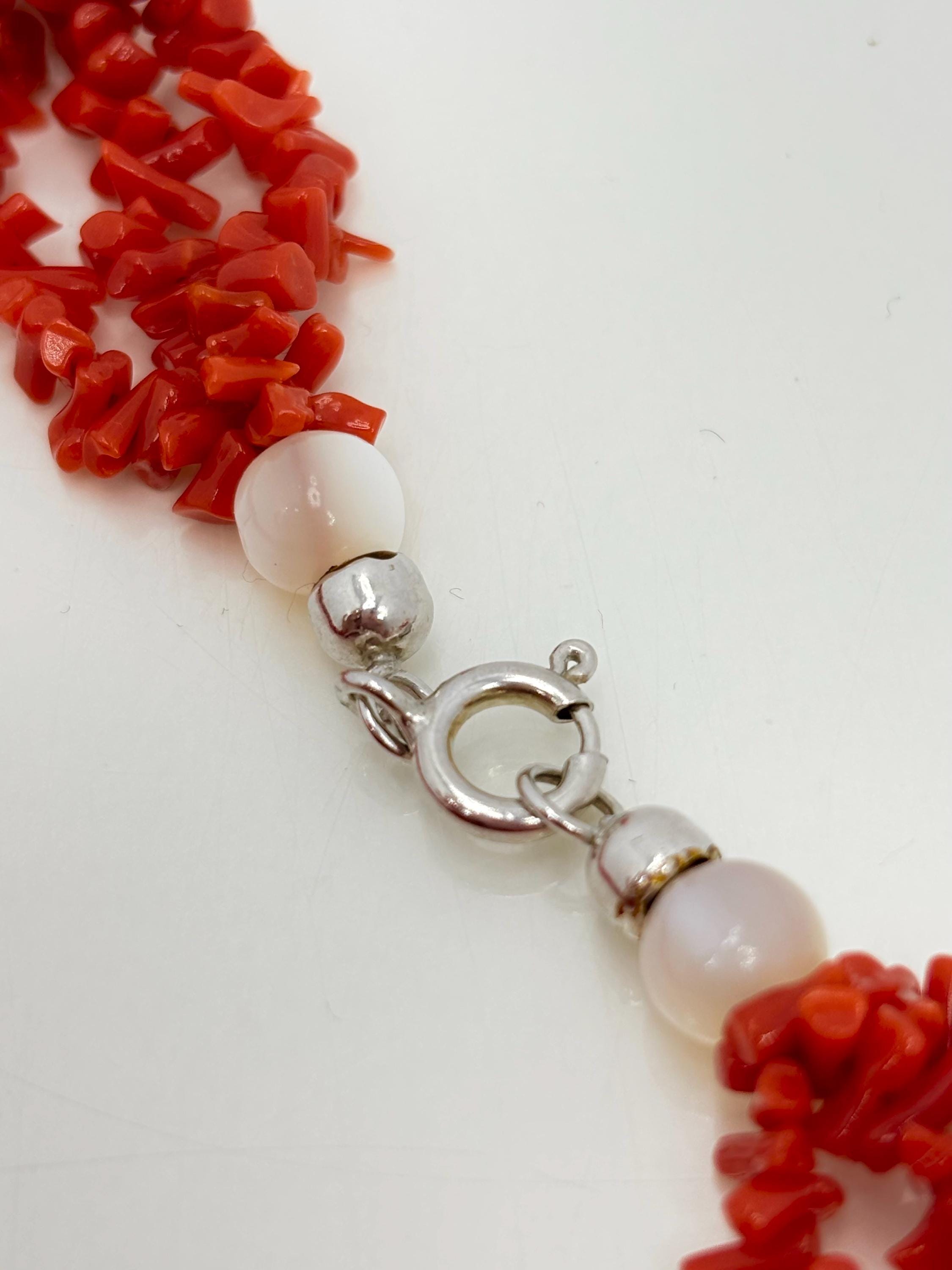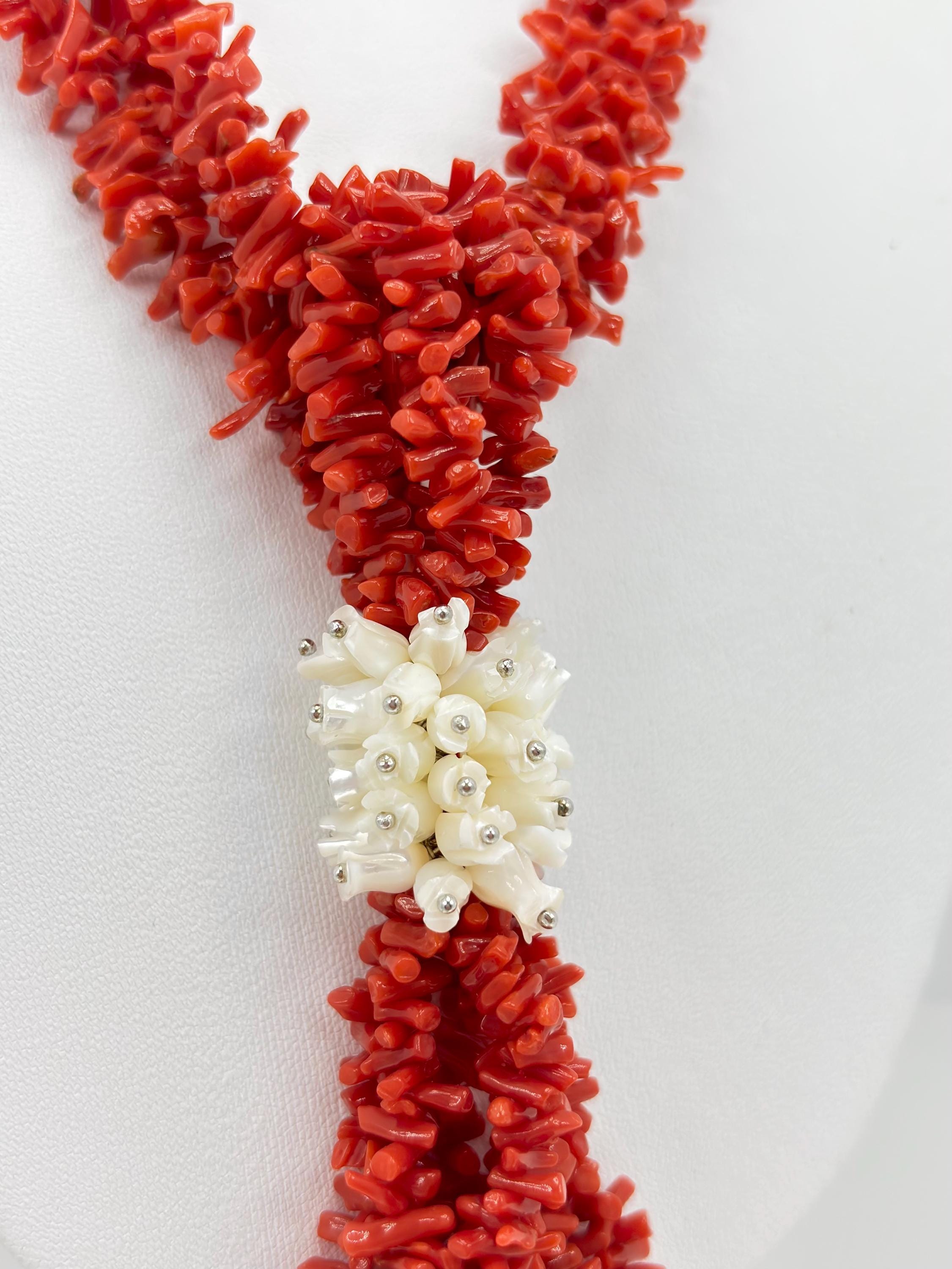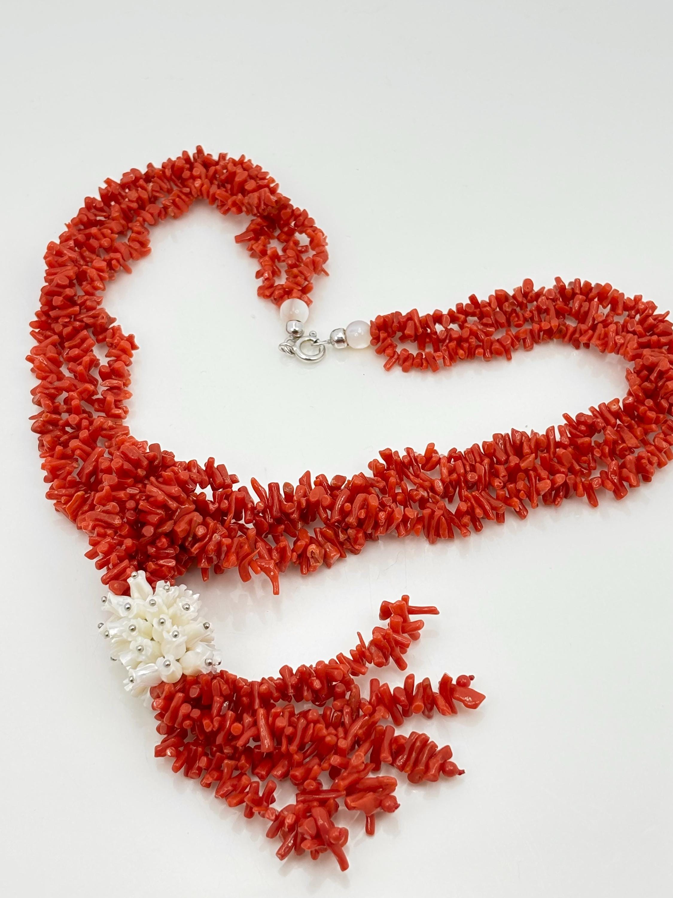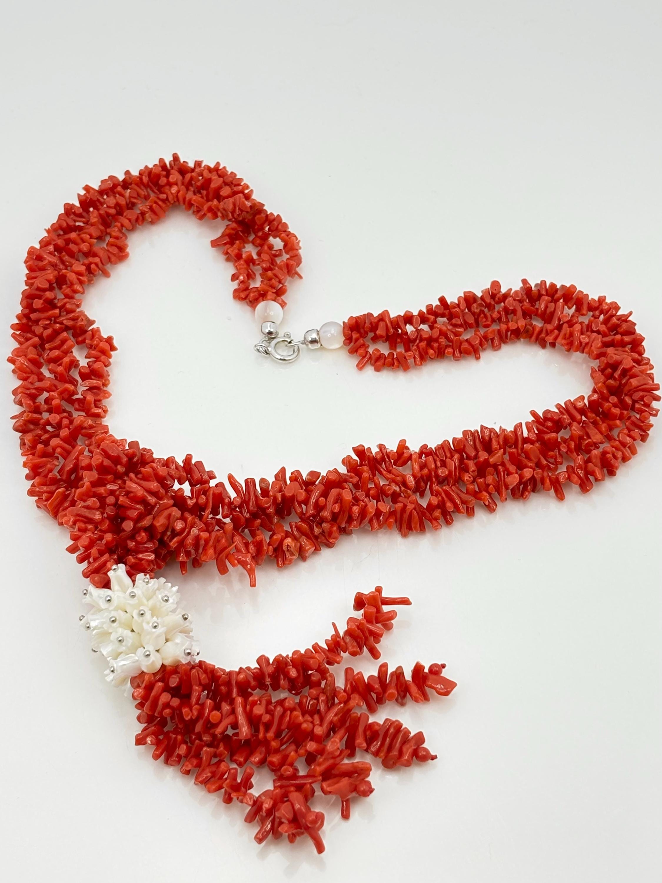Collana a tre fili in corallo rosso naturale proveniente dal Mar Mediterraneo e fiori incisi in madreperla con chiusura in Argento 925. collana lavorata e realizzata da artigiani di Torre del Greco: