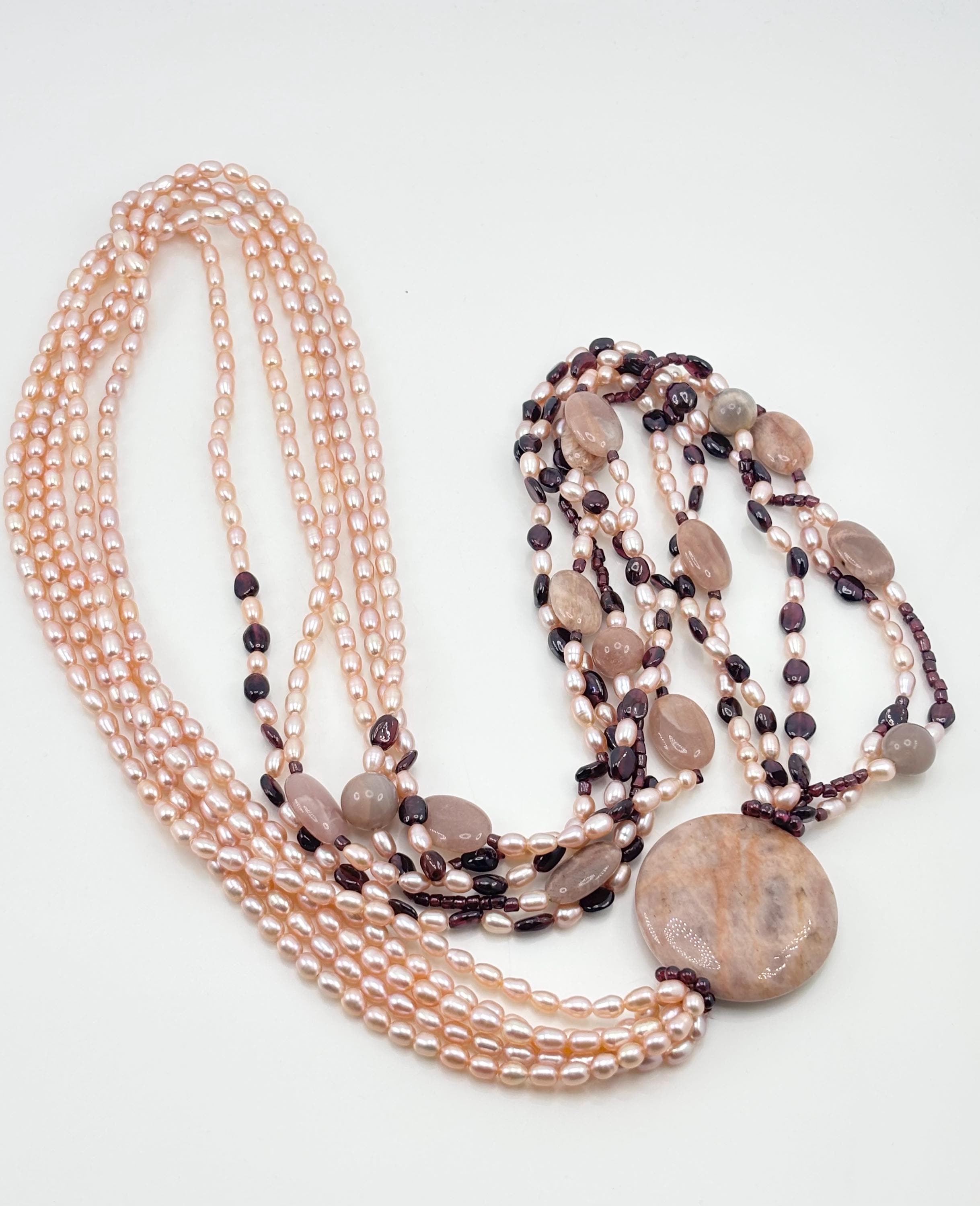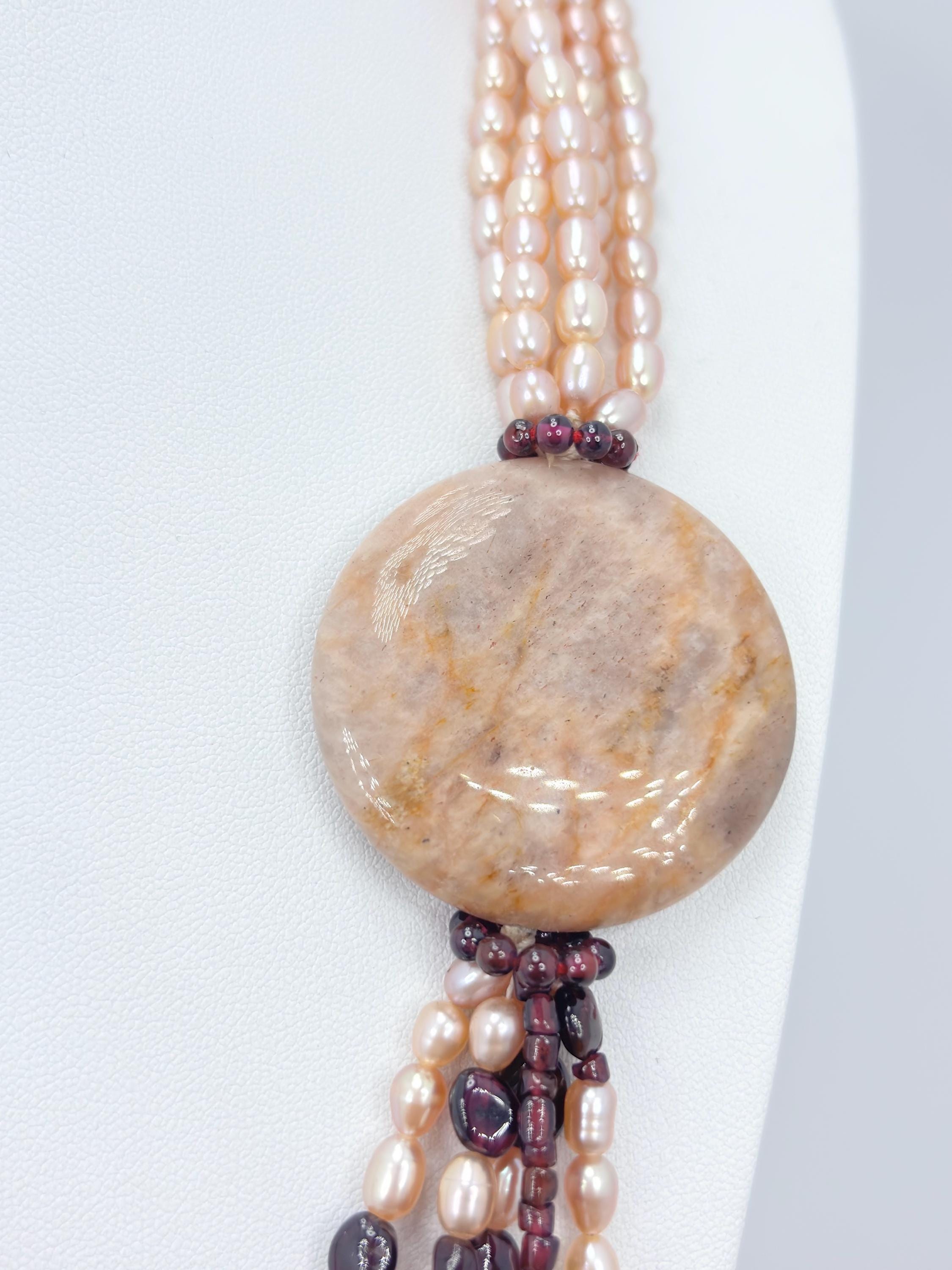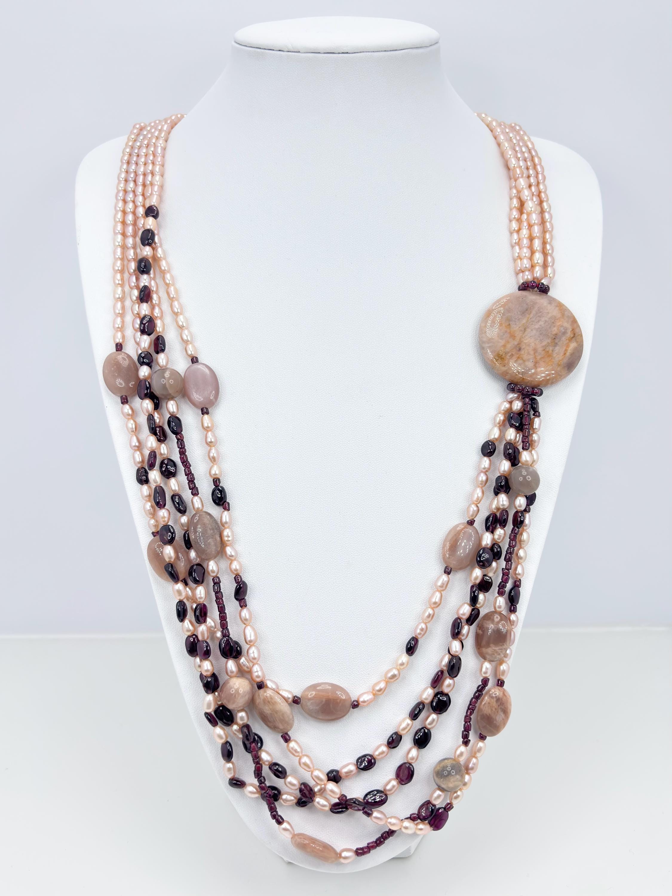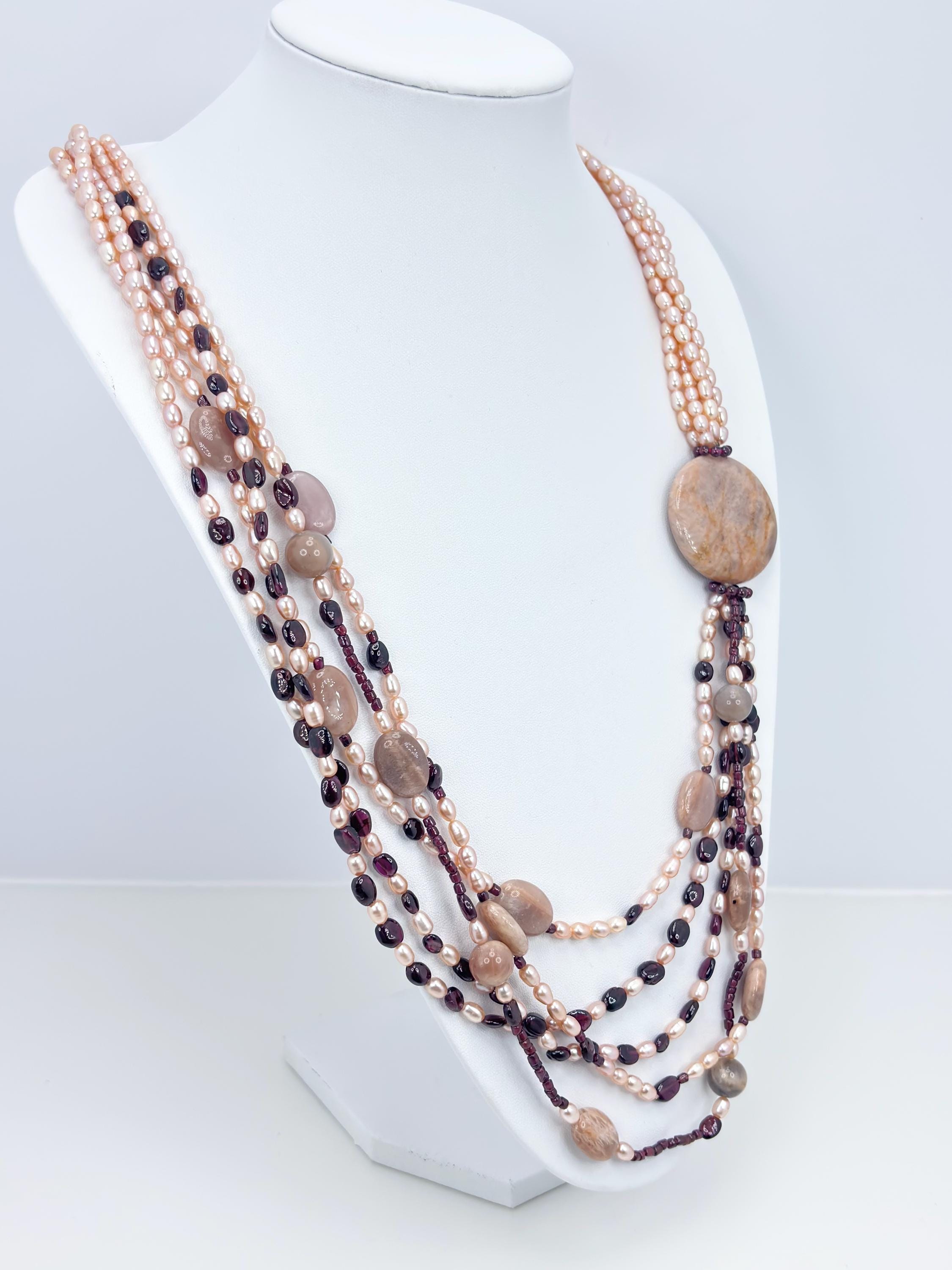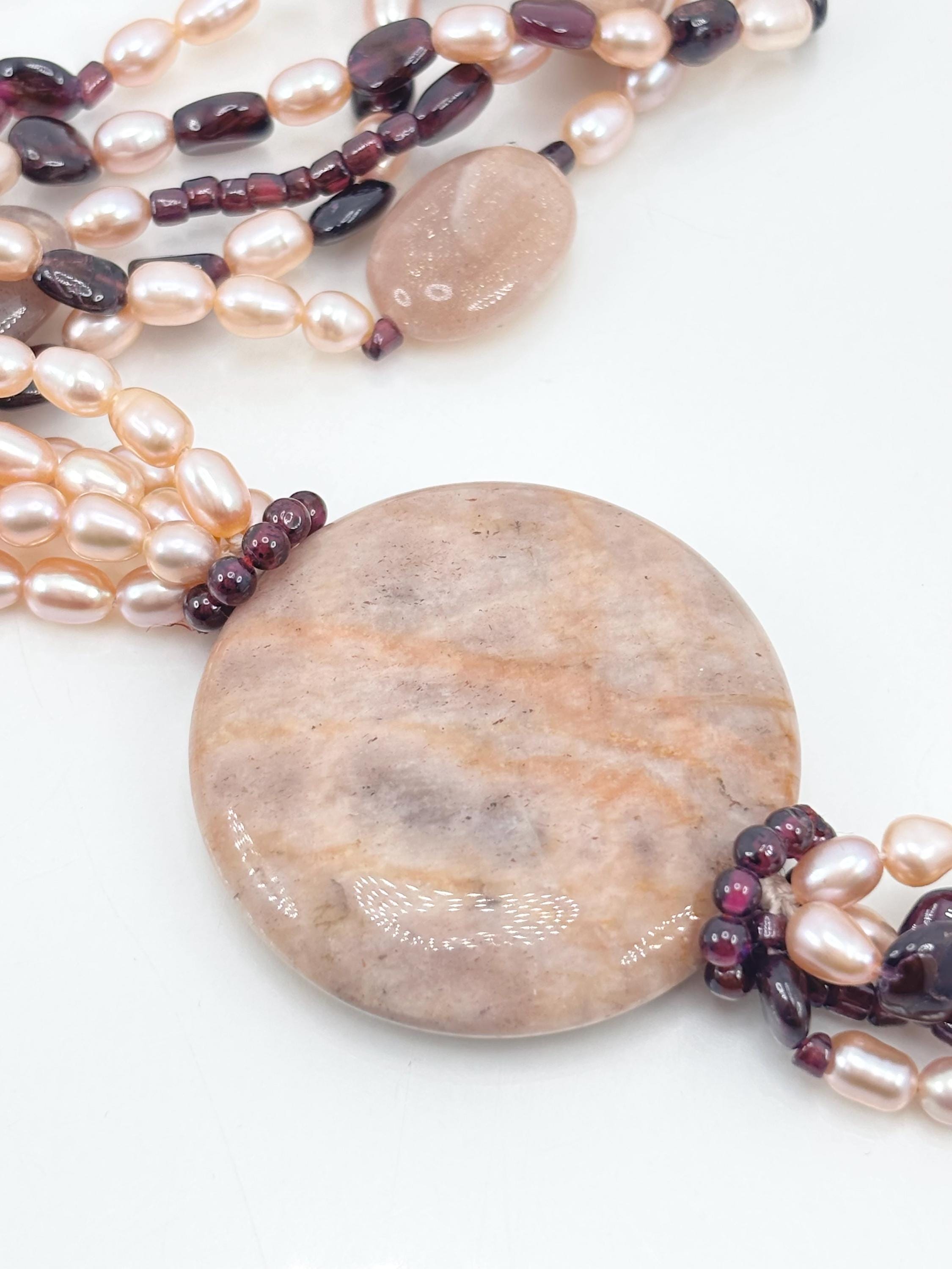 A harmony of colors that enhance each other in this spring-toned necklace with garnet stones, sunstones and freshwater cultured pearls from Asia.