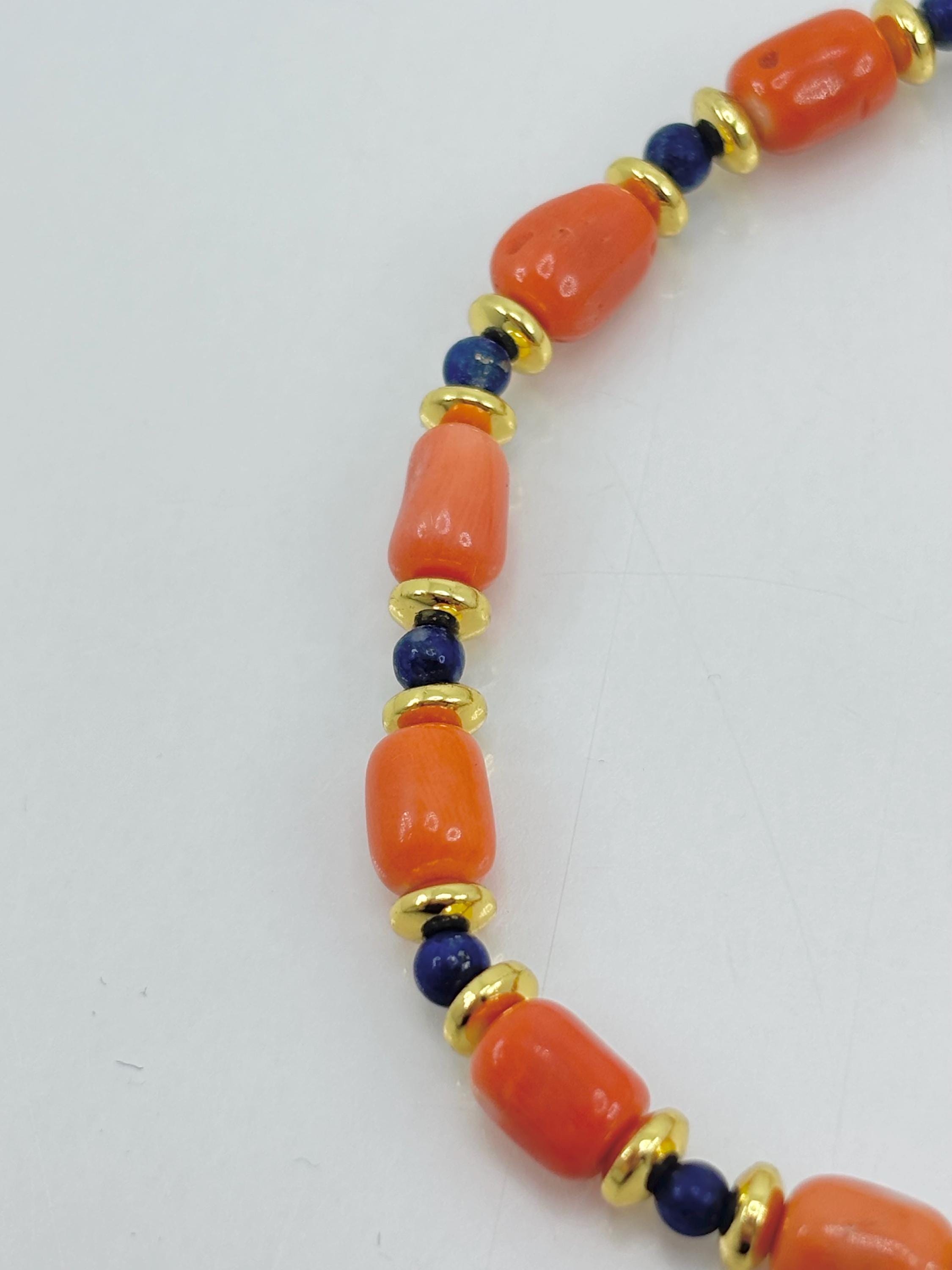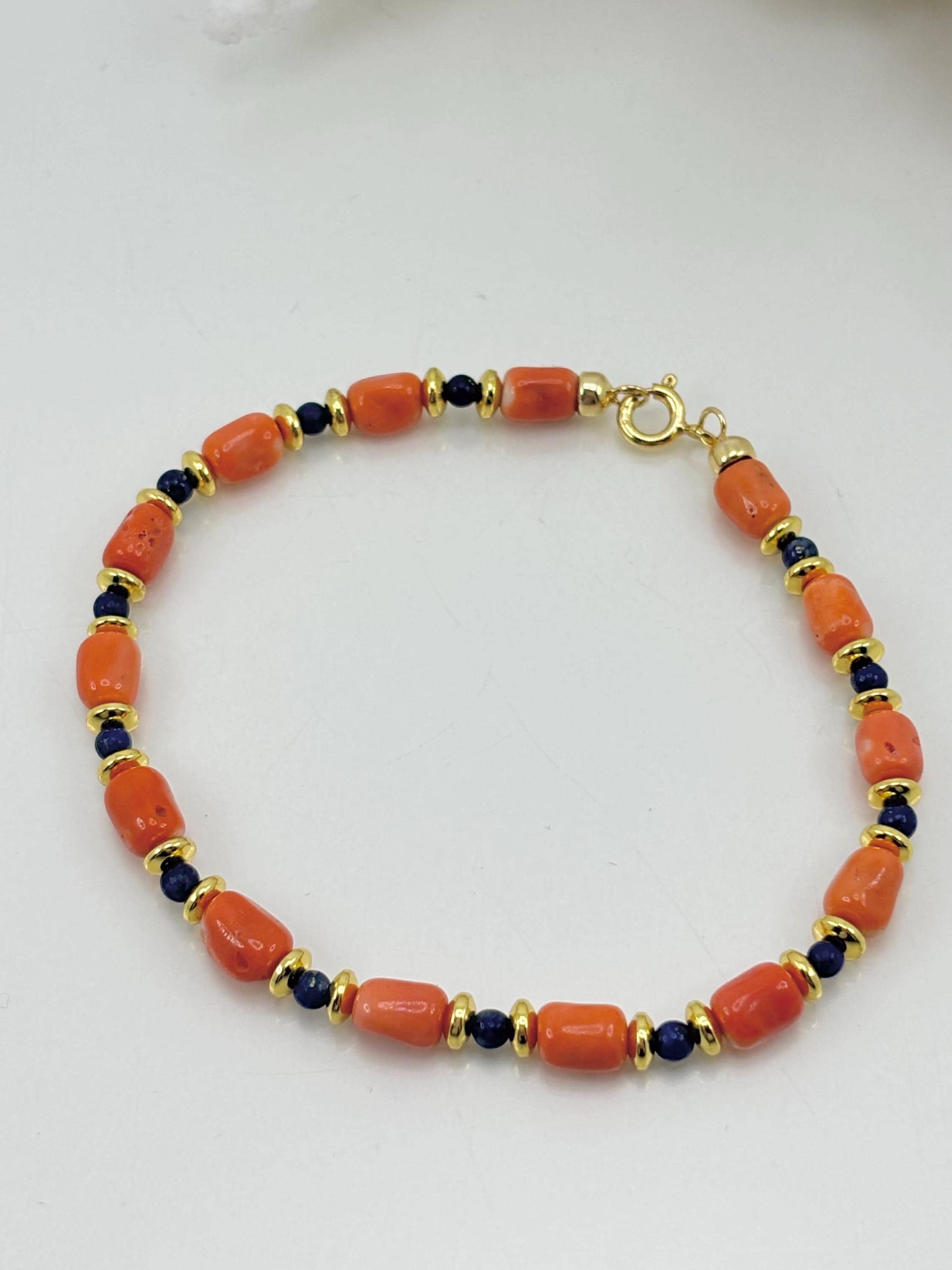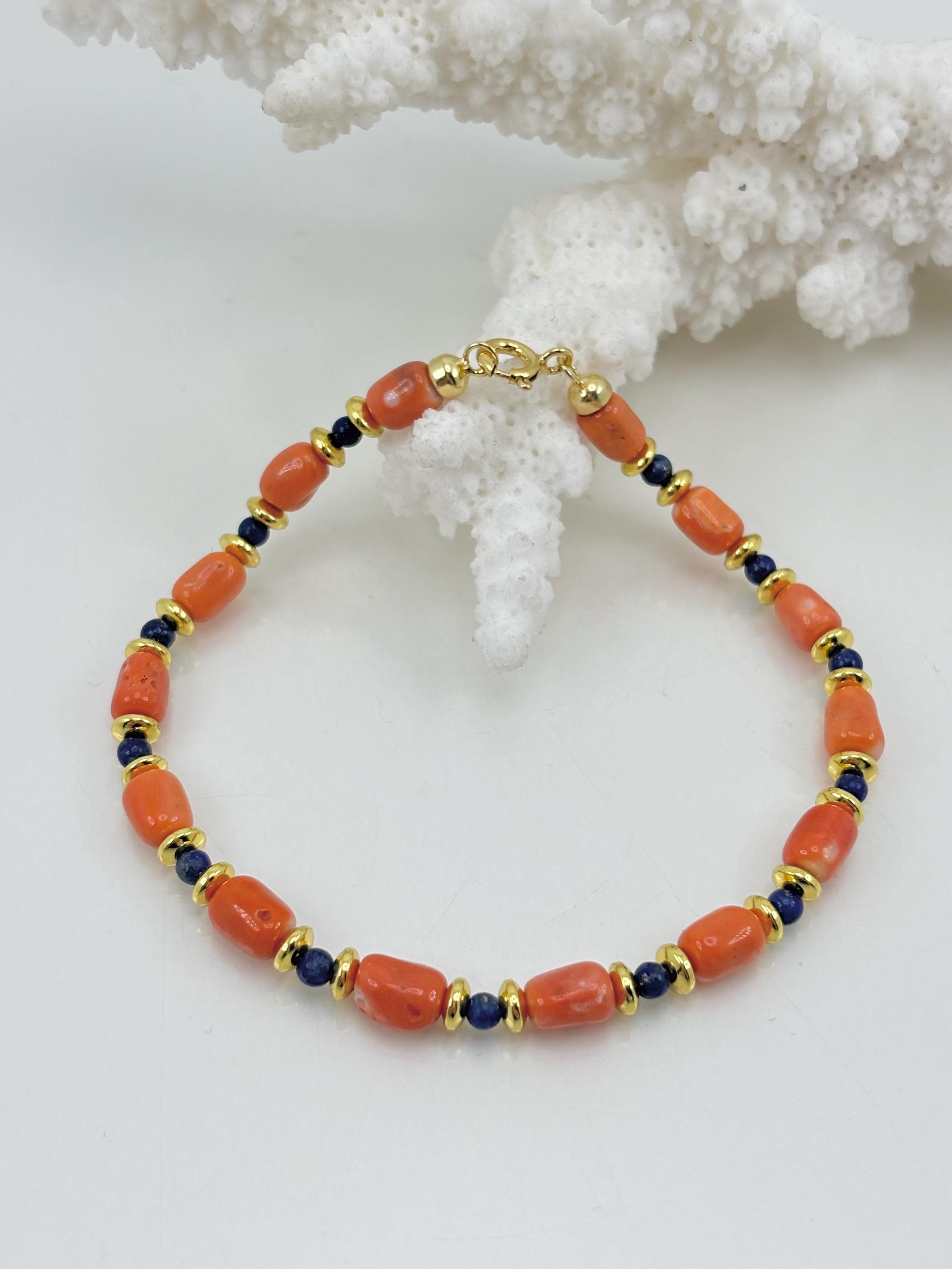 Bracelet in Cerasuolo red coral from the Japanese Sea, alternating with natural lapis lazuli spheres and golden hematite washers, with a gold-plated 925 silver clasp. A unisex bracelet, perfect as a gift. Handcrafted by artisans in Torre del Greco.