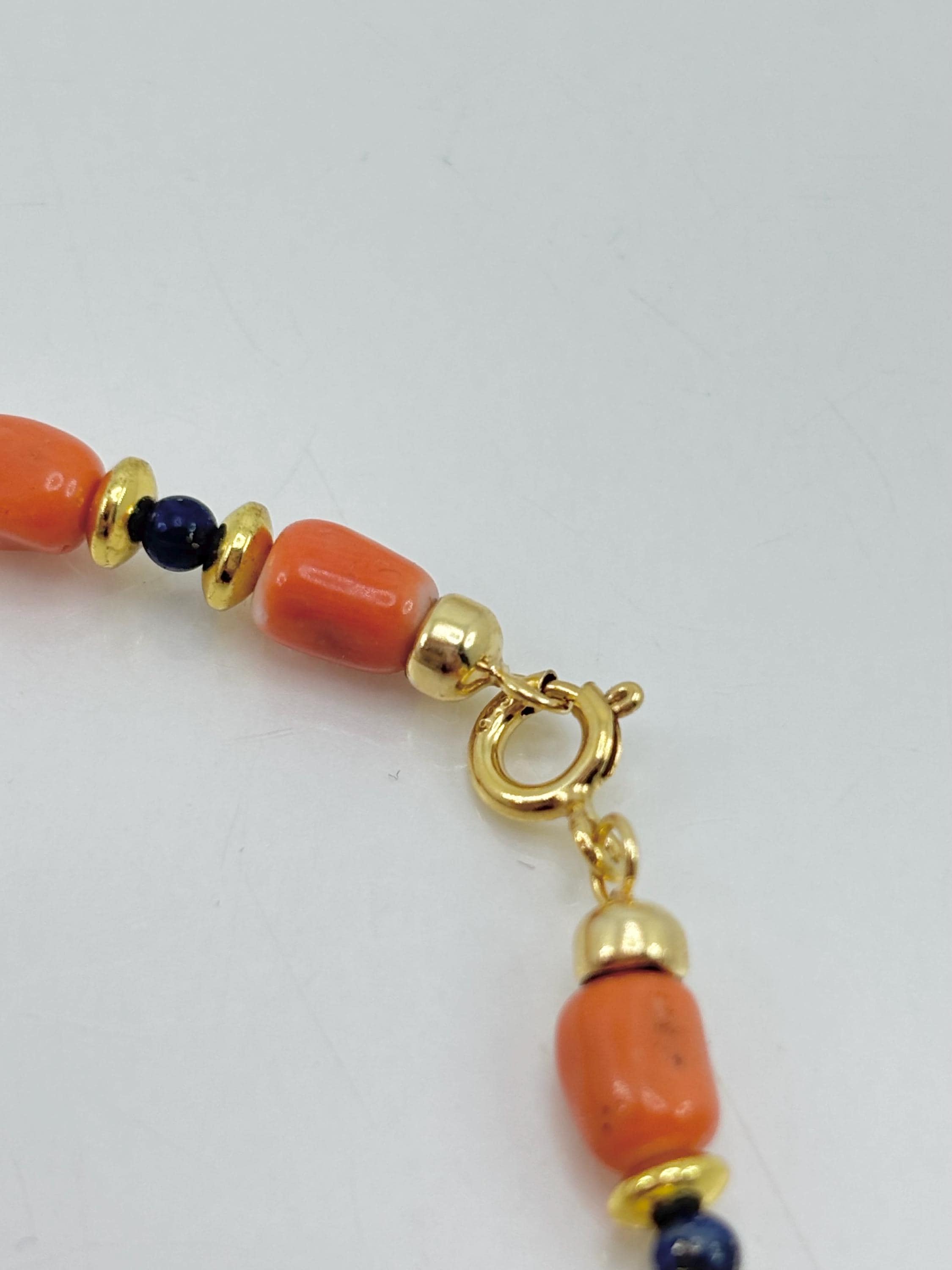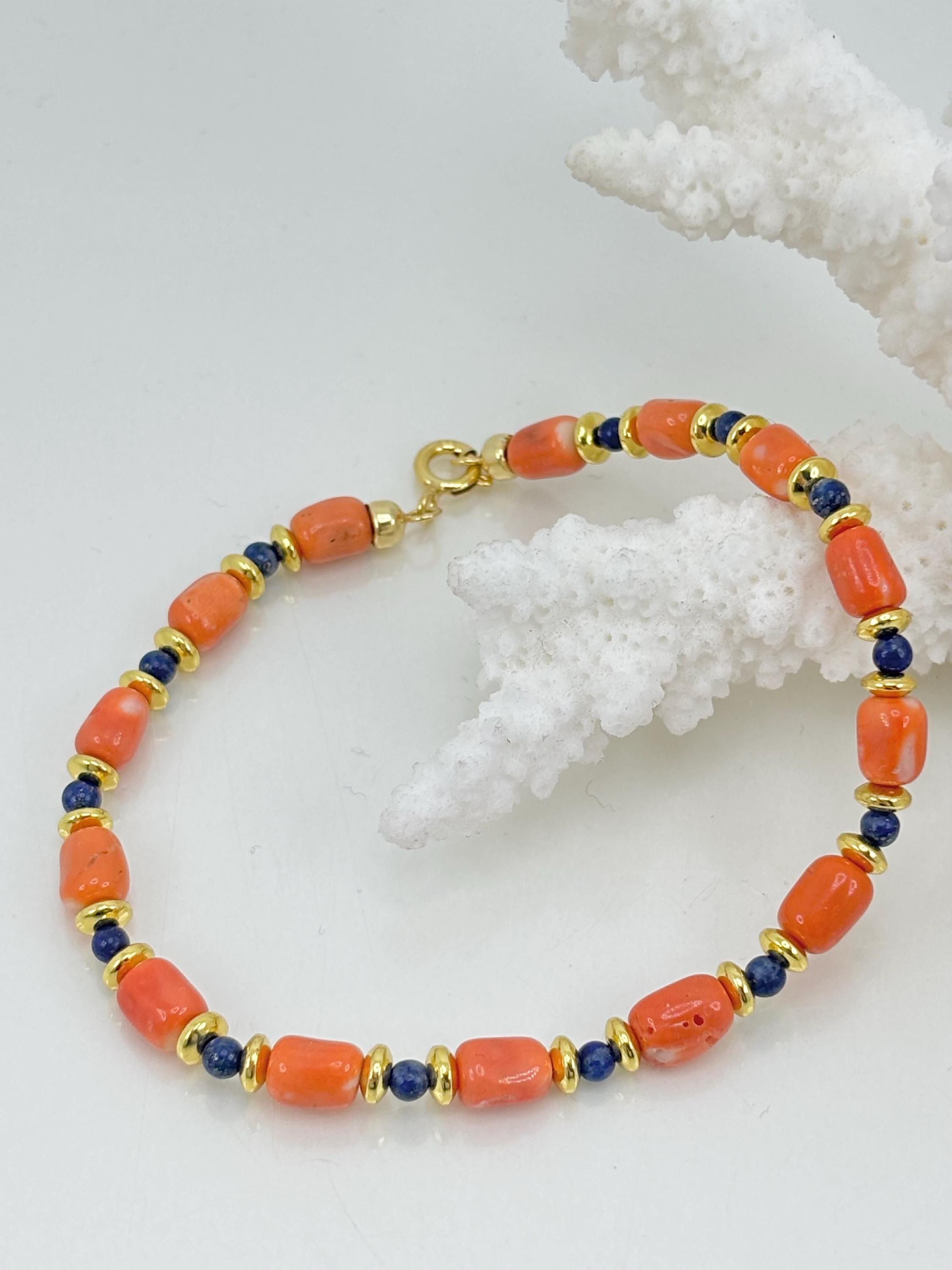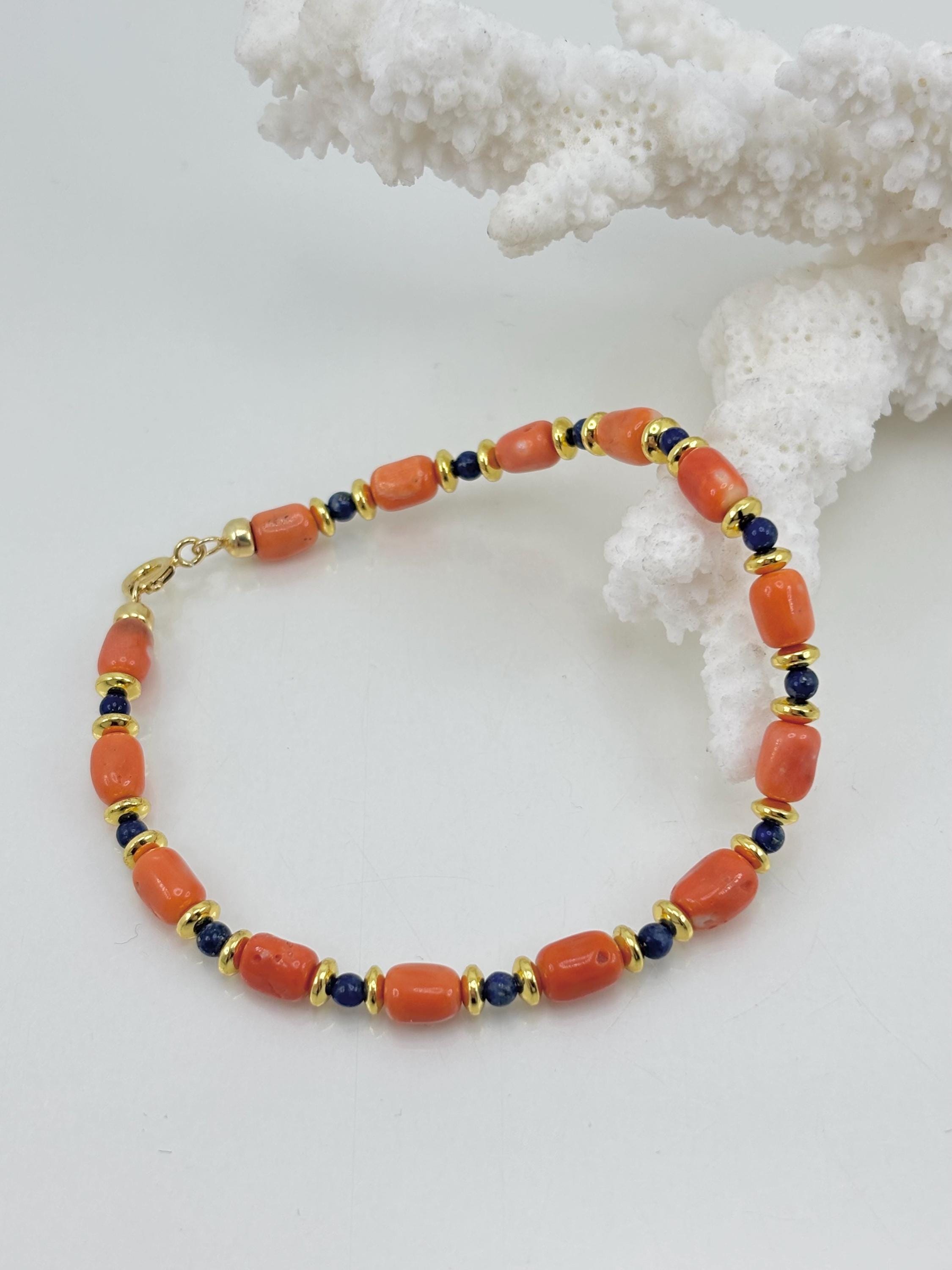 Bracelet in Cerasuolo red coral from the Japanese Sea, alternating with natural lapis lazuli spheres and golden hematite washers, with a gold-plated 925 silver clasp. A unisex bracelet, perfect as a gift. Handcrafted by artisans in Torre del Greco.