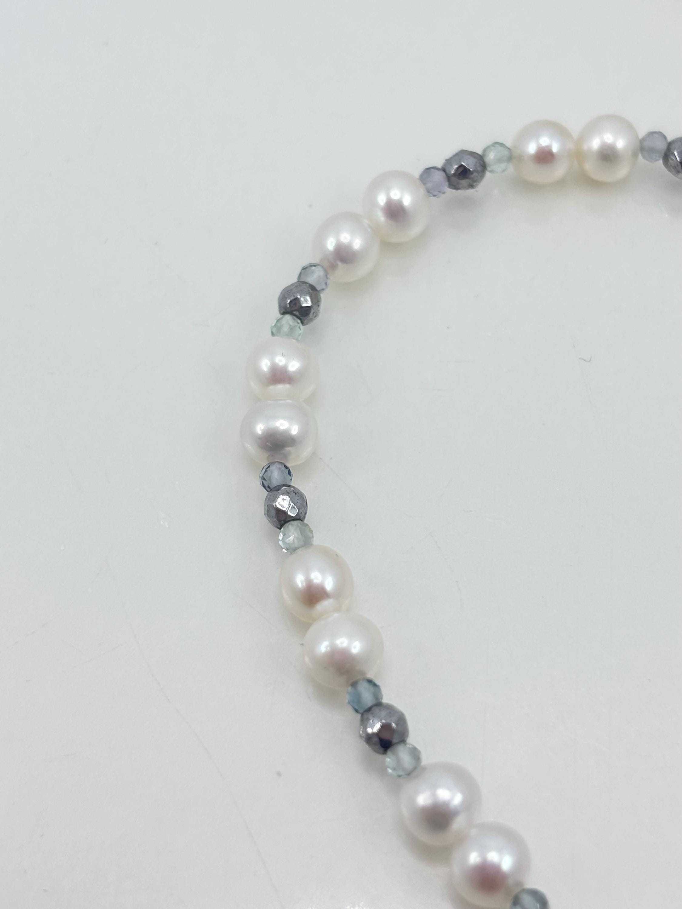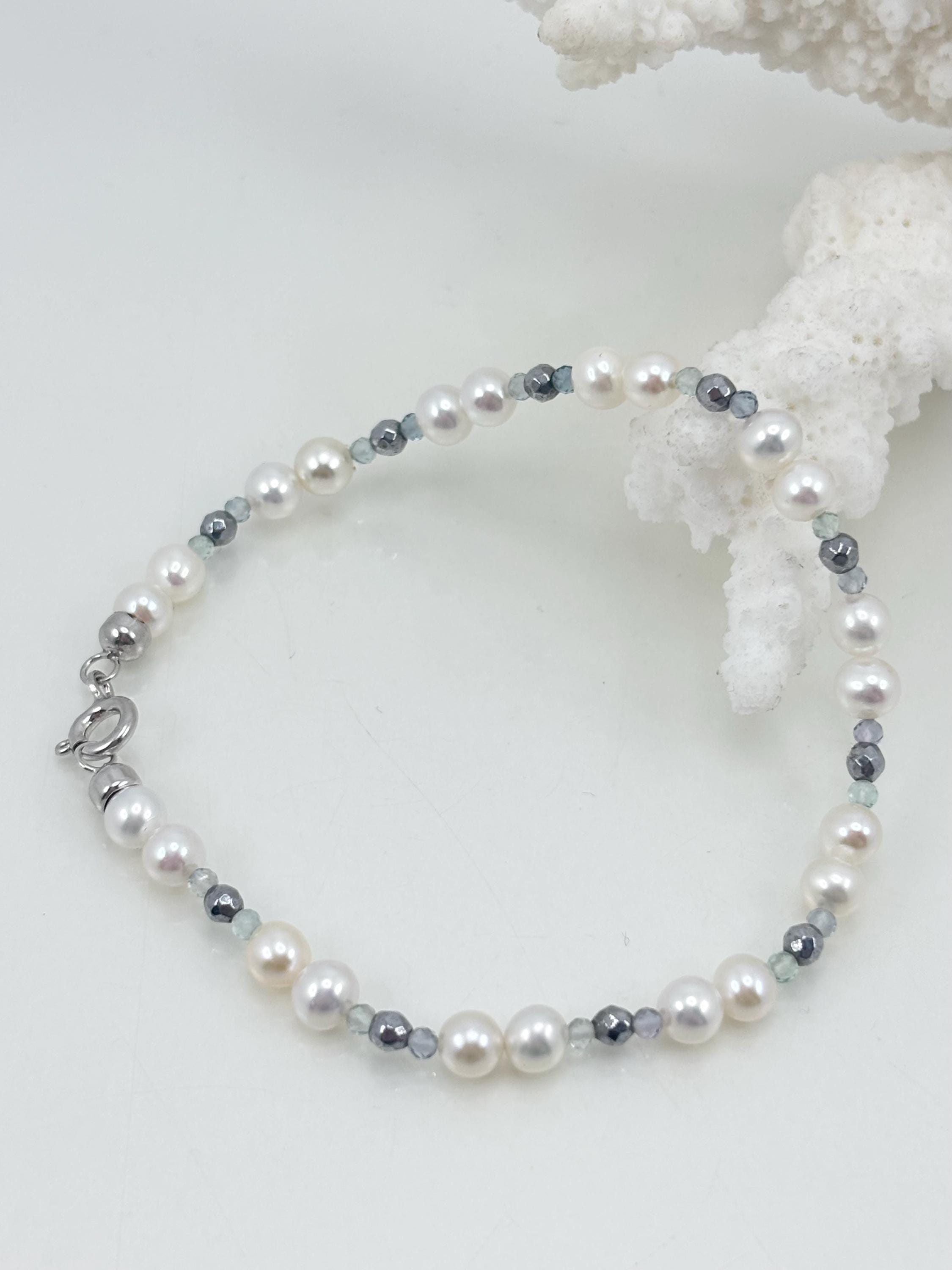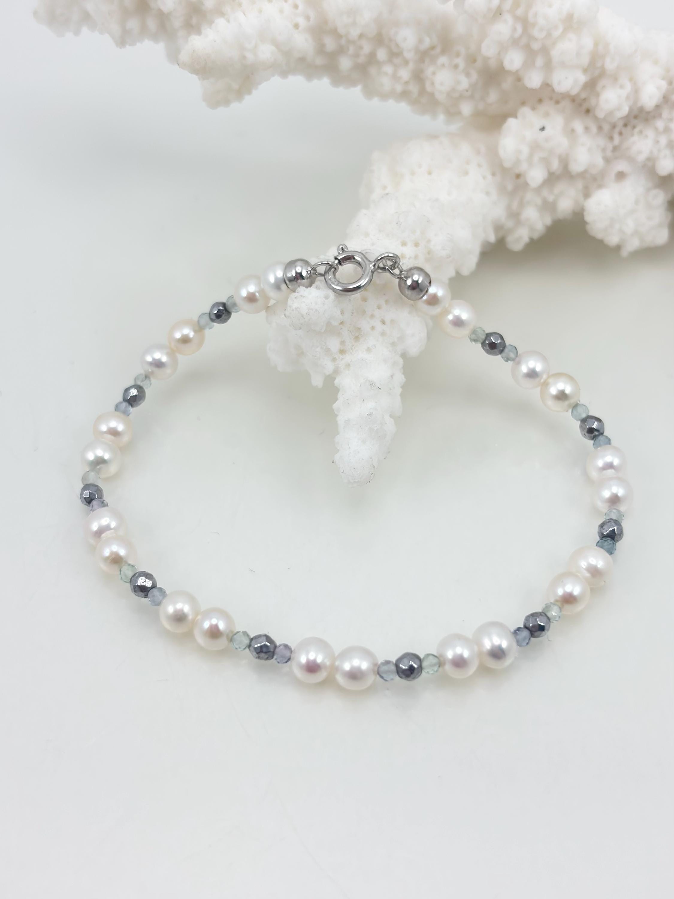 Bracelet with freshwater cultured pearls from Asia, faceted gray hematite spheres and rutilated quartz spheres, with a 925 silver clasp. Crafted and handcrafted by artisans from Torre del Greco.