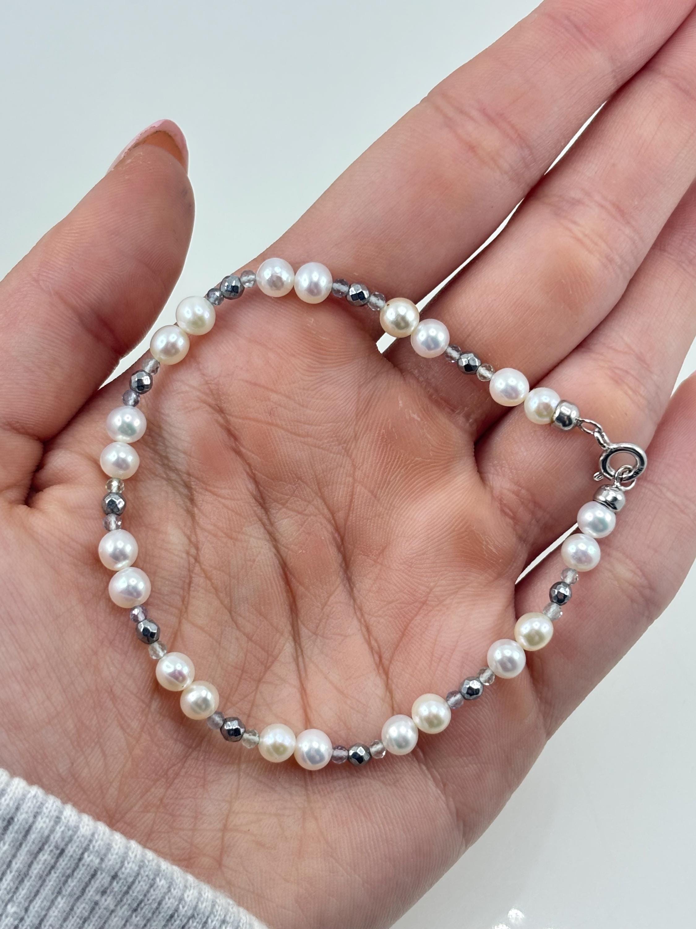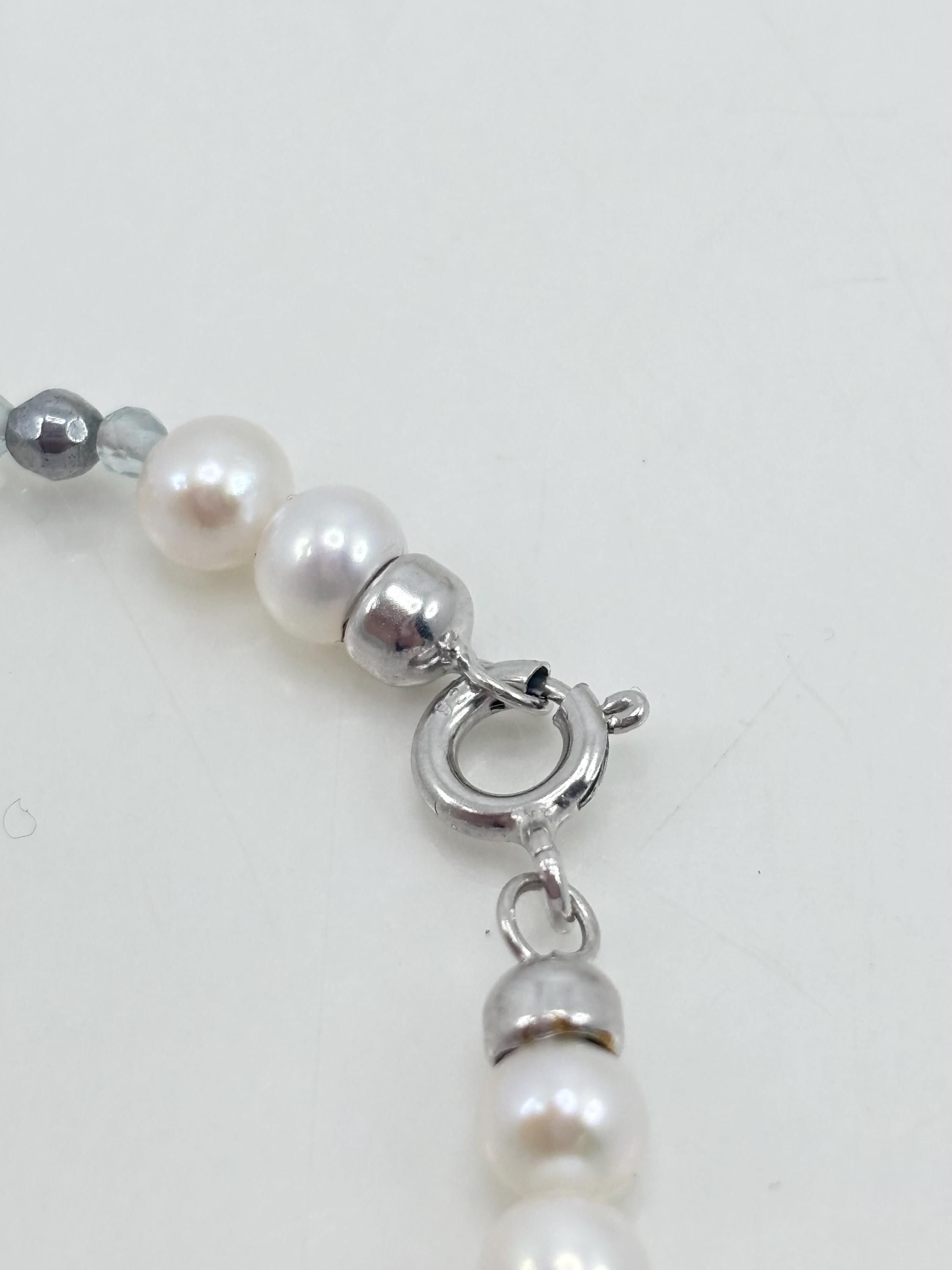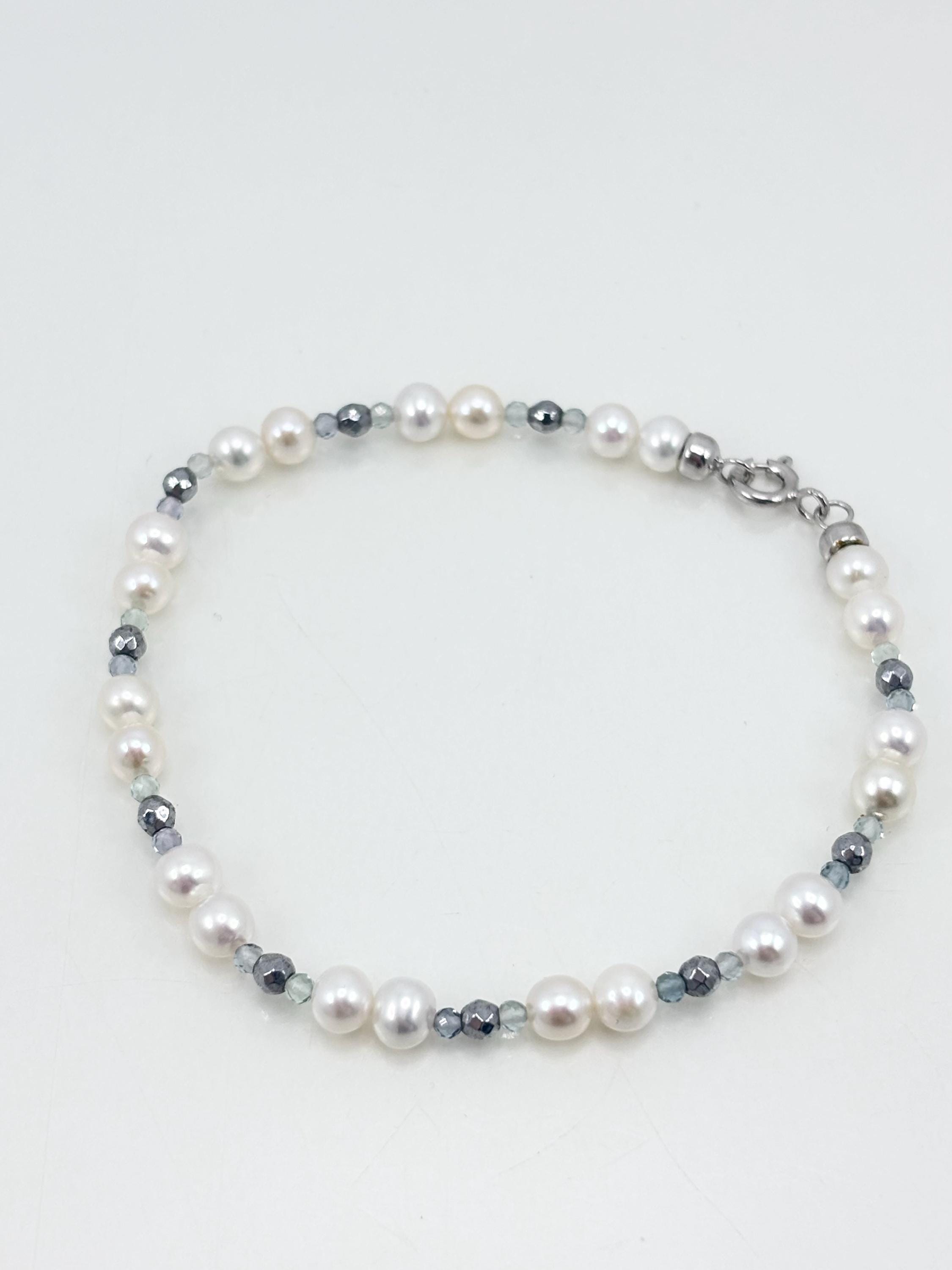 Bracelet with freshwater cultured pearls from Asia, faceted gray hematite spheres and rutilated quartz spheres, with a 925 silver clasp. Crafted and handcrafted by artisans from Torre del Greco.