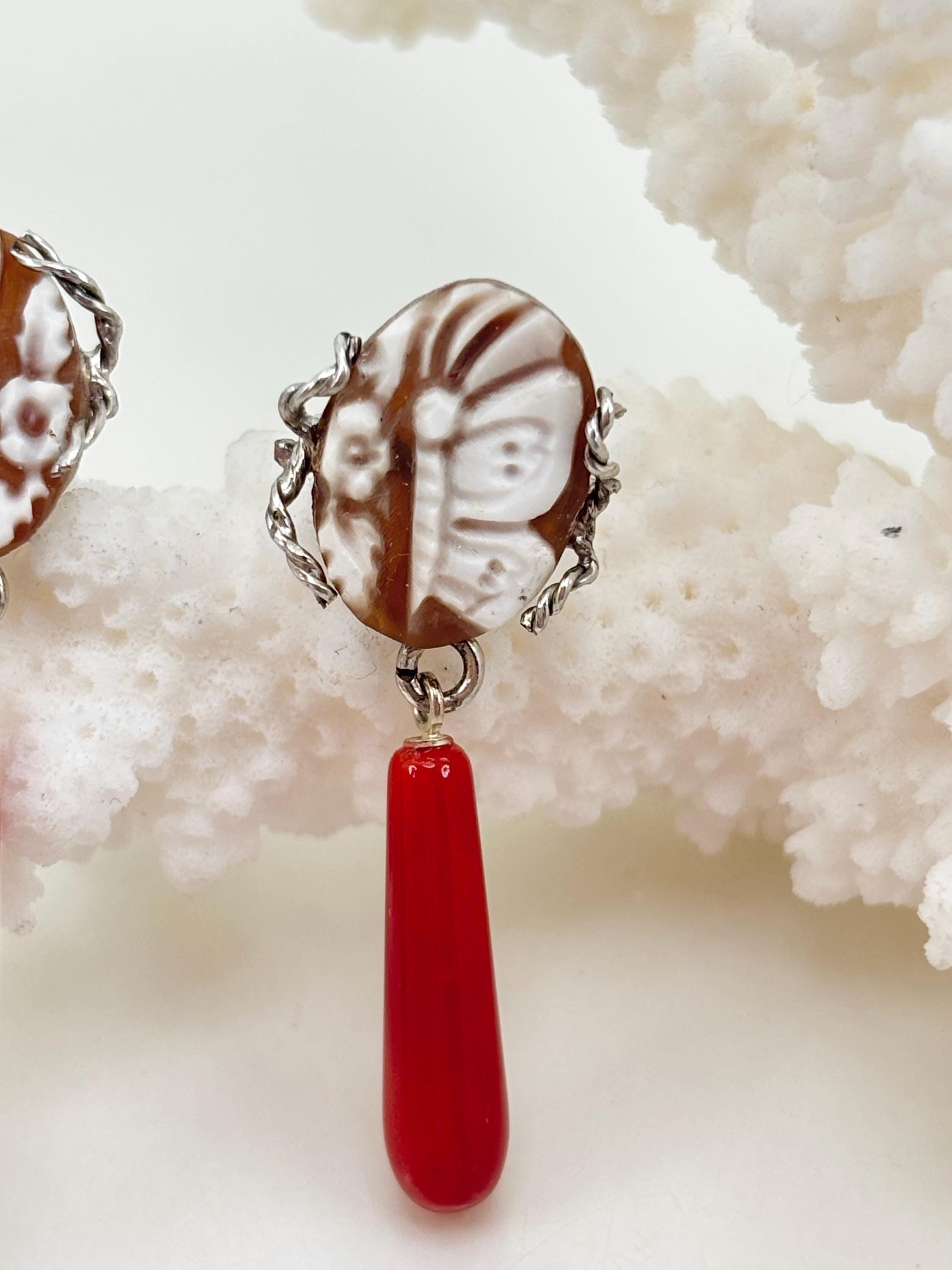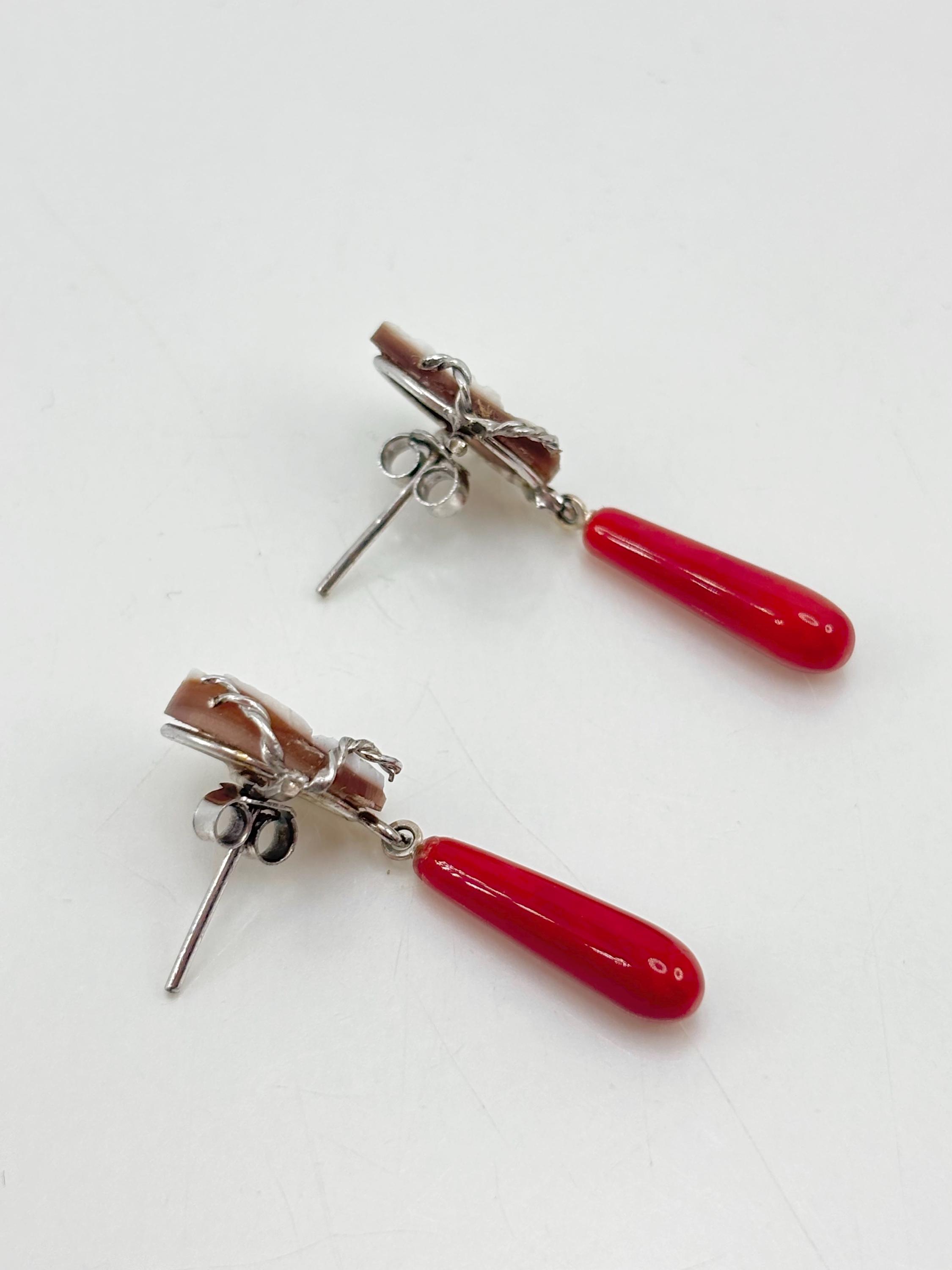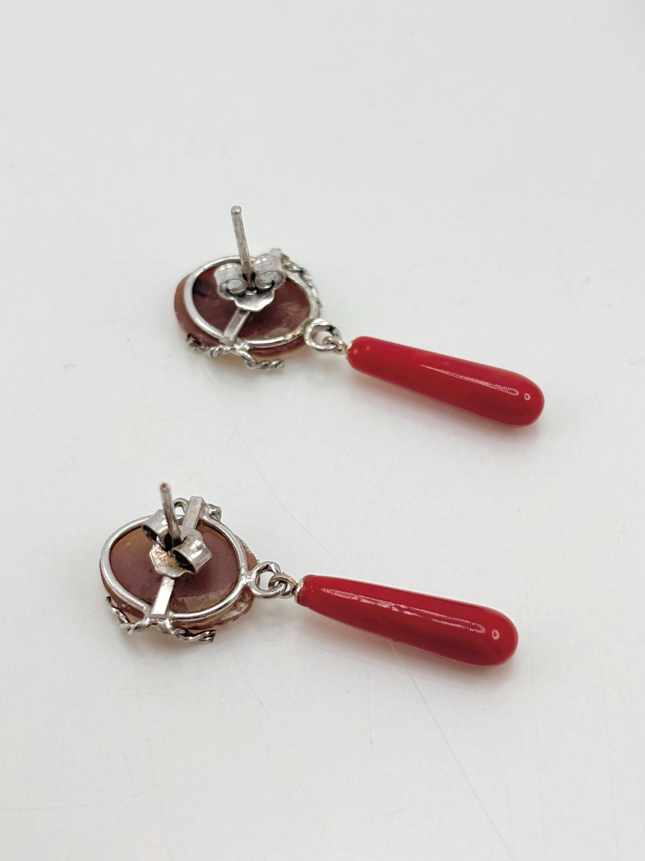 Dangle earrings with a hand-engraved cameo on a Madagascar Cassis shell and natural red coral drops from the Mediterranean Sea. Set in 925 silver. Handcrafted by artisans in Torre del Greco.
